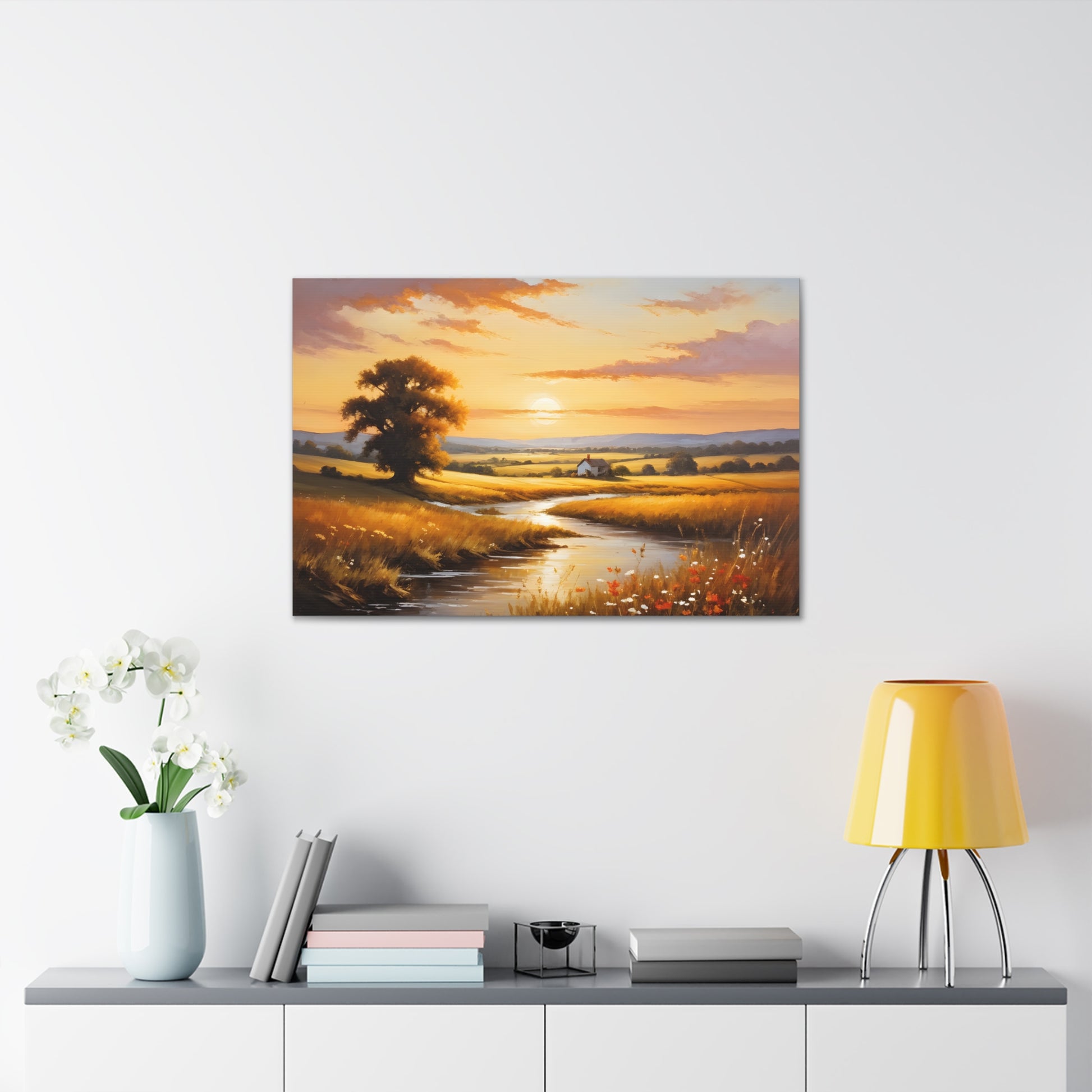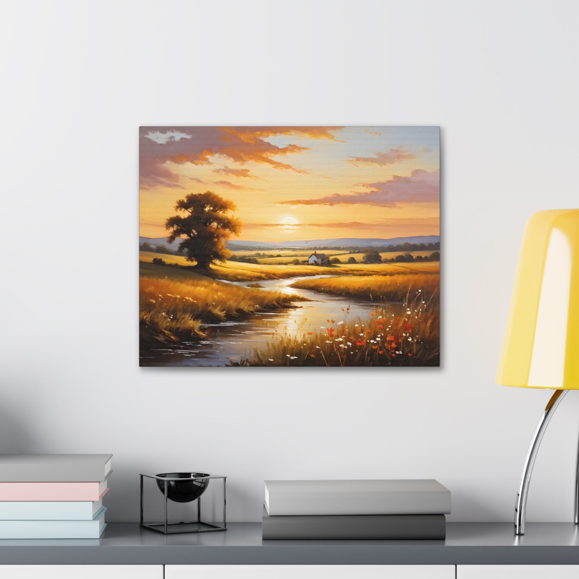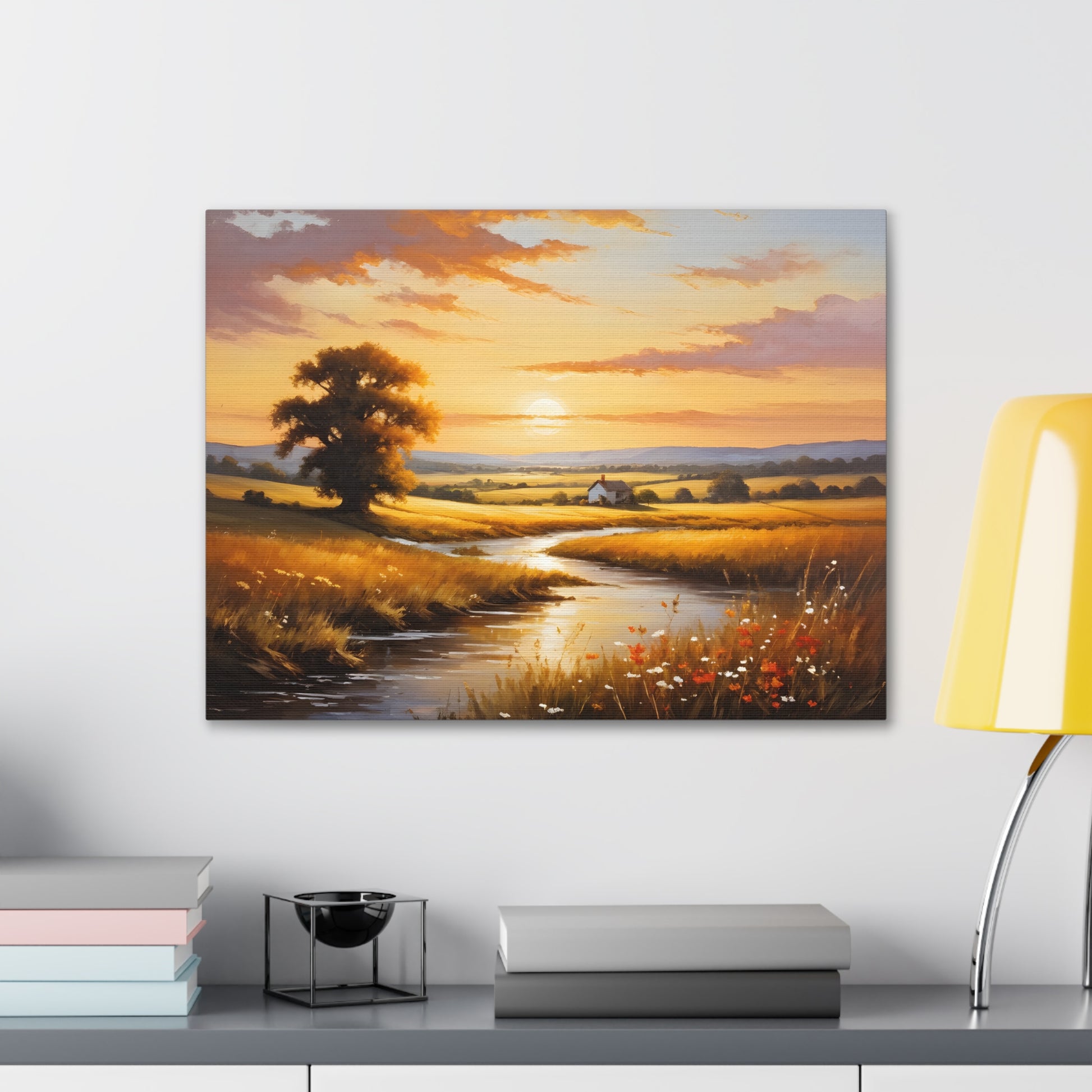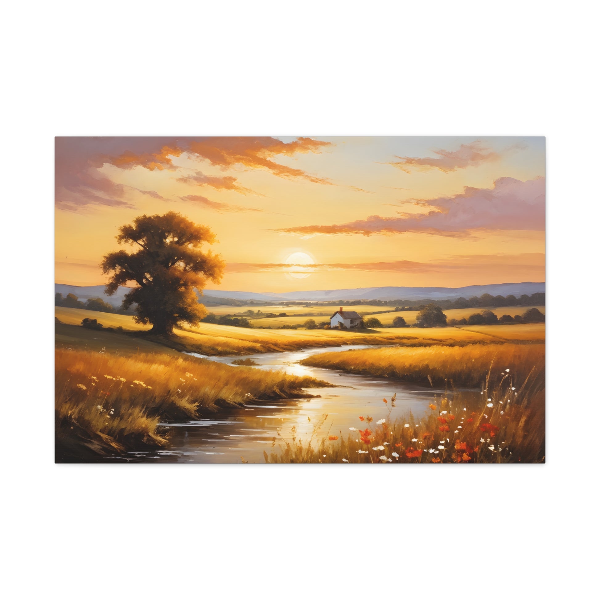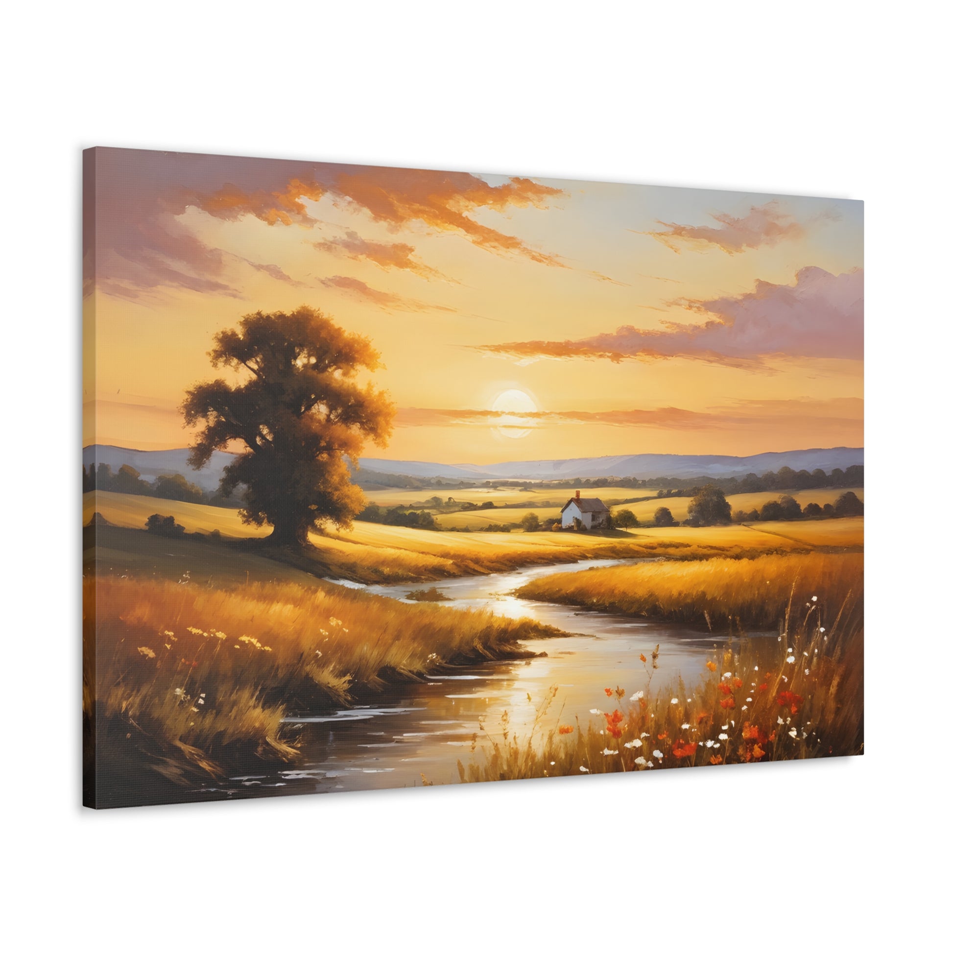 Bask in the golden hues of a serene countryside in "Amber Fields." This classic oil painting captures the breathtaking beauty of the sunset over an open field, with light reflecting off a quiet stream and highlighting the natural splendor of a rural landscape.
