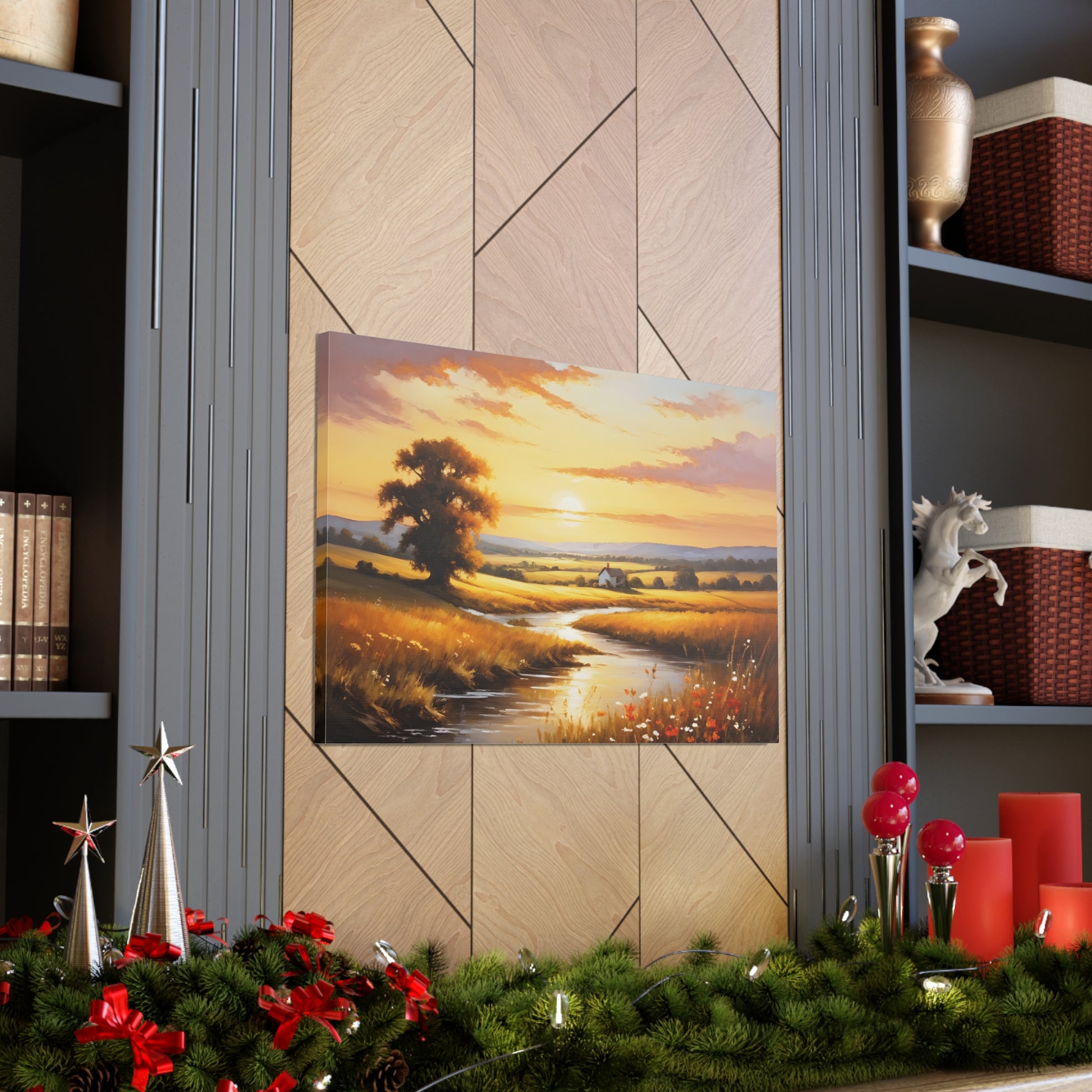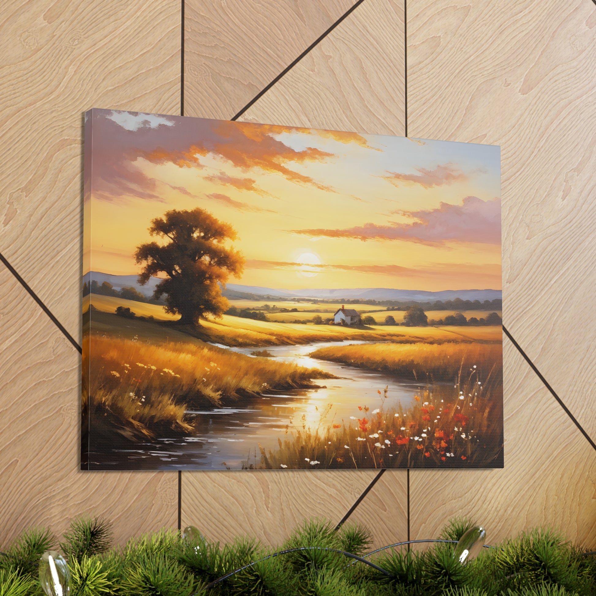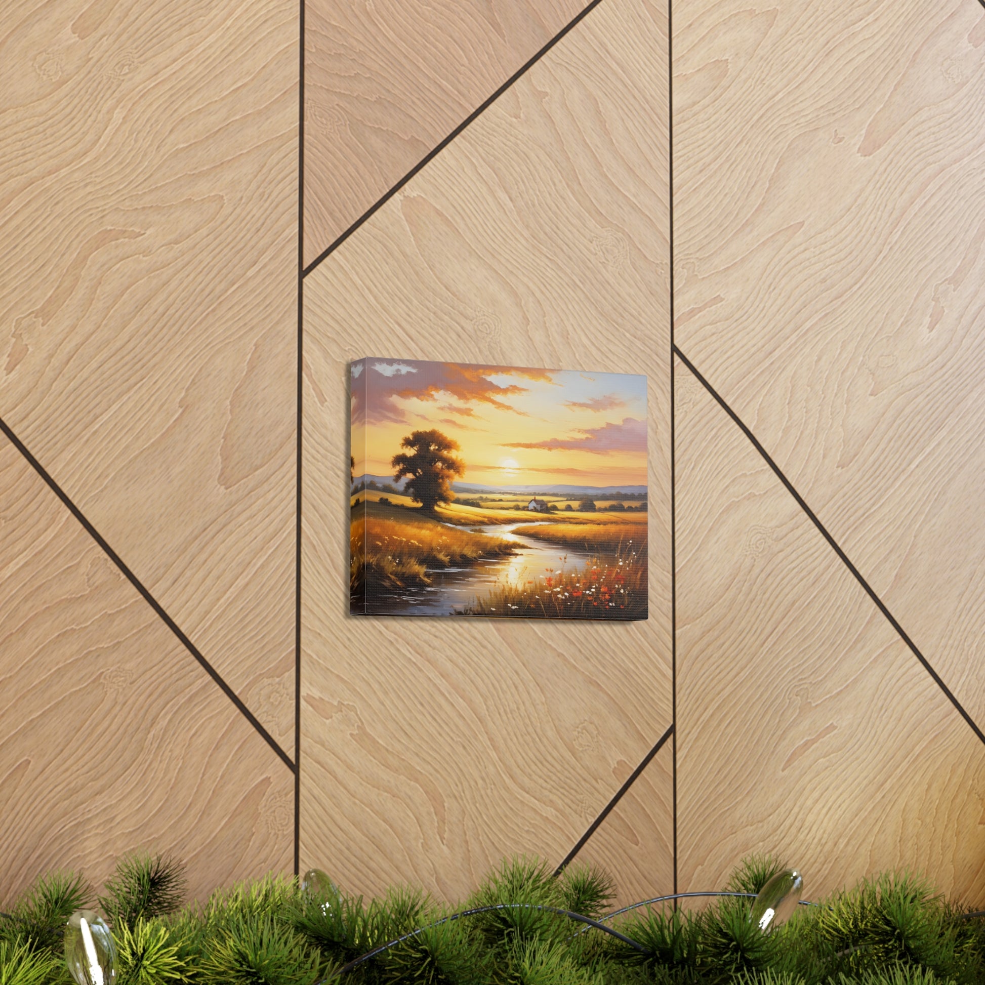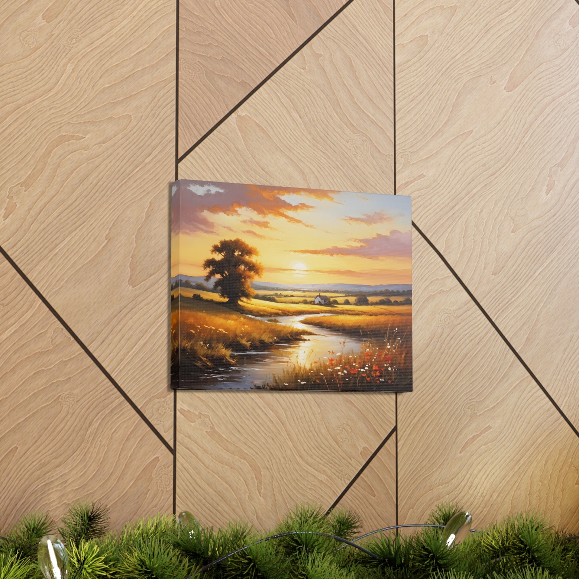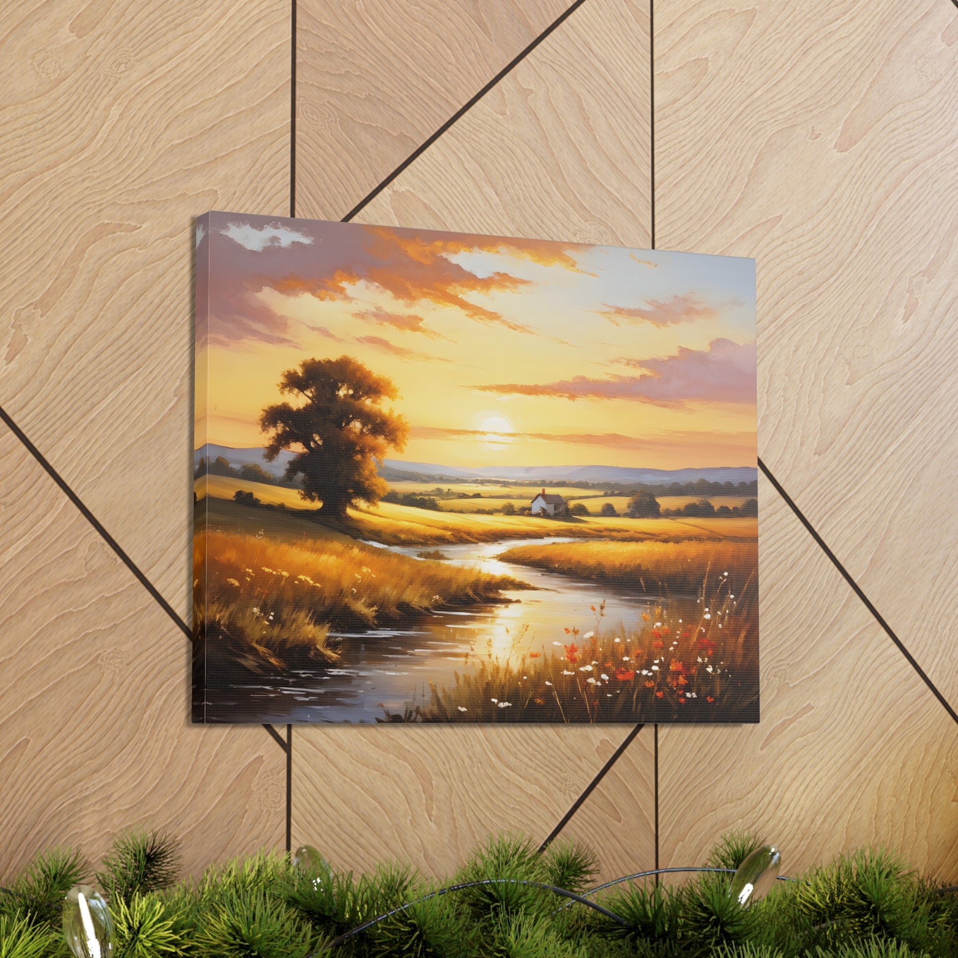 Bask in the golden hues of a serene countryside in "Amber Fields." This classic oil painting captures the breathtaking beauty of the sunset over an open field, with light reflecting off a quiet stream and highlighting the natural splendor of a rural landscape.
