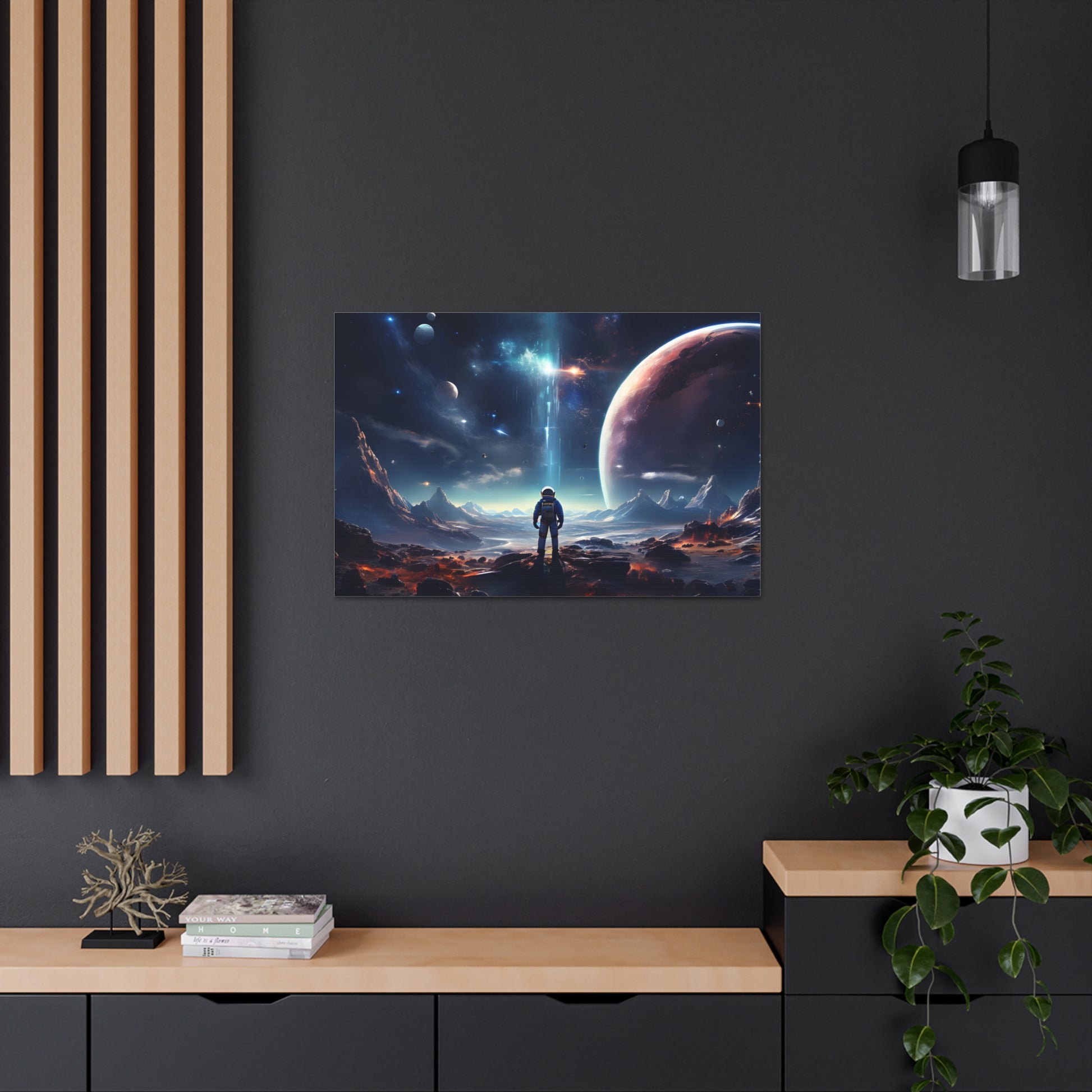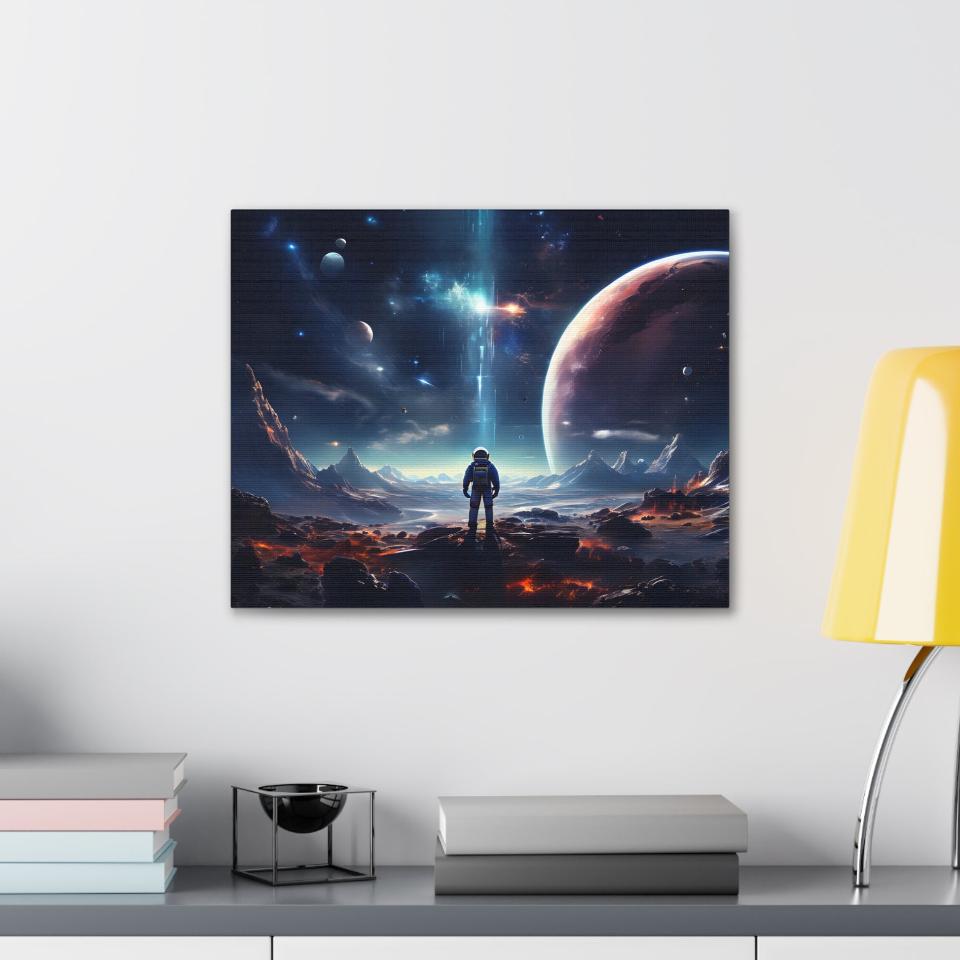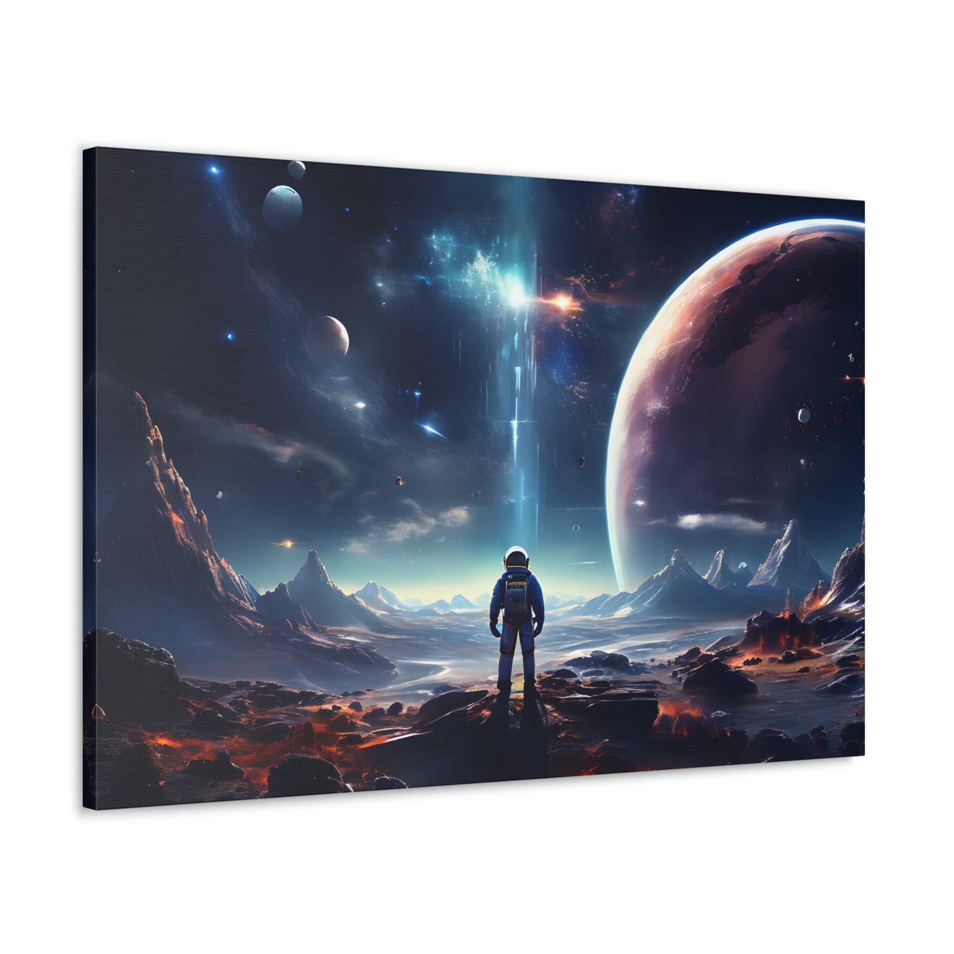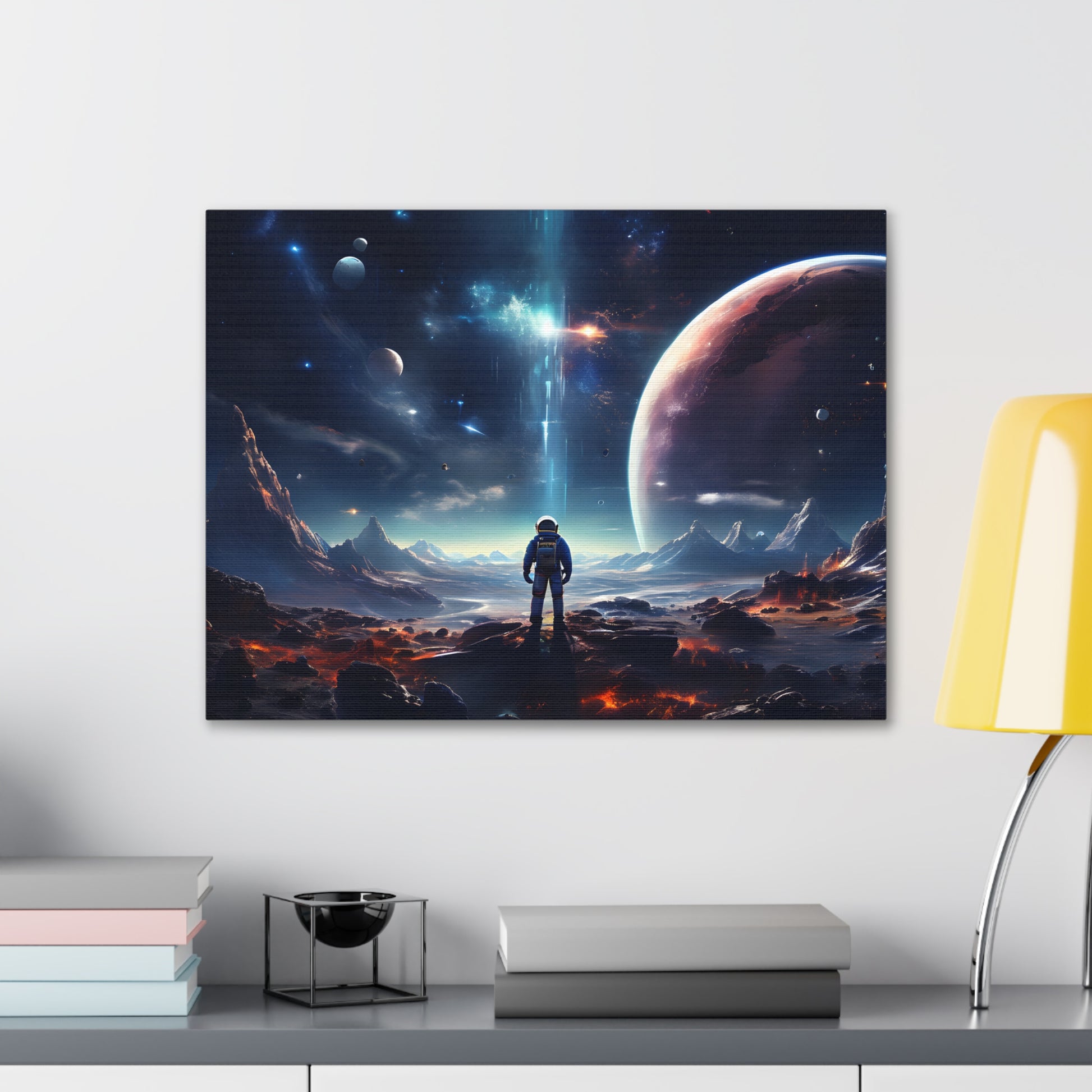 Embark on an otherworldly adventure with our "Astronaut's Journey: Space Wall Décor." Crafted on premium cotton canvas, this captivating artwork transports you to the far reaches of the cosmos.