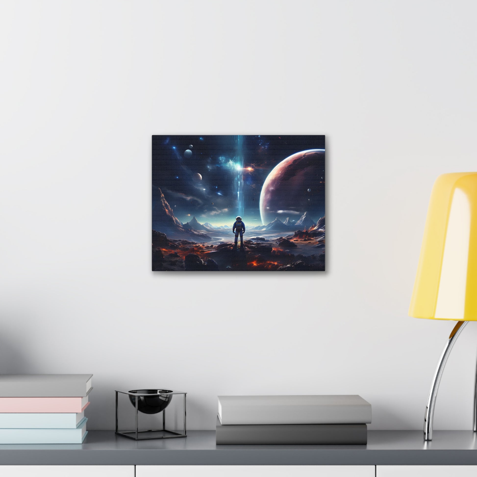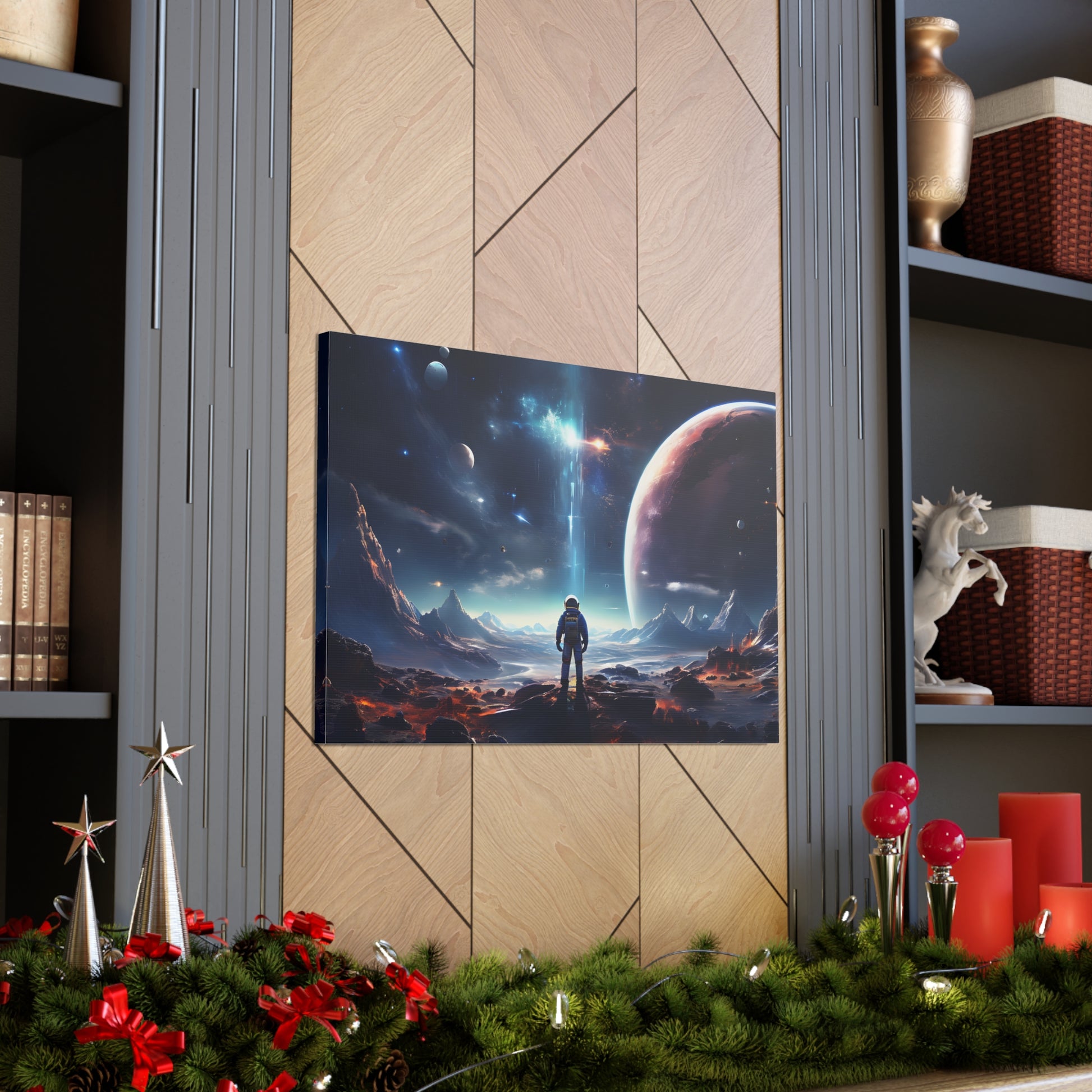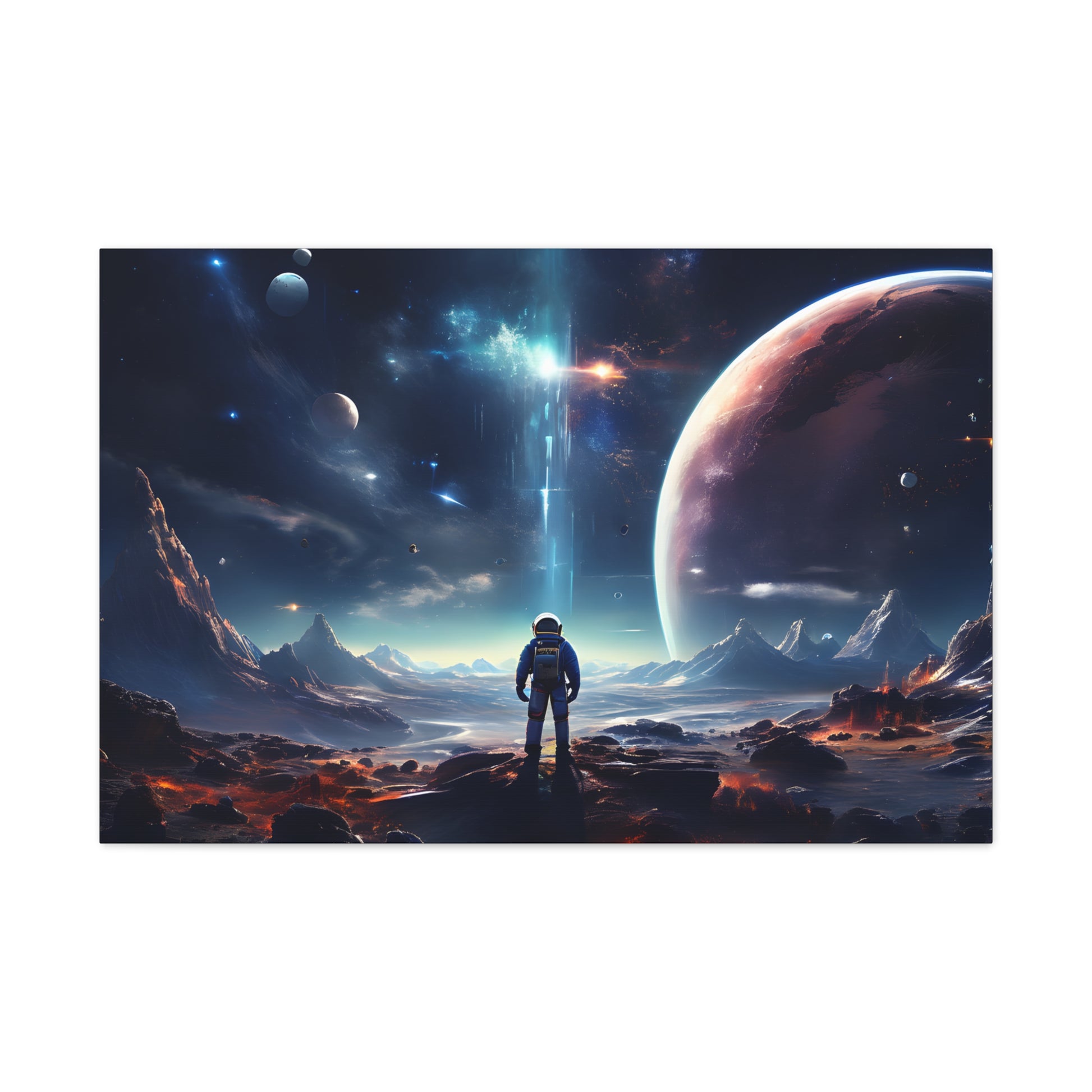 Embark on an otherworldly adventure with our "Astronaut's Journey: Space Wall Décor." Crafted on premium cotton canvas, this captivating artwork transports you to the far reaches of the cosmos.