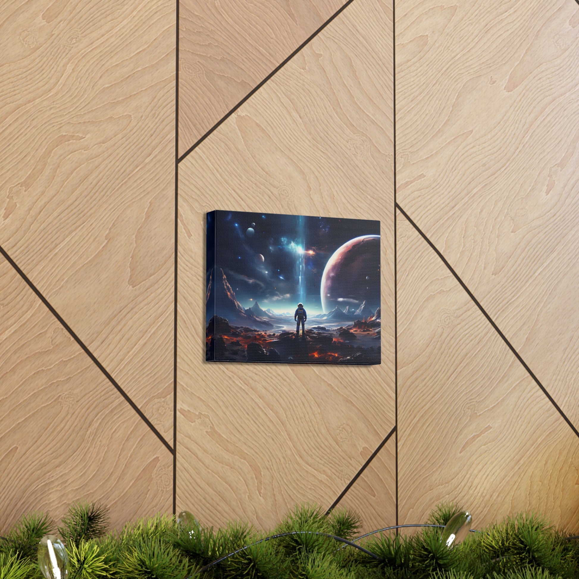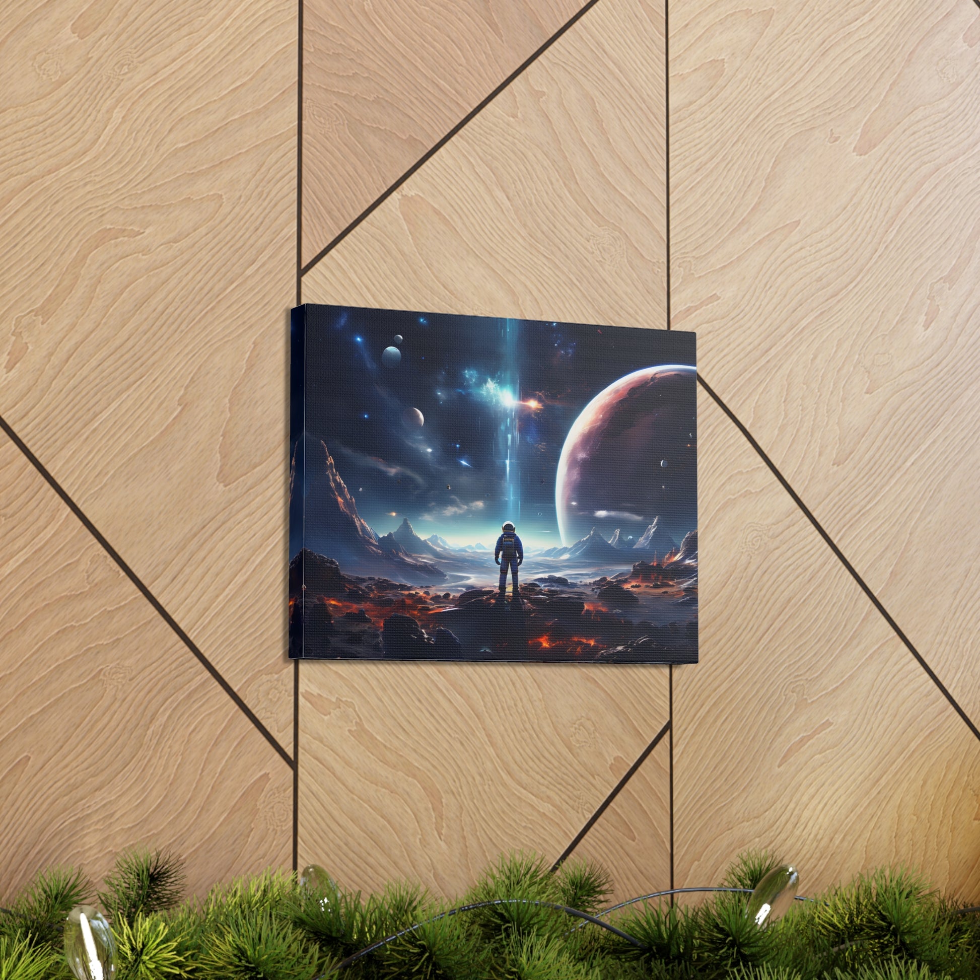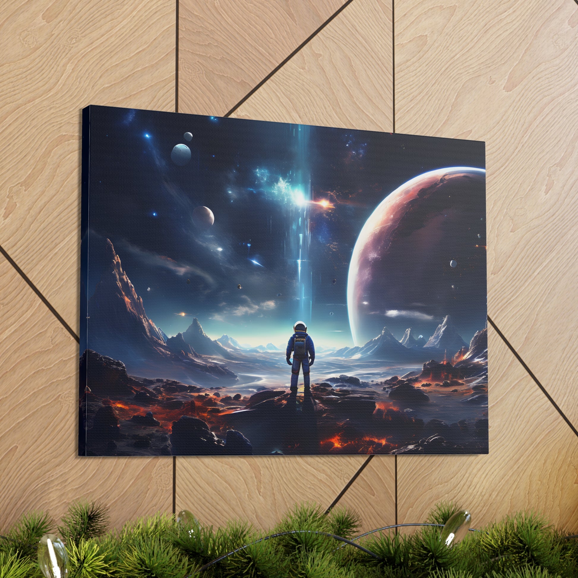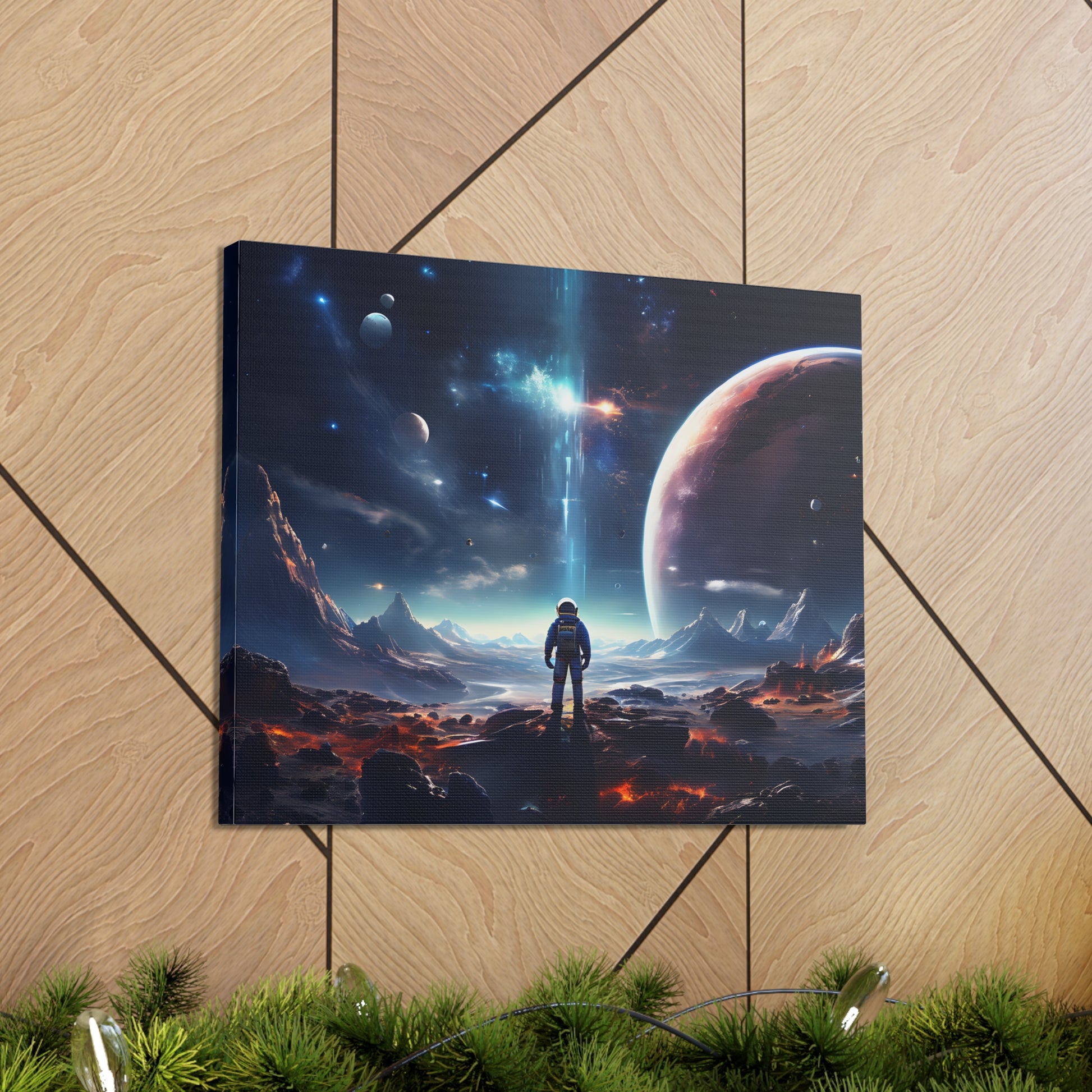 Embark on an otherworldly adventure with our "Astronaut's Journey: Space Wall Décor." Crafted on premium cotton canvas, this captivating artwork transports you to the far reaches of the cosmos.