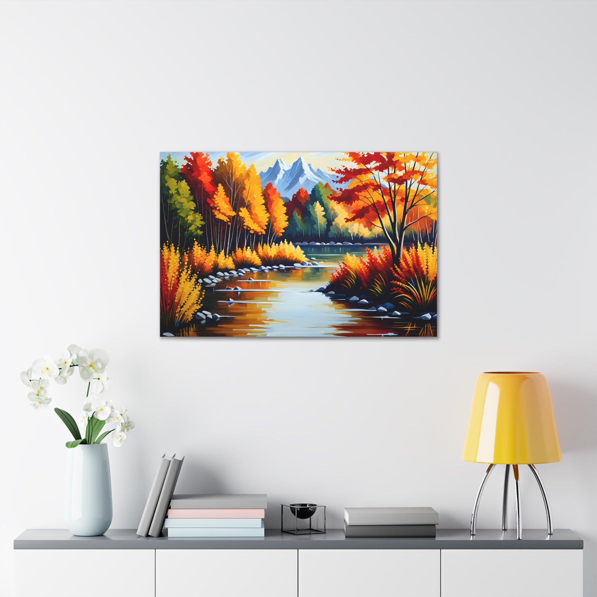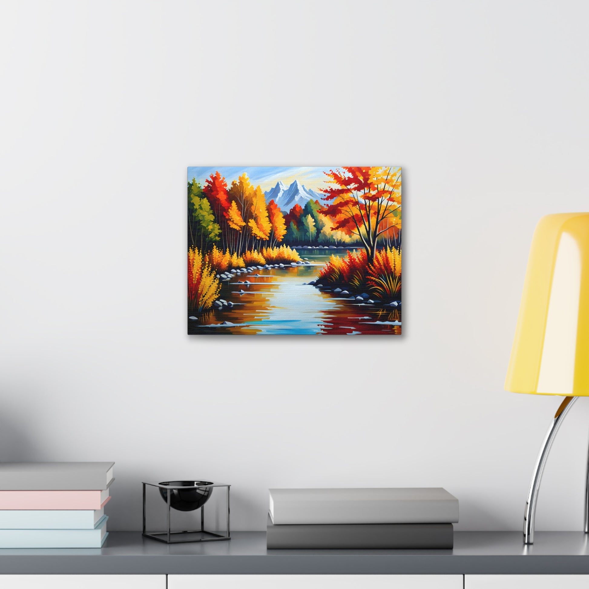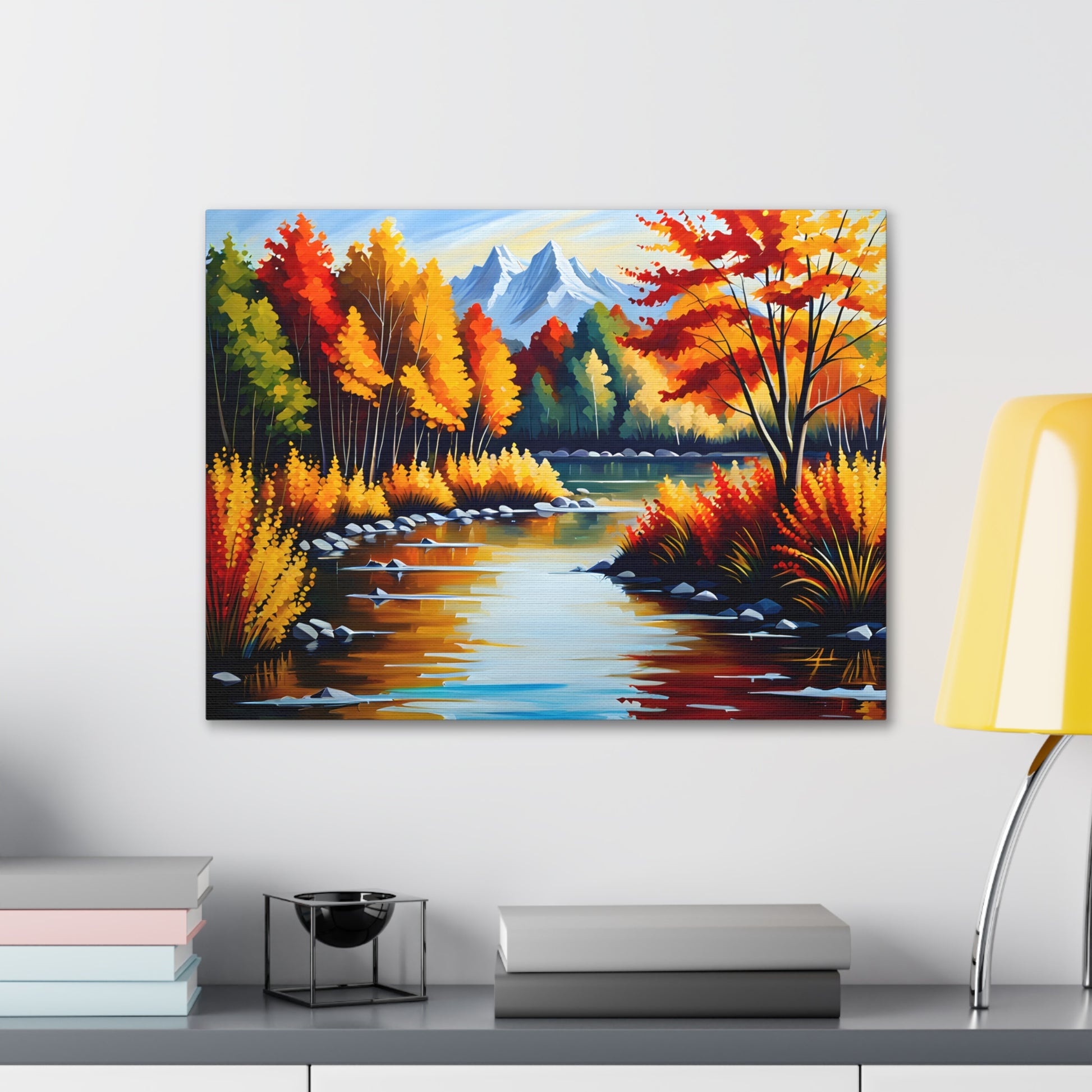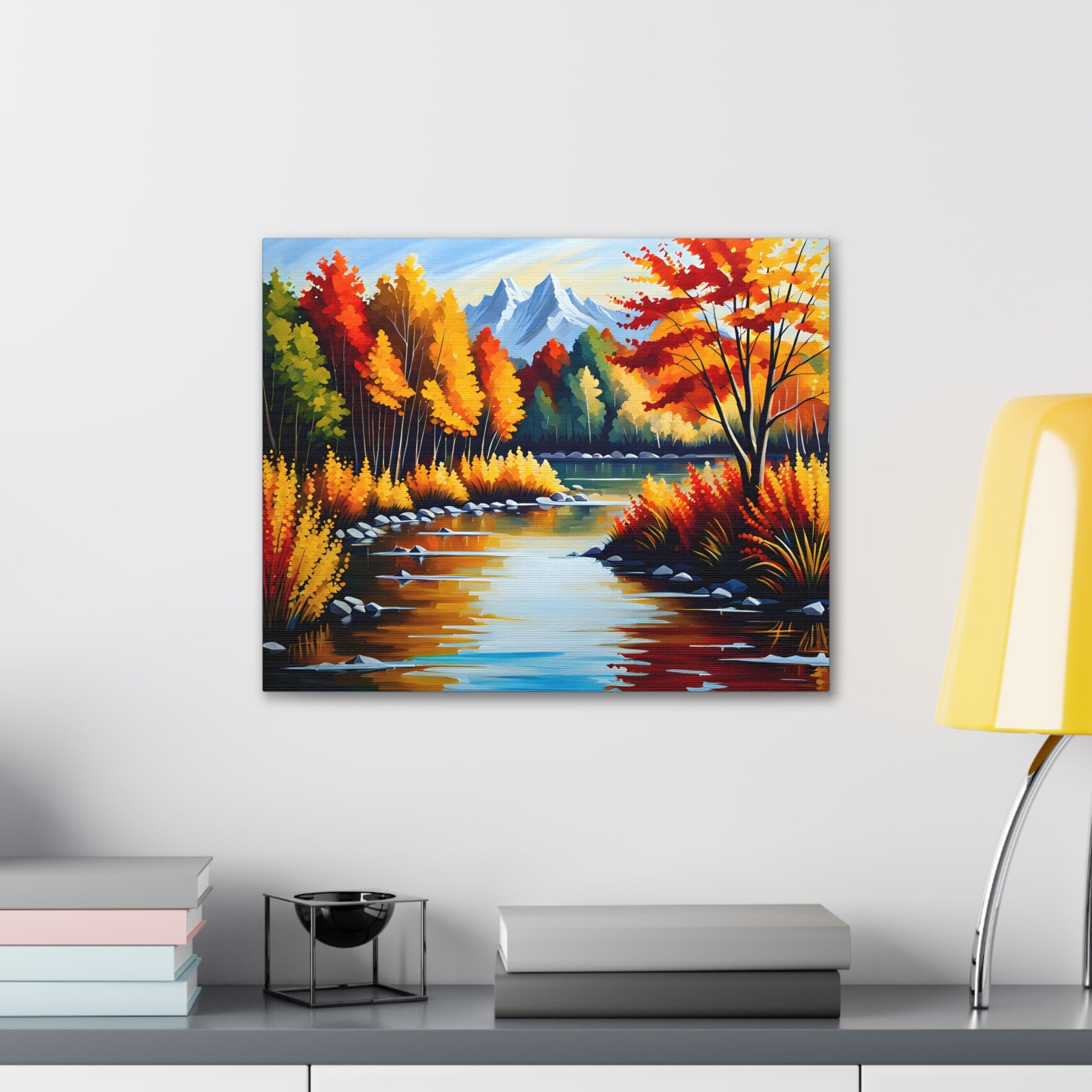 Capture the vibrant beauty of fall with Autumn Hues. This stunning oil painting brings a rich palette of autumn colors to life on high-quality cotton canvas. The reflection of trees in a calm river evokes serenity, perfect for adding warmth to any interior.
