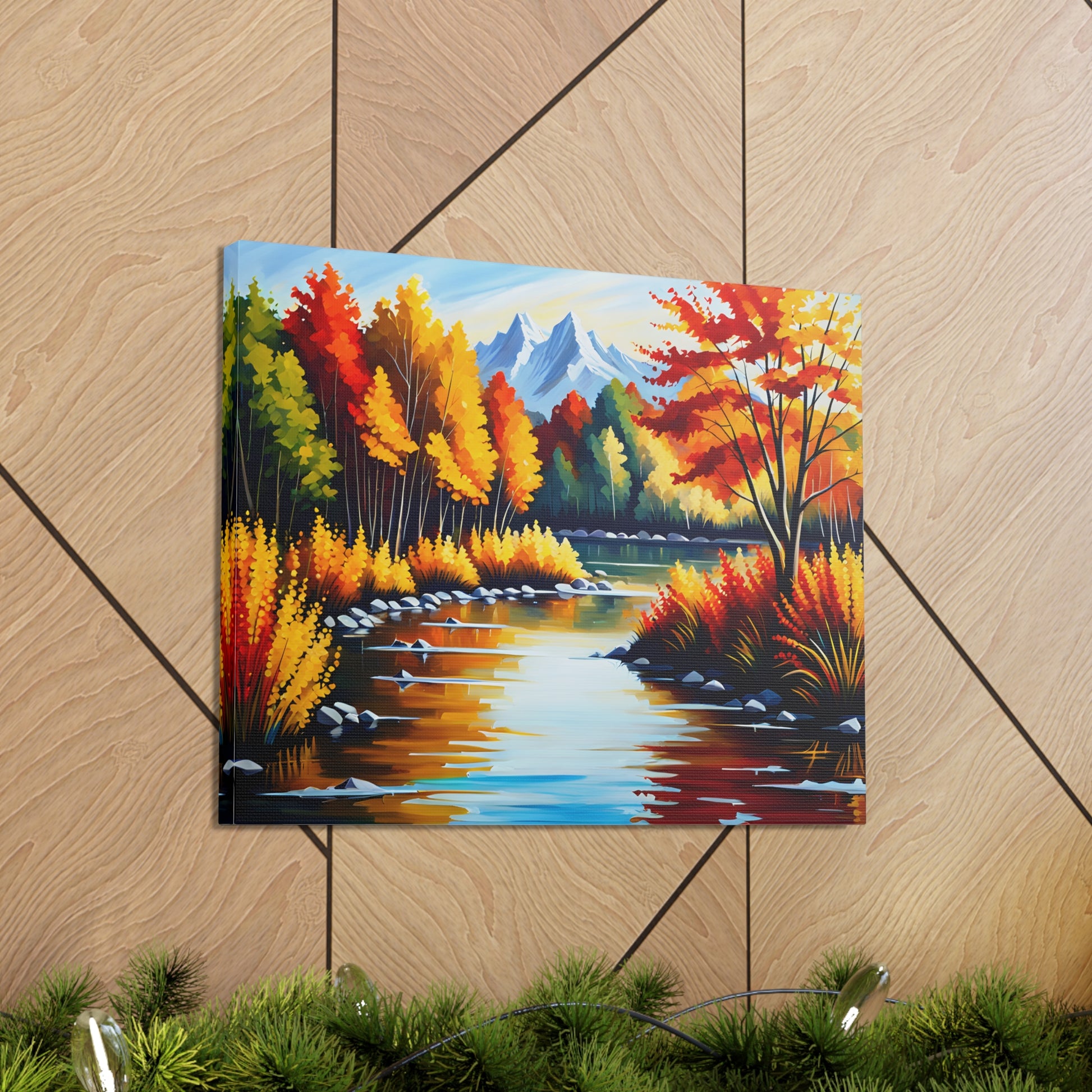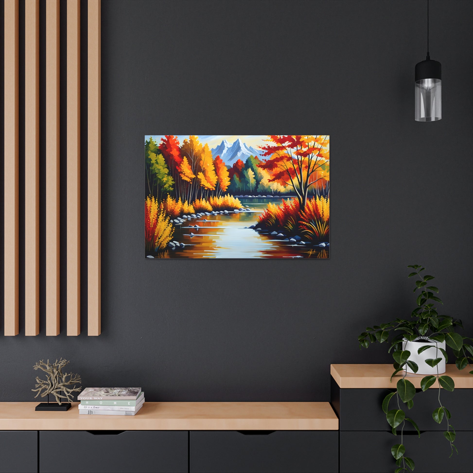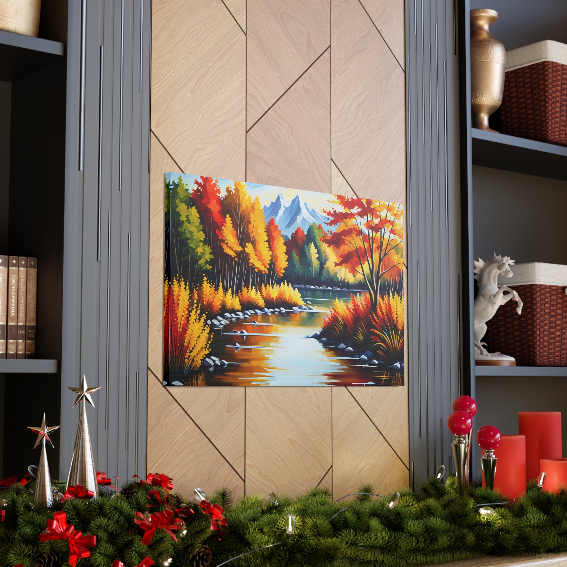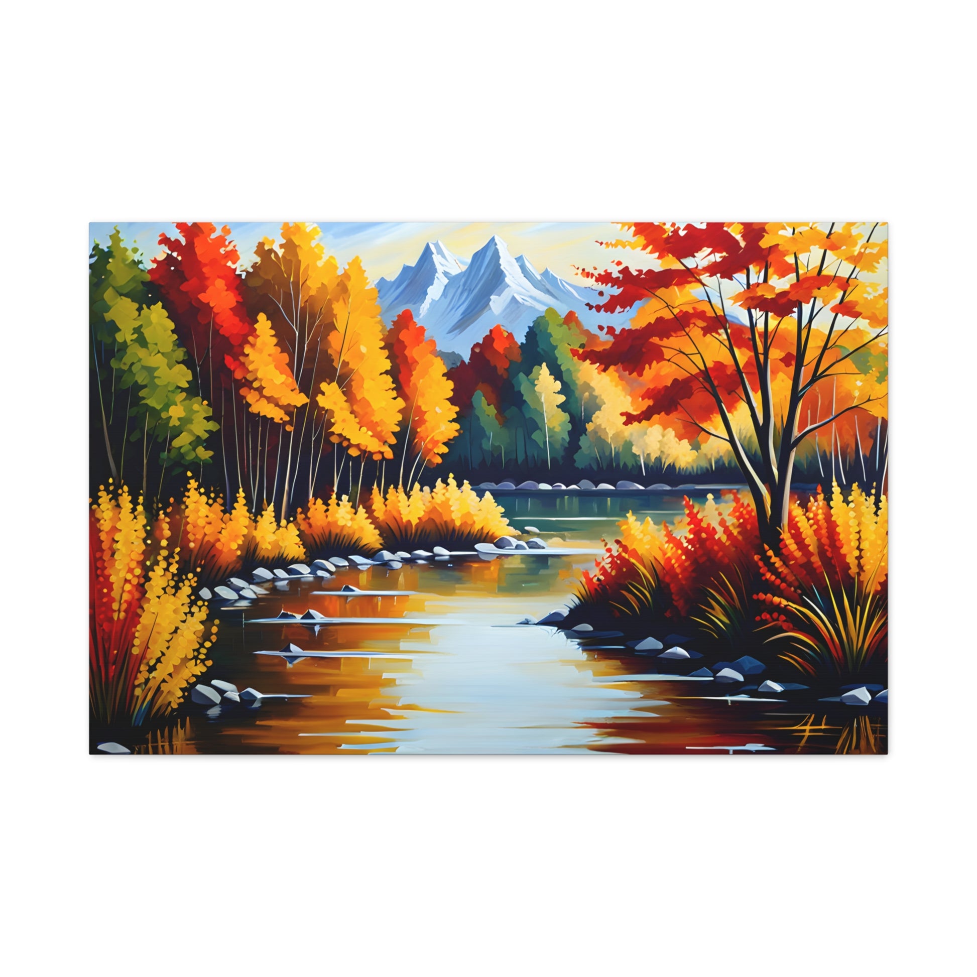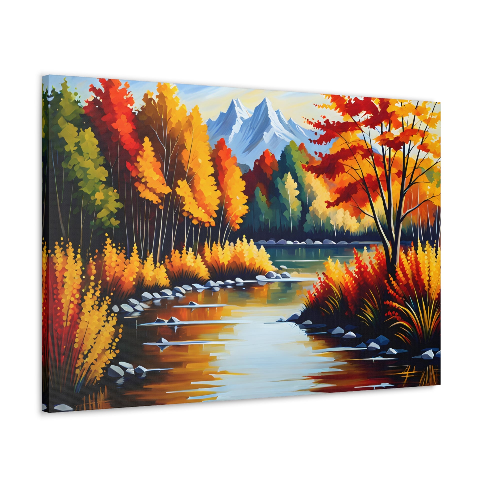 Capture the vibrant beauty of fall with Autumn Hues. This stunning oil painting brings a rich palette of autumn colors to life on high-quality cotton canvas. The reflection of trees in a calm river evokes serenity, perfect for adding warmth to any interior.