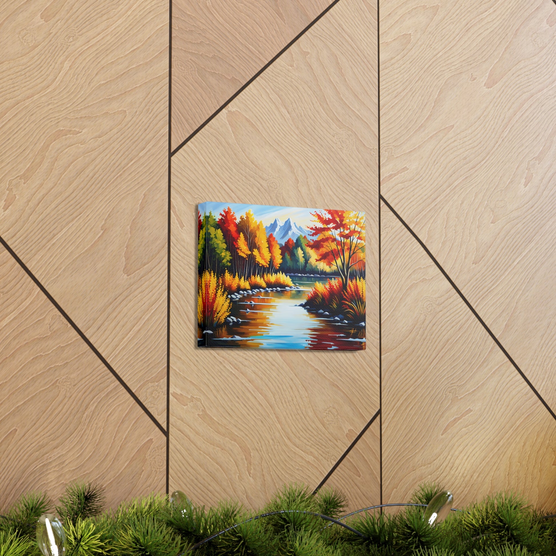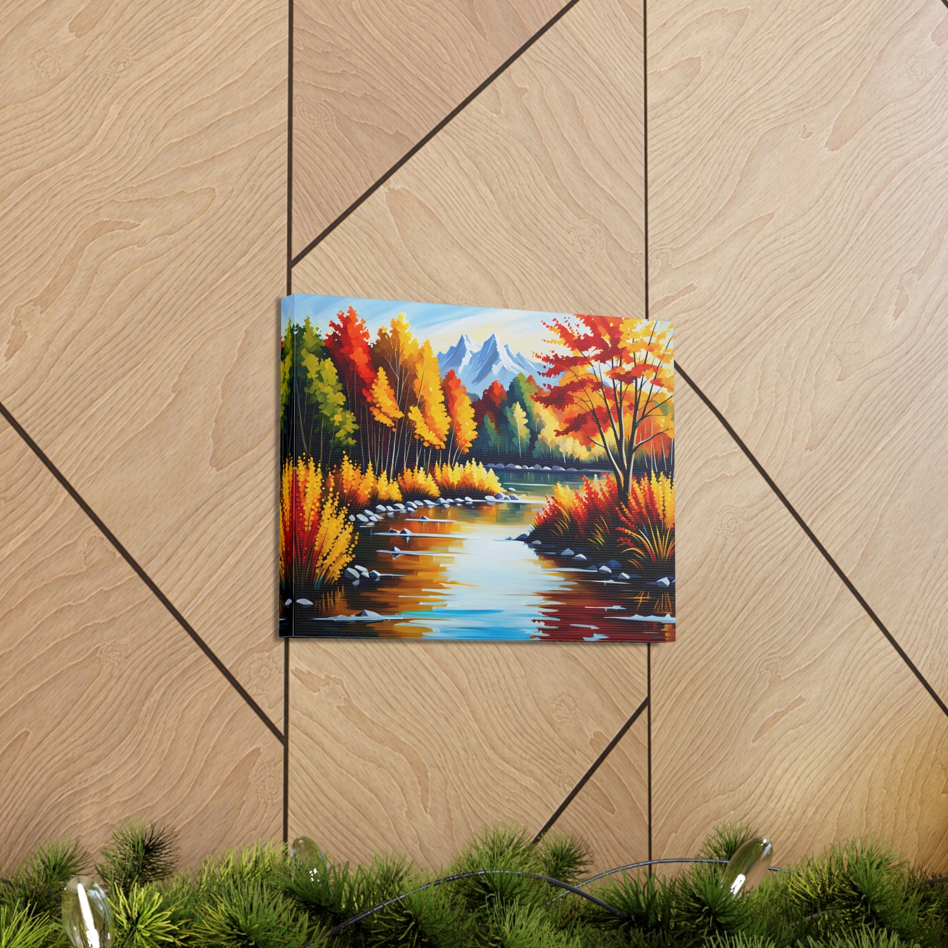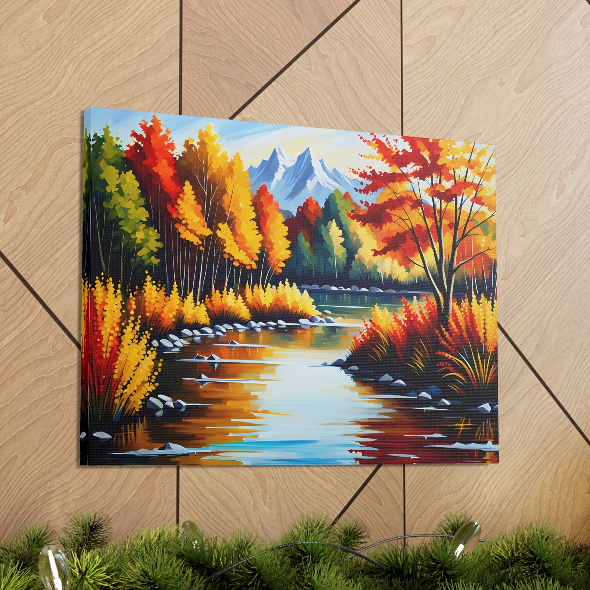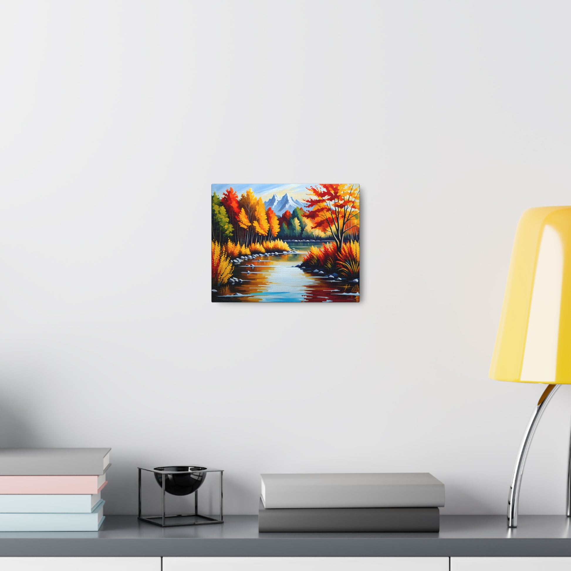 Capture the vibrant beauty of fall with Autumn Hues. This stunning oil painting brings a rich palette of autumn colors to life on high-quality cotton canvas. The reflection of trees in a calm river evokes serenity, perfect for adding warmth to any interior.