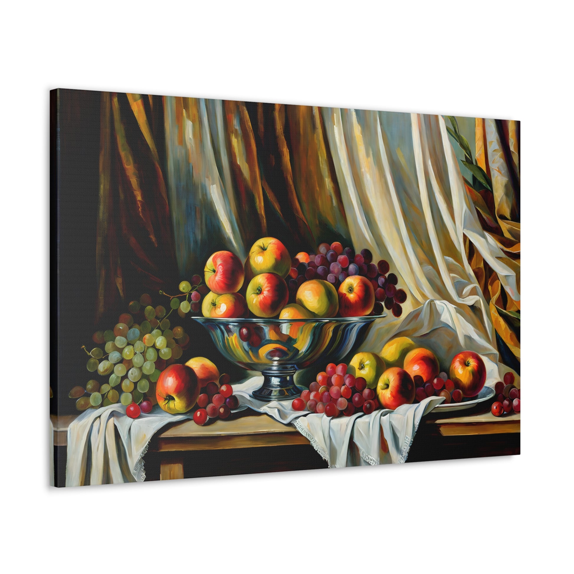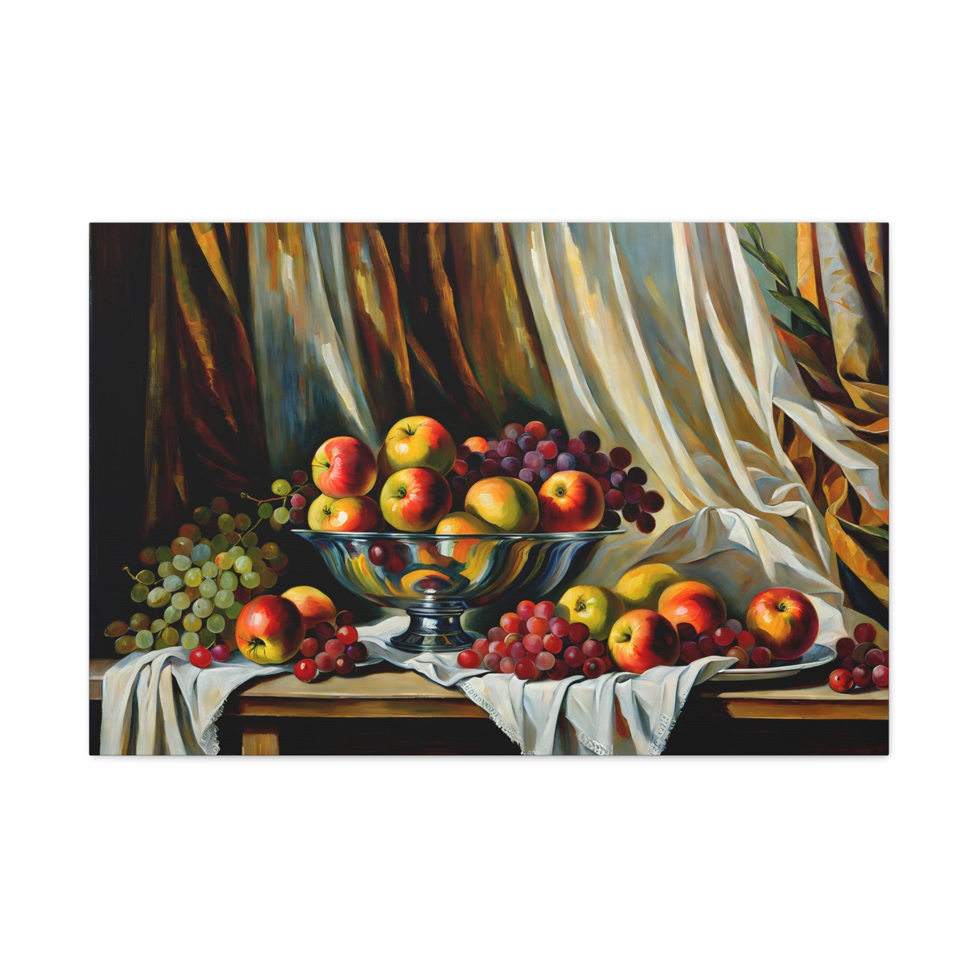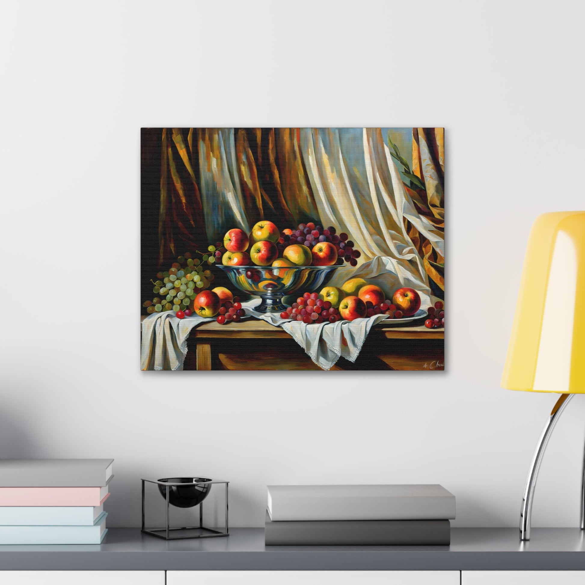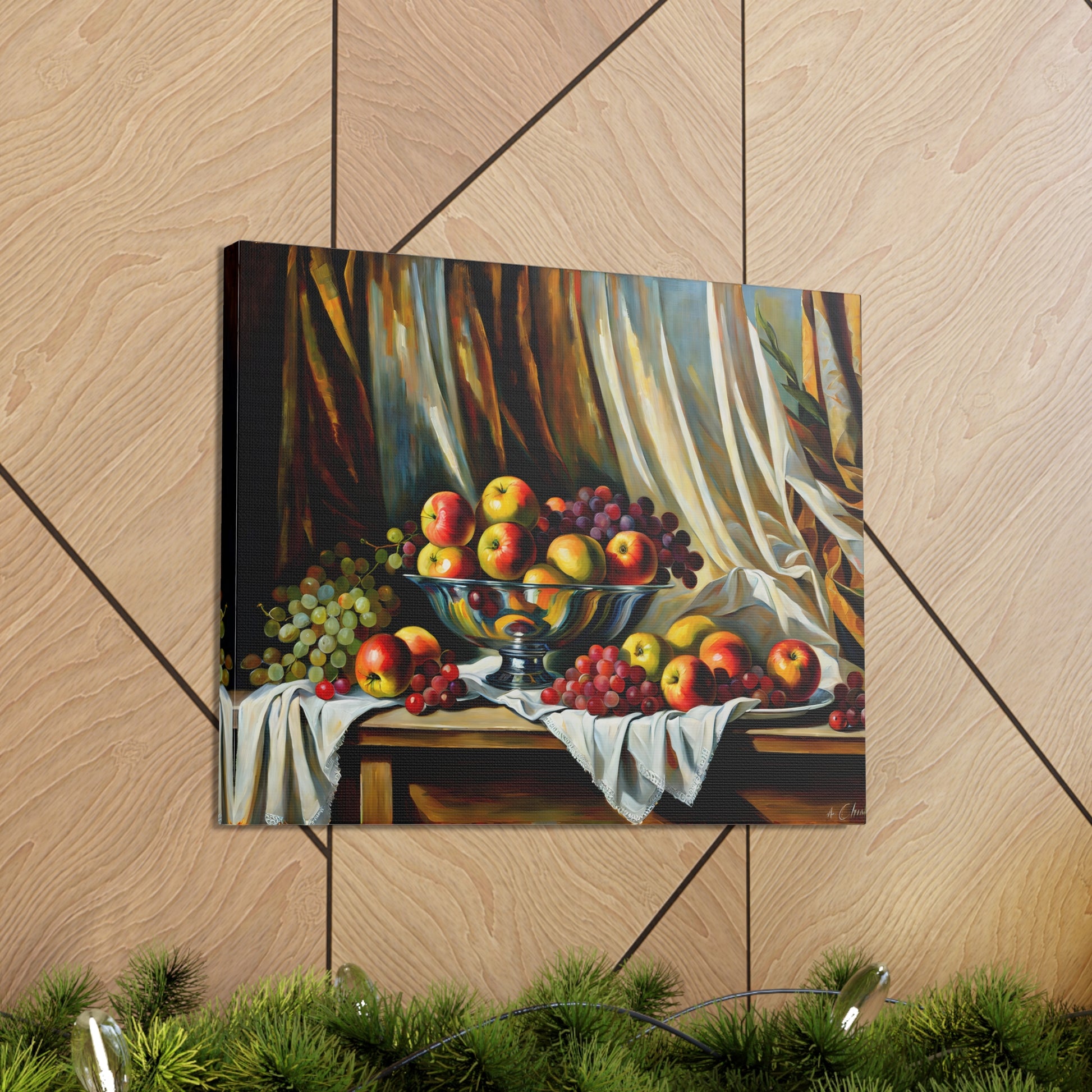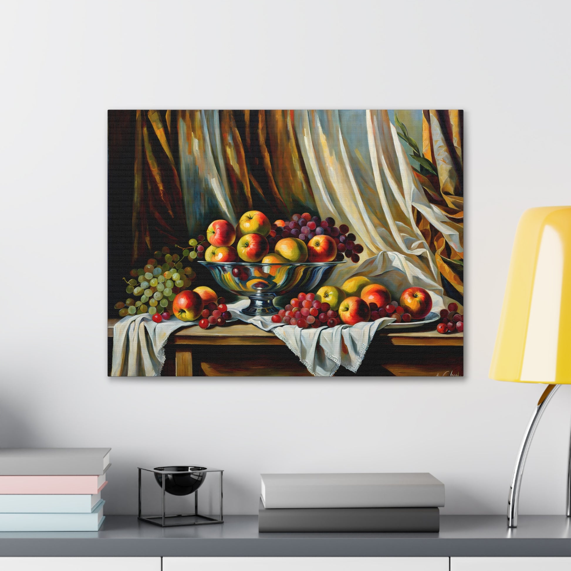 "Calming Table" is a classic still life oil painting featuring a bowl of fruit with soft, inviting colors. This artwork, painted on high-quality cotton canvas, adds a touch of classical charm to any indoor space, evoking a sense of calm and tradition.