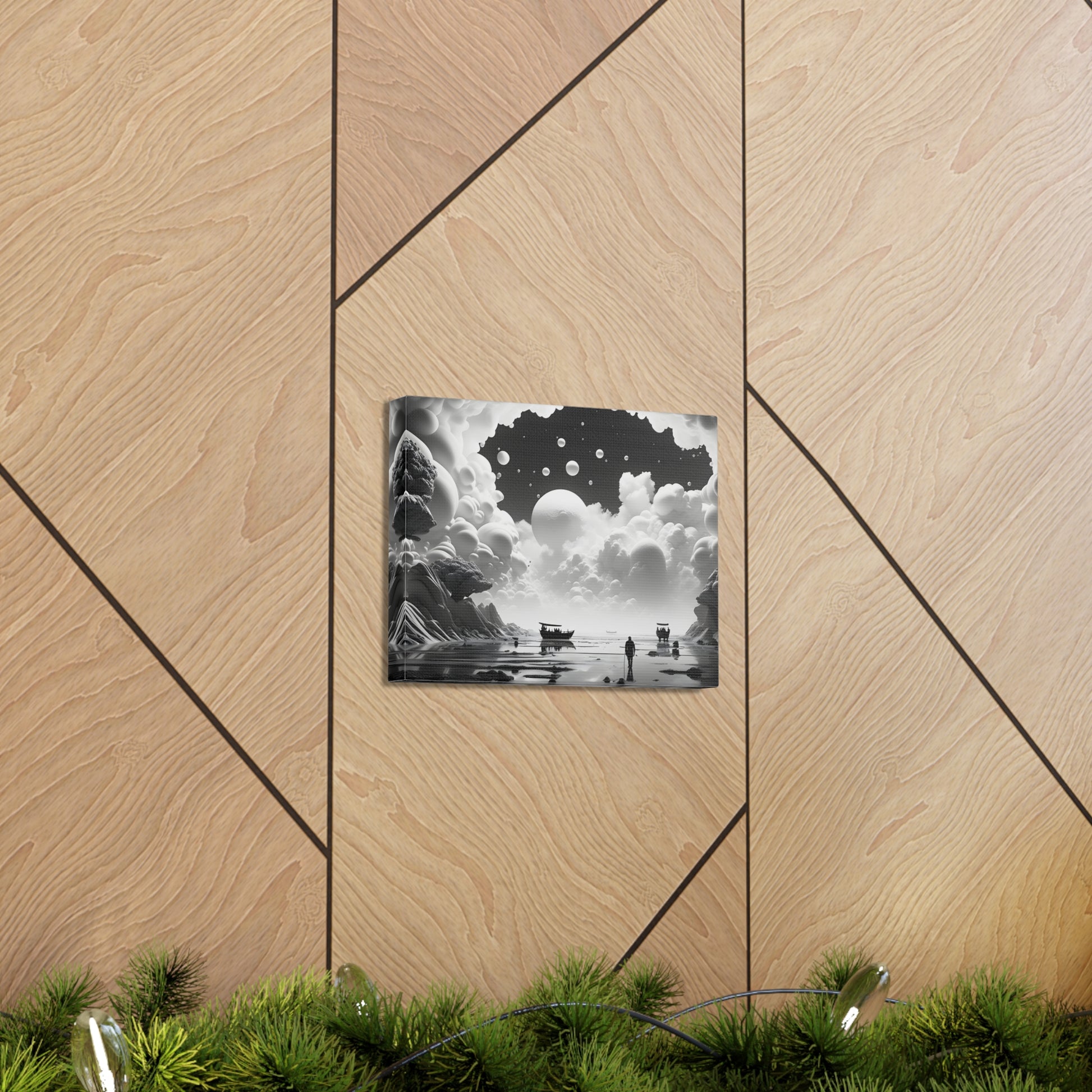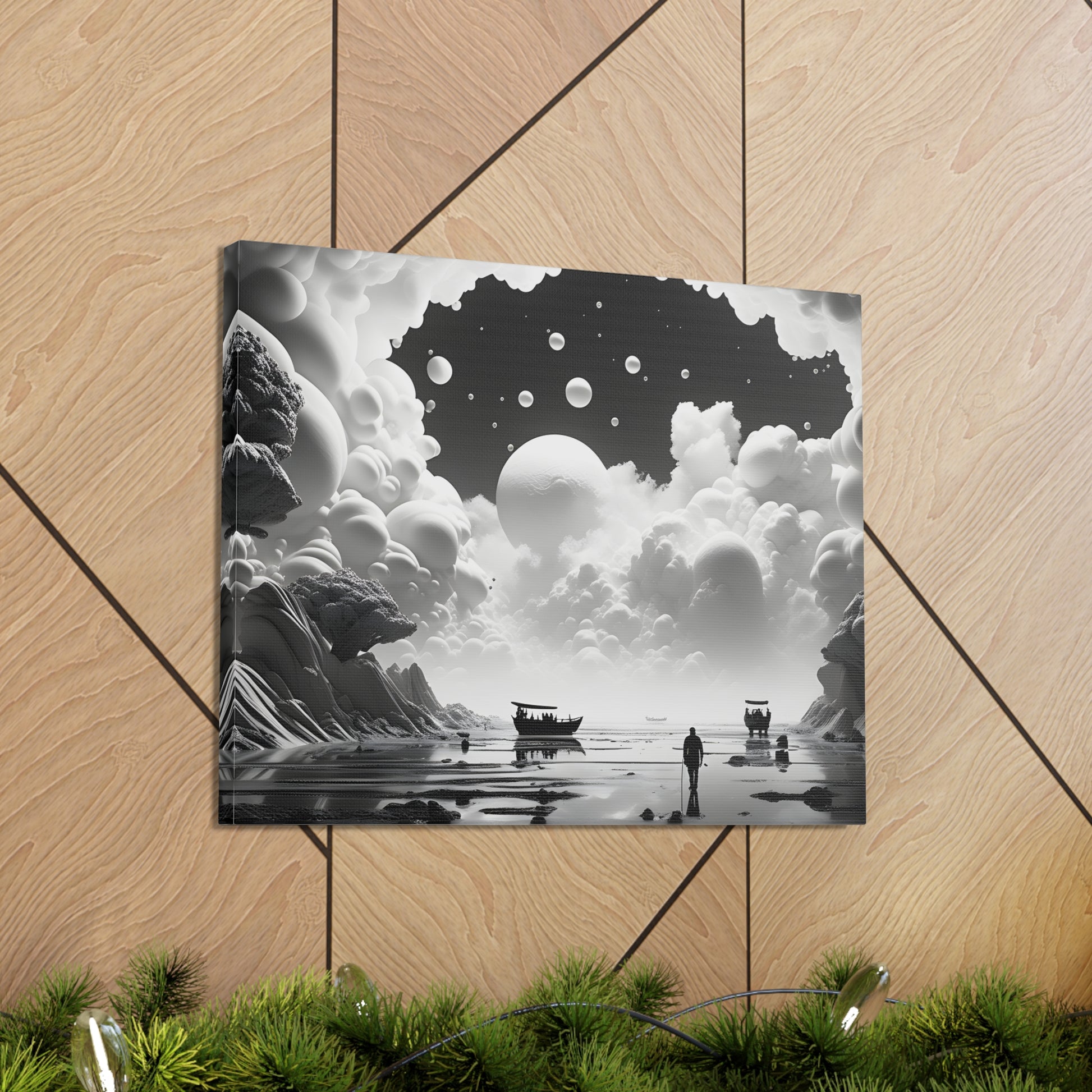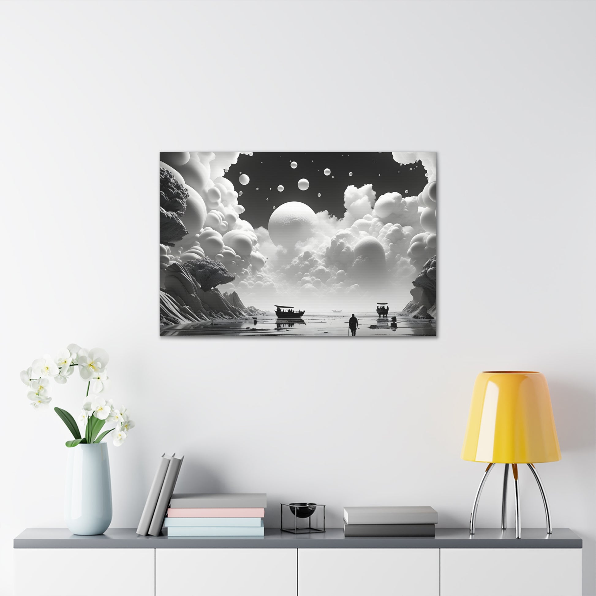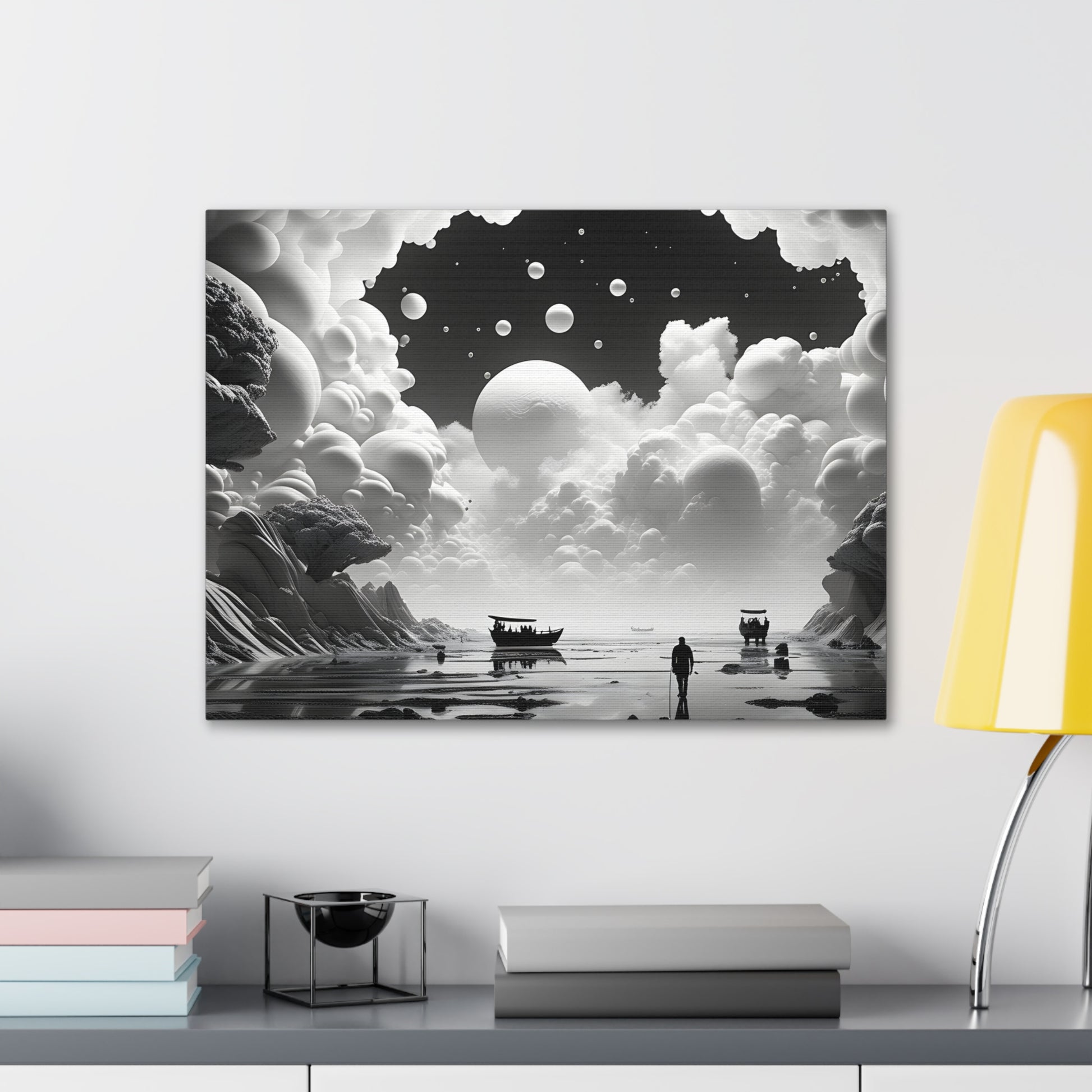 Immerse your space in celestial charm with "Celestial Waterway," our captivating black and white wall décor. This mesmerizing artwork showcases a picturesque canal adorned with boats, set against a celestial sky filled with planets.