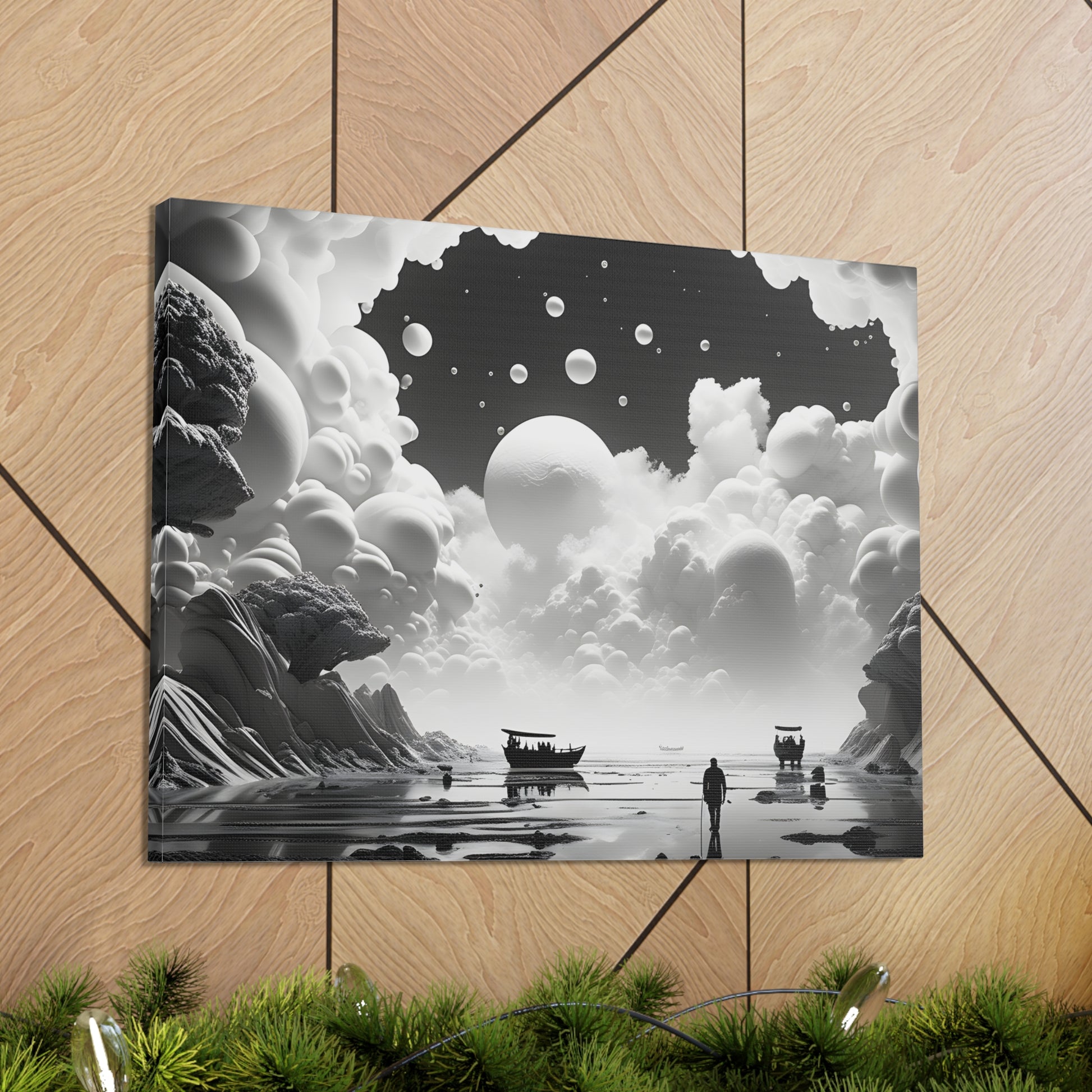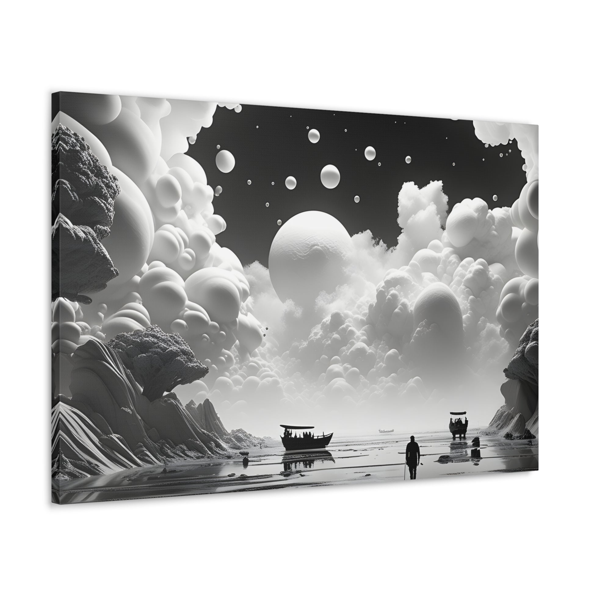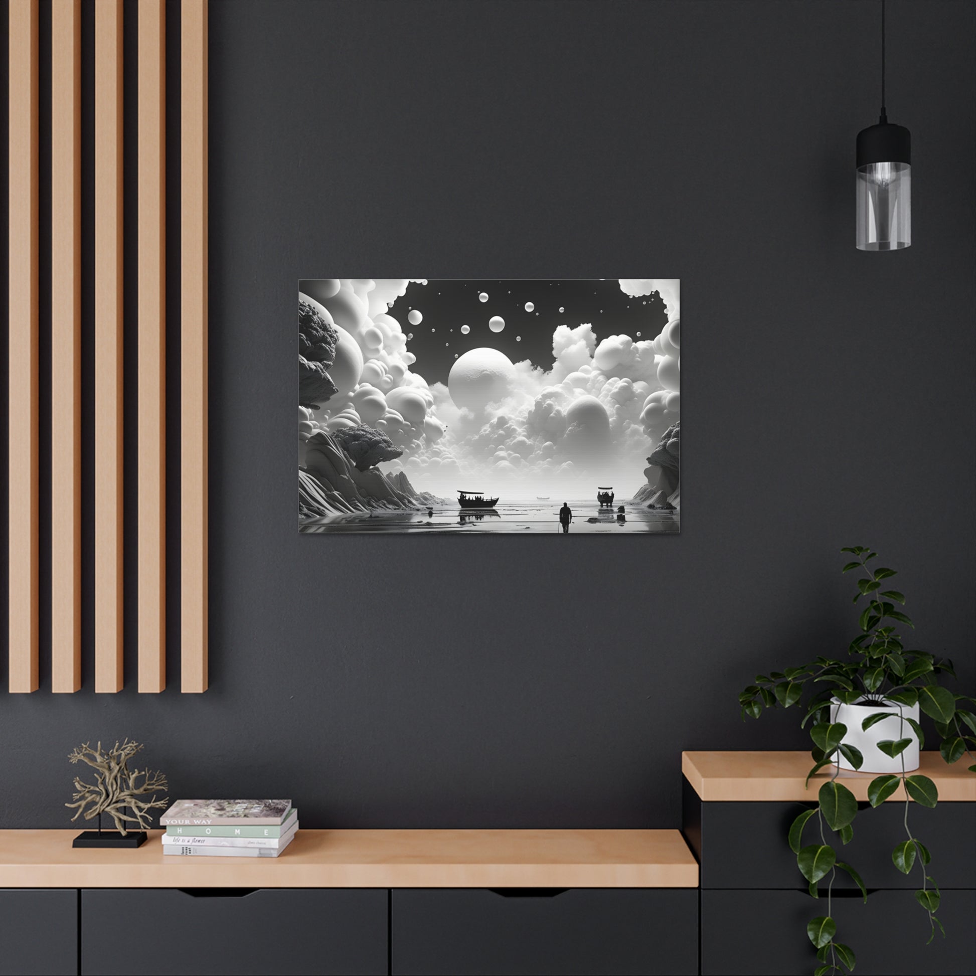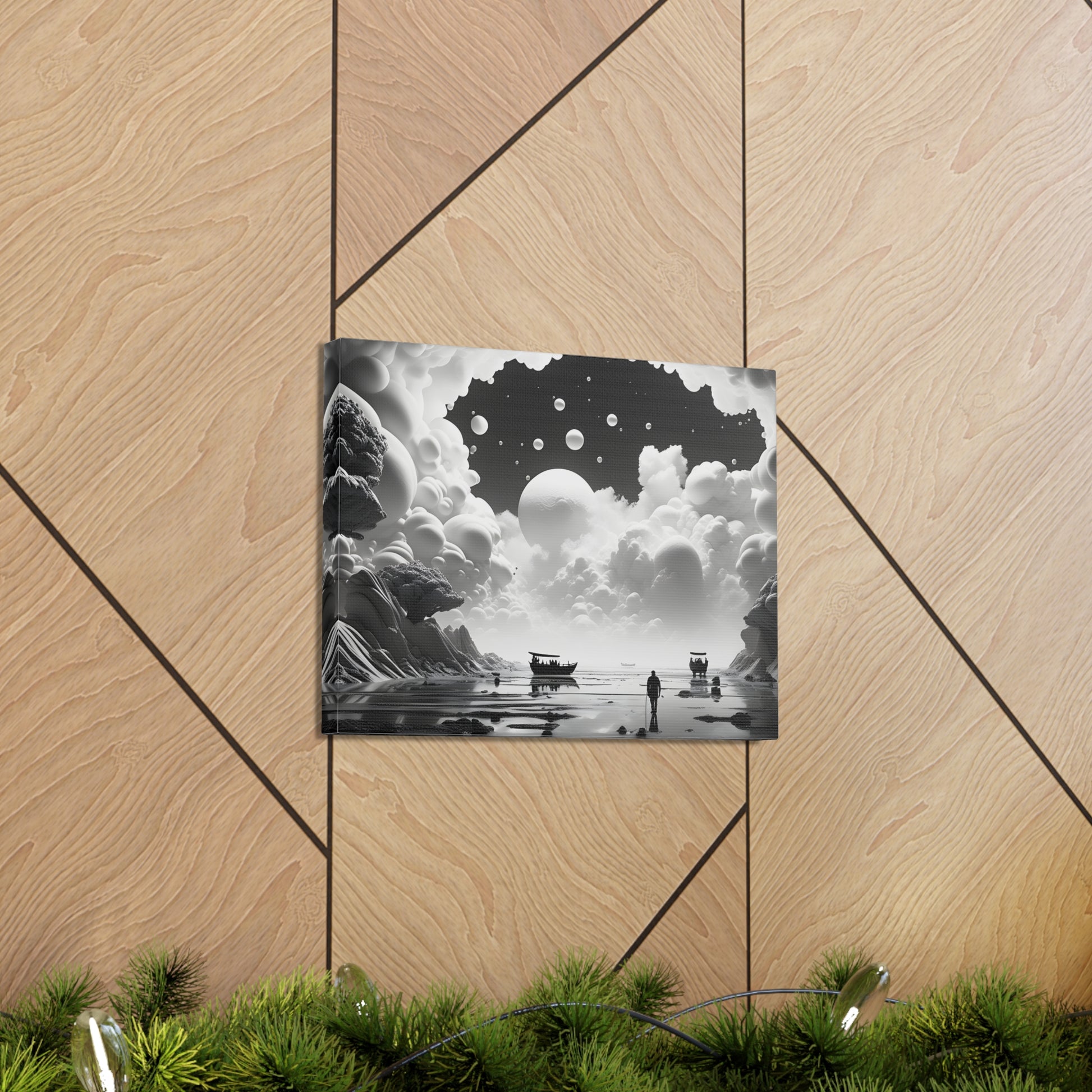 Immerse your space in celestial charm with "Celestial Waterway," our captivating black and white wall décor. This mesmerizing artwork showcases a picturesque canal adorned with boats, set against a celestial sky filled with planets.