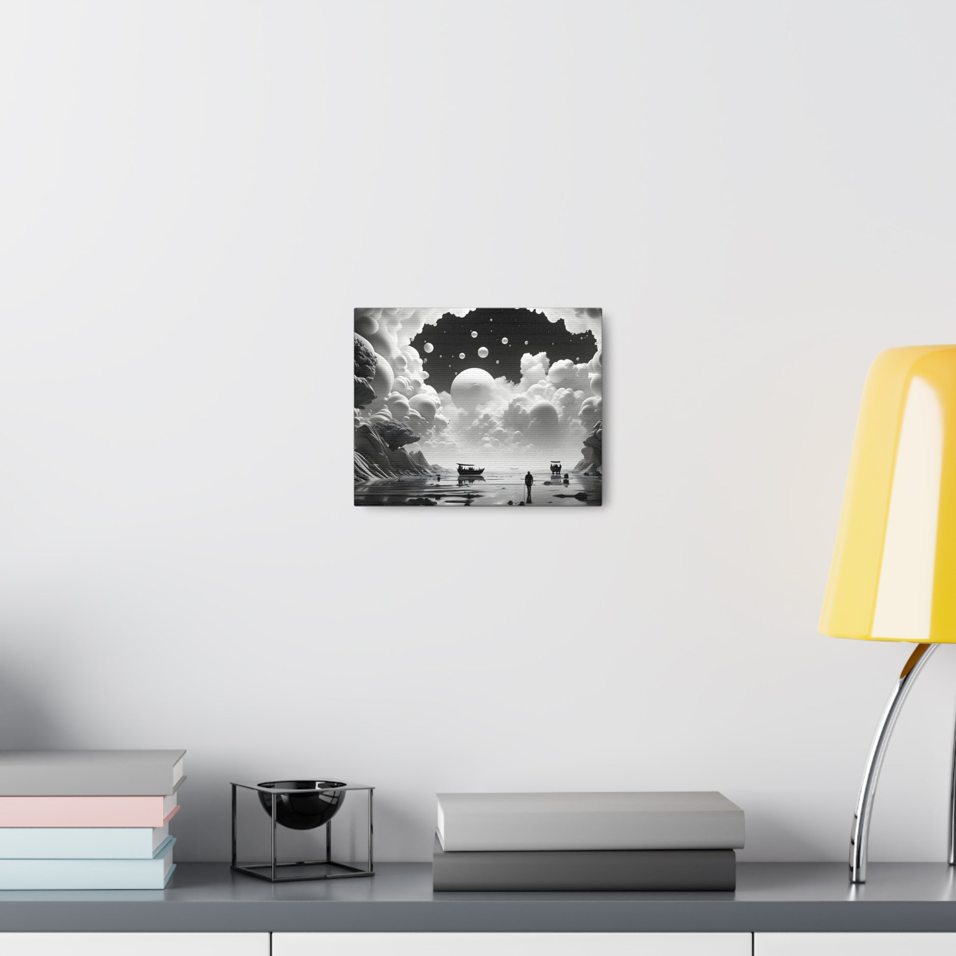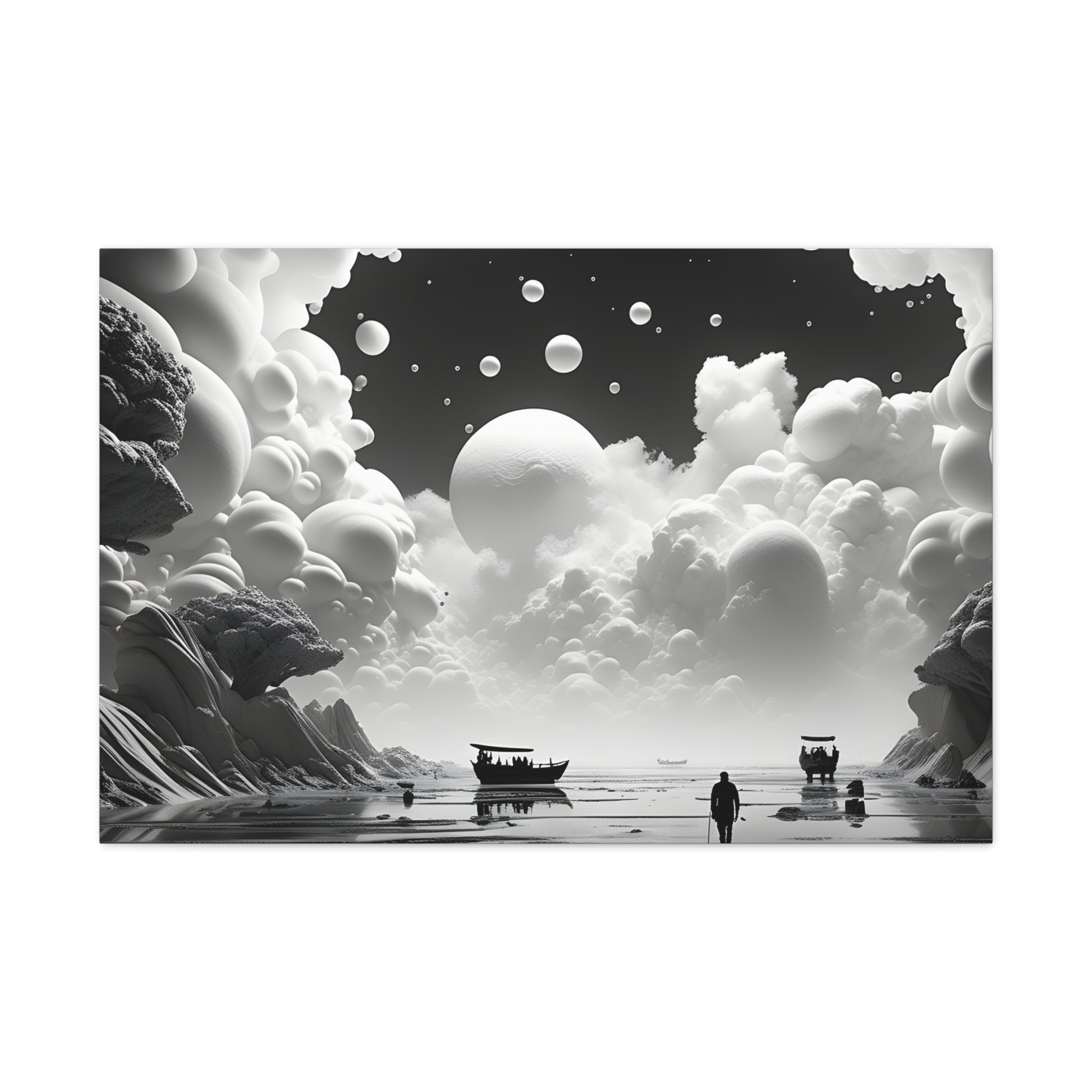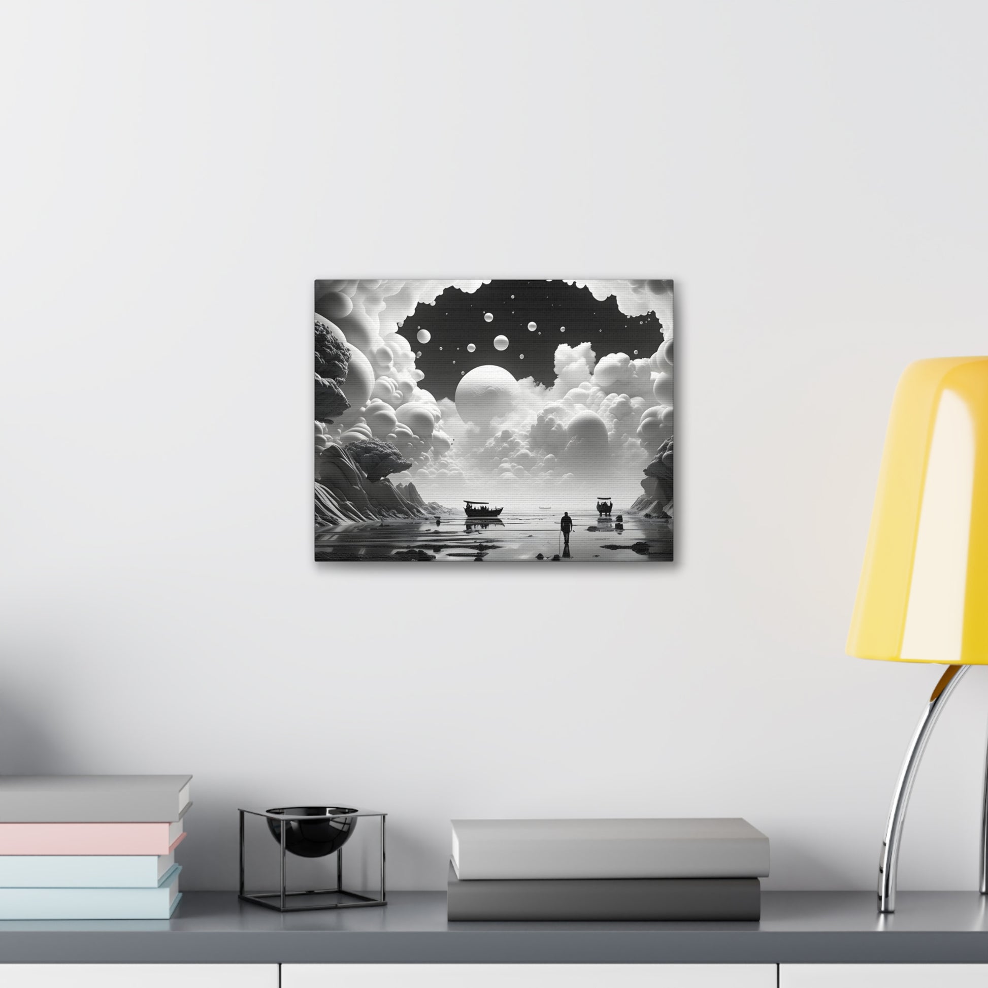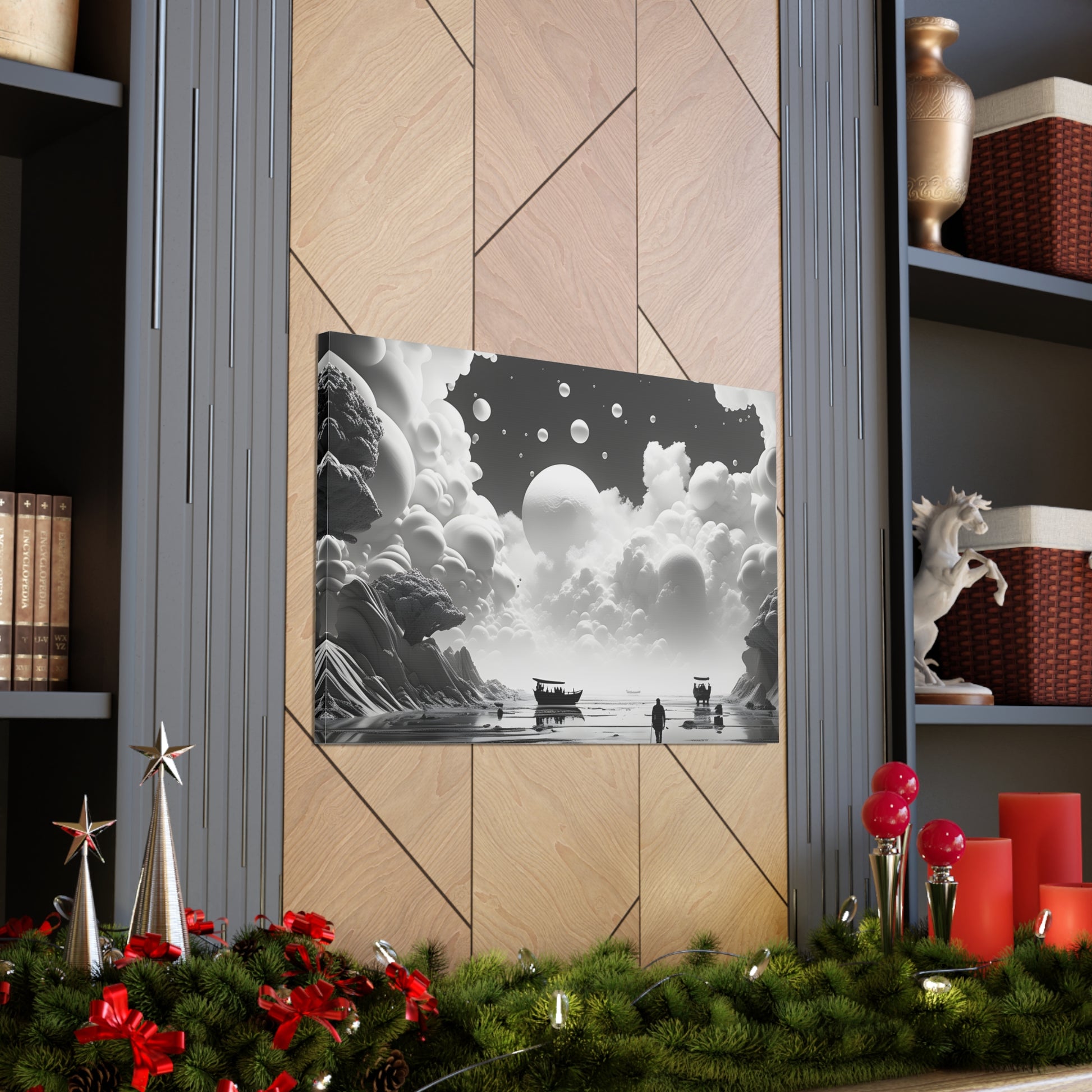 Immerse your space in celestial charm with "Celestial Waterway," our captivating black and white wall décor. This mesmerizing artwork showcases a picturesque canal adorned with boats, set against a celestial sky filled with planets.