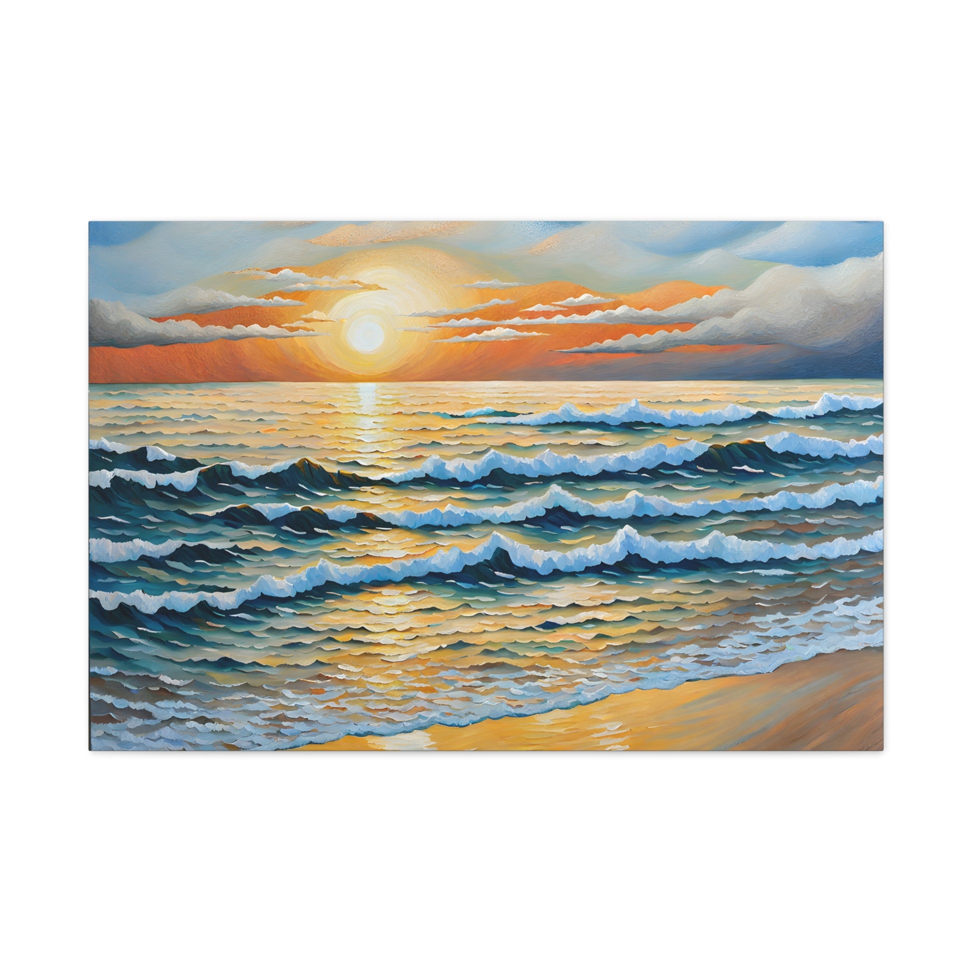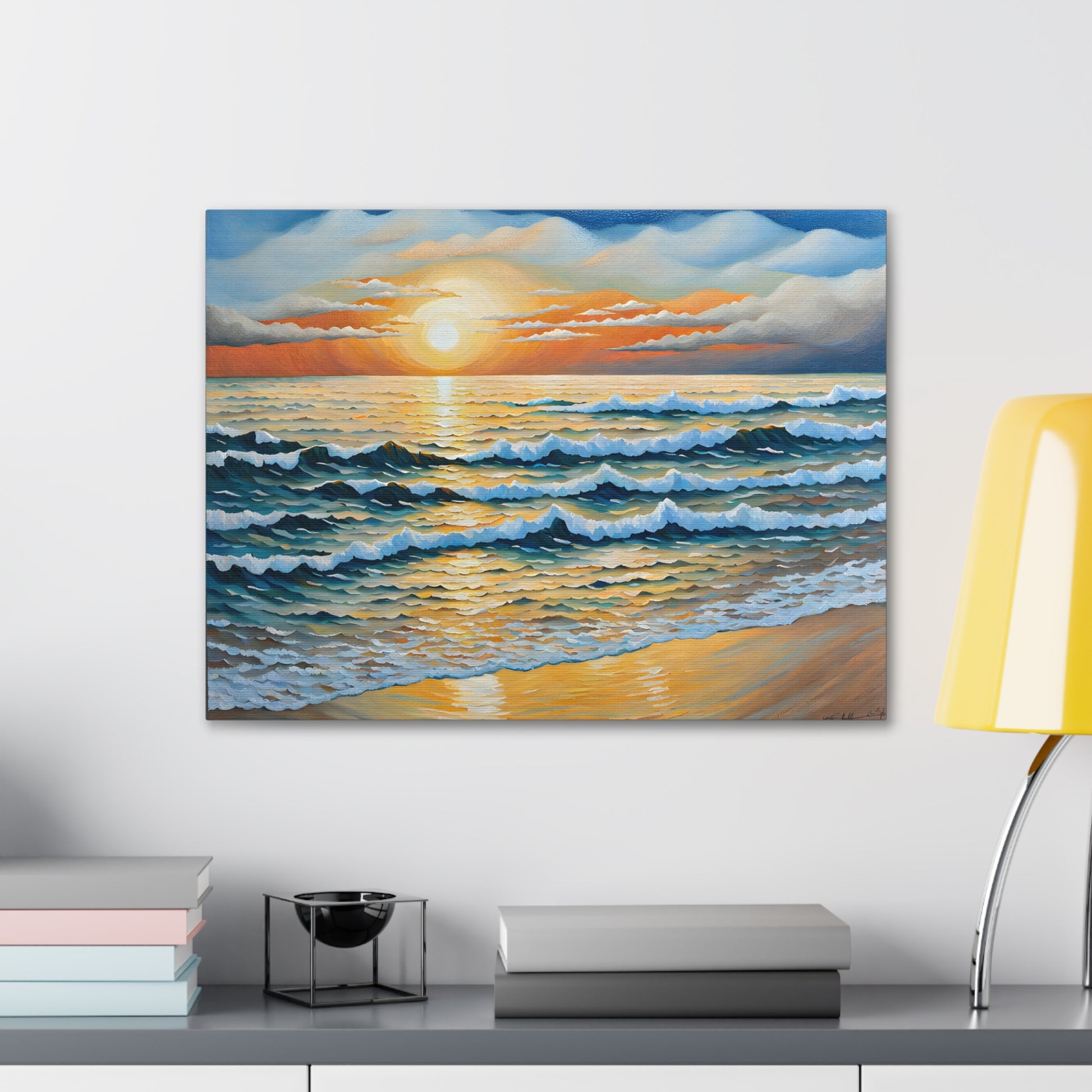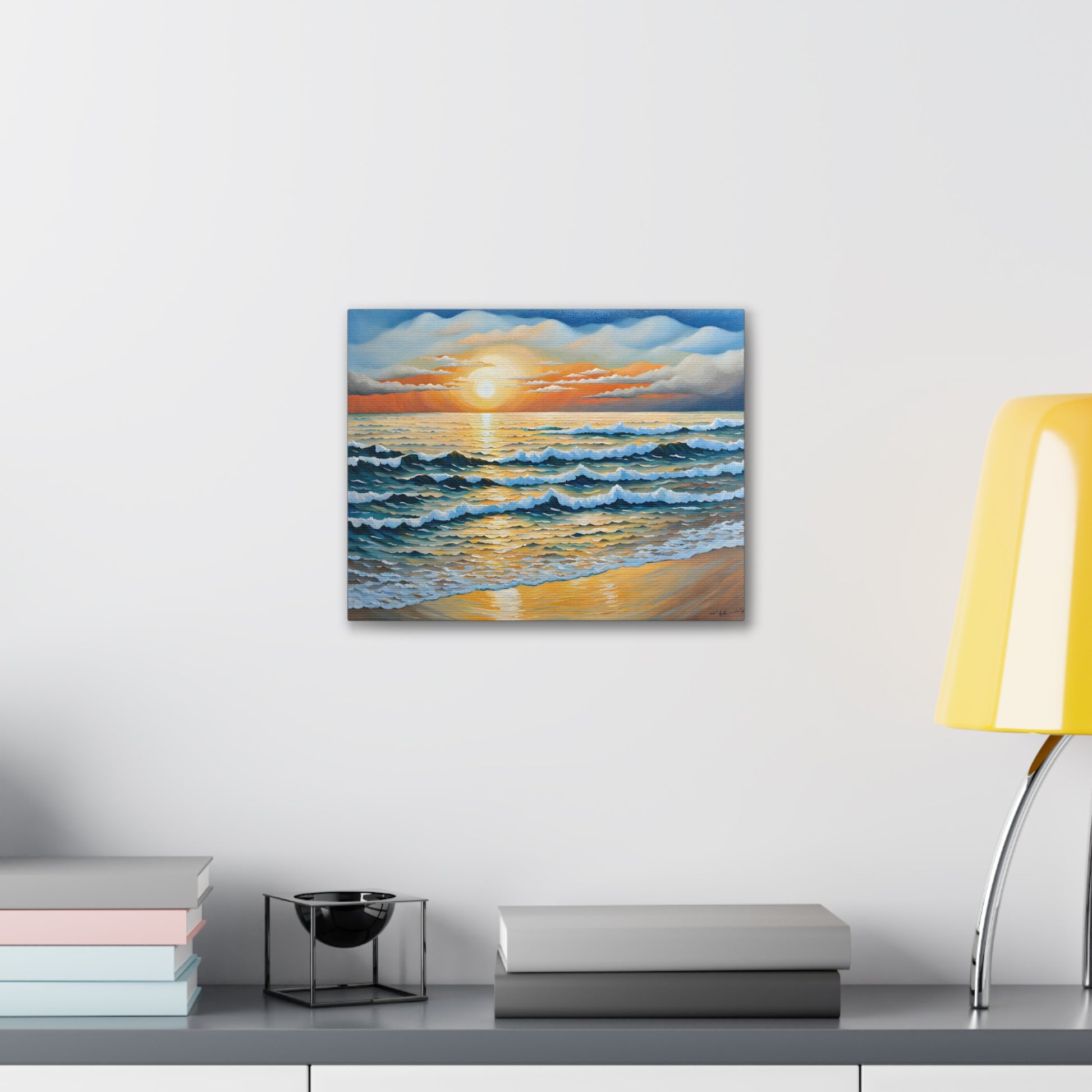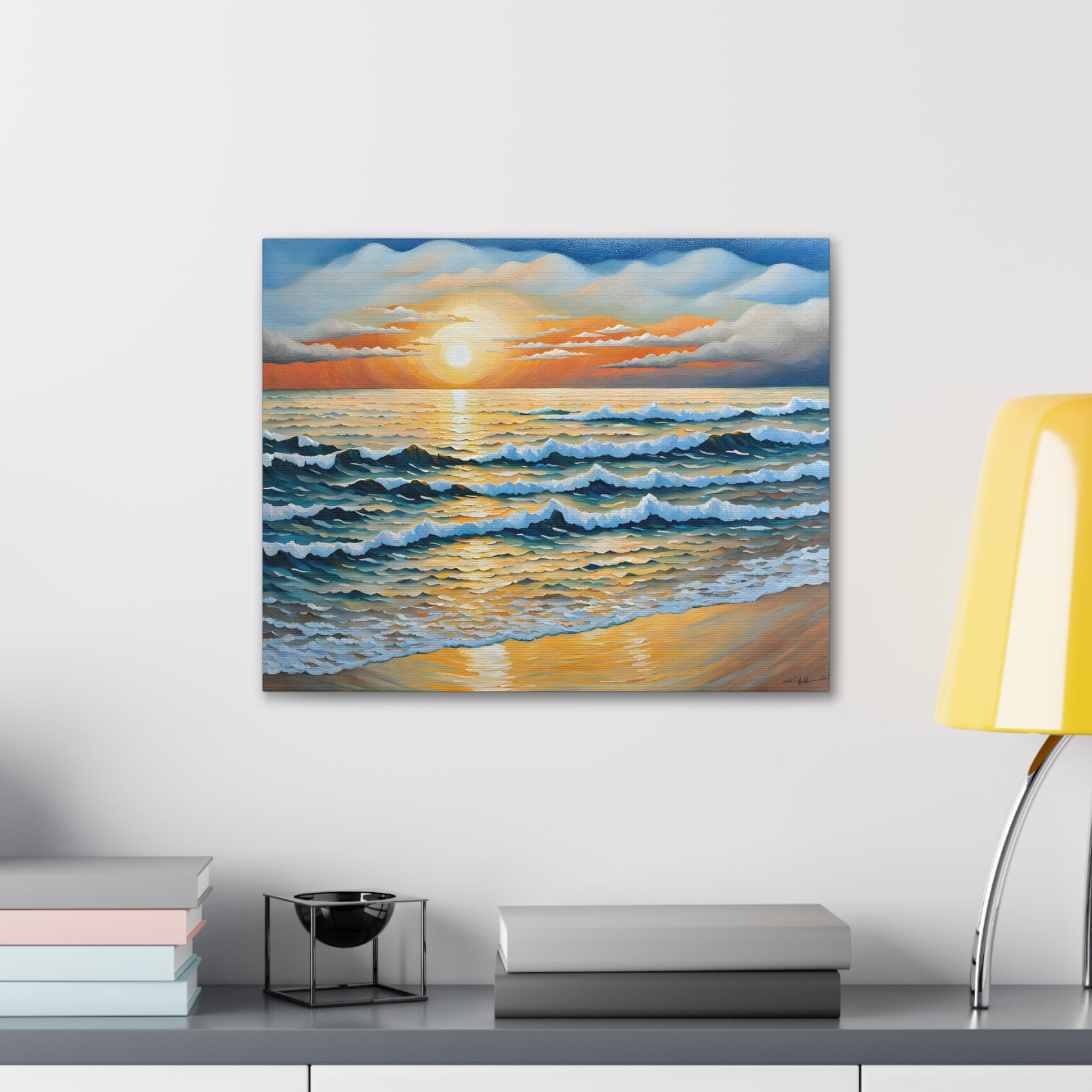 Bring balance and peace to your living space with "Coastal Harmony." This oil painting depicts the rhythmic flow of waves under the golden hues of a setting sun, offering a sense of tranquility and harmony.