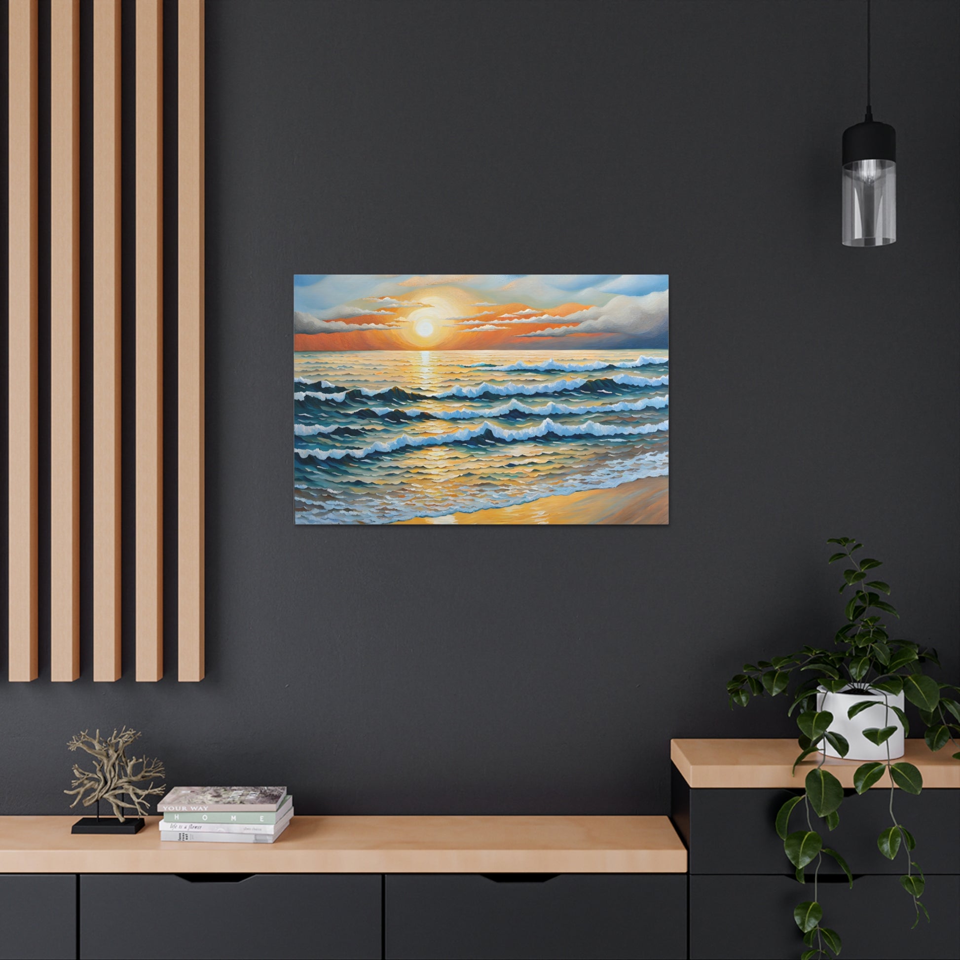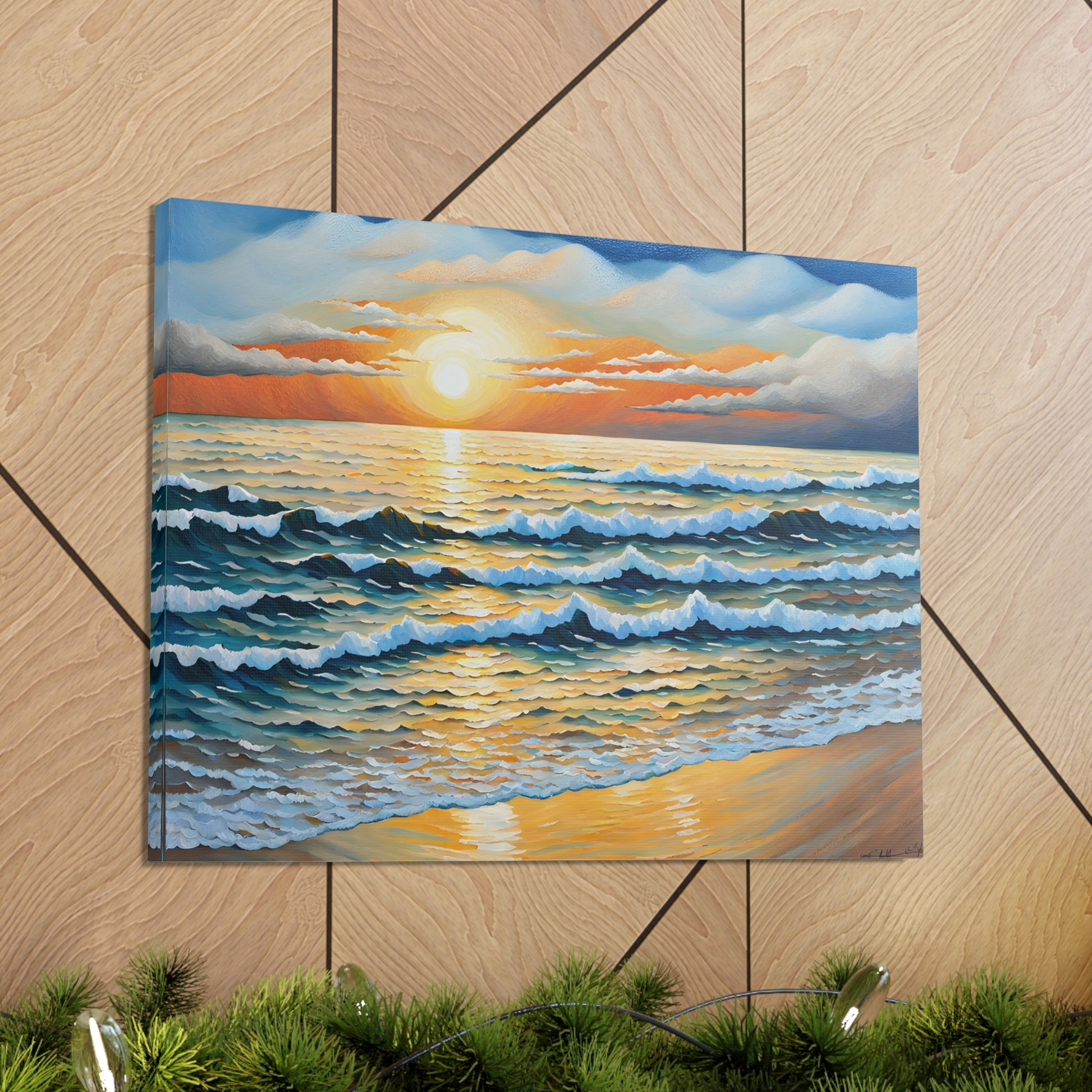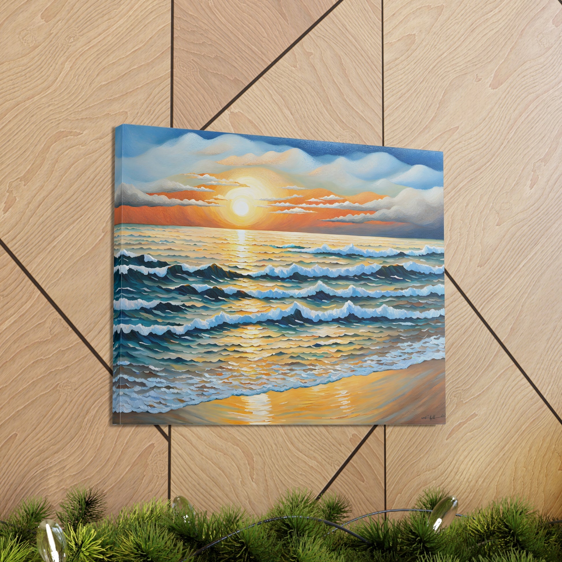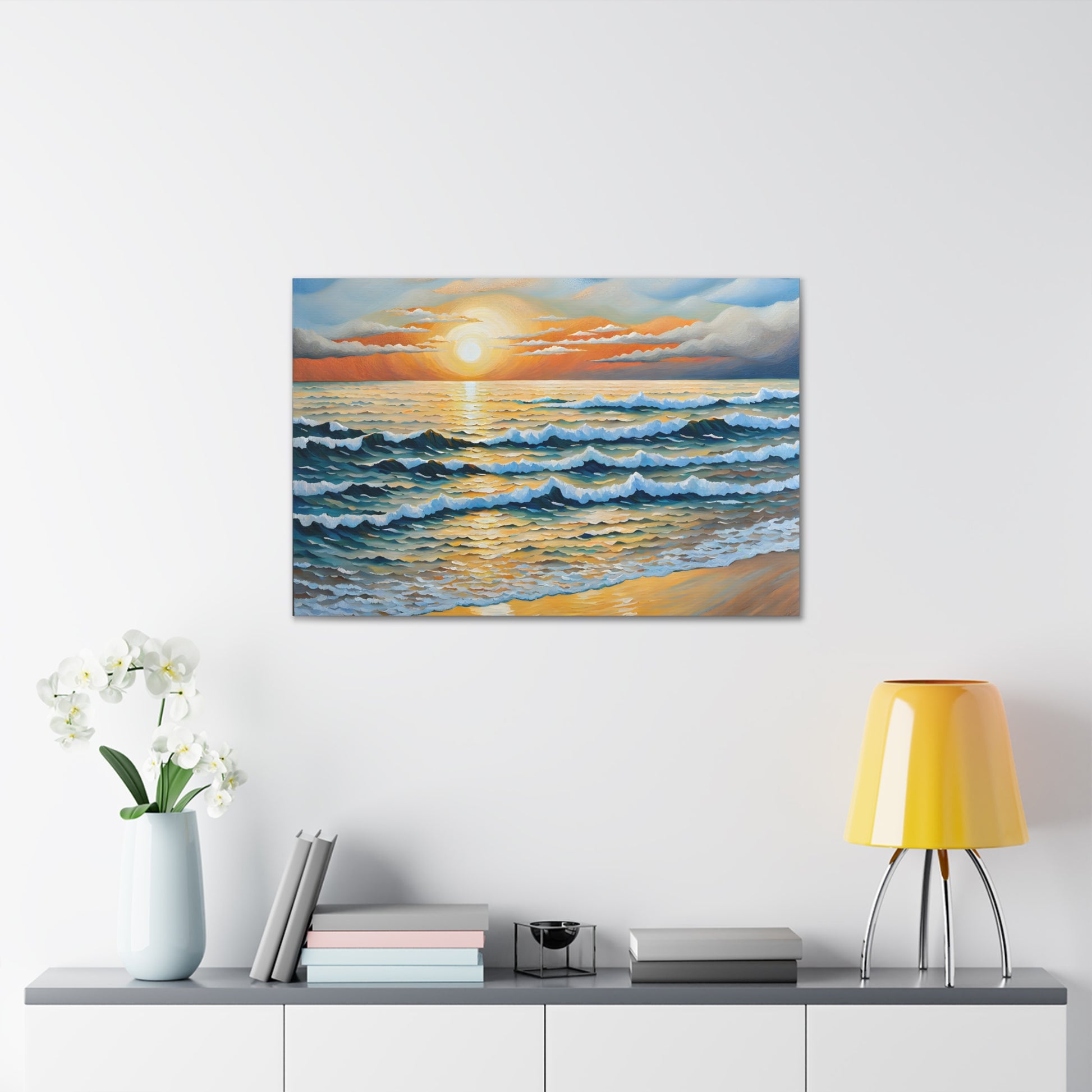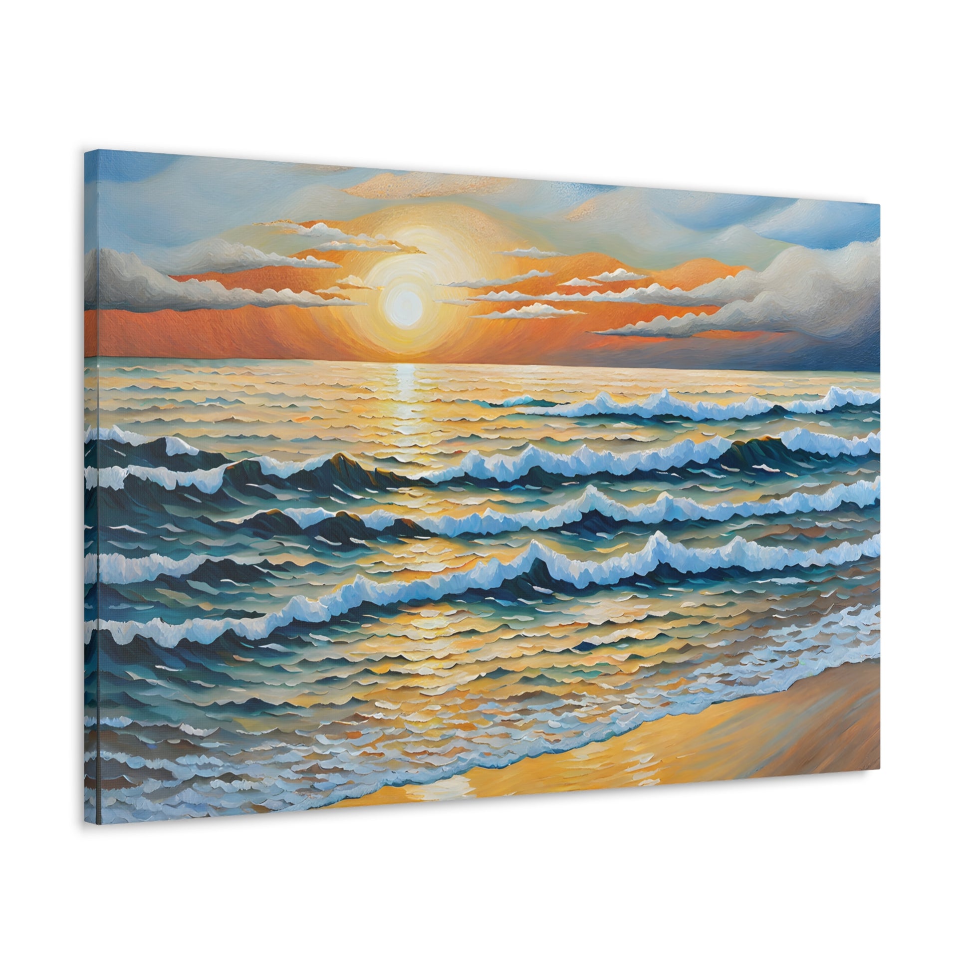 Bring balance and peace to your living space with "Coastal Harmony." This oil painting depicts the rhythmic flow of waves under the golden hues of a setting sun, offering a sense of tranquility and harmony.