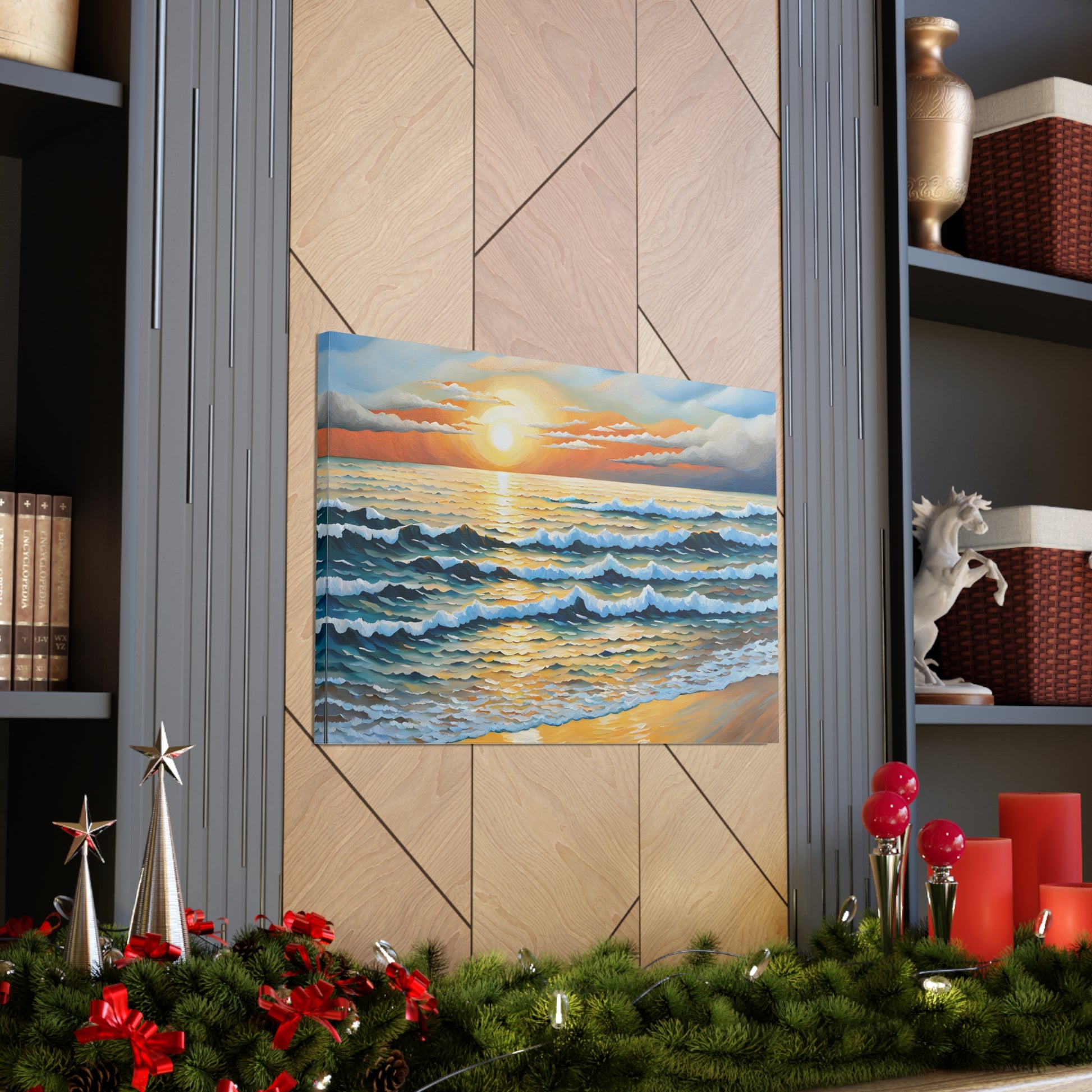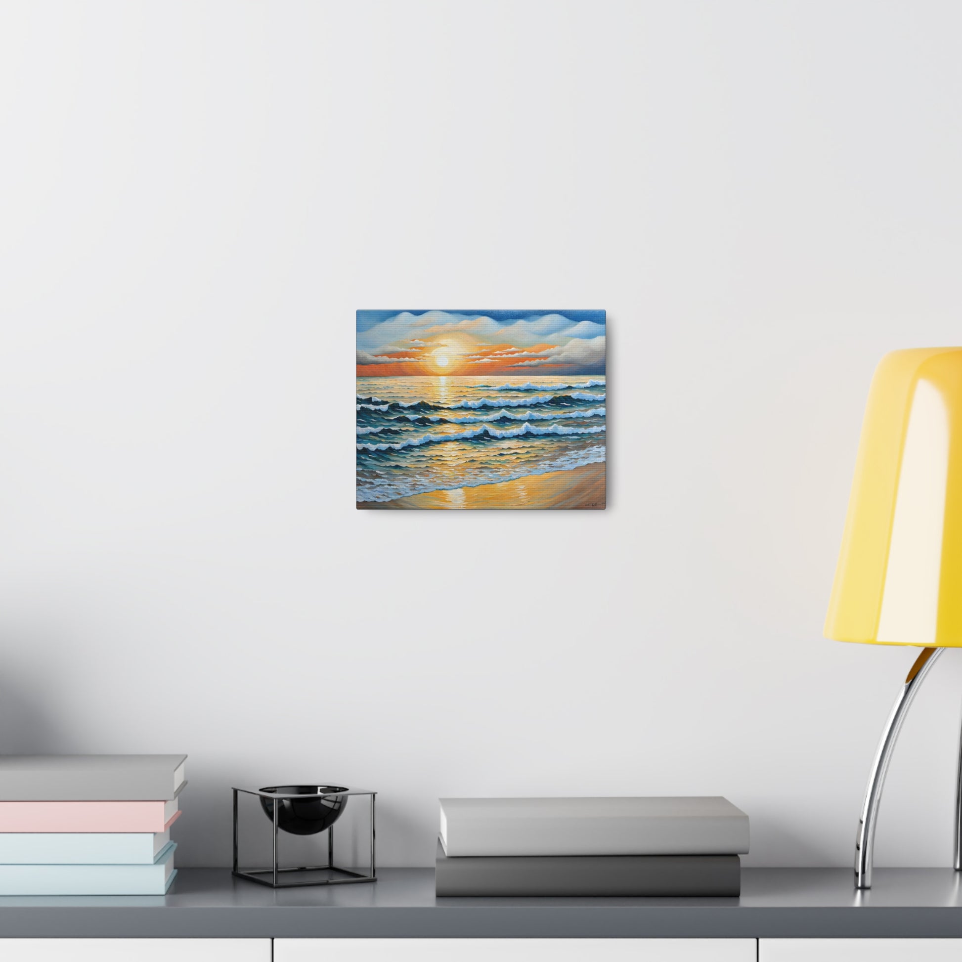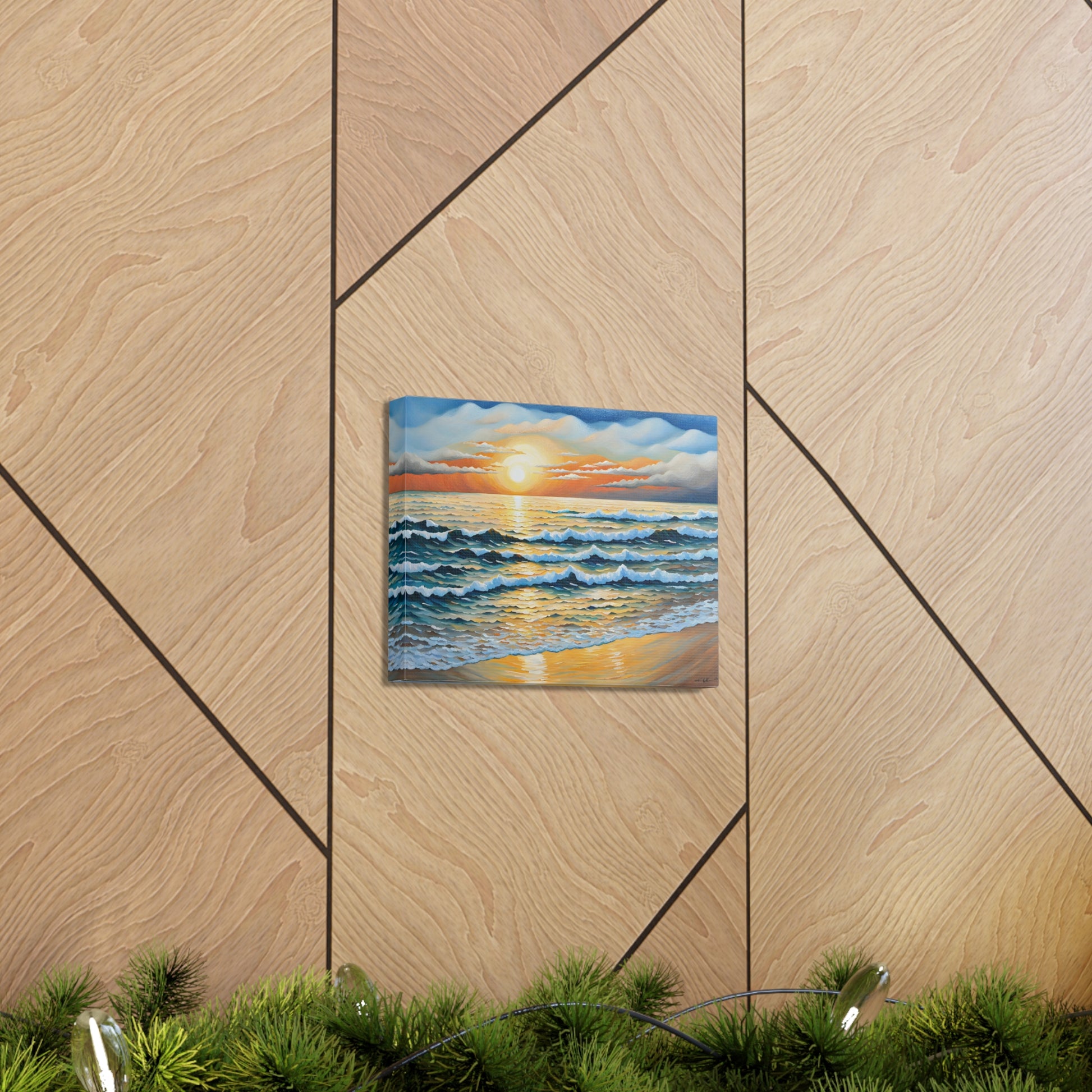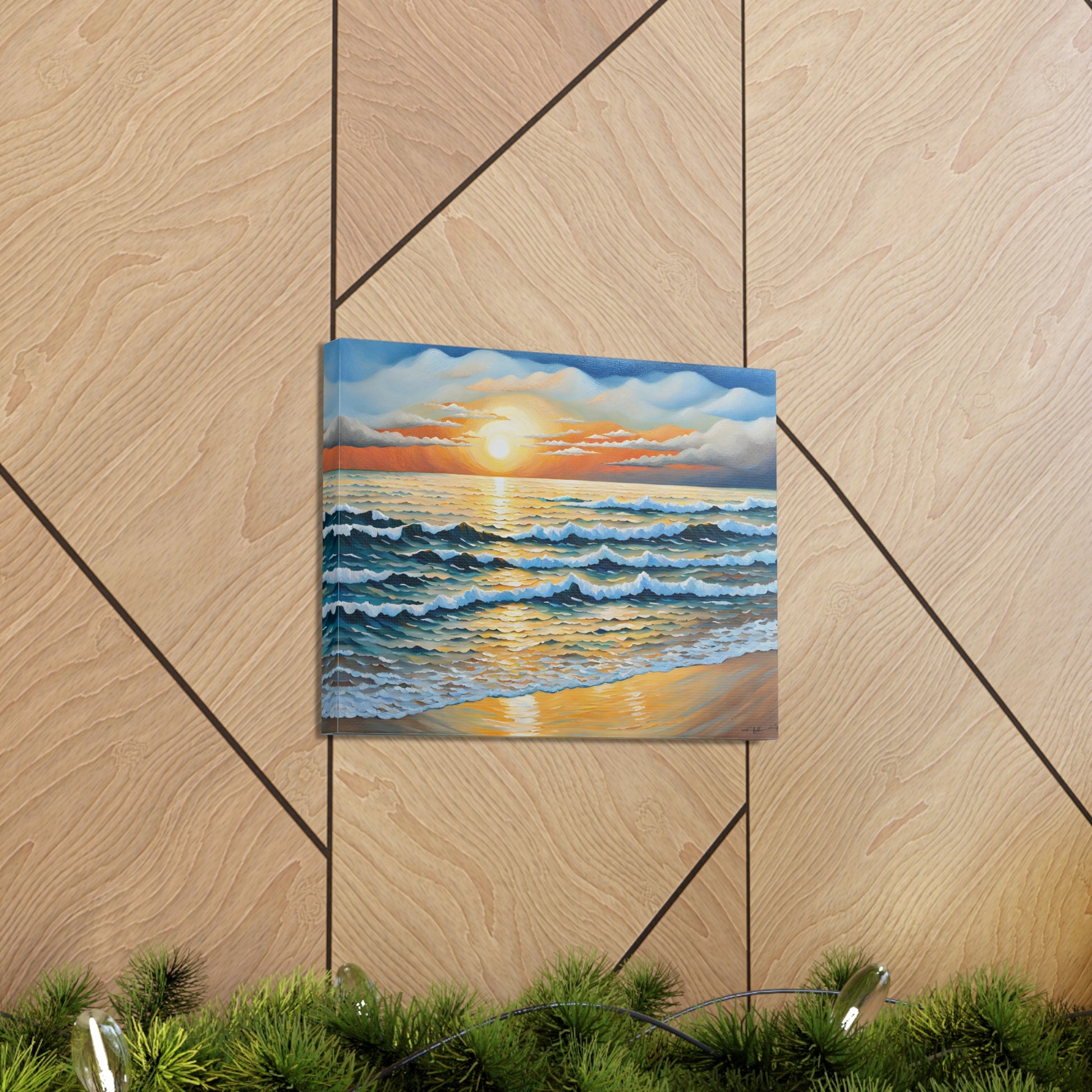 Bring balance and peace to your living space with "Coastal Harmony." This oil painting depicts the rhythmic flow of waves under the golden hues of a setting sun, offering a sense of tranquility and harmony.