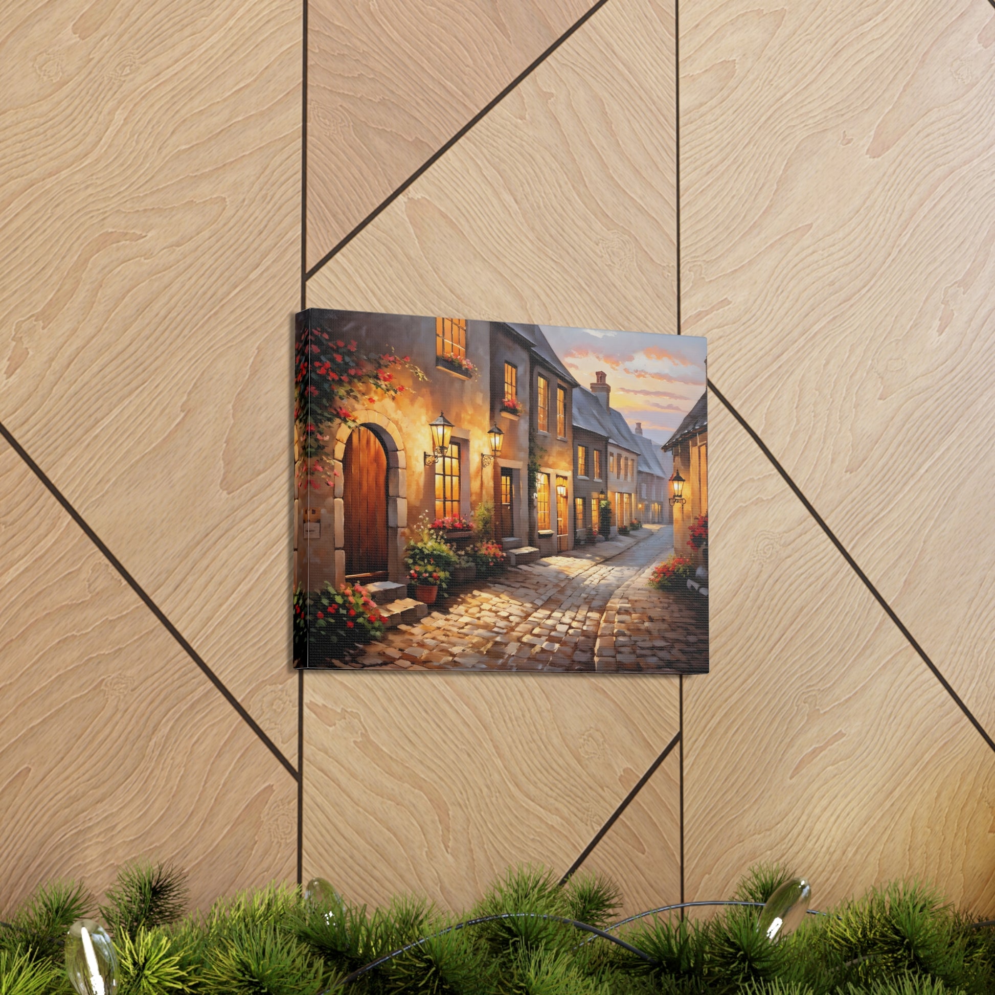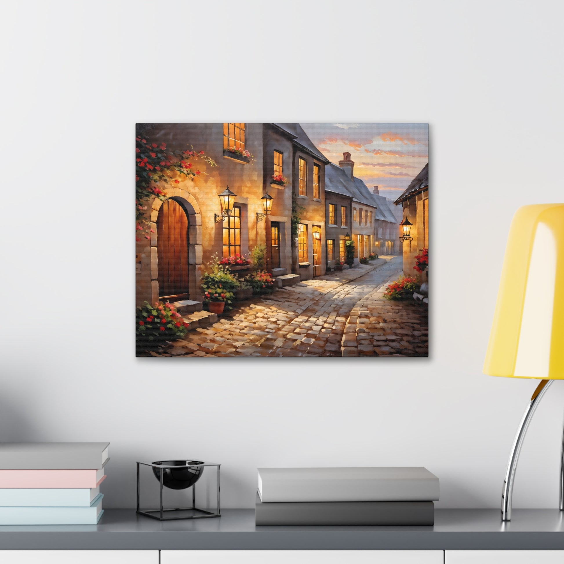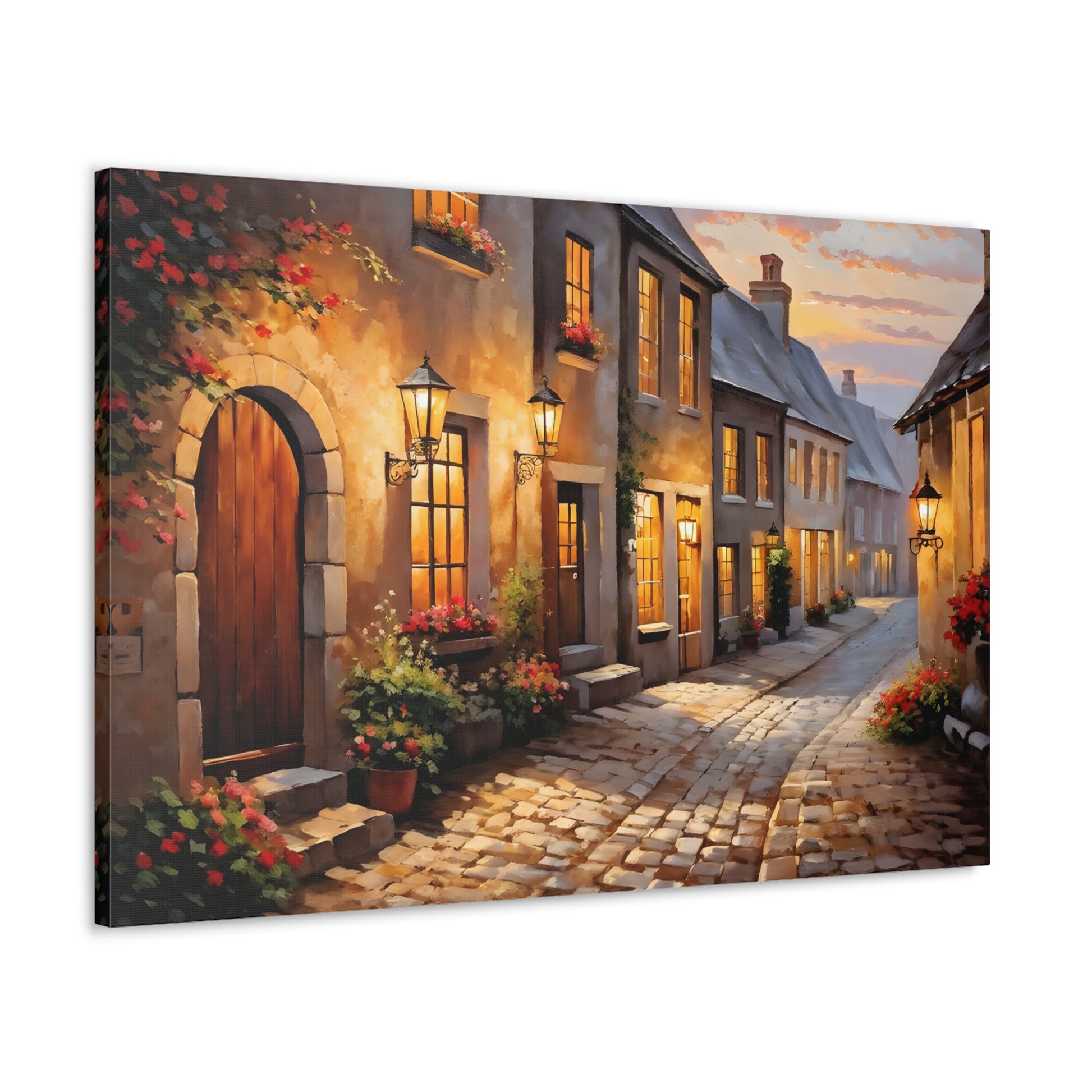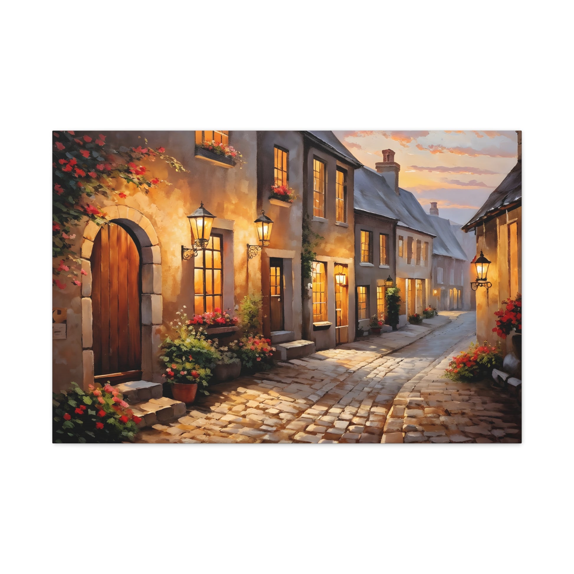 Capture the charm of a rustic street illuminated by soft lights in "Cobblestone Path: Rustic Street Scene." The intricate detail of cobblestones and blooming flowers makes this painting a standout piece. Crafted on premium cotton canvas, this artwork invites warmth and character to any indoor space.