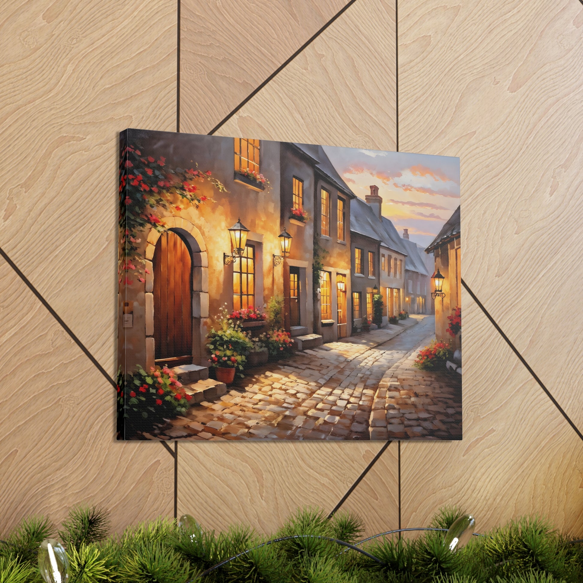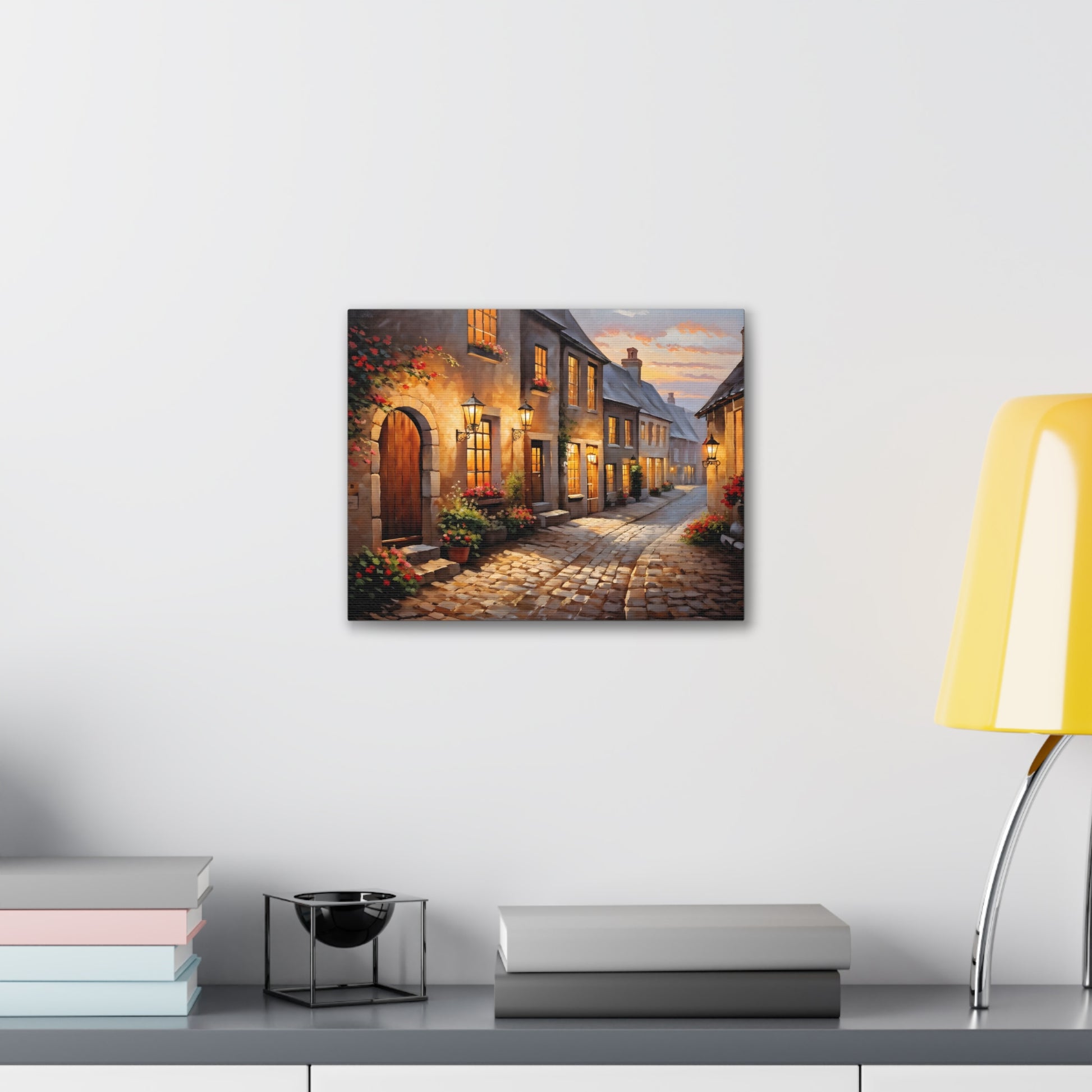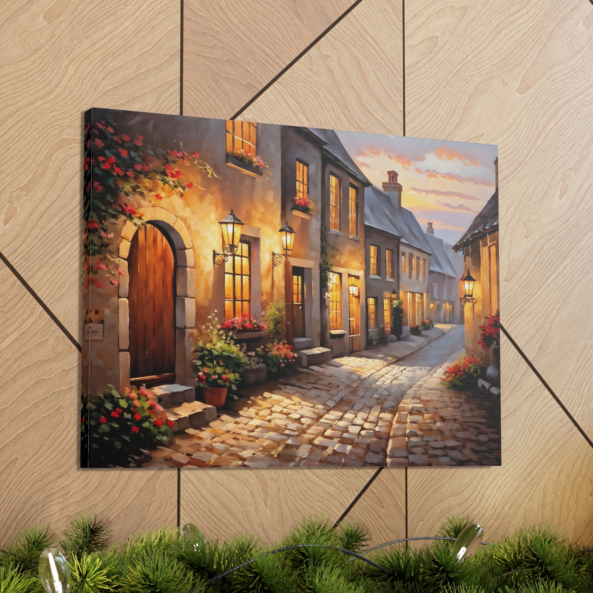 Capture the charm of a rustic street illuminated by soft lights in "Cobblestone Path: Rustic Street Scene." The intricate detail of cobblestones and blooming flowers makes this painting a standout piece. Crafted on premium cotton canvas, this artwork invites warmth and character to any indoor space.