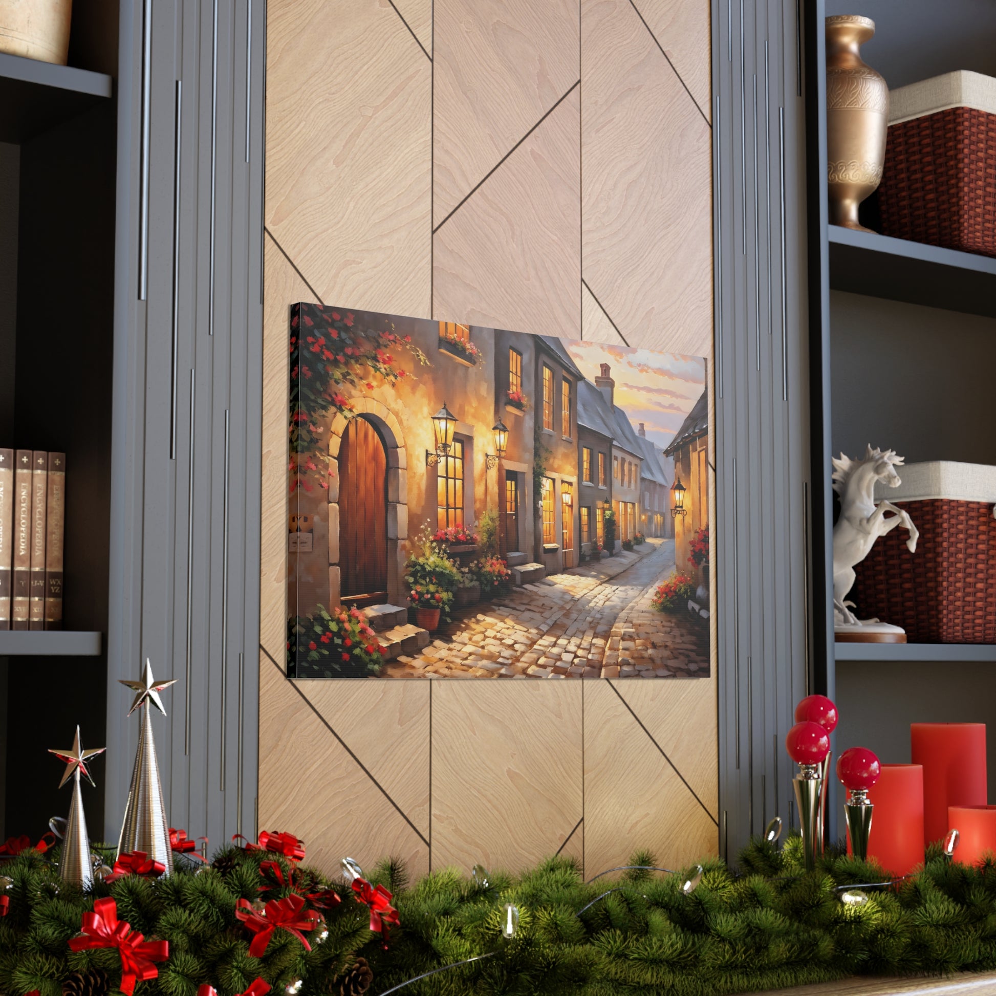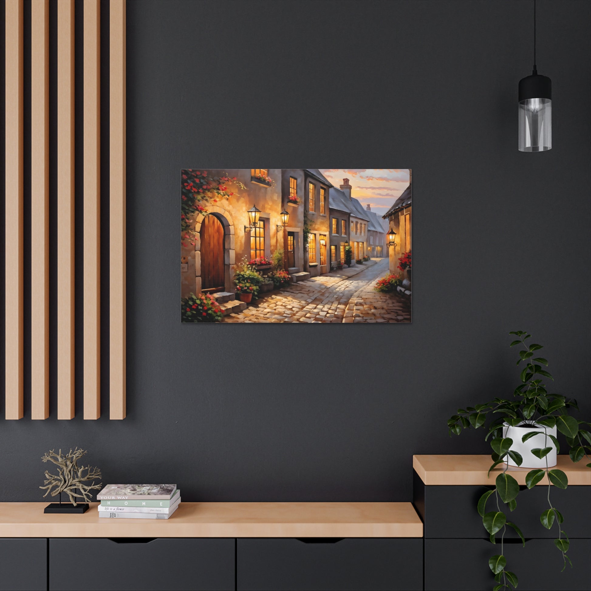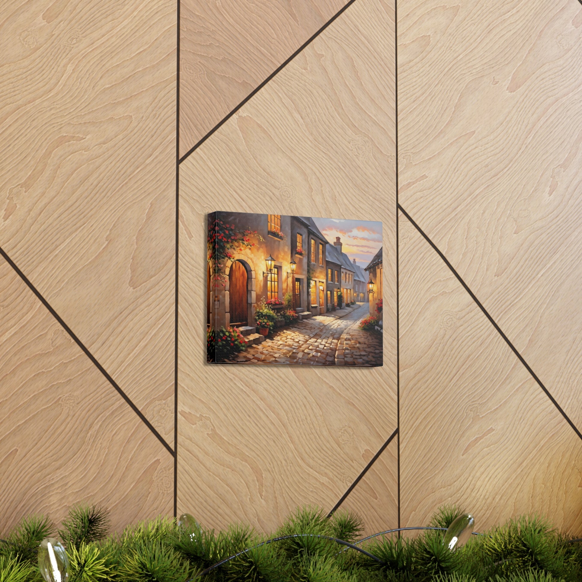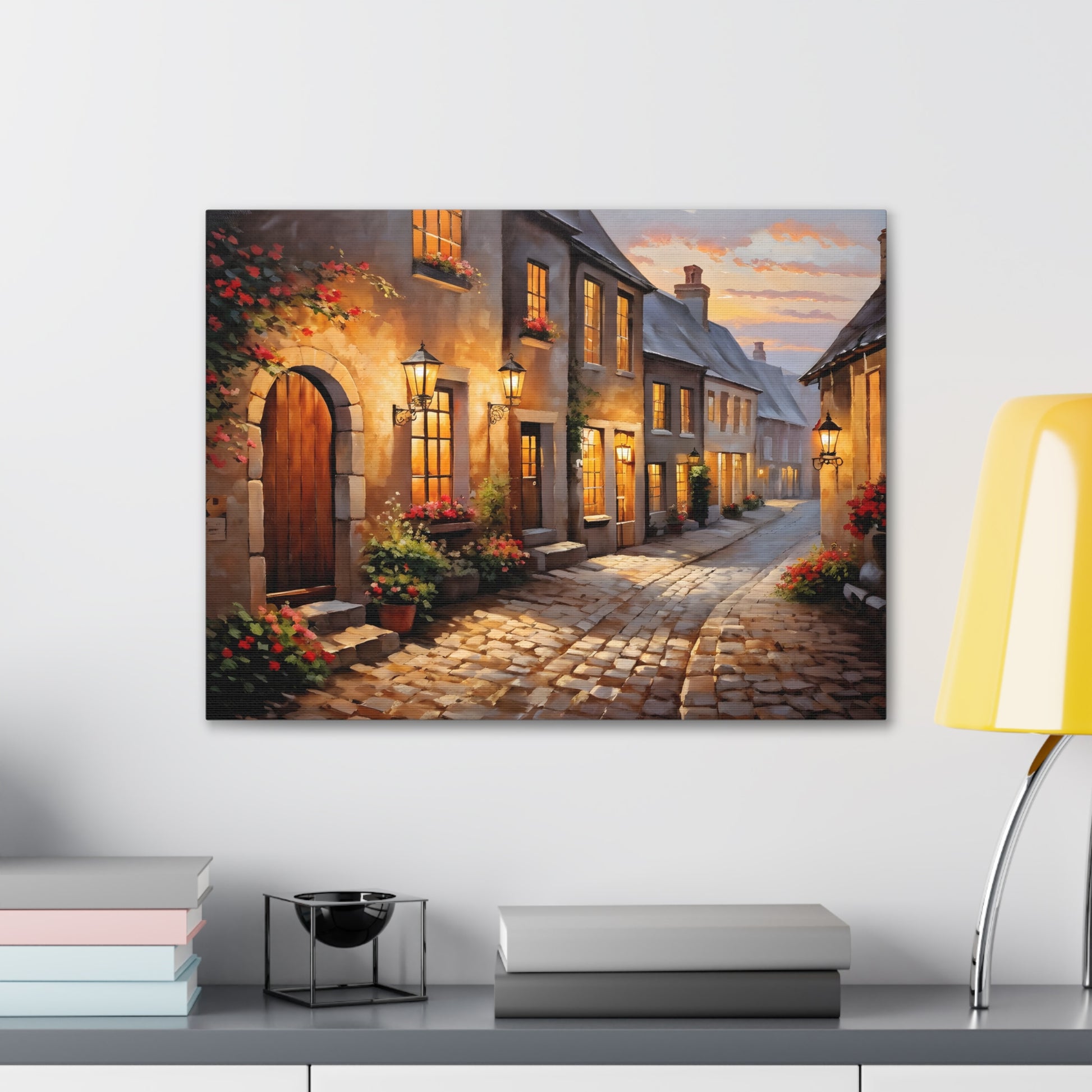 Capture the charm of a rustic street illuminated by soft lights in "Cobblestone Path: Rustic Street Scene." The intricate detail of cobblestones and blooming flowers makes this painting a standout piece. Crafted on premium cotton canvas, this artwork invites warmth and character to any indoor space.