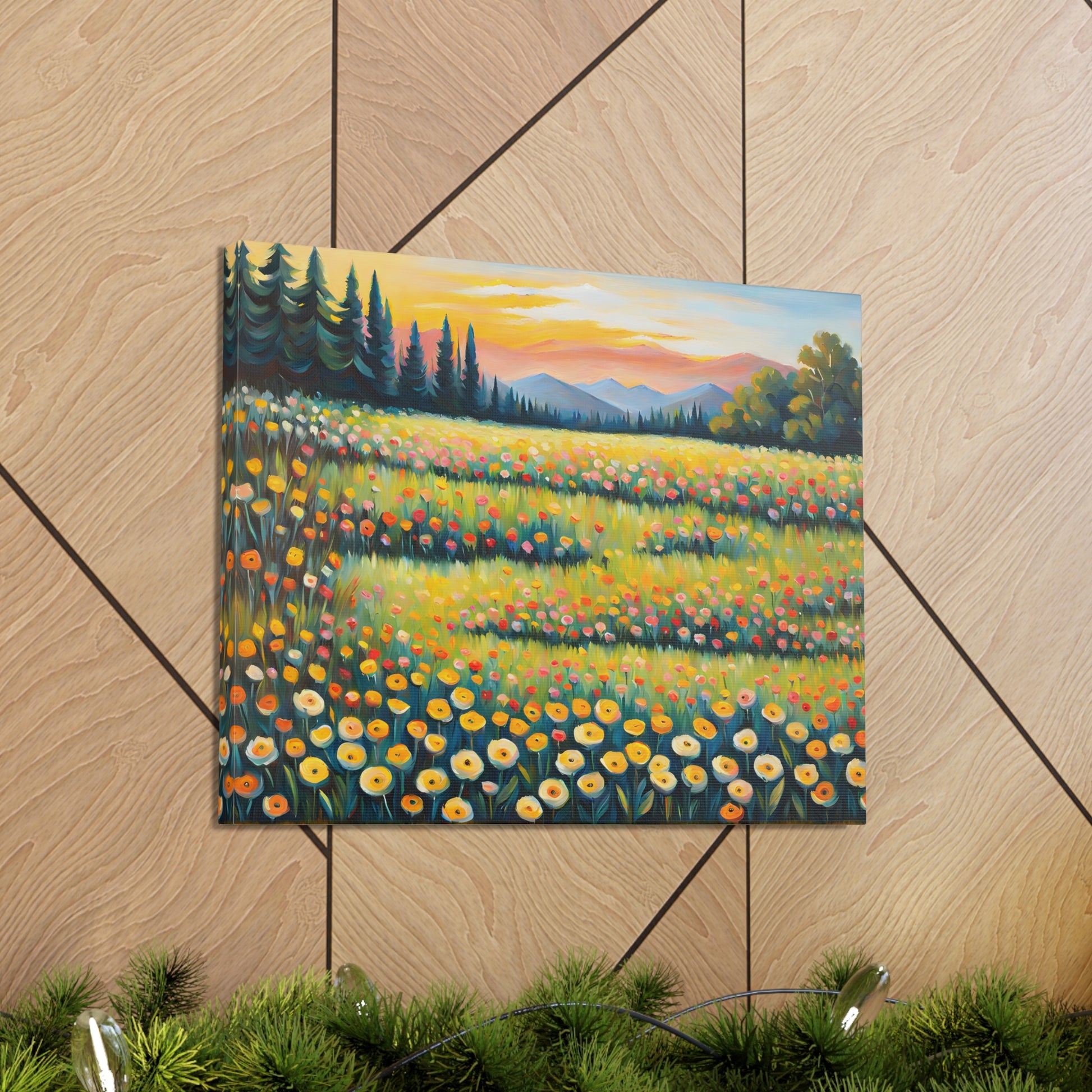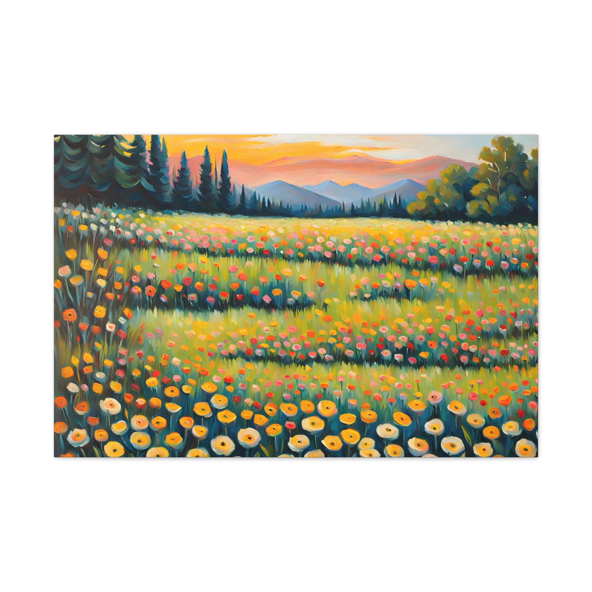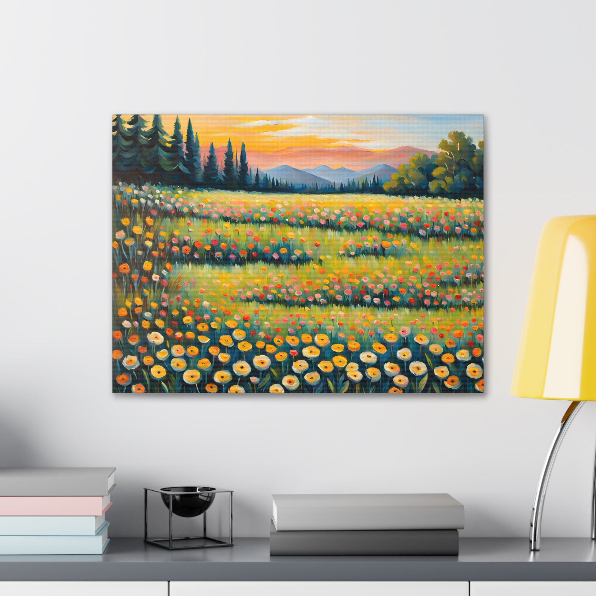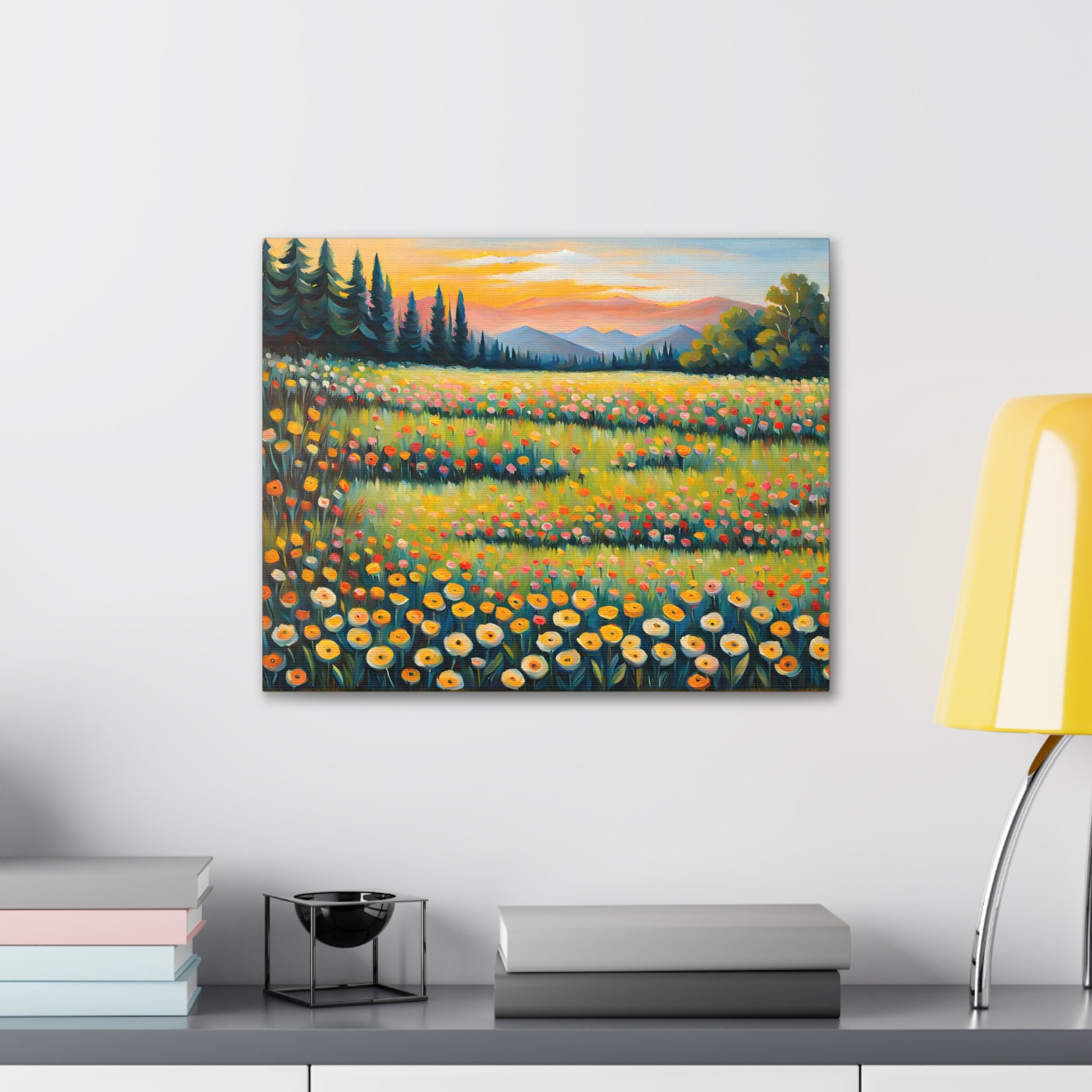 "Verdant Ridge" is a vibrant oil painting depicting a lush, blooming meadow with colorful wildflowers under a golden sky. Crafted on high-quality cotton canvas, this artwork adds a burst of color and life to your indoor decor, perfect for creating a cheerful and inviting space.