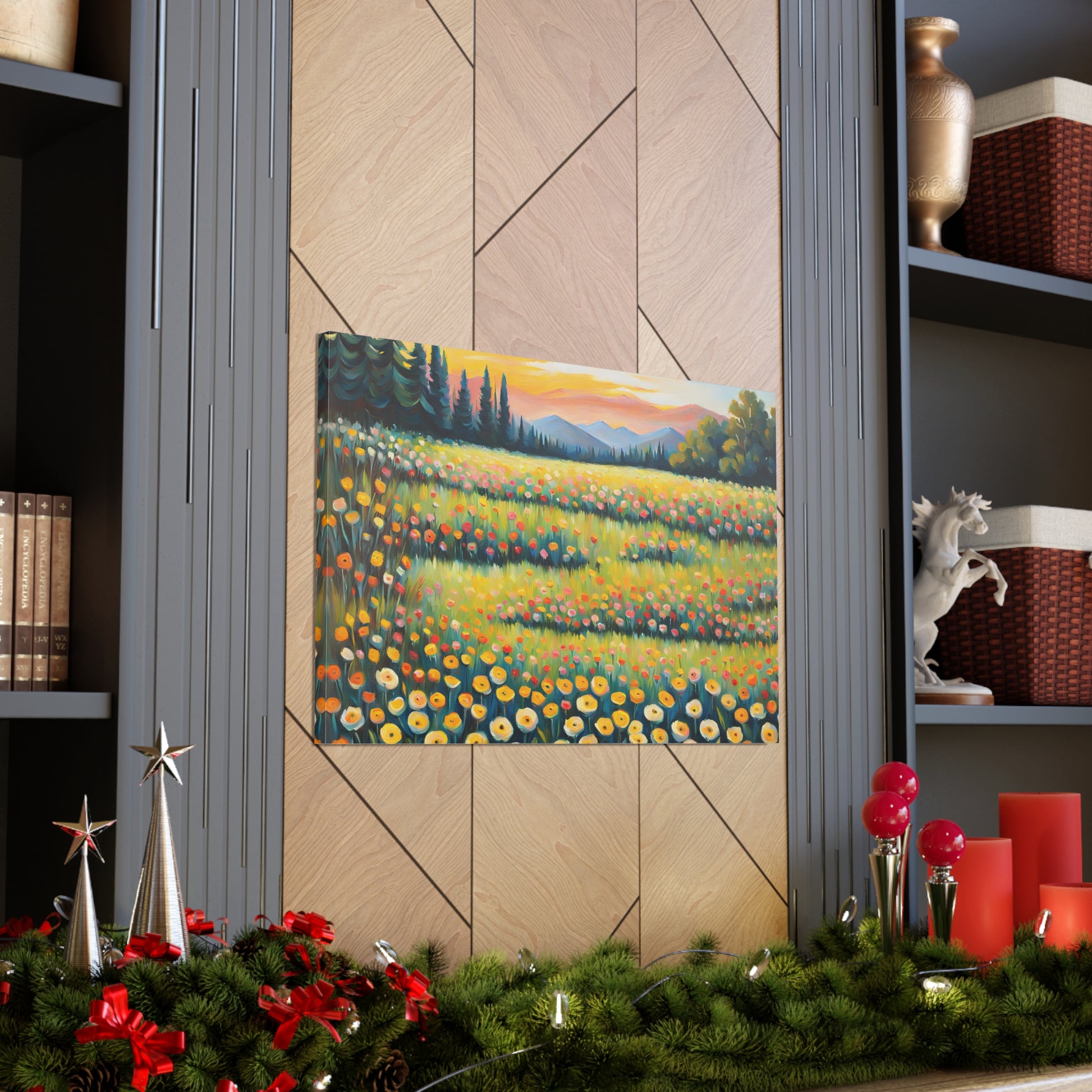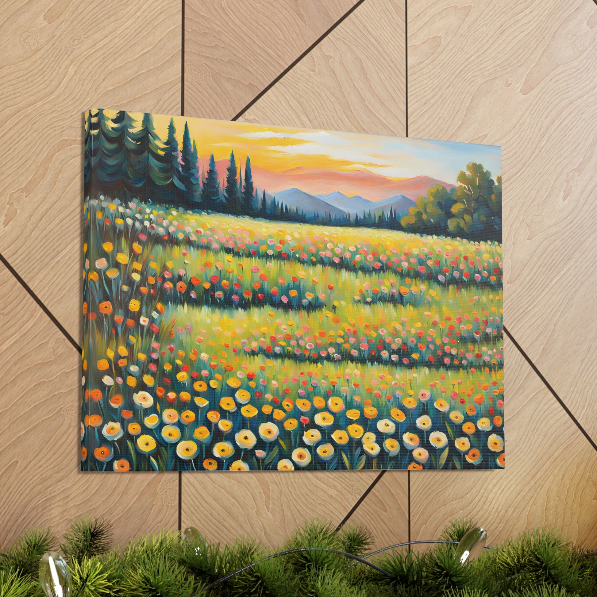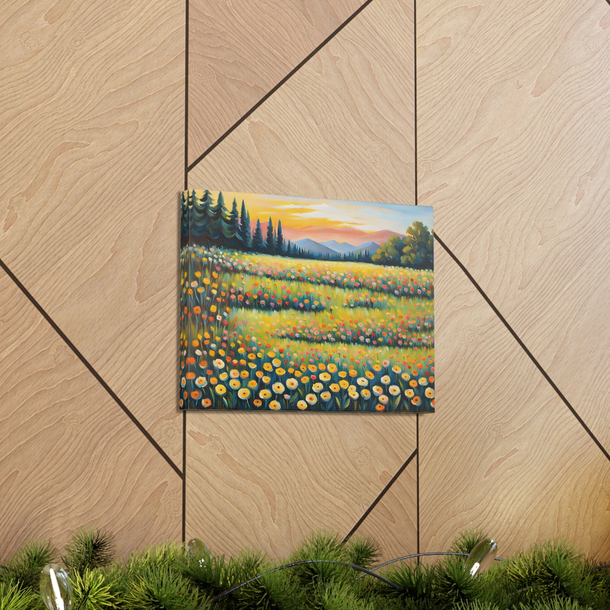 "Verdant Ridge" is a vibrant oil painting depicting a lush, blooming meadow with colorful wildflowers under a golden sky. Crafted on high-quality cotton canvas, this artwork adds a burst of color and life to your indoor decor, perfect for creating a cheerful and inviting space.