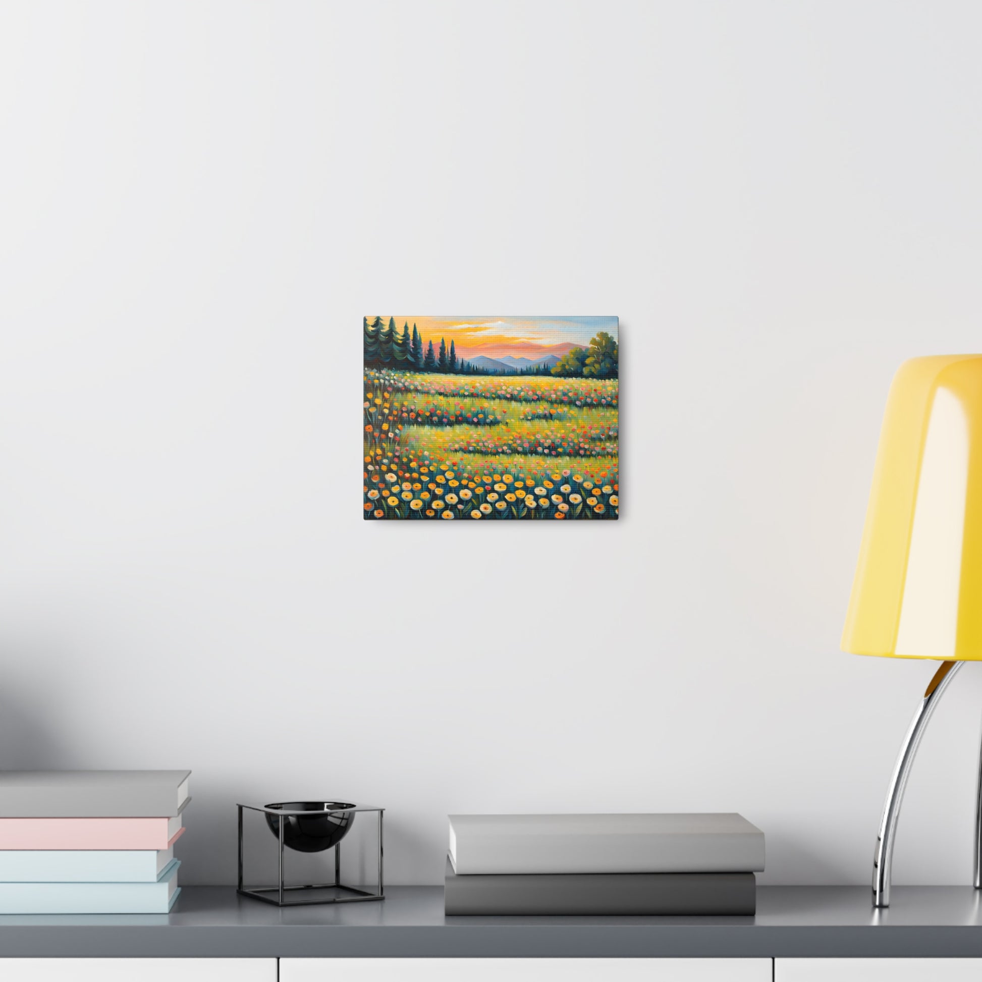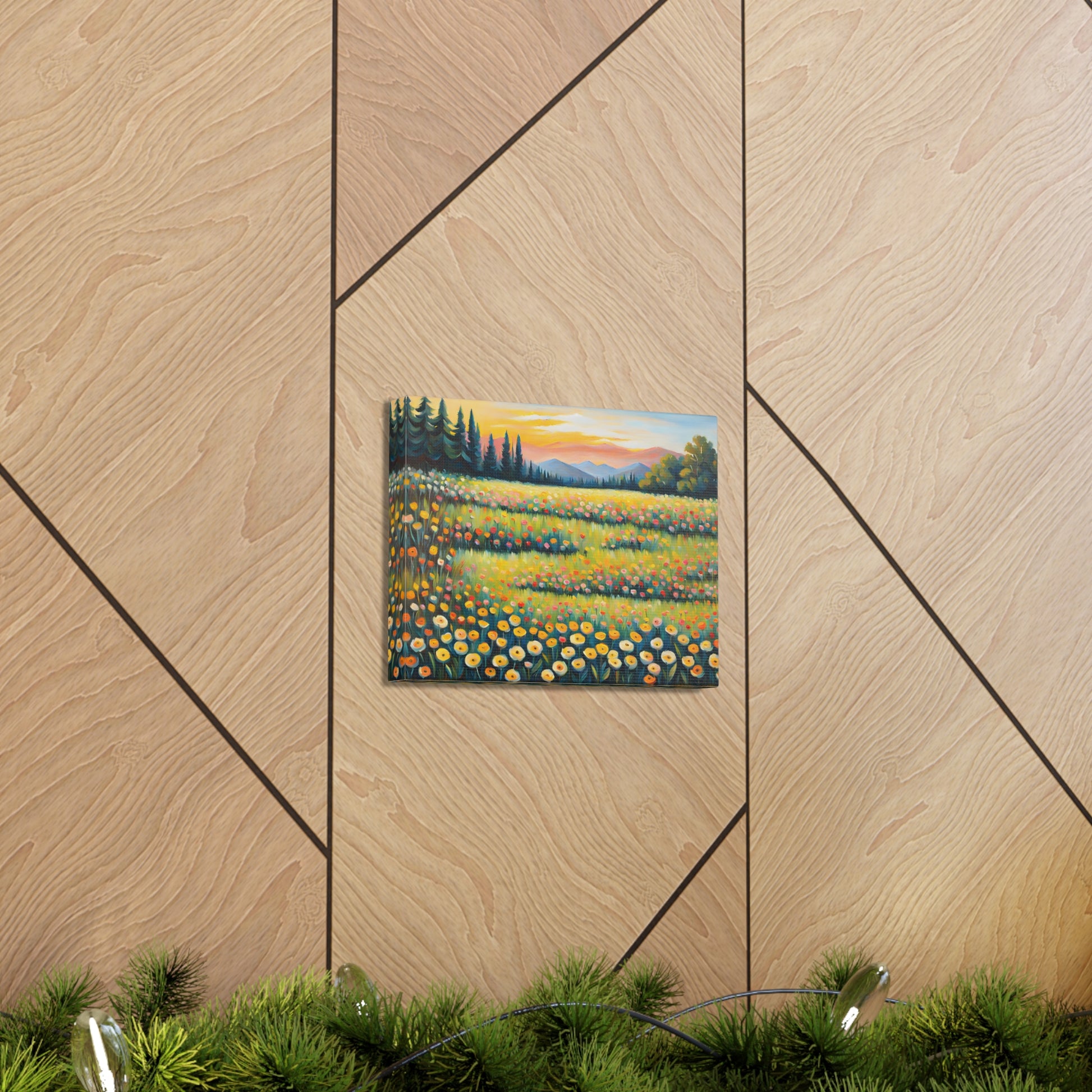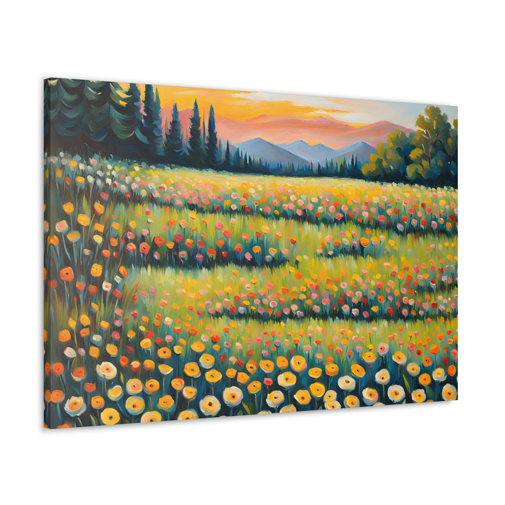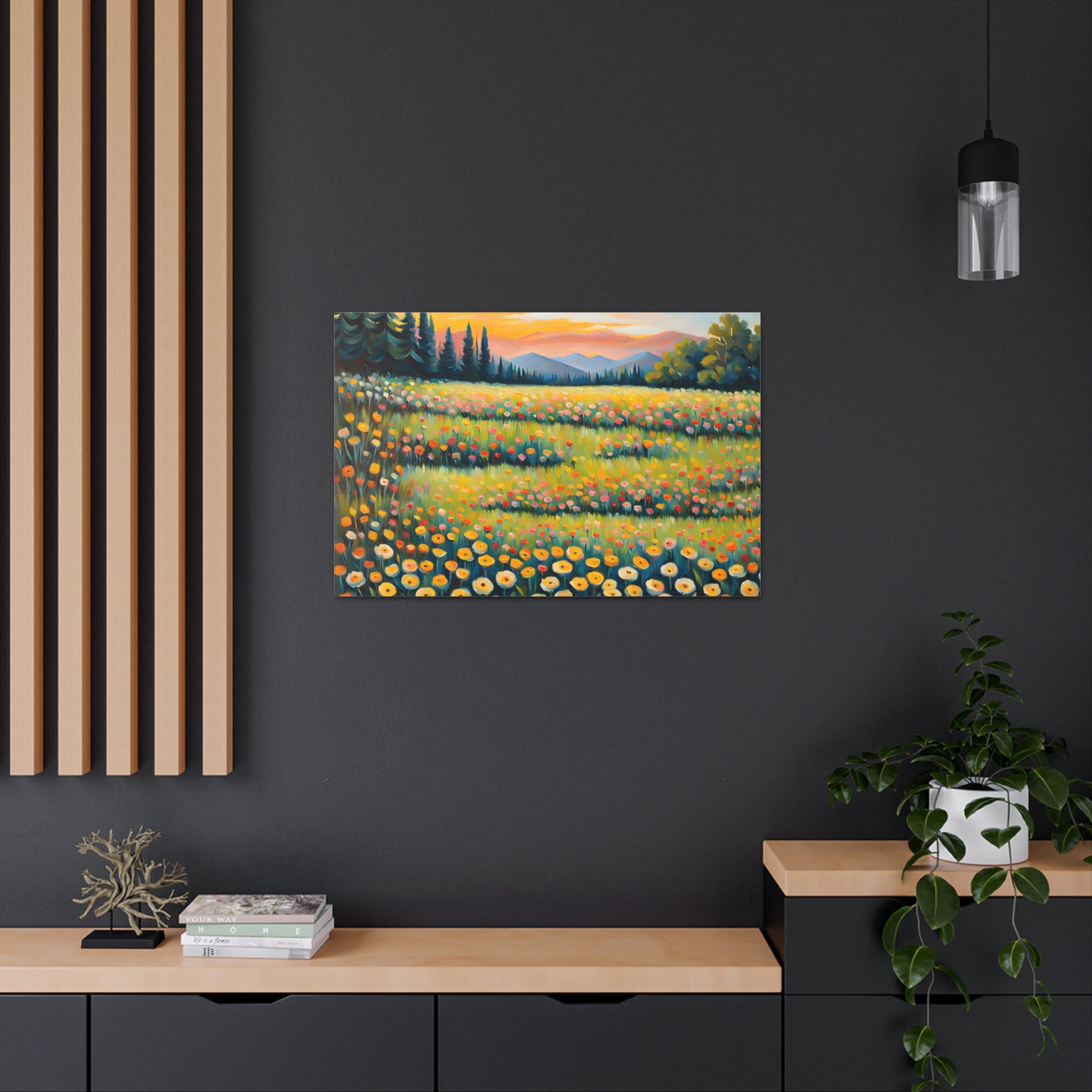 "Verdant Ridge" is a vibrant oil painting depicting a lush, blooming meadow with colorful wildflowers under a golden sky. Crafted on high-quality cotton canvas, this artwork adds a burst of color and life to your indoor decor, perfect for creating a cheerful and inviting space.