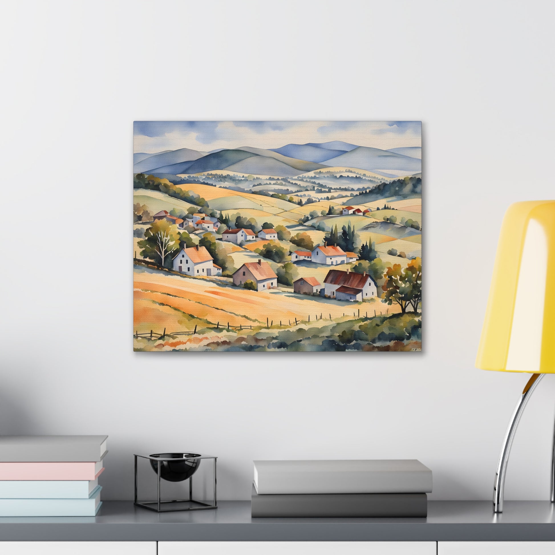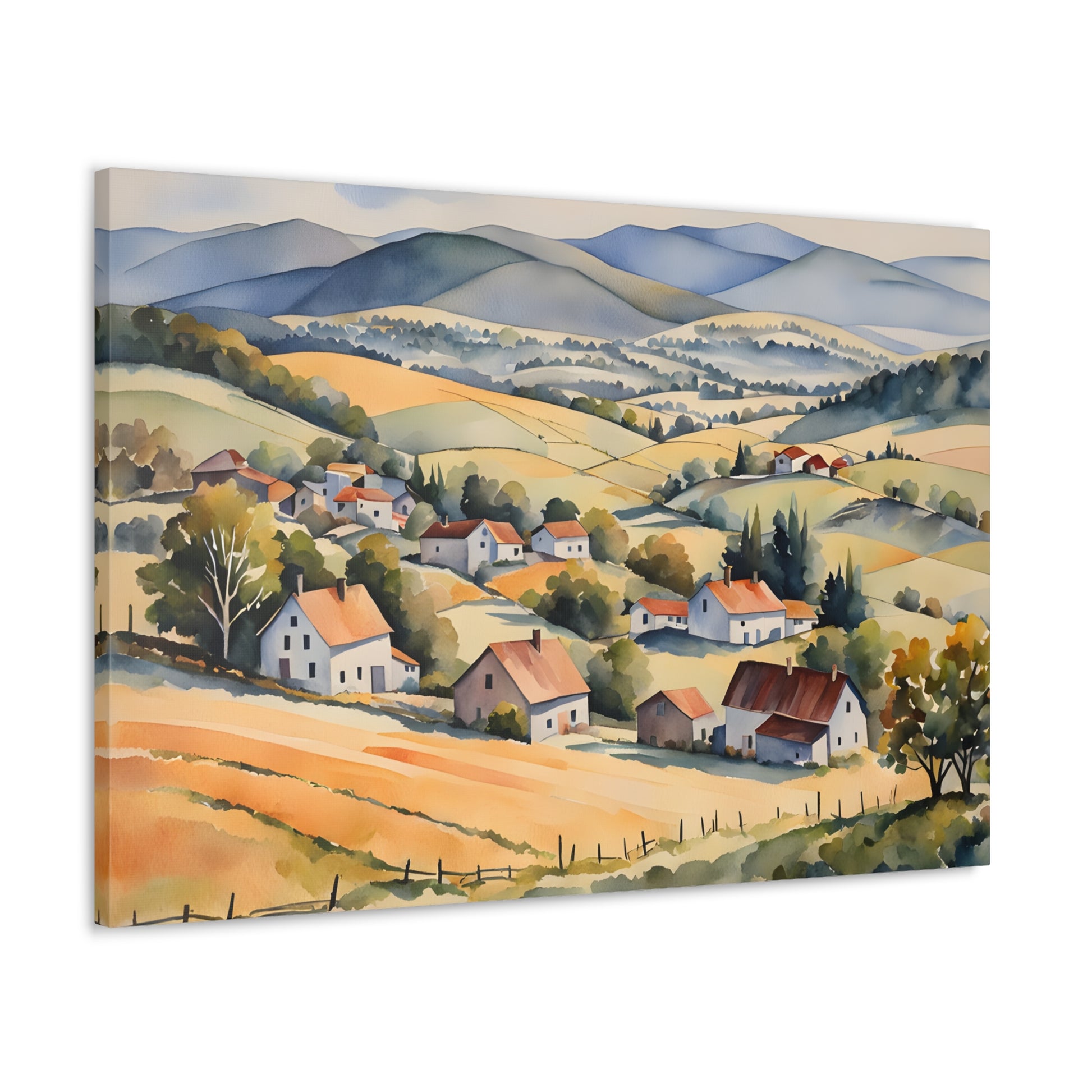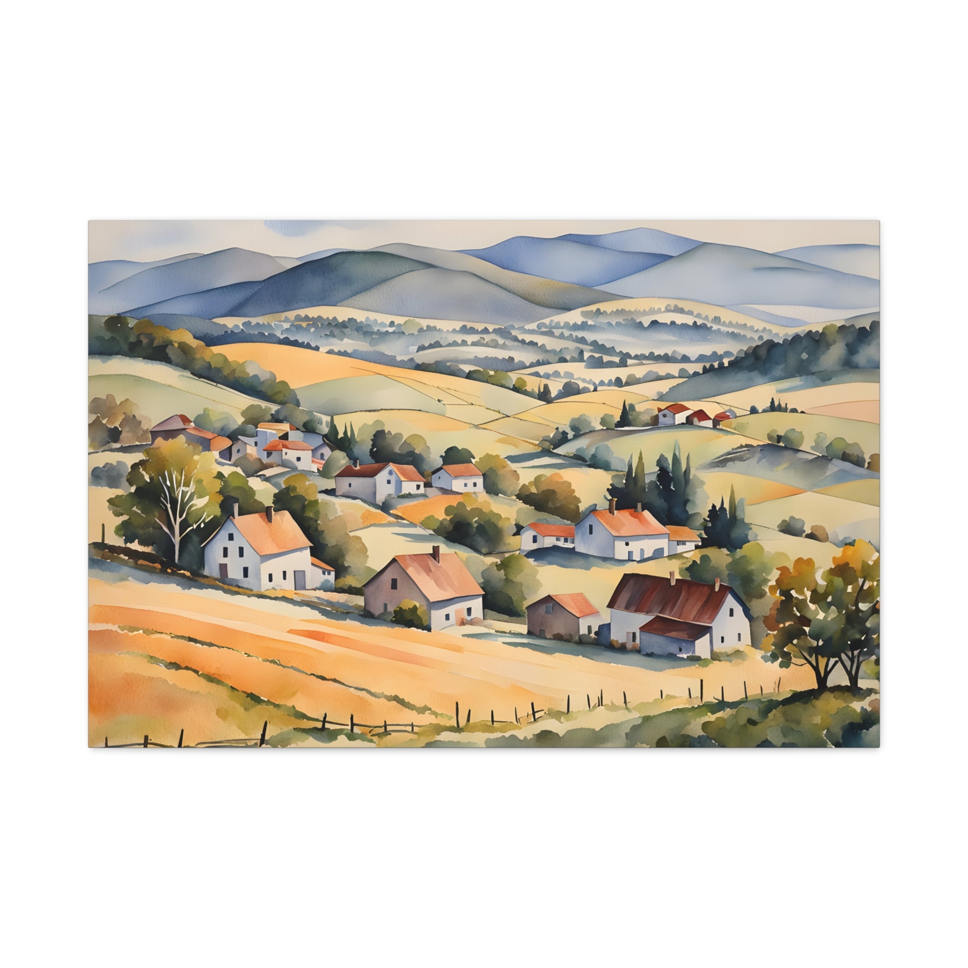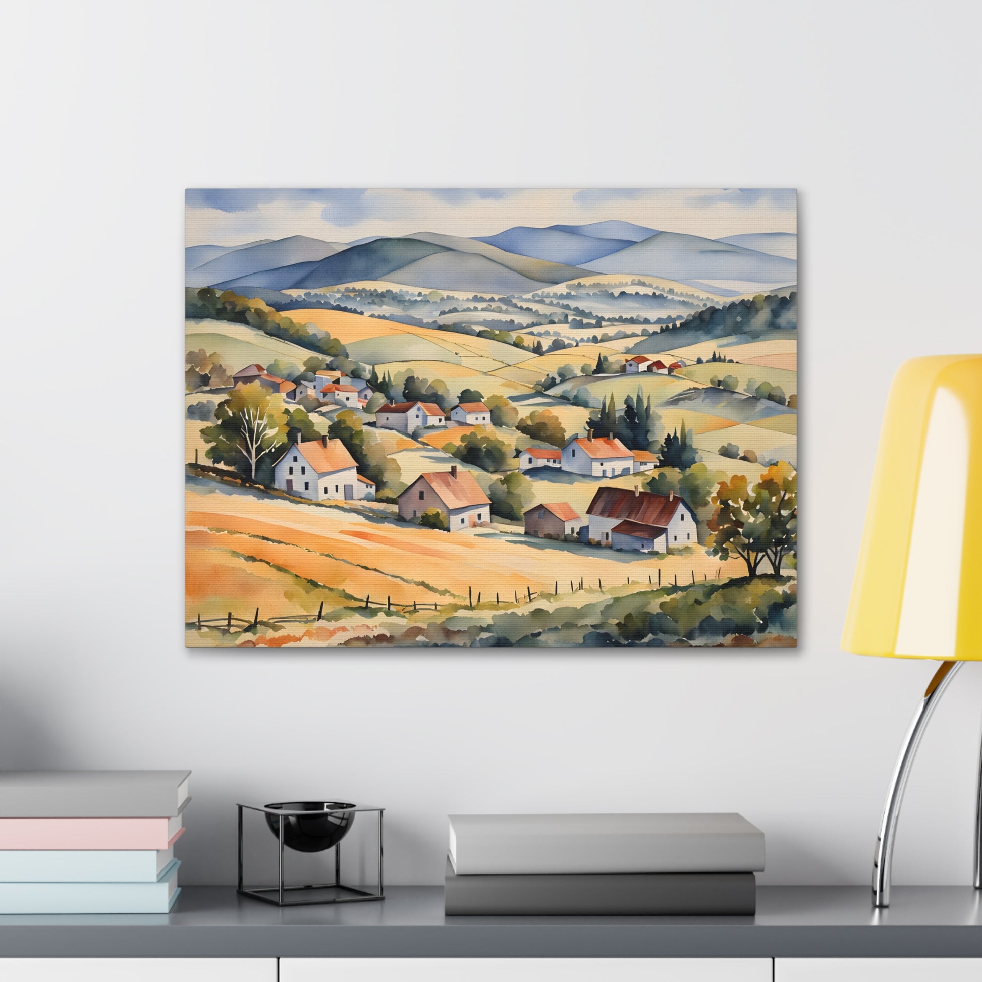 Evoke the charm of rural life with our "Country Town: Watercolor Wall Décor." Skillfully crafted on premium cotton canvas, this captivating artwork transports you to a quaint countryside town nestled among rolling hills and serene landscapes.