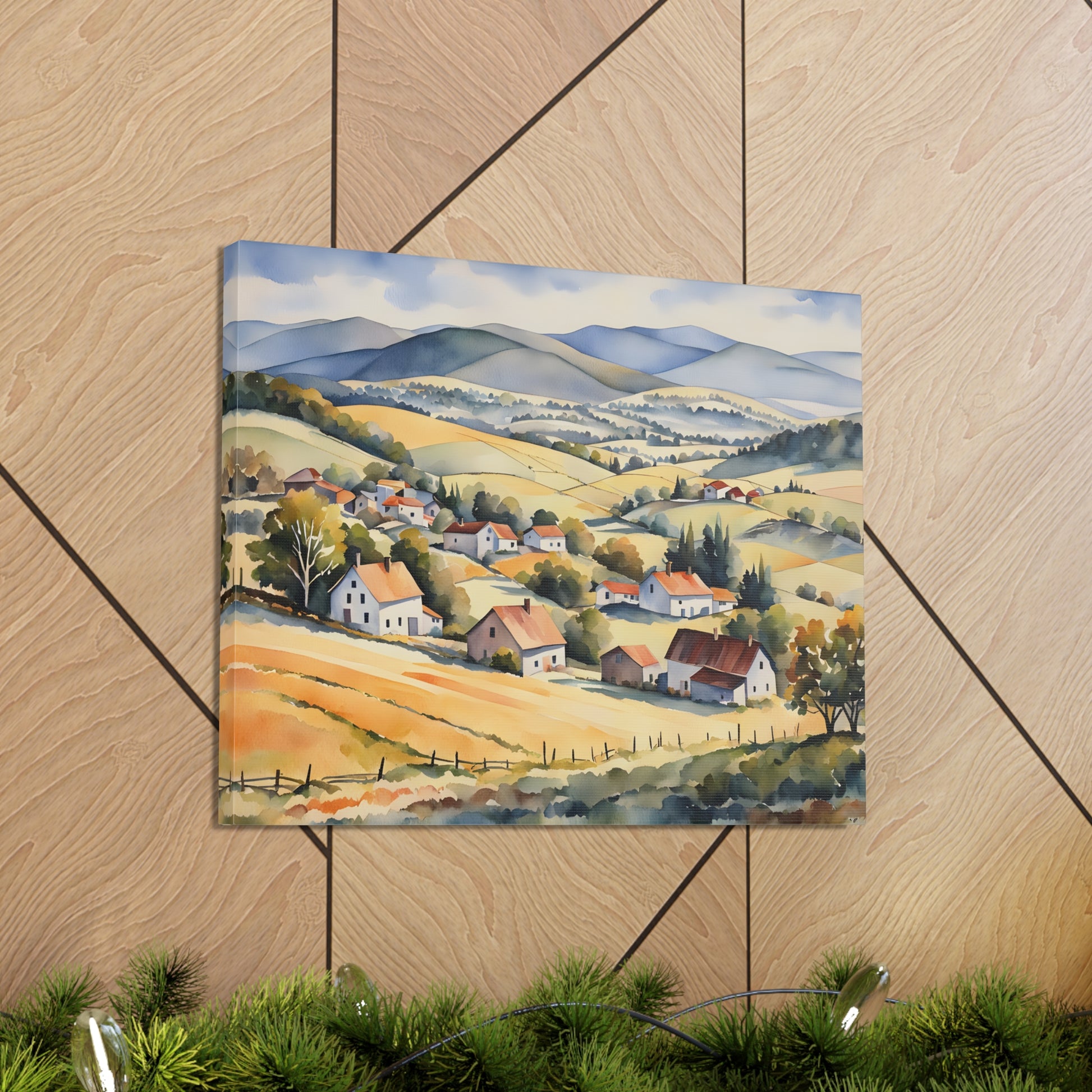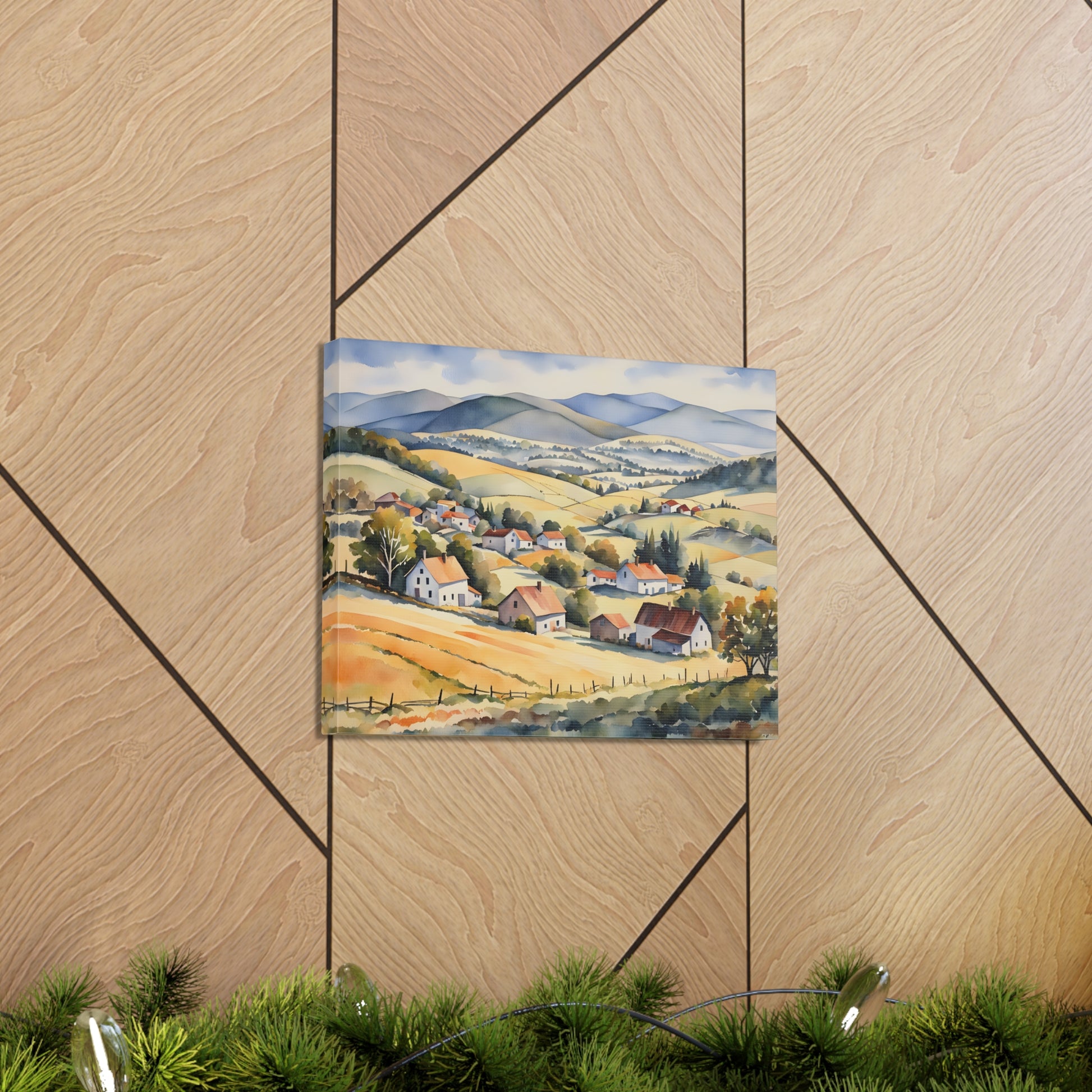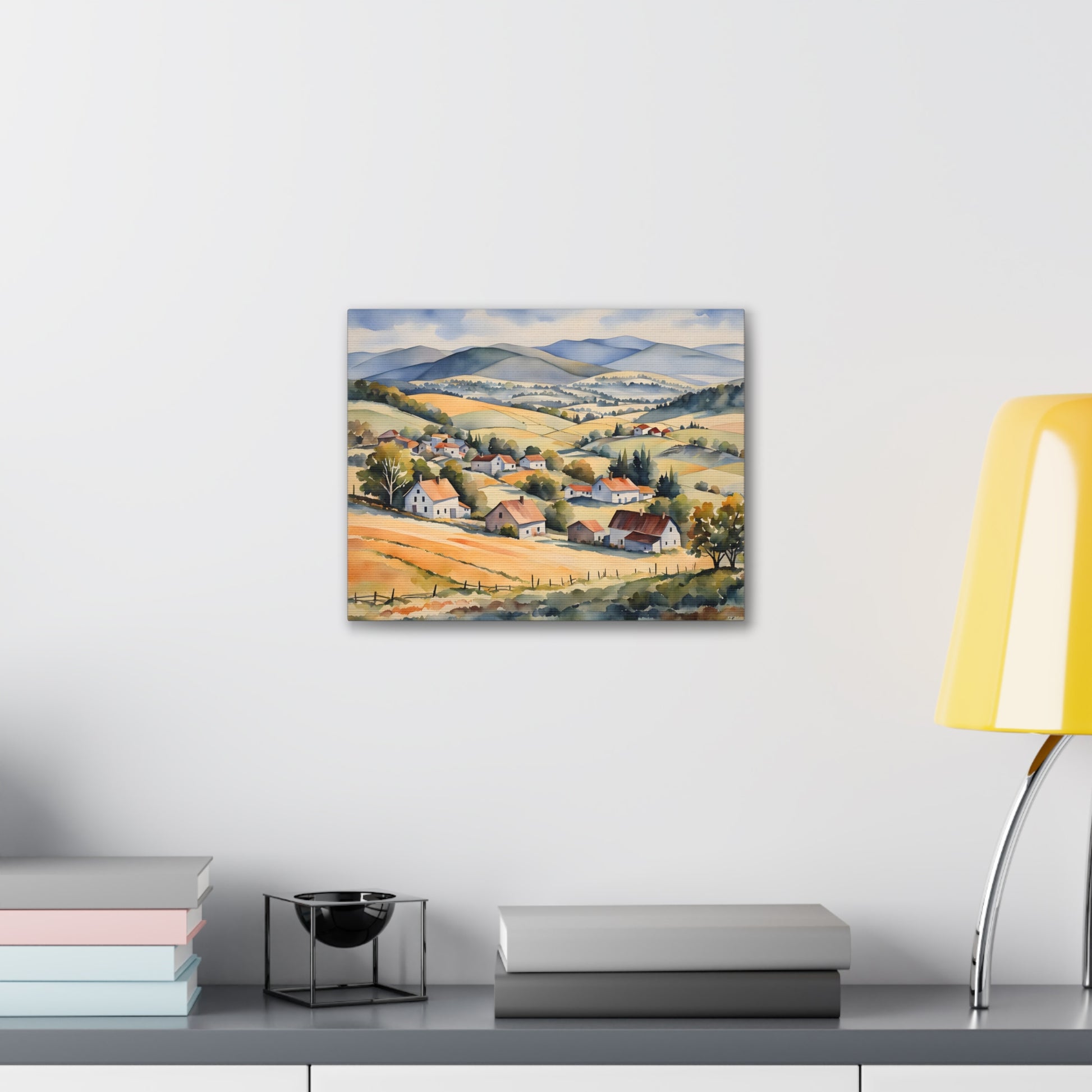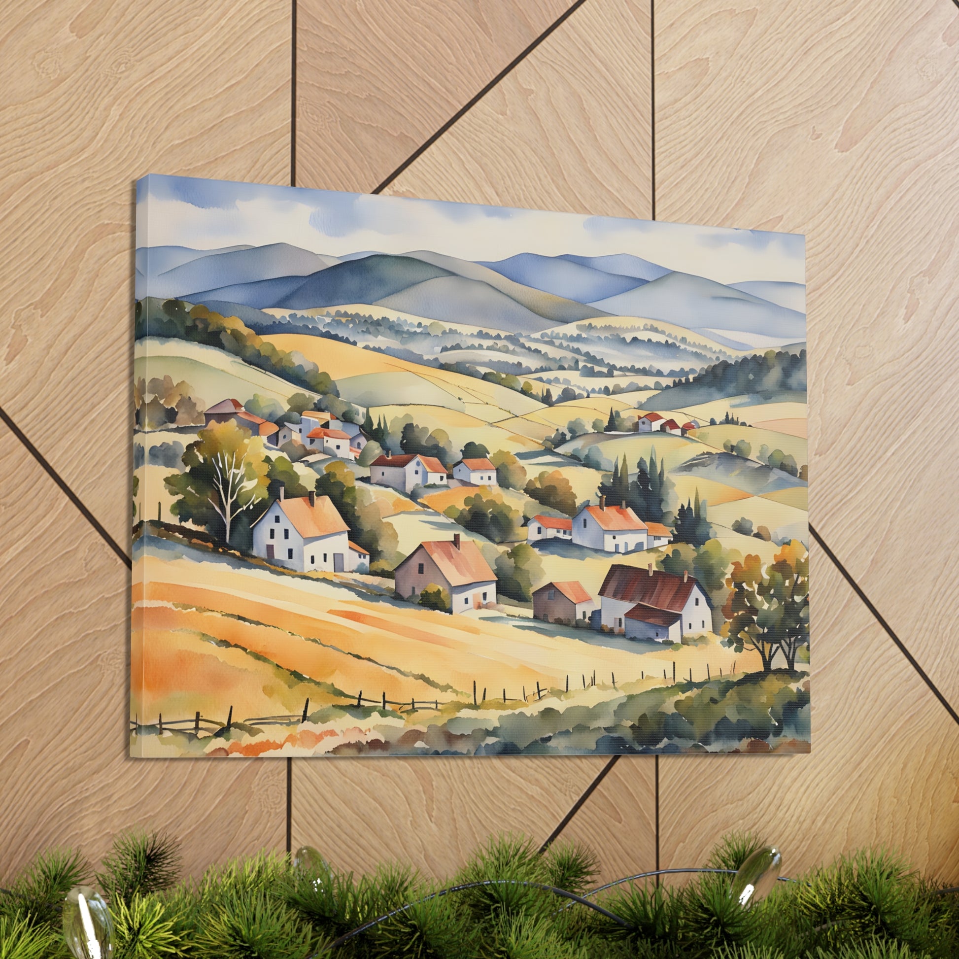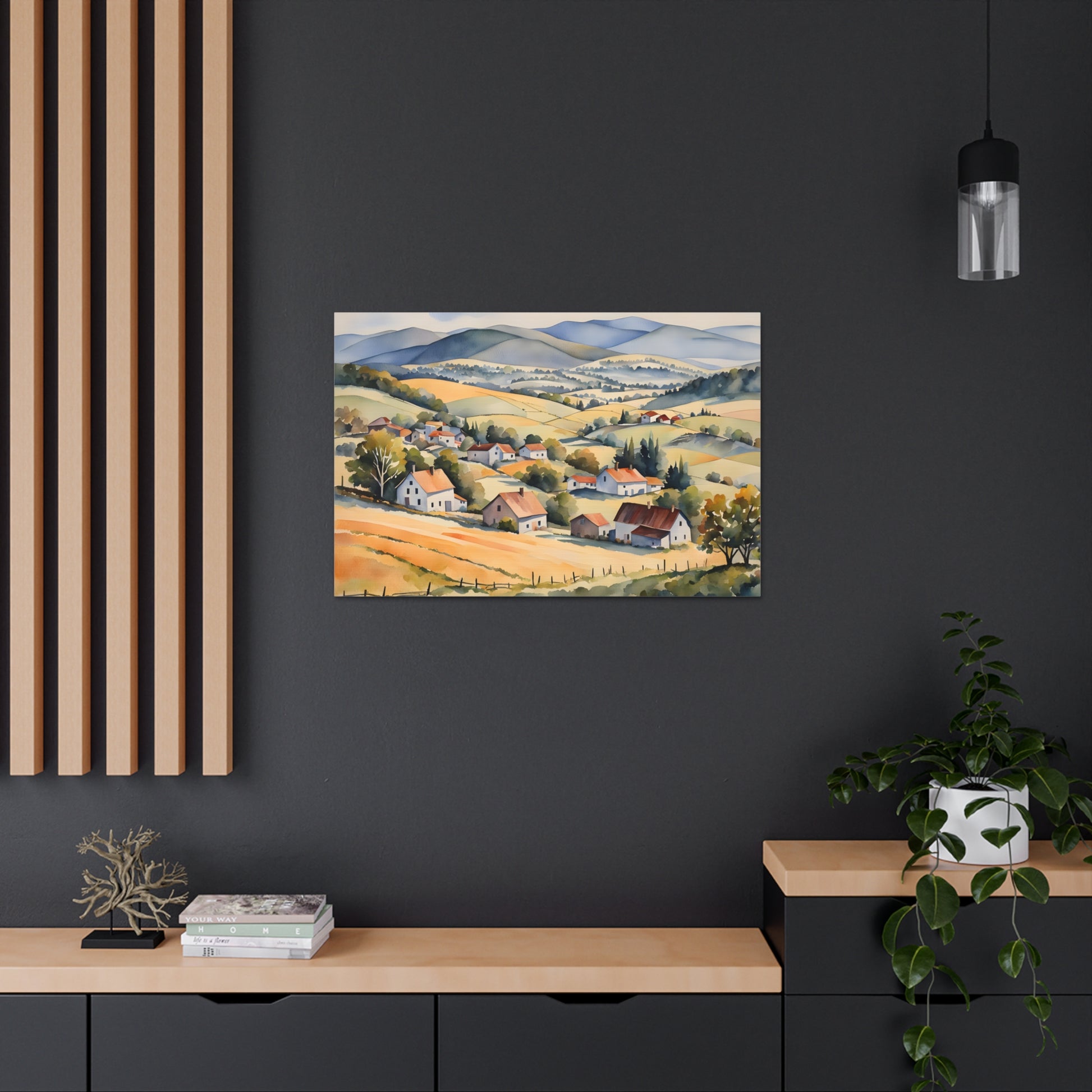 Evoke the charm of rural life with our "Country Town: Watercolor Wall Décor." Skillfully crafted on premium cotton canvas, this captivating artwork transports you to a quaint countryside town nestled among rolling hills and serene landscapes.