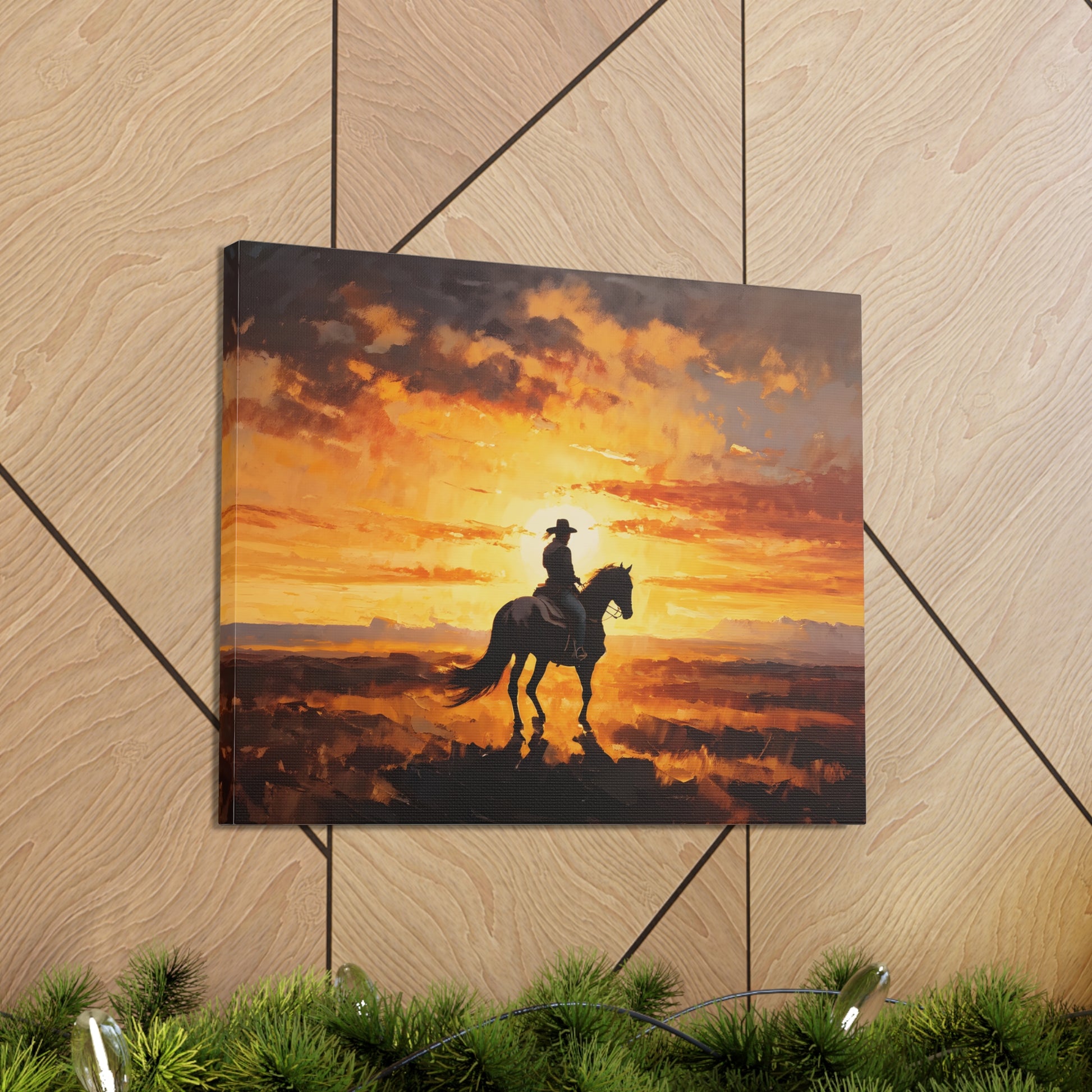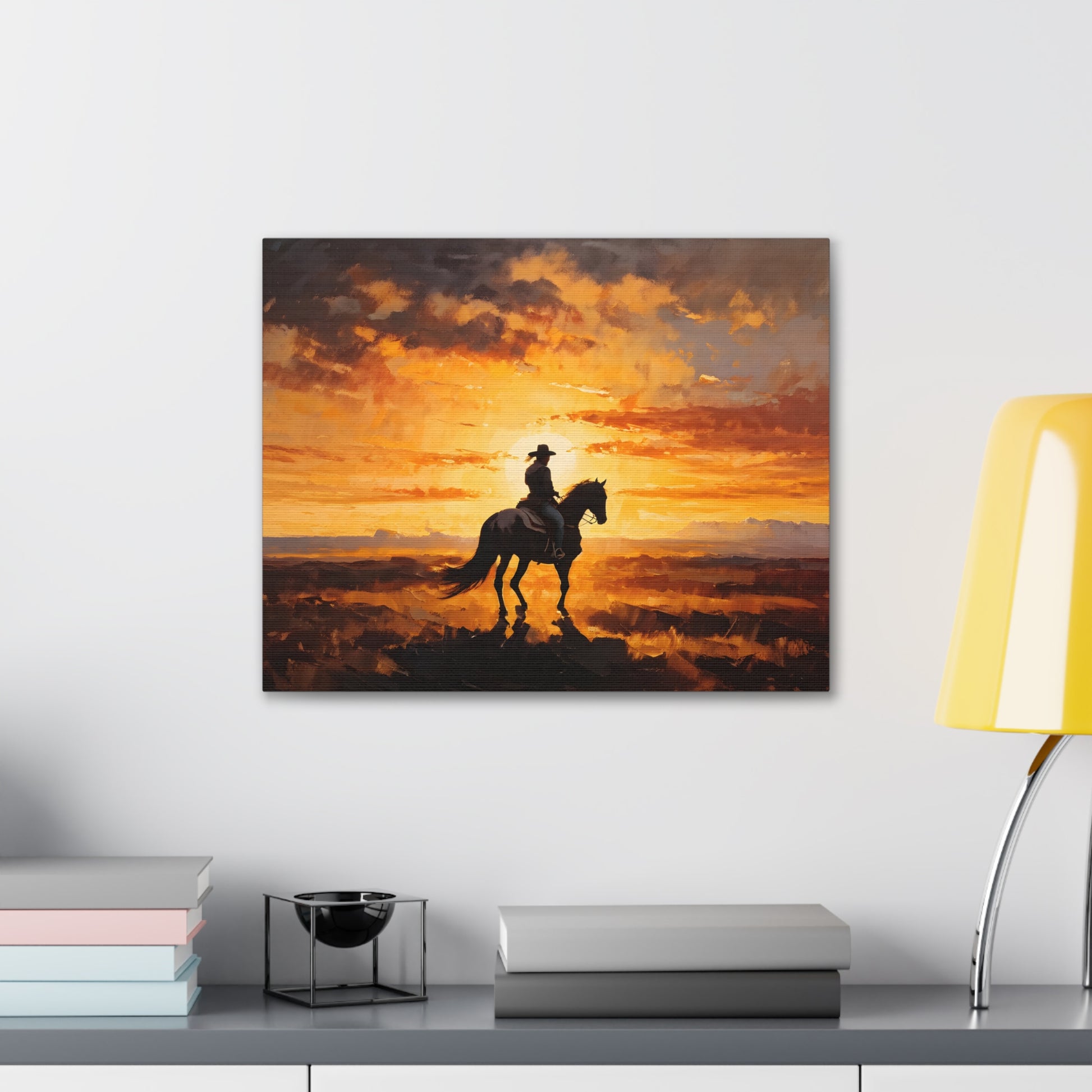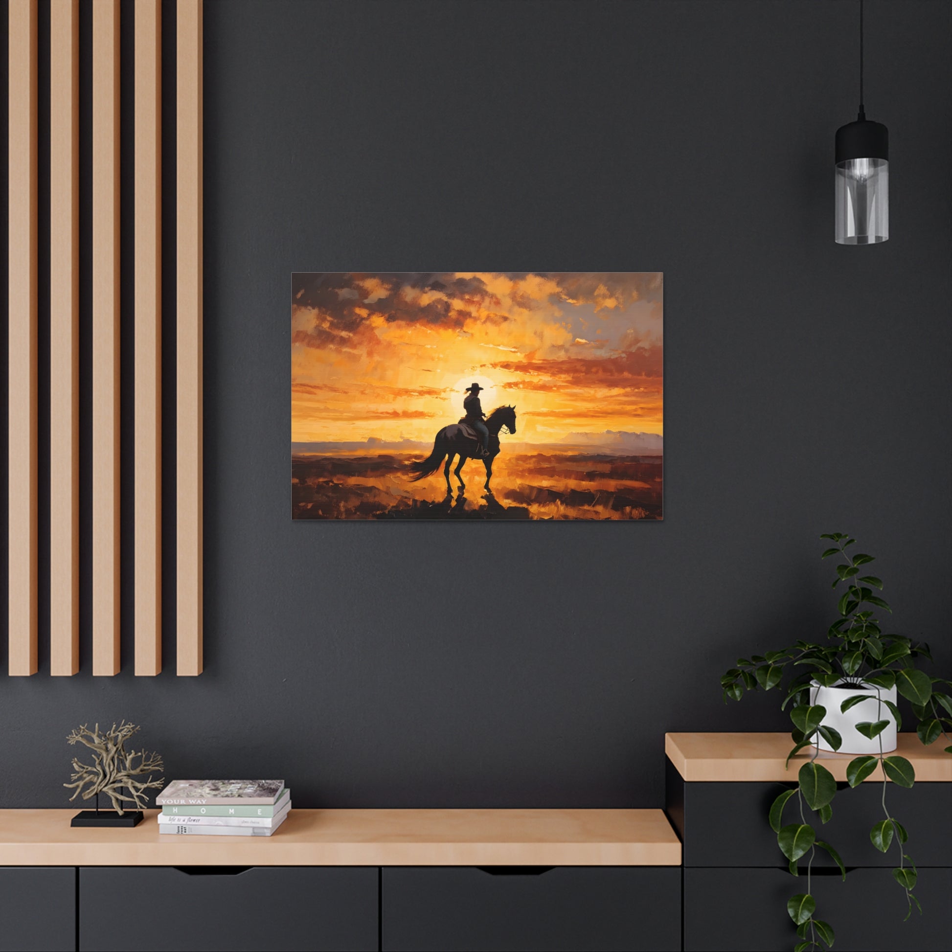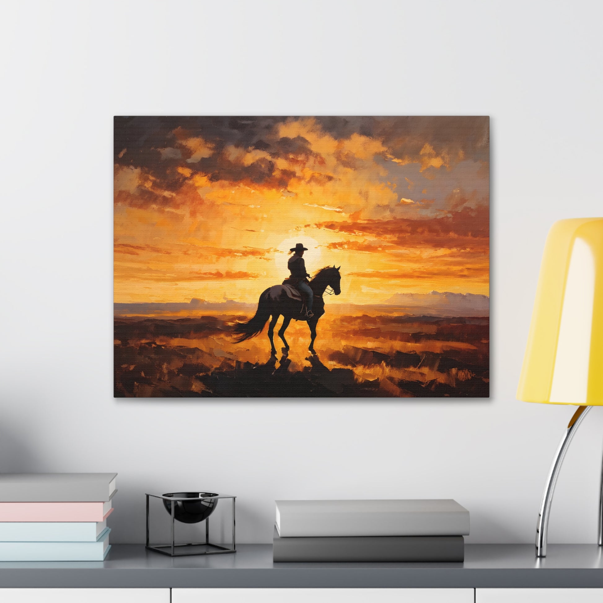 Capture the spirit of the wild west with "Cowboy's Silhouette." This dramatic oil painting on cotton canvas features a lone cowboy riding into the sunset, with warm tones that evoke adventure and nostalgia. NB! For indoor use only.