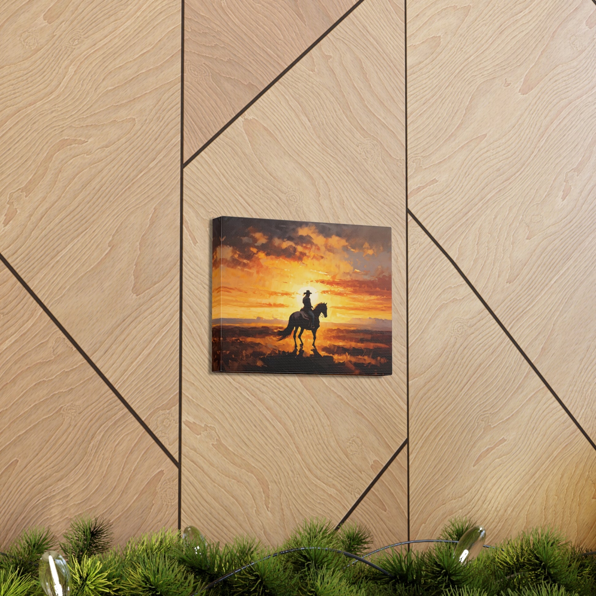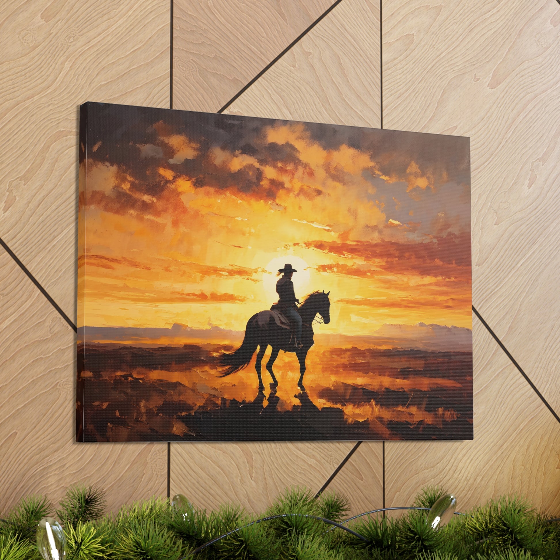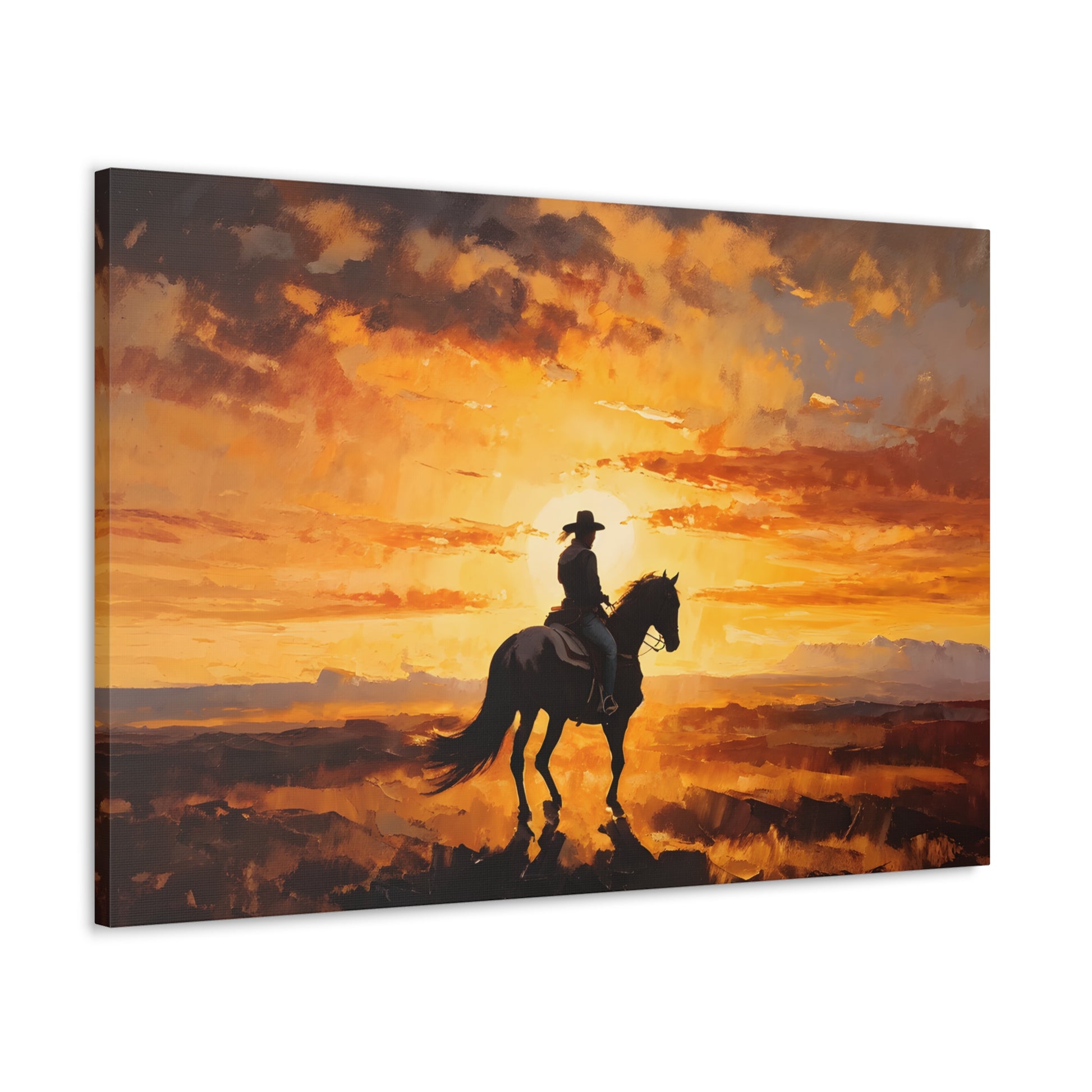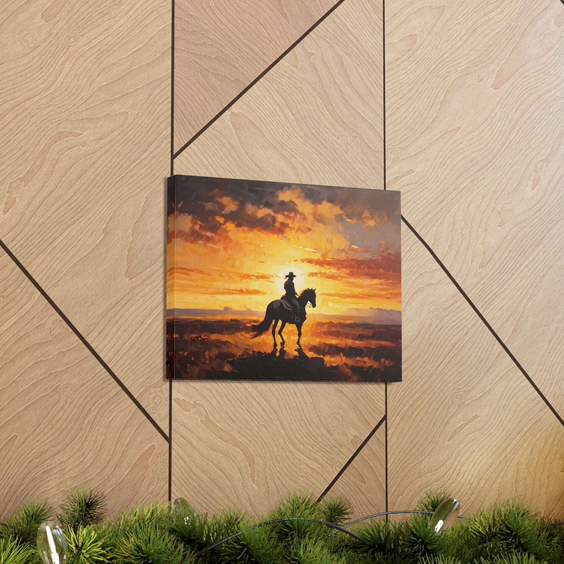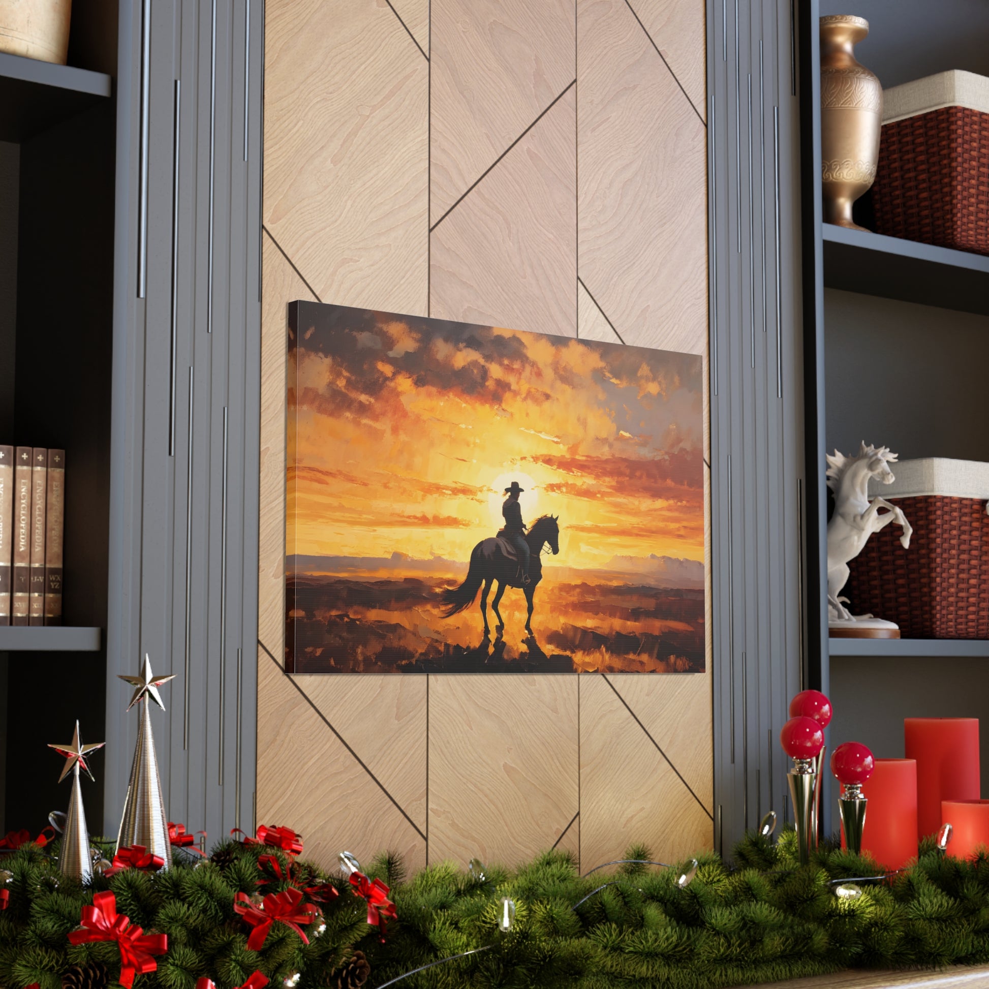 Capture the spirit of the wild west with "Cowboy's Silhouette." This dramatic oil painting on cotton canvas features a lone cowboy riding into the sunset, with warm tones that evoke adventure and nostalgia. NB! For indoor use only.