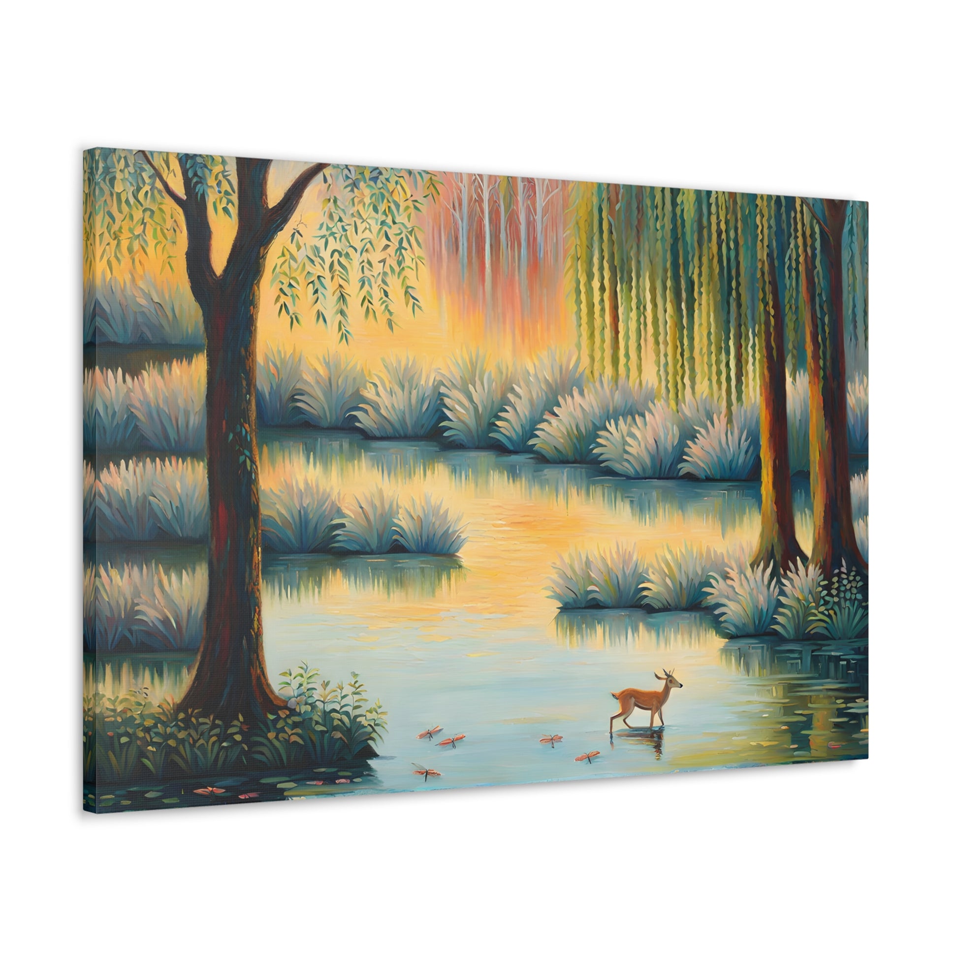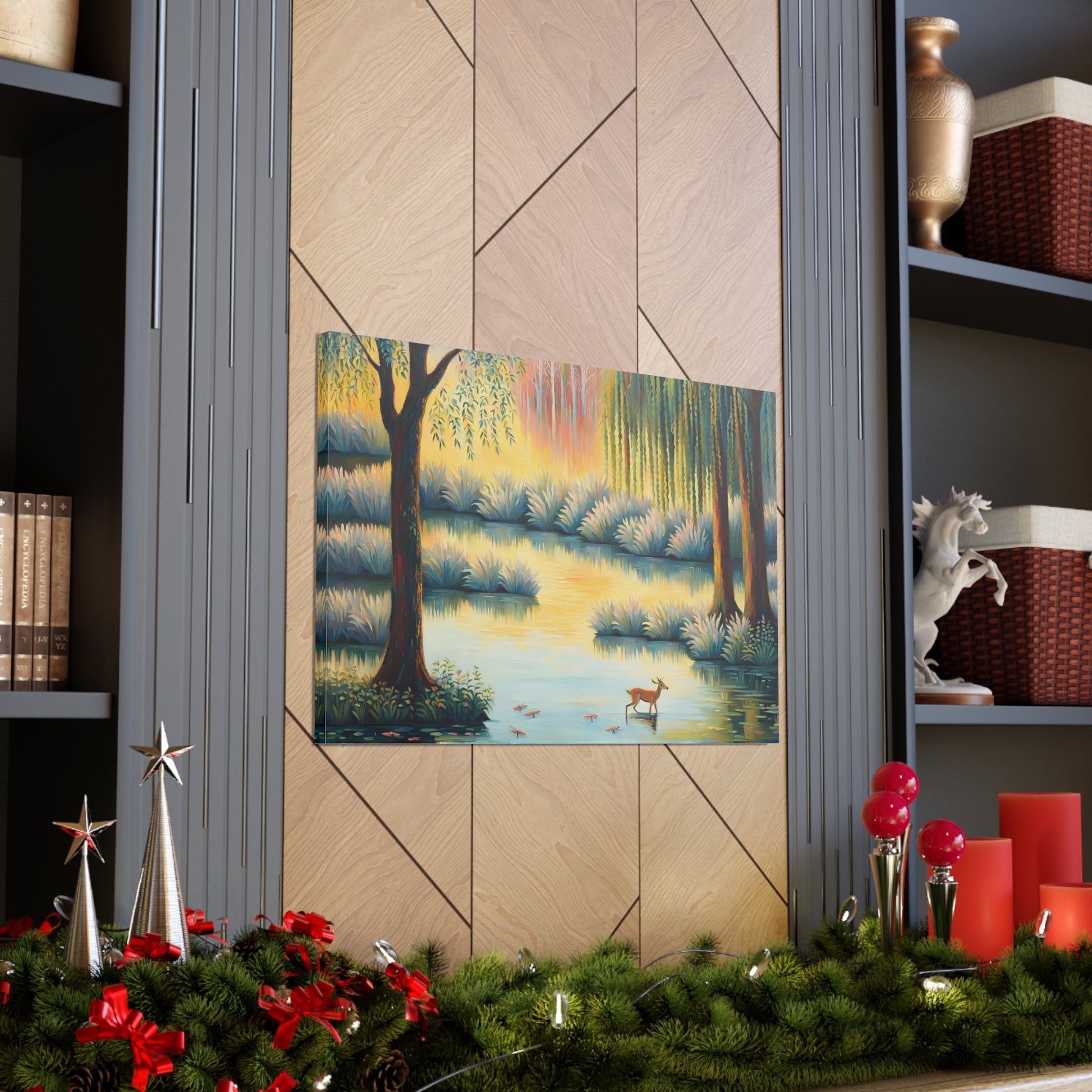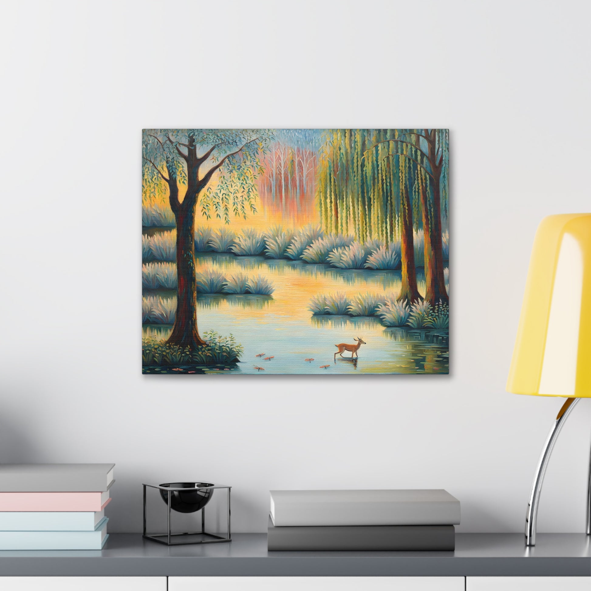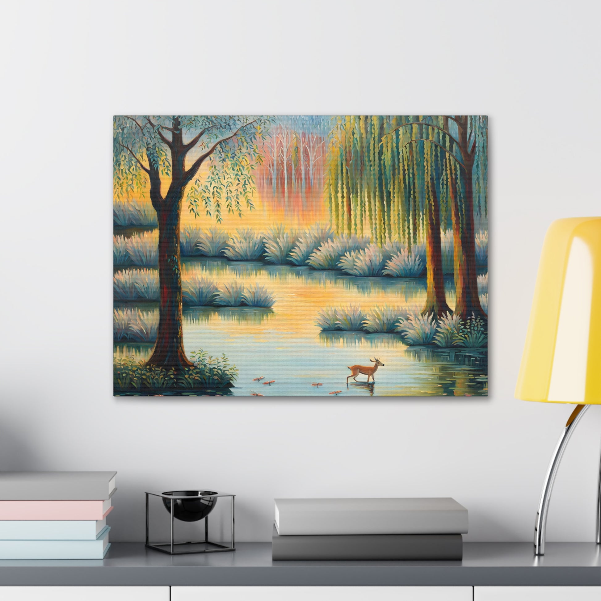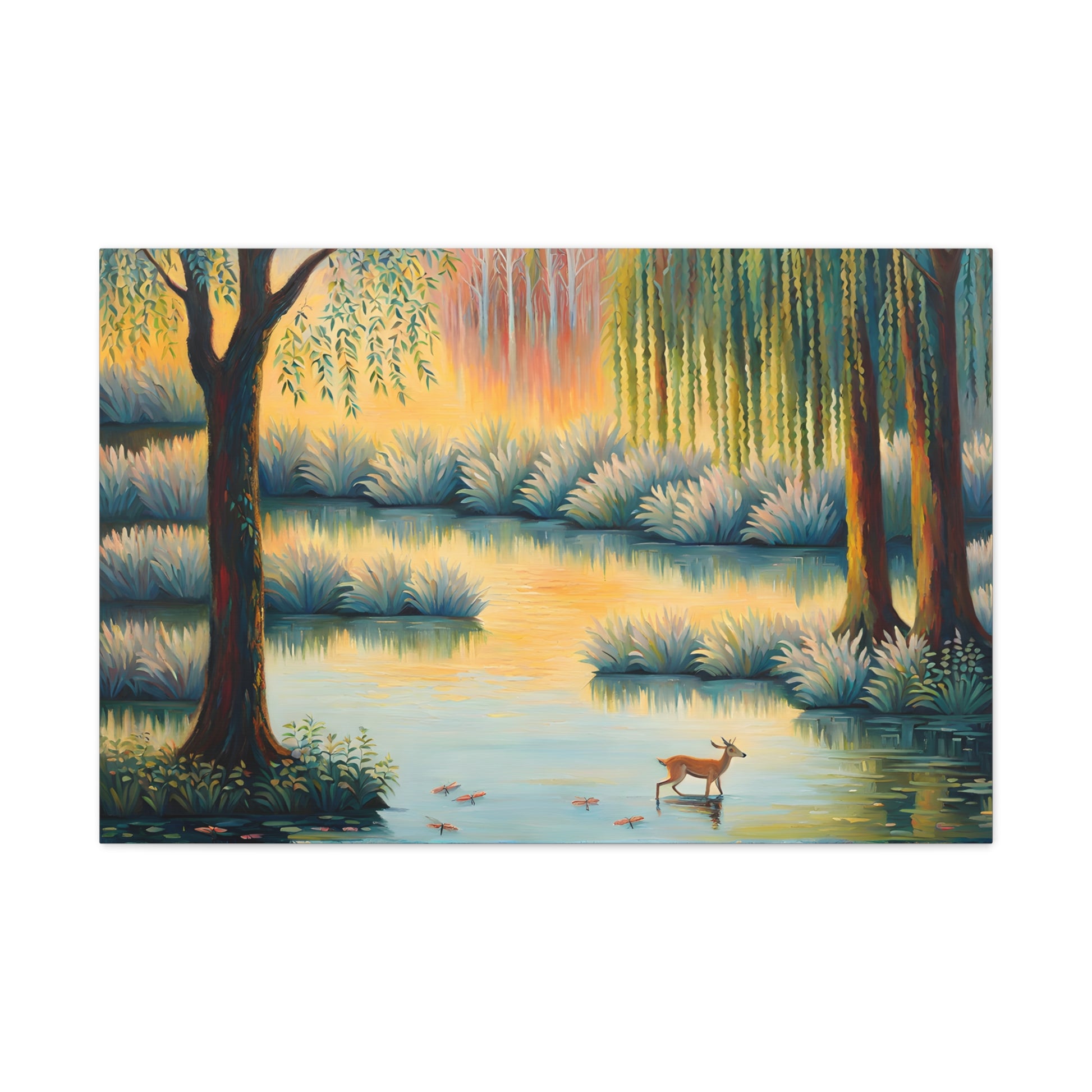 "Delicate Foliage" is a captivating oil painting that brings the gentle beauty of nature into your home. Painted on high-quality cotton canvas, this artwork depicts a serene scene of a deer gracefully wading through a calm stream surrounded by lush greenery and delicate leaves. Perfect for adding a touch of natural charm to any space, this piece is intended for indoor use only.