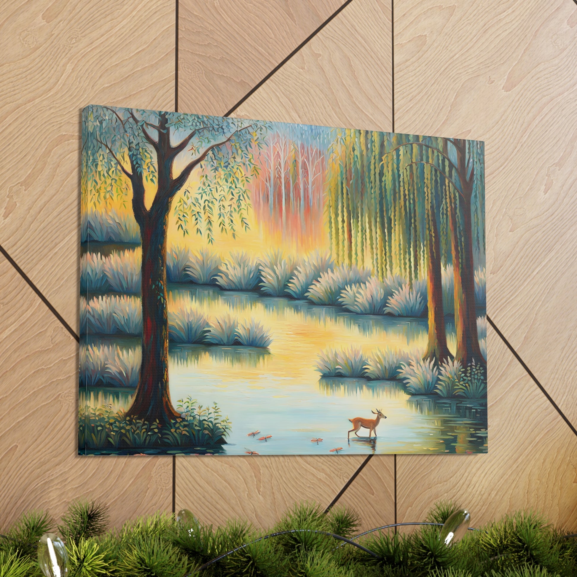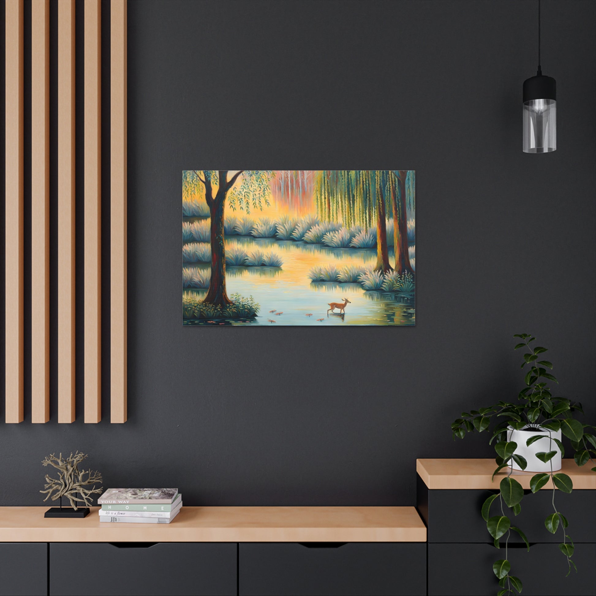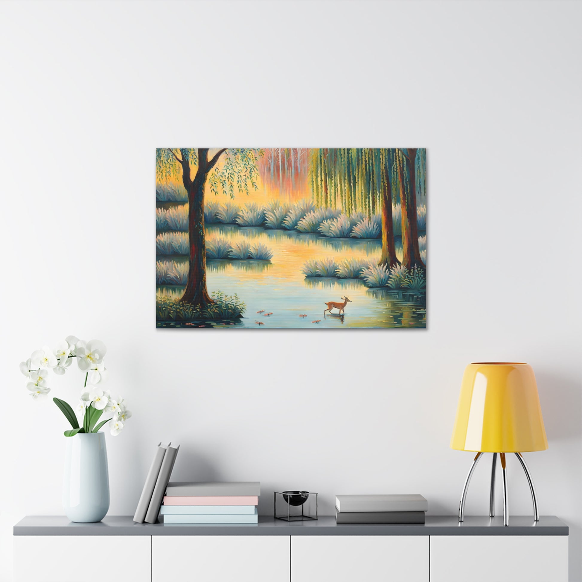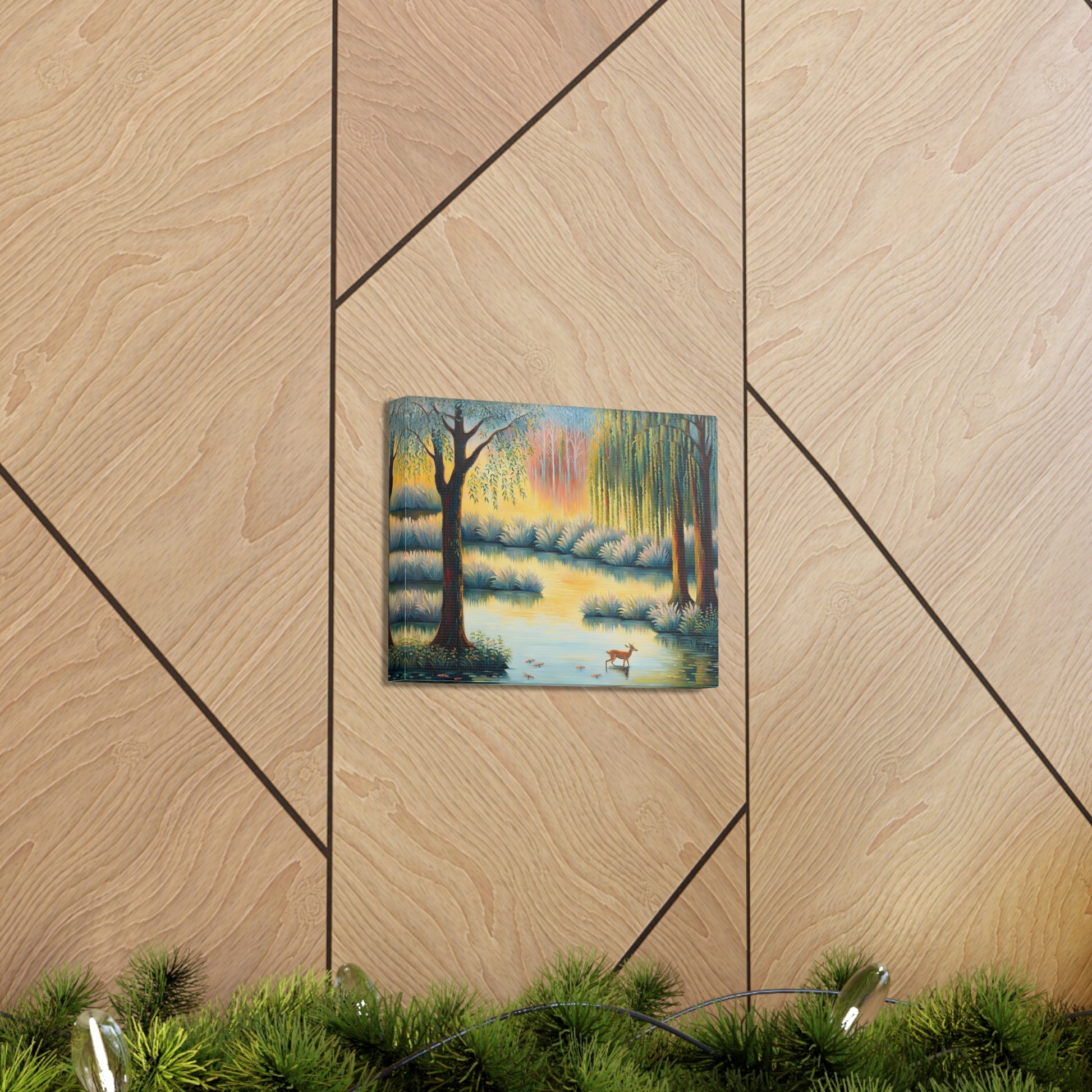 "Delicate Foliage" is a captivating oil painting that brings the gentle beauty of nature into your home. Painted on high-quality cotton canvas, this artwork depicts a serene scene of a deer gracefully wading through a calm stream surrounded by lush greenery and delicate leaves. Perfect for adding a touch of natural charm to any space, this piece is intended for indoor use only.
