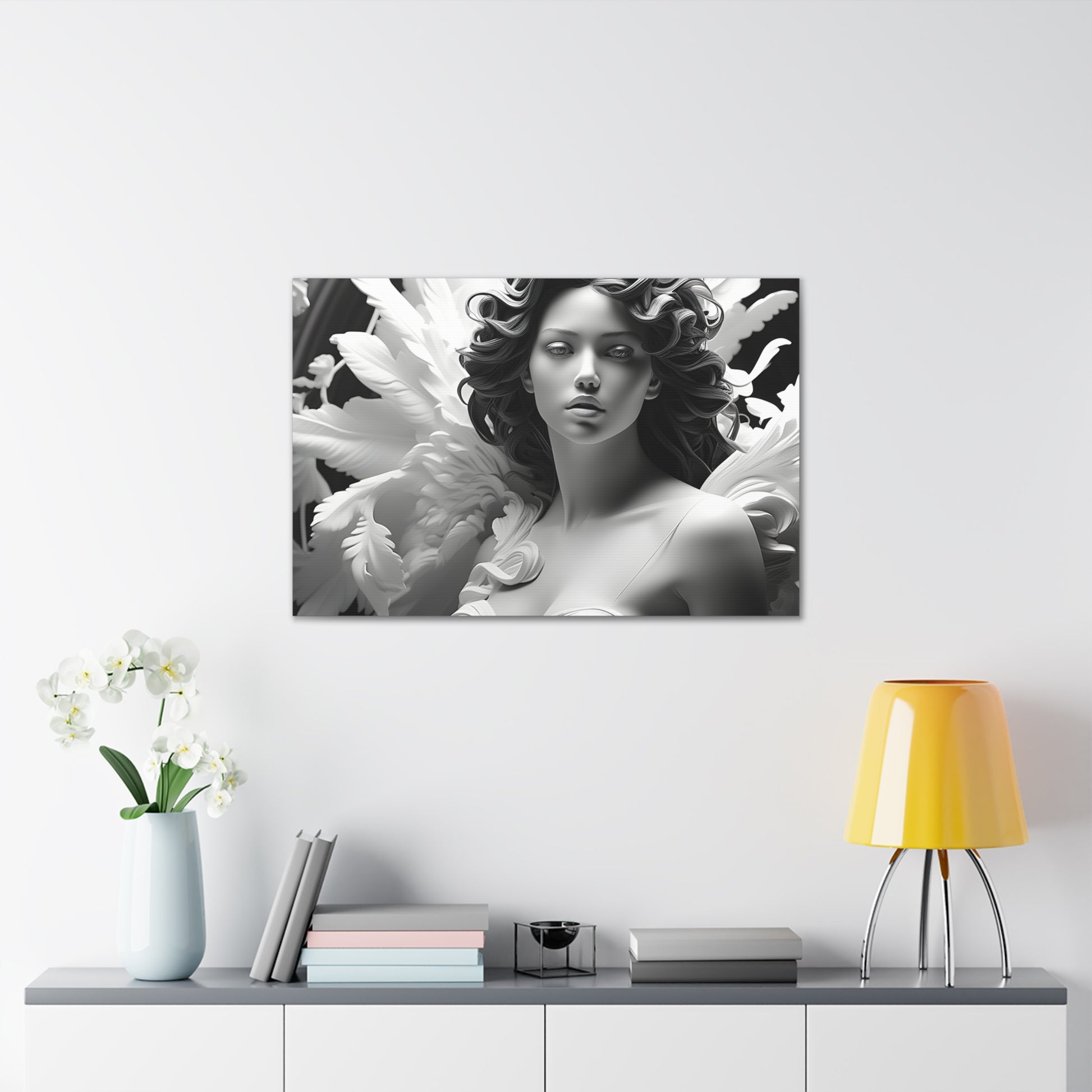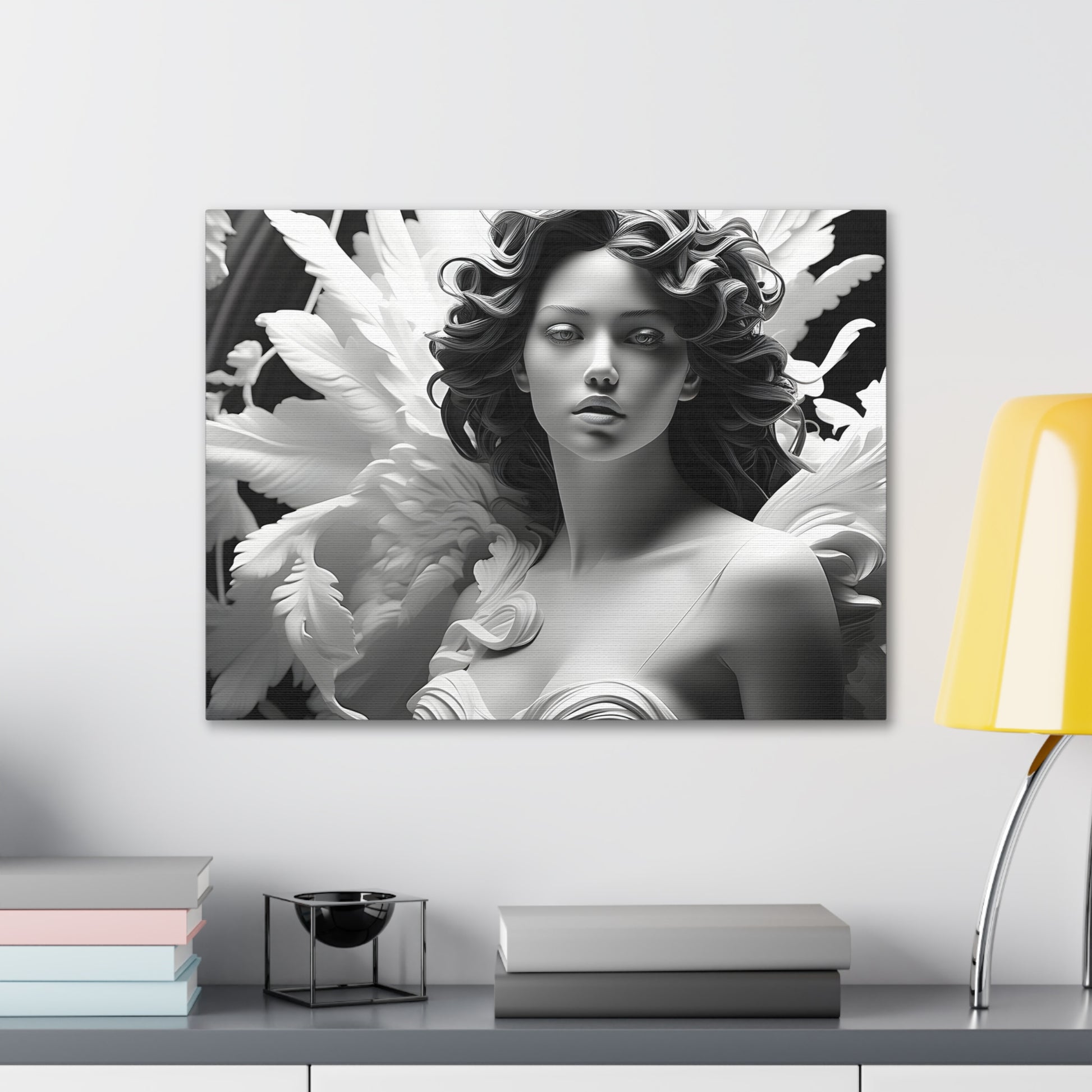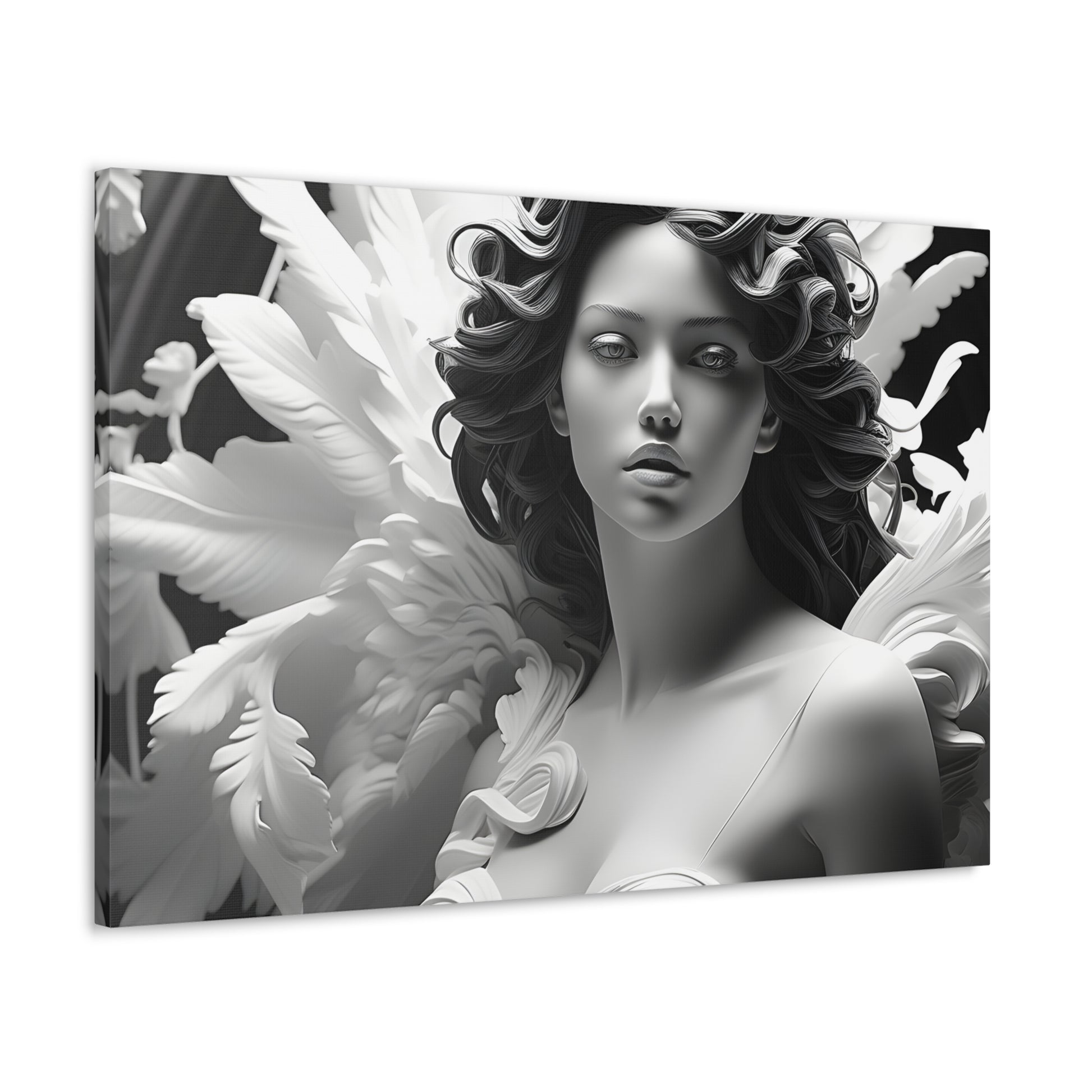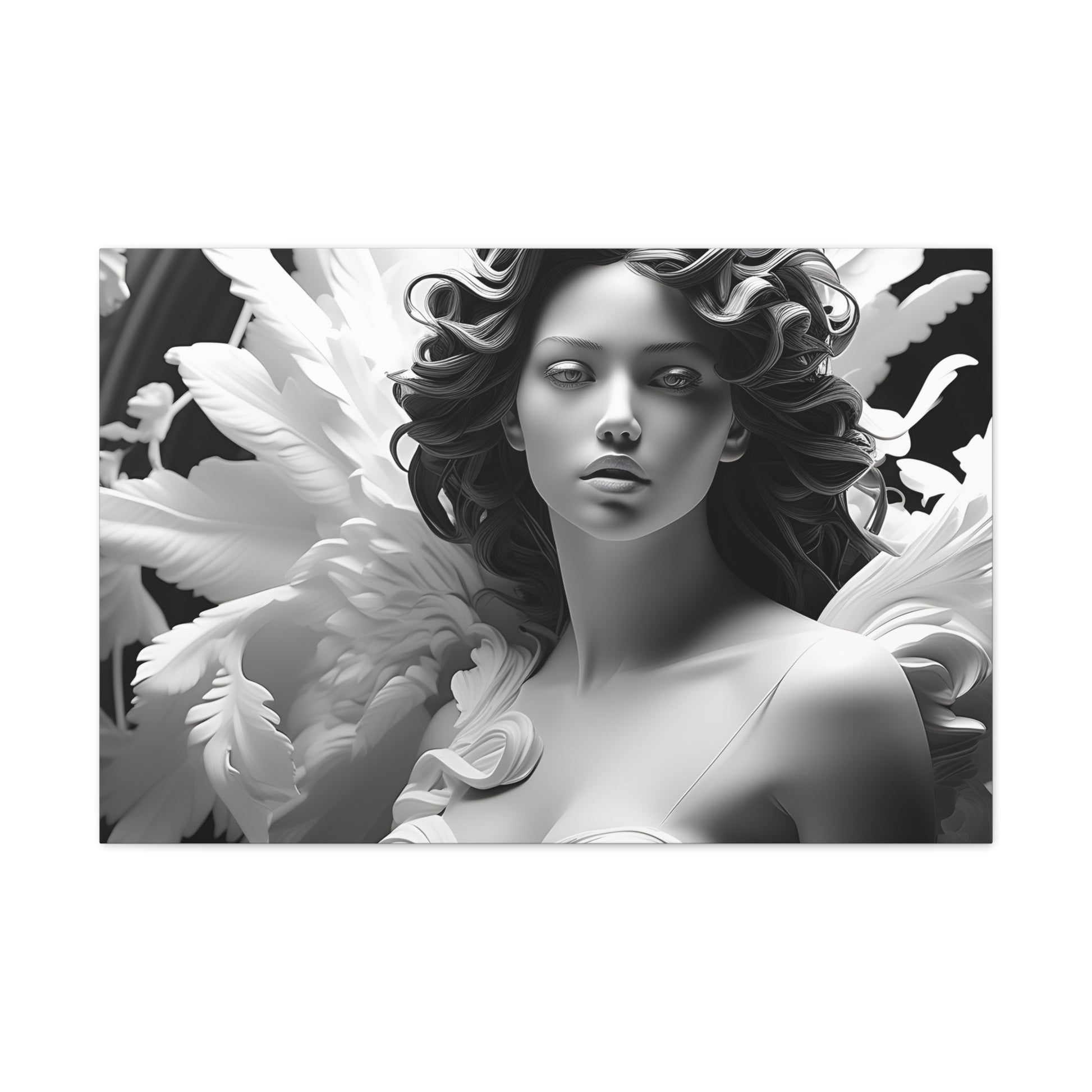Invite celestial charm into your space with "Divine Gaze," a captivating black and white canvas artwork featuring a mesmerizing sculpture of a beautiful angelic woman, casting an enigmatic and divine gaze right at you. This striking piece encapsulates ethereal beauty and grace, capturing the essence of serenity and celestial allure.