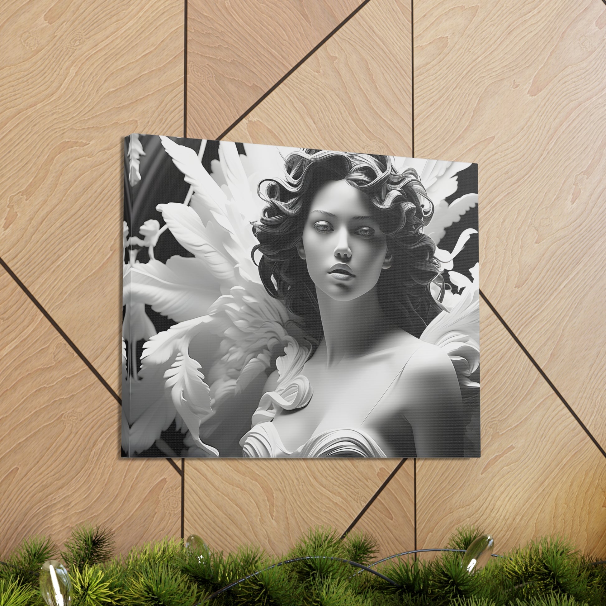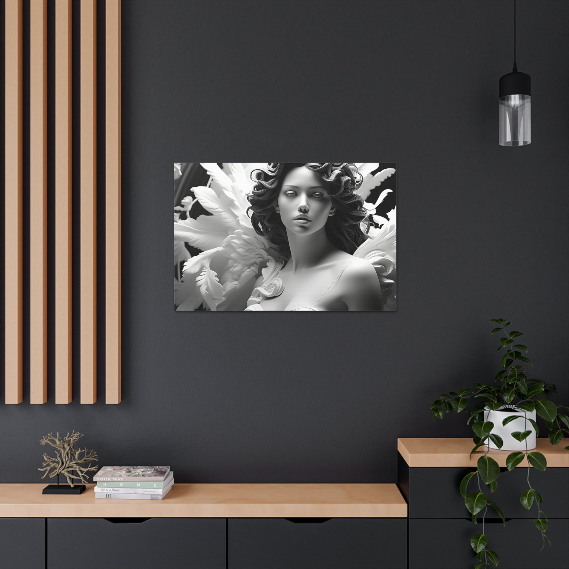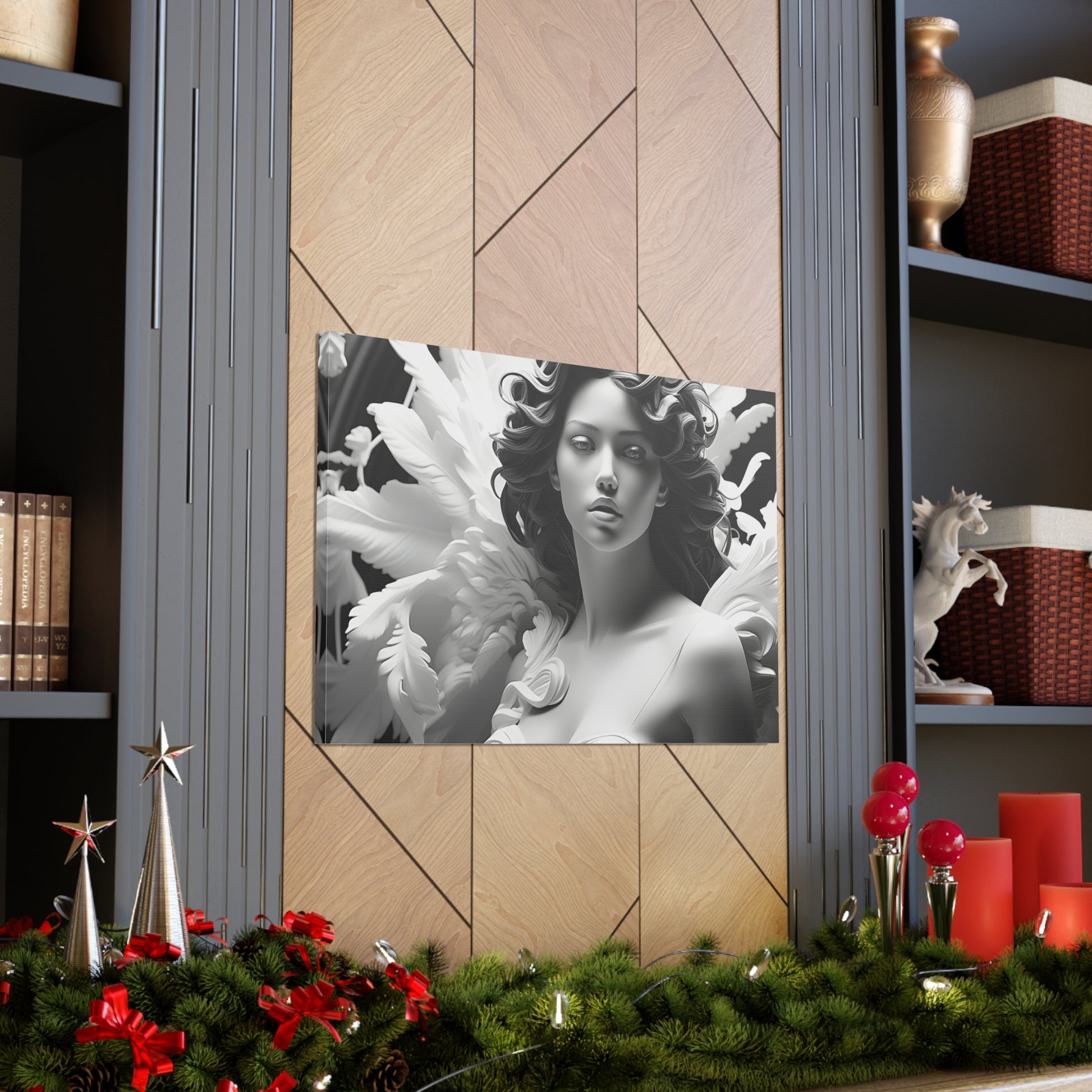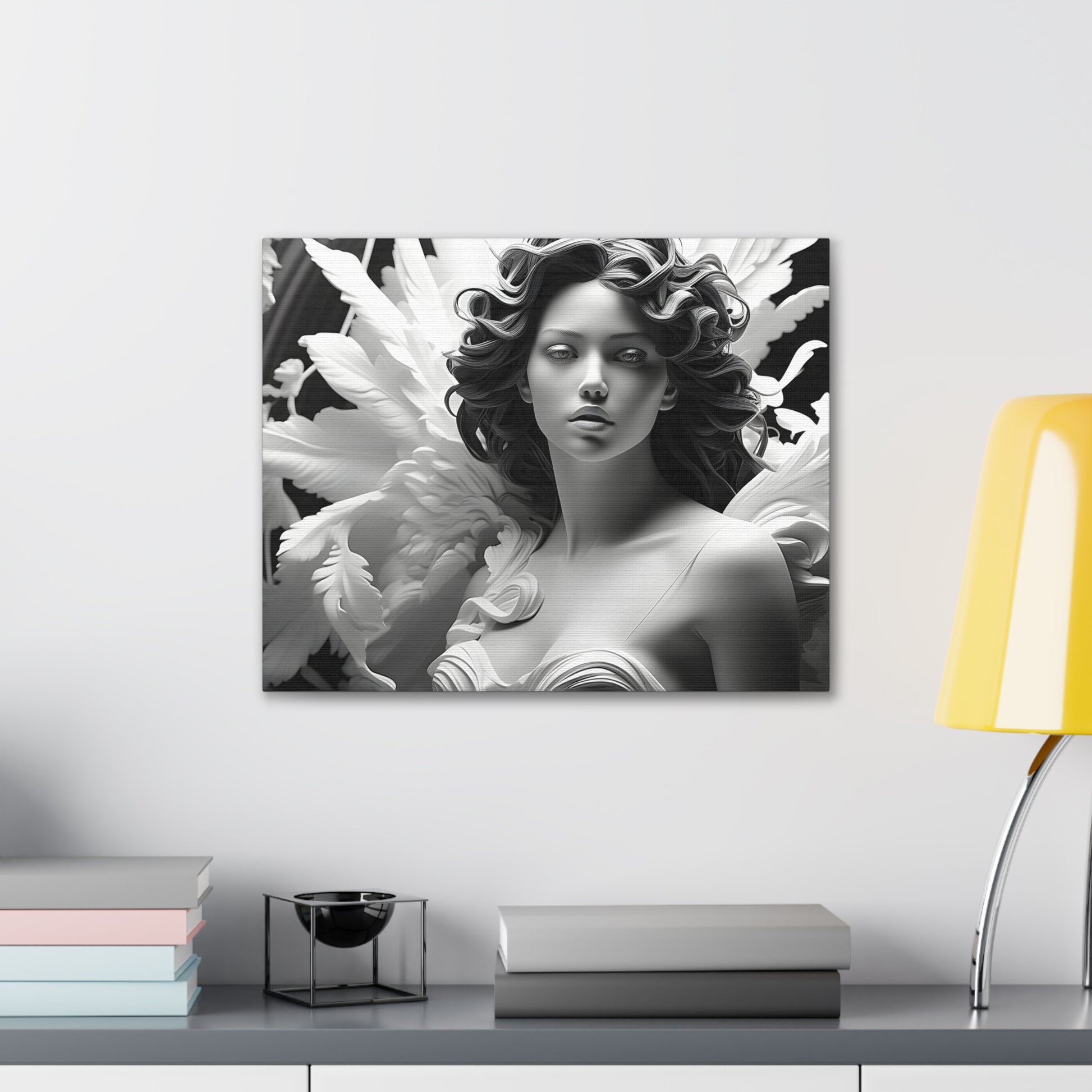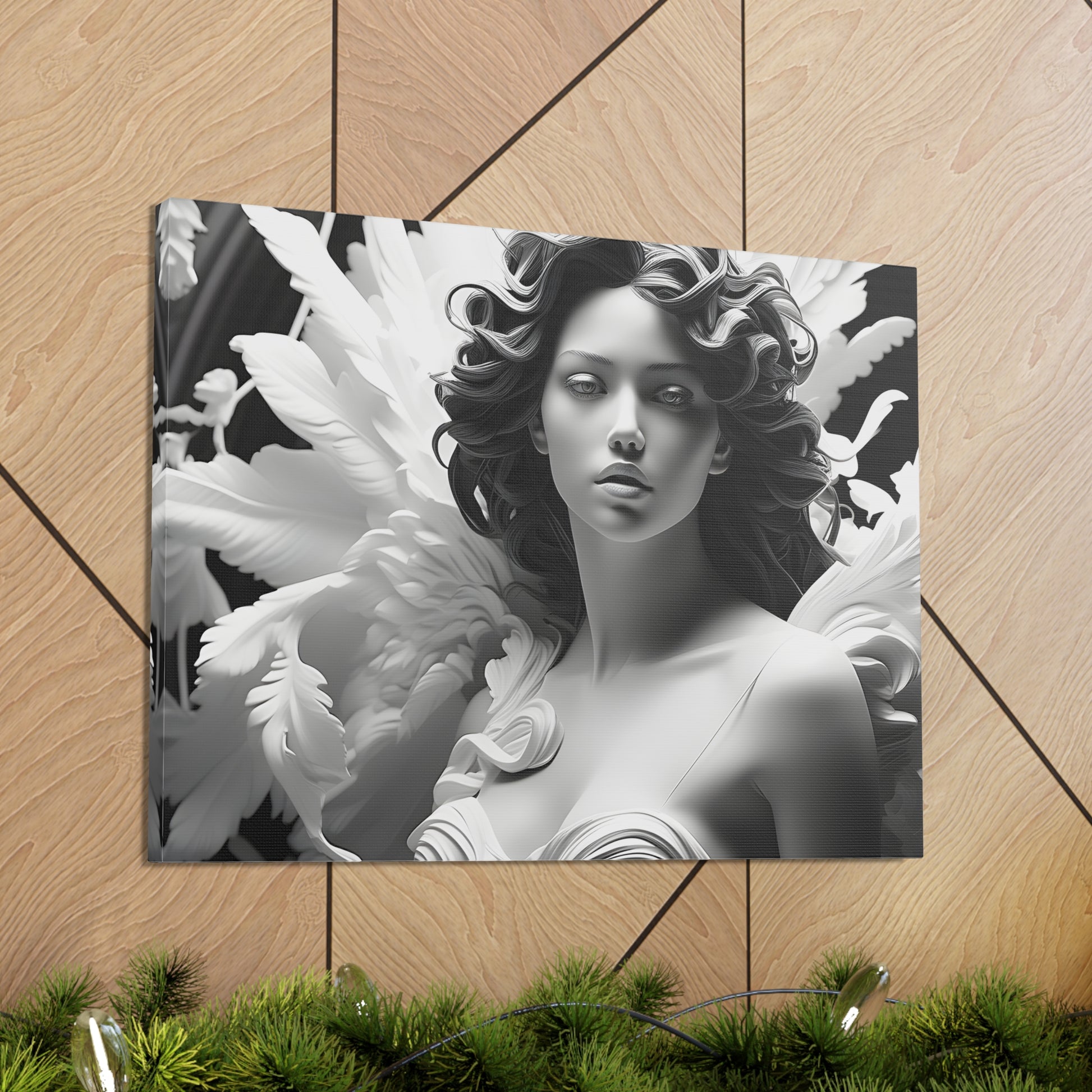 Invite celestial charm into your space with "Divine Gaze," a captivating black and white canvas artwork featuring a mesmerizing sculpture of a beautiful angelic woman, casting an enigmatic and divine gaze right at you. This striking piece encapsulates ethereal beauty and grace, capturing the essence of serenity and celestial allure.