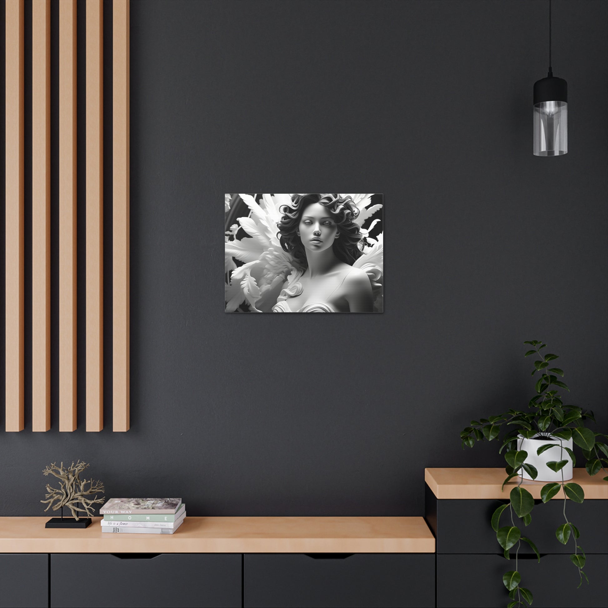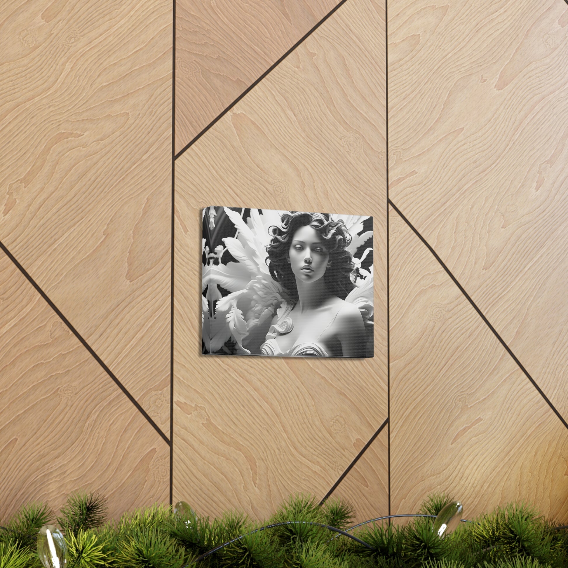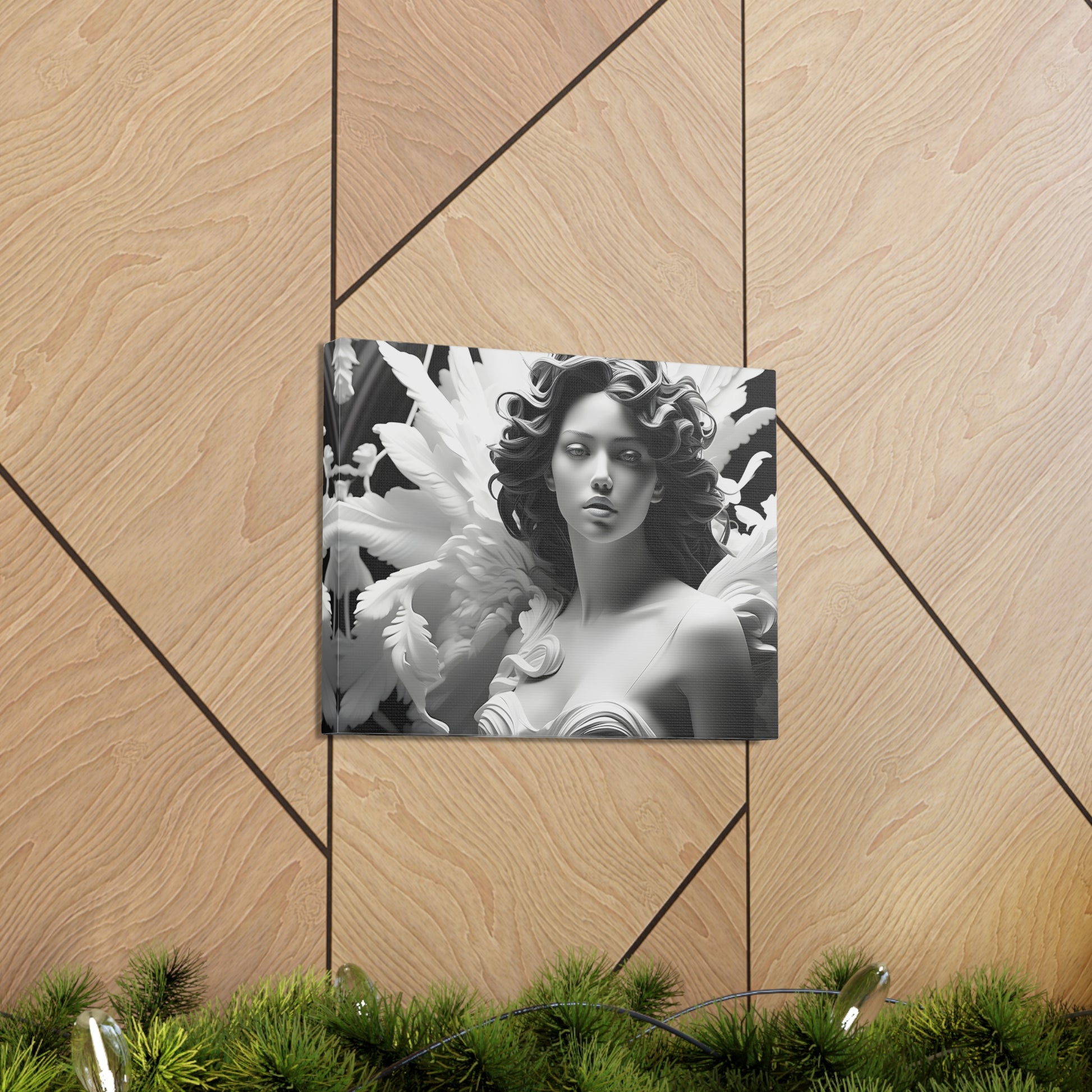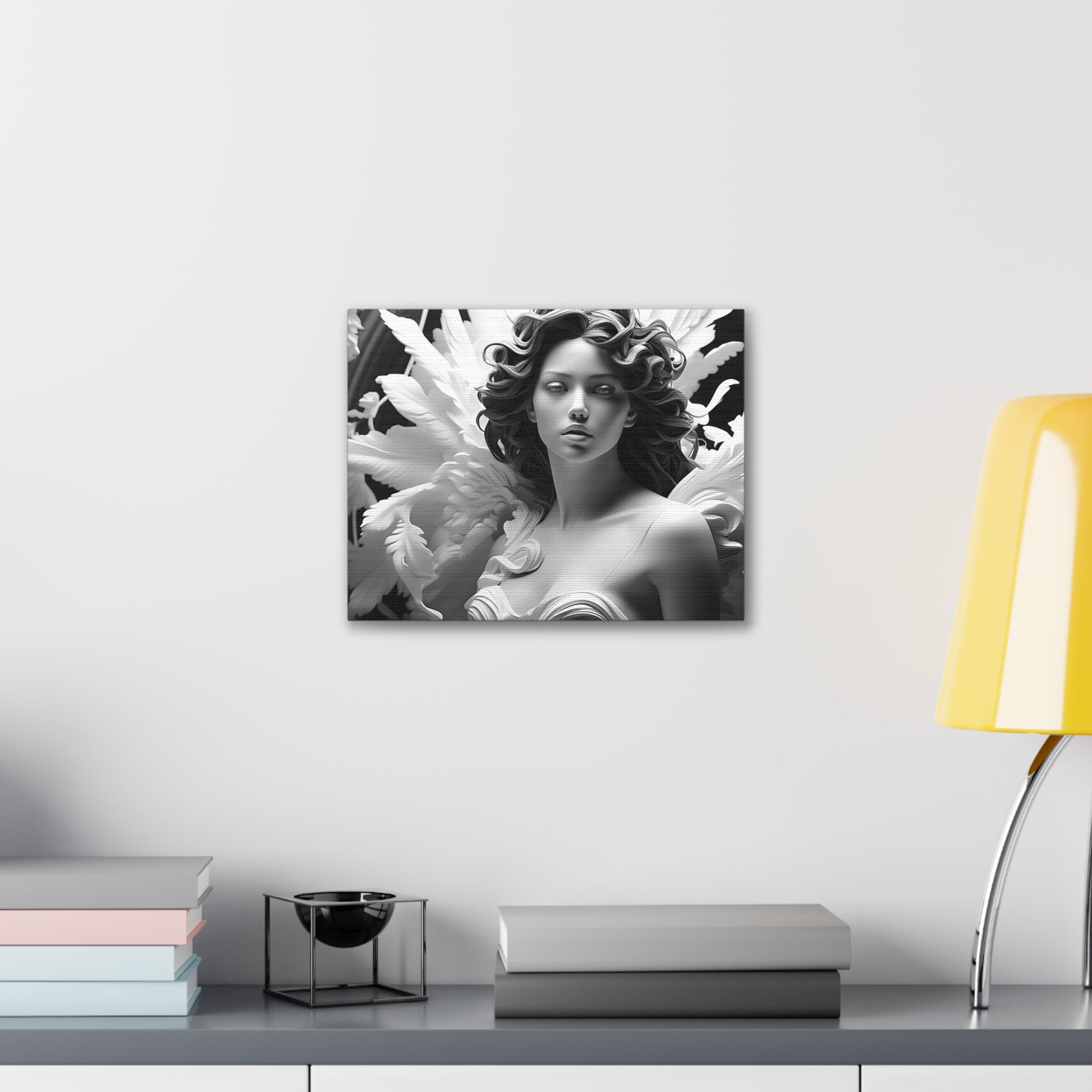 Invite celestial charm into your space with "Divine Gaze," a captivating black and white canvas artwork featuring a mesmerizing sculpture of a beautiful angelic woman, casting an enigmatic and divine gaze right at you. This striking piece encapsulates ethereal beauty and grace, capturing the essence of serenity and celestial allure.