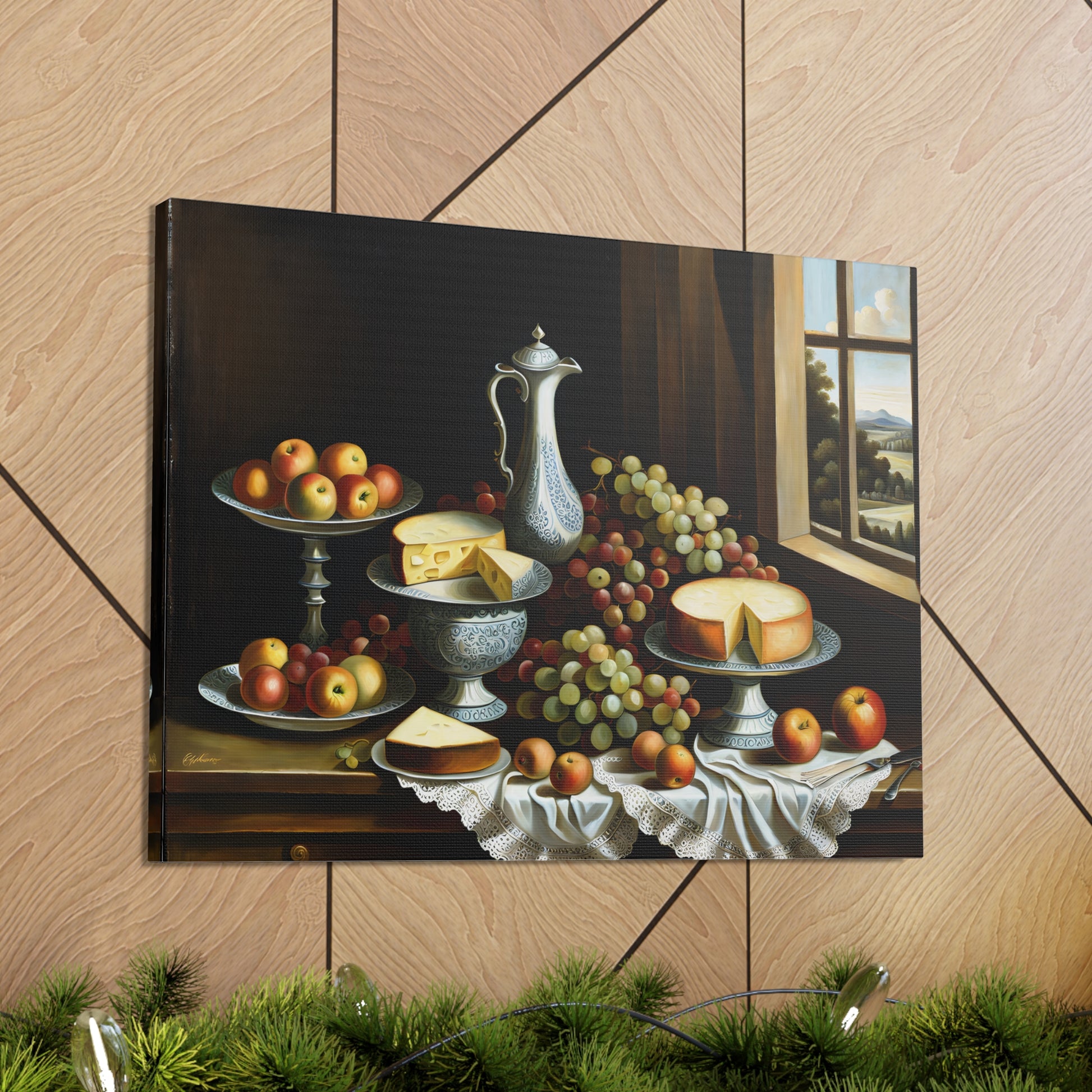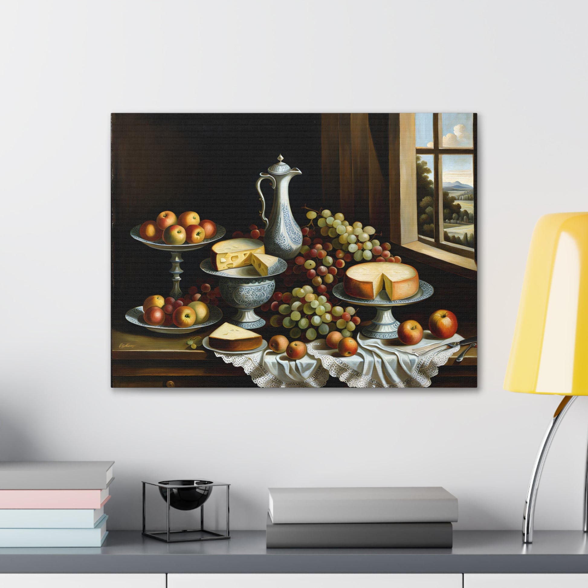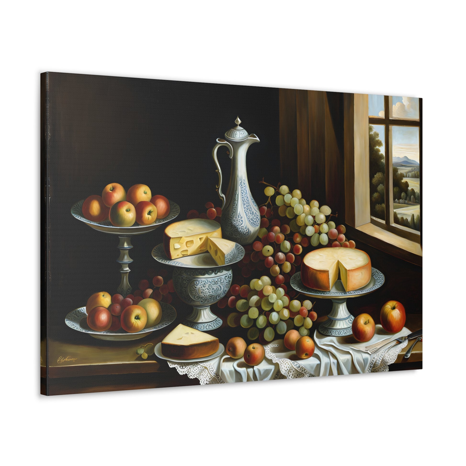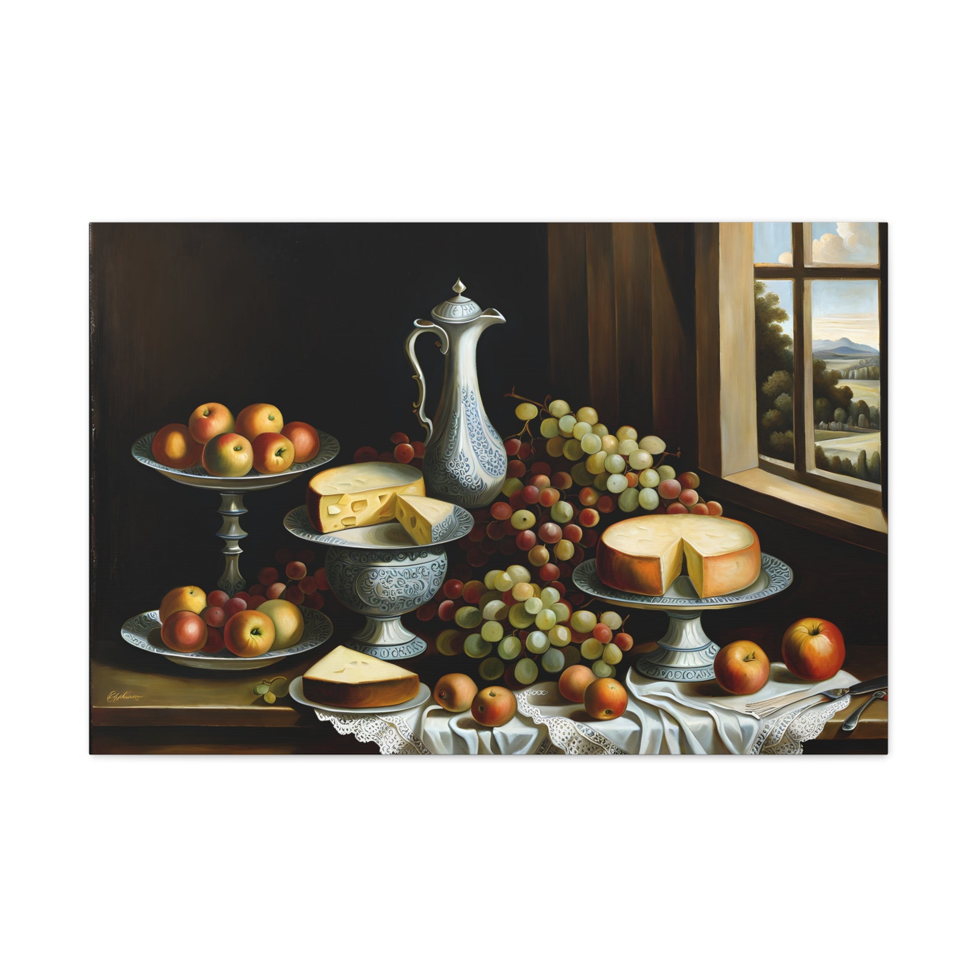 Celebrate the elegance of still life with "Dutch Century." This oil painting takes inspiration from classic Dutch masterpieces, featuring an exquisite arrangement of fruit and cheese by the window. Ideal for adding an air of sophistication to your space.