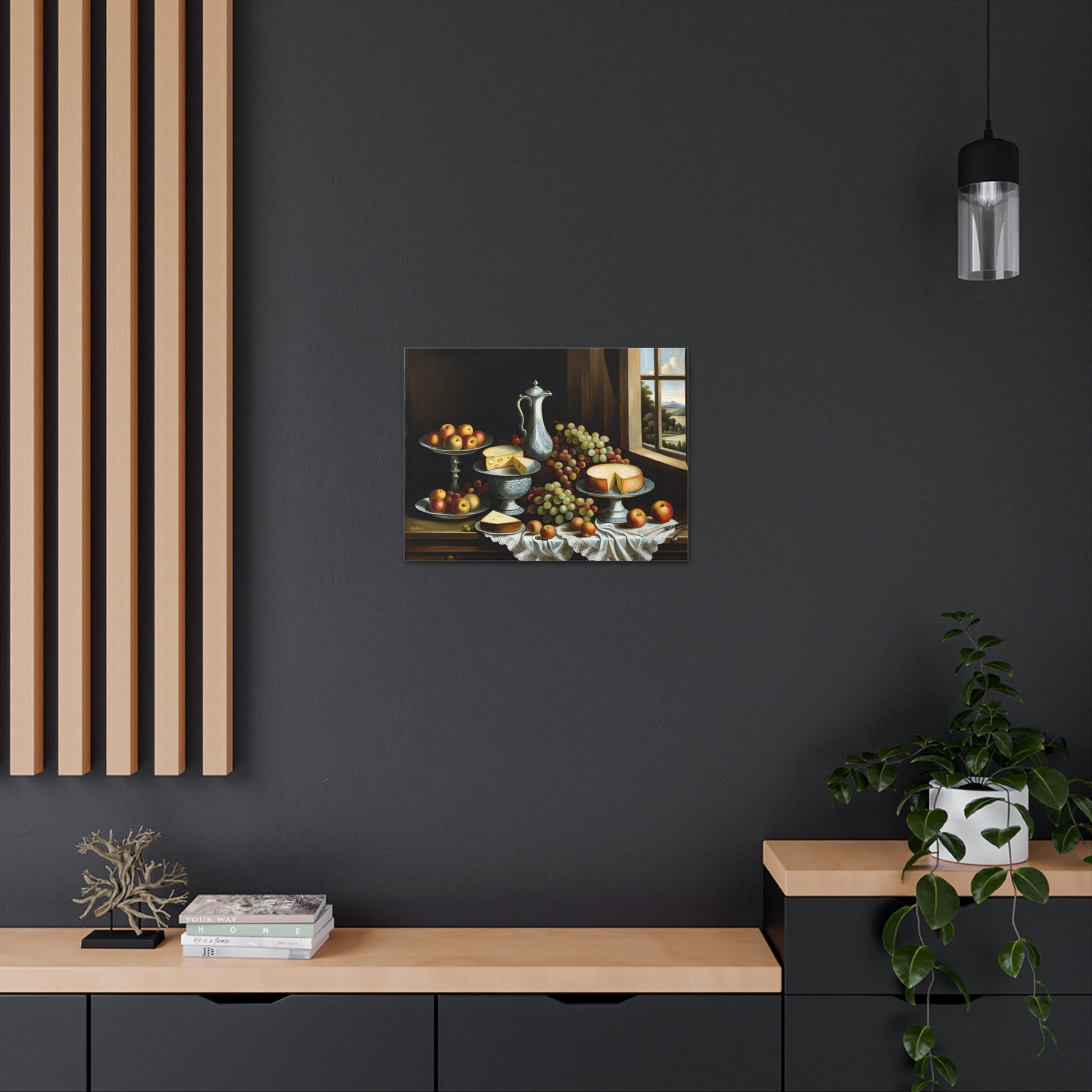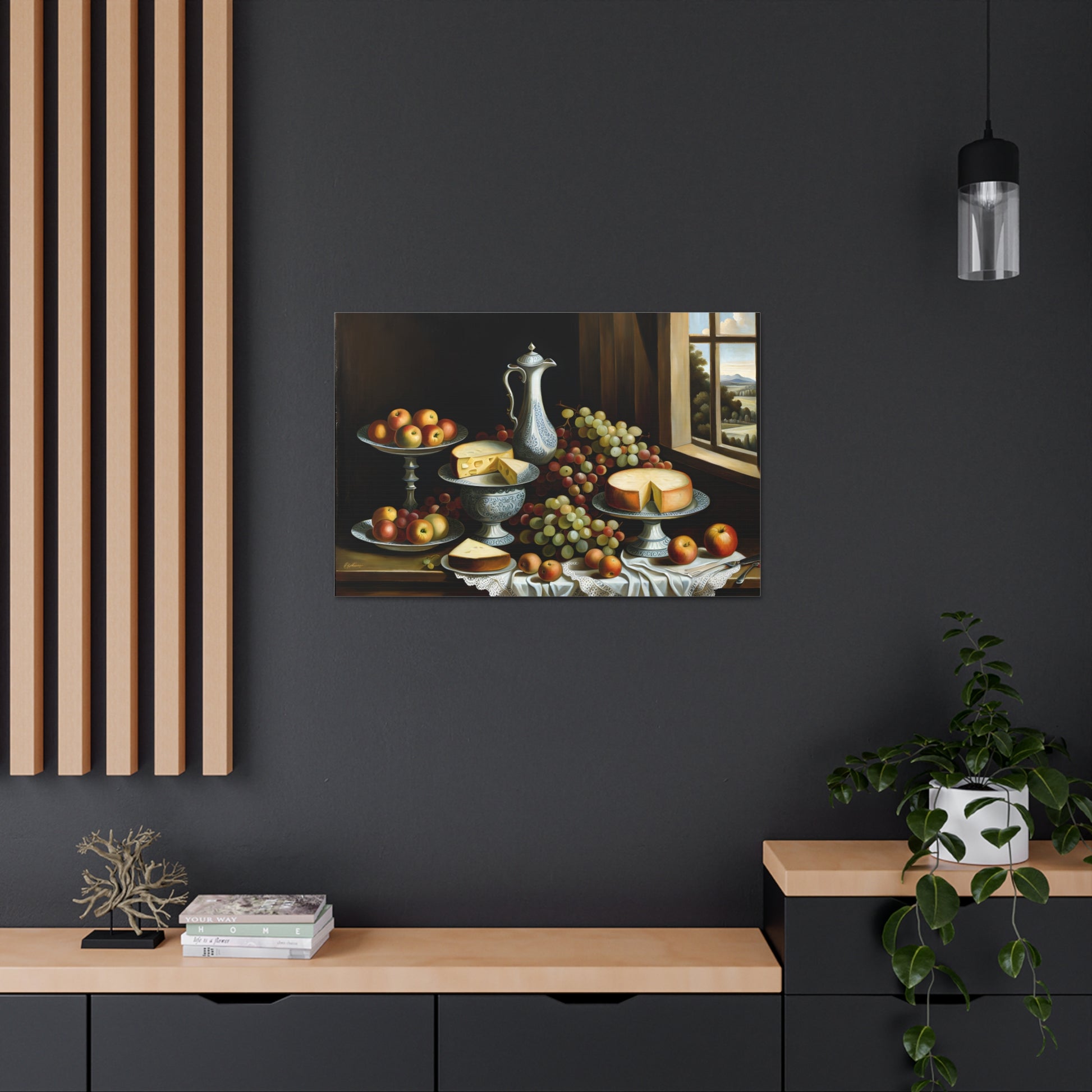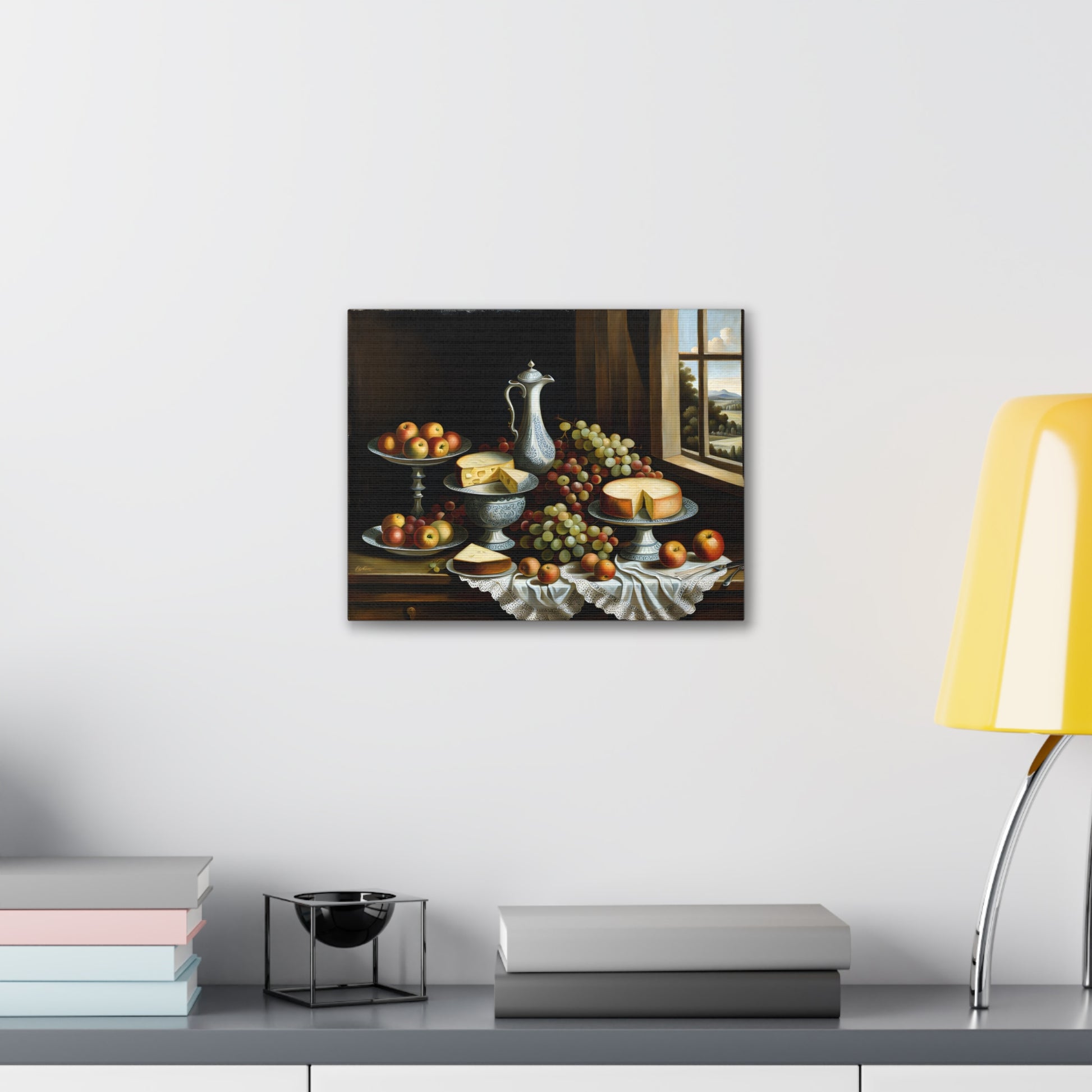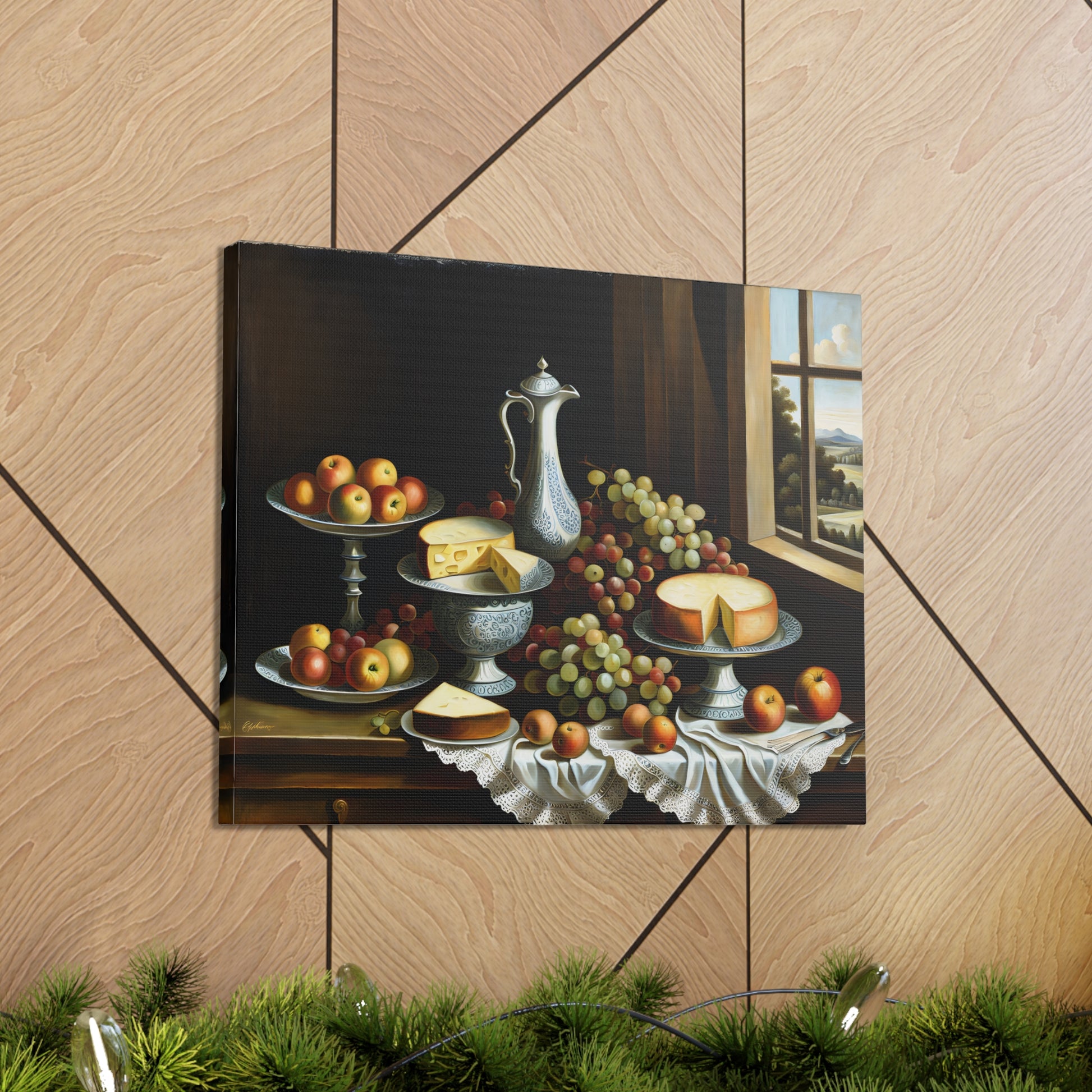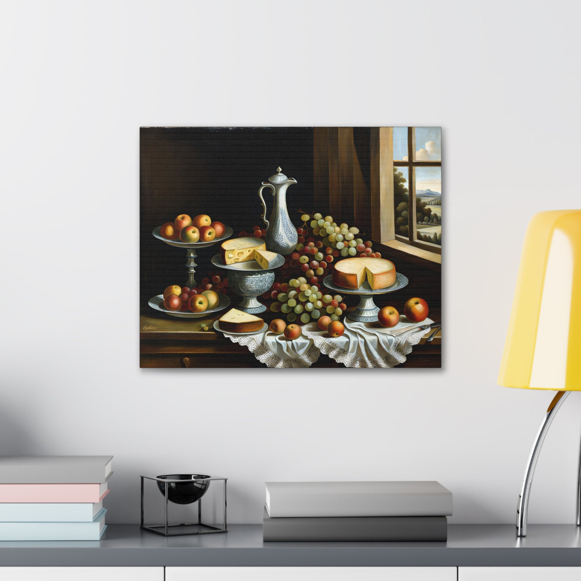 Celebrate the elegance of still life with "Dutch Century." This oil painting takes inspiration from classic Dutch masterpieces, featuring an exquisite arrangement of fruit and cheese by the window. Ideal for adding an air of sophistication to your space.
