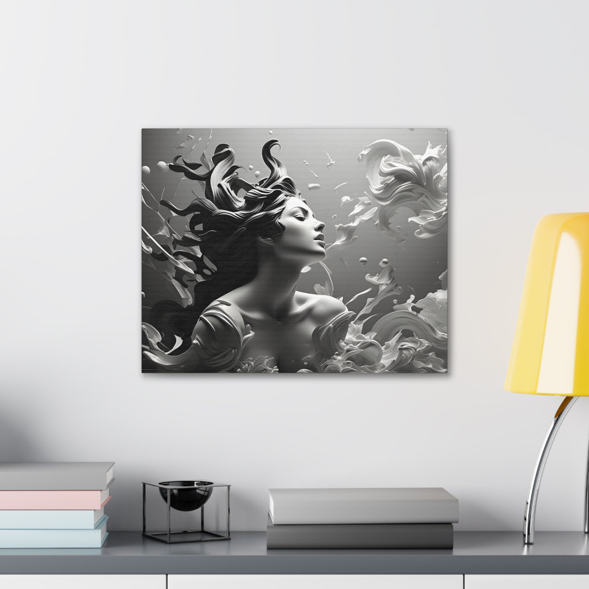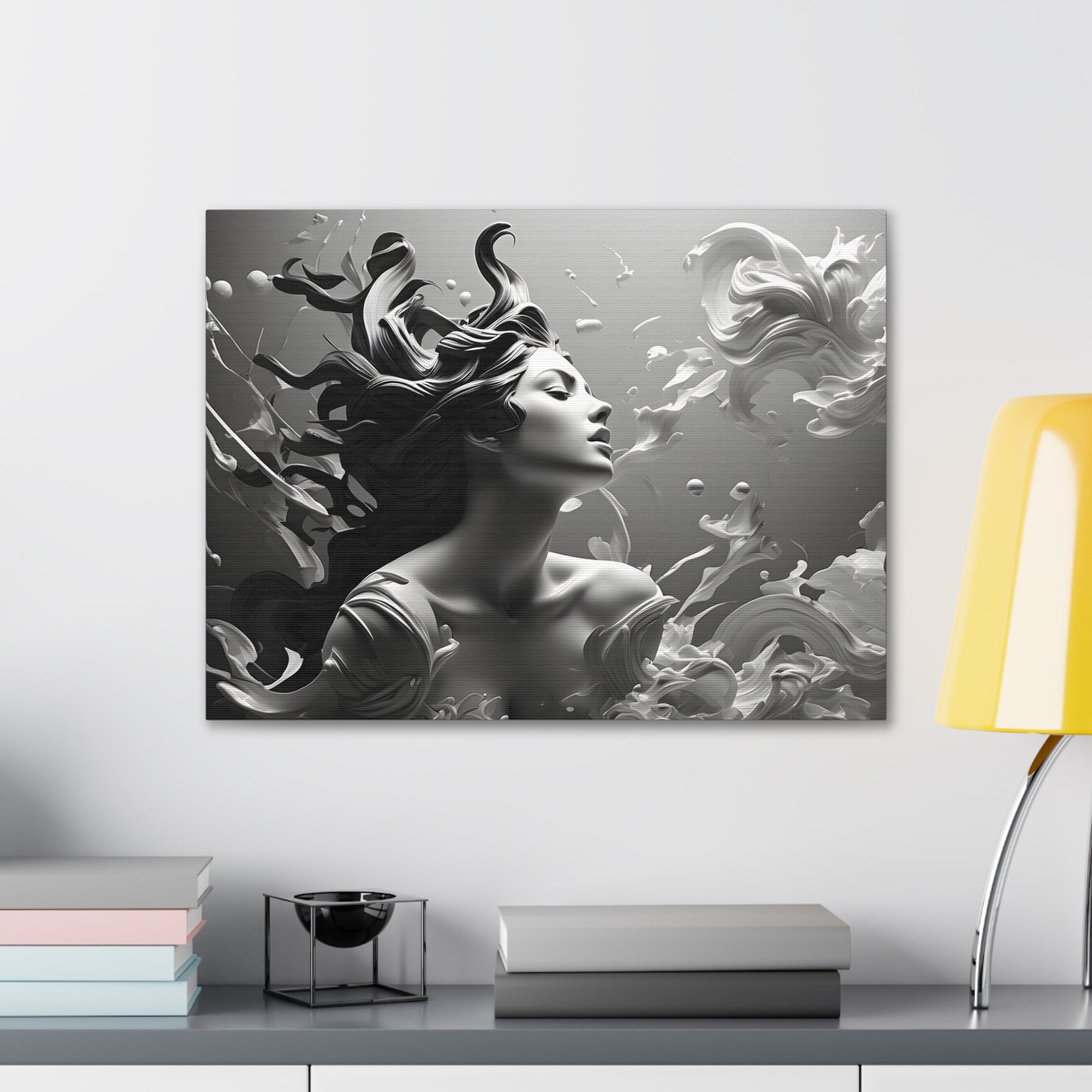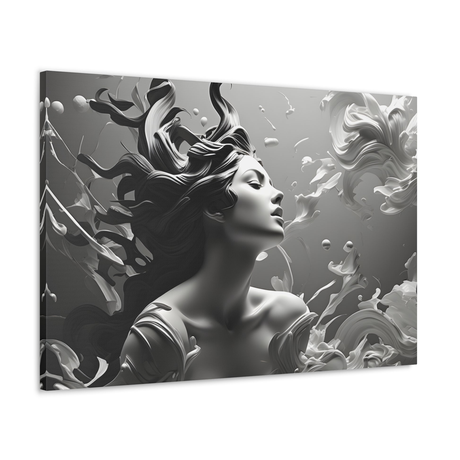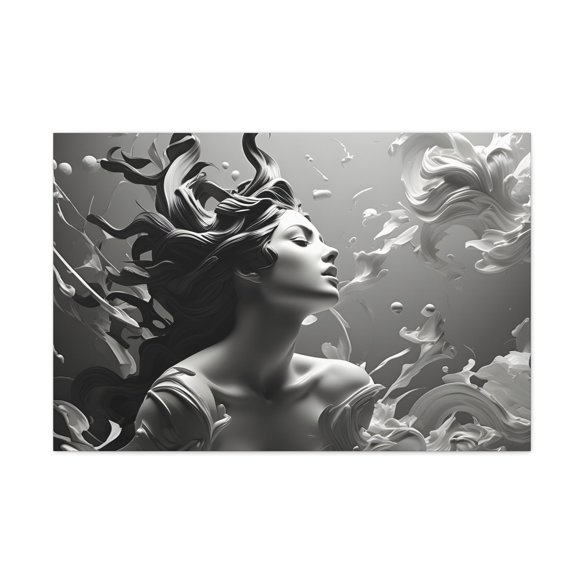 Immerse your space in ethereal beauty with "Flowing Grace," a mesmerizing black and white canvas artwork showcasing an elegant sculpture of a lady with gracefully flowing hair. This captivating piece captures the essence of poise and beauty, depicting the subtle movement and gracefulness of the sculpture.