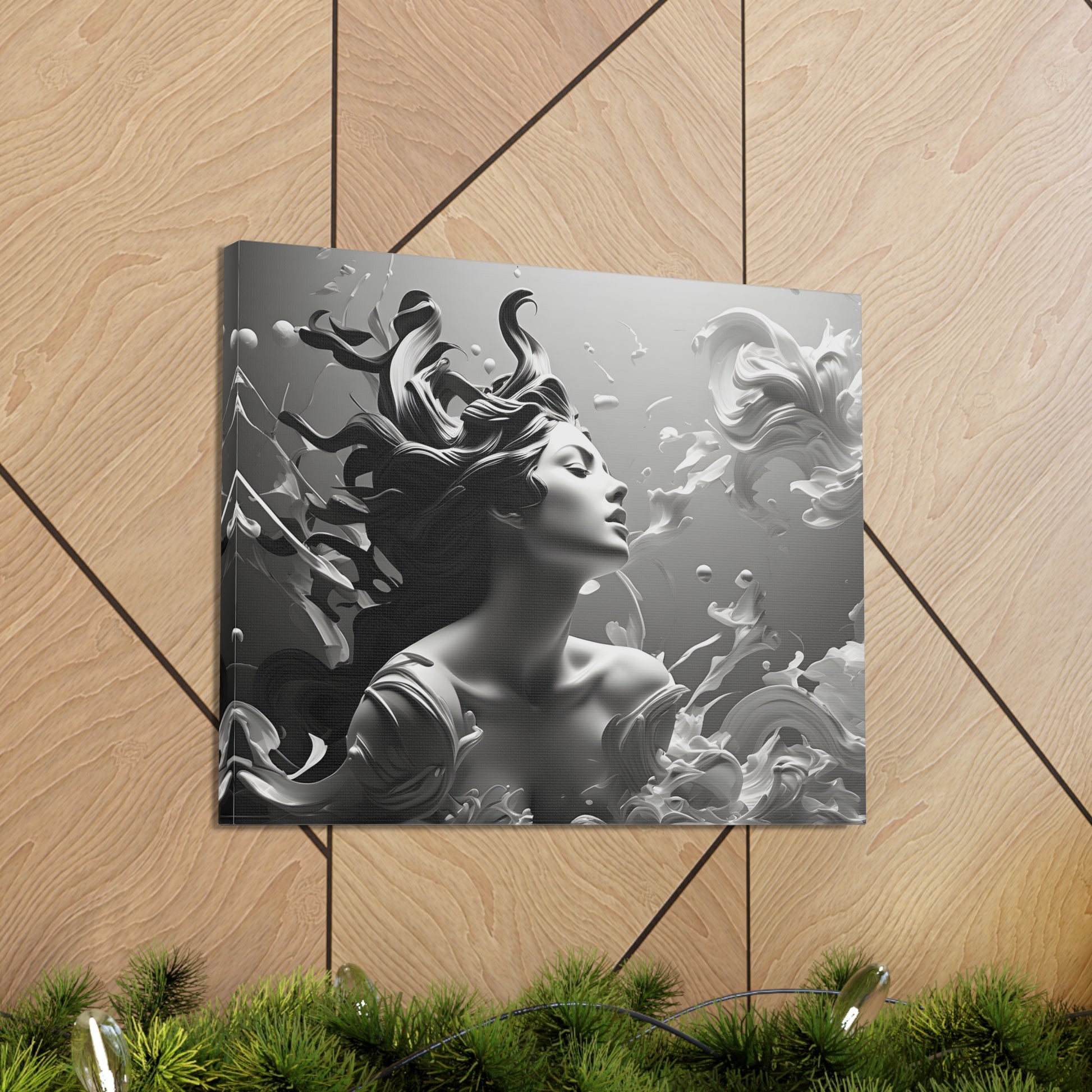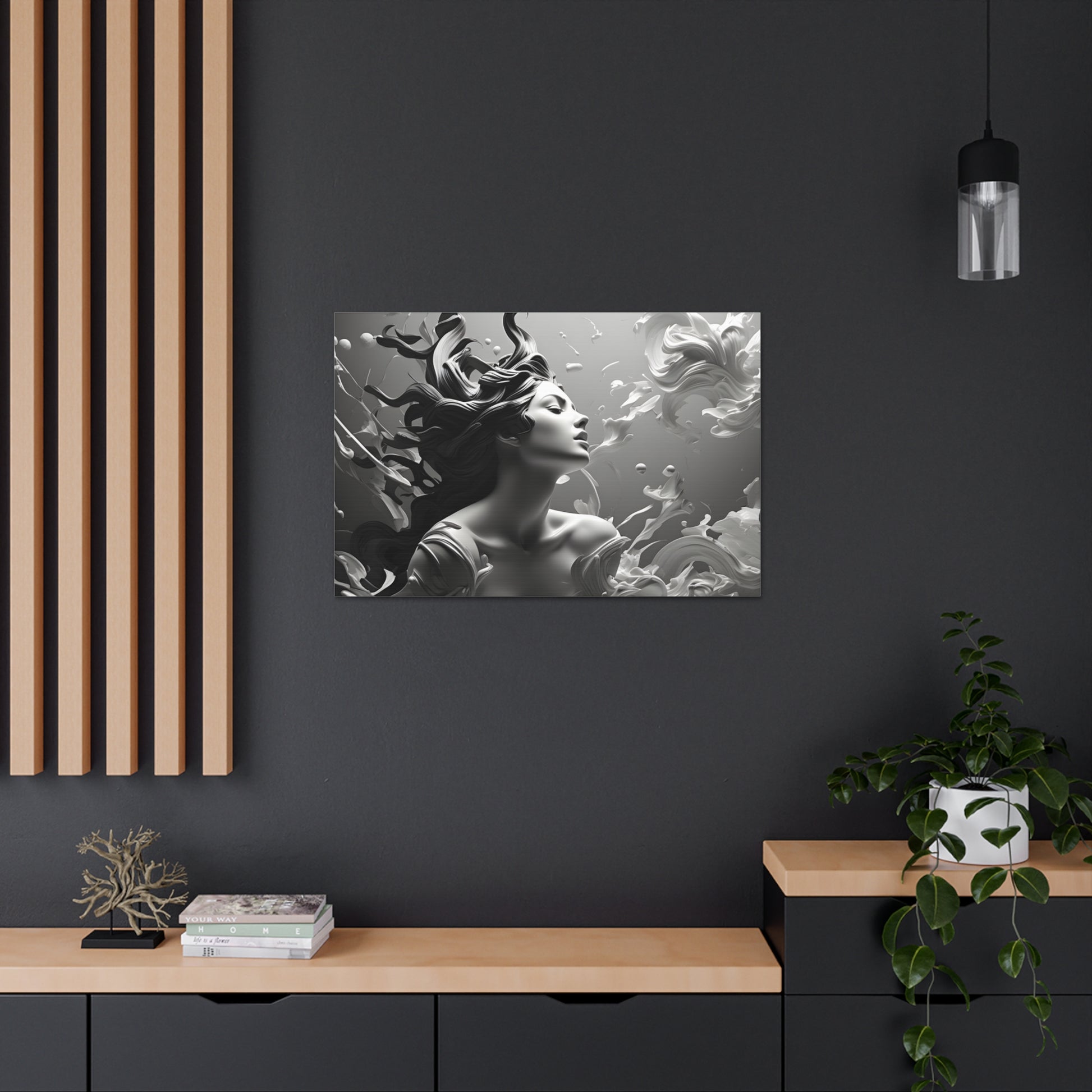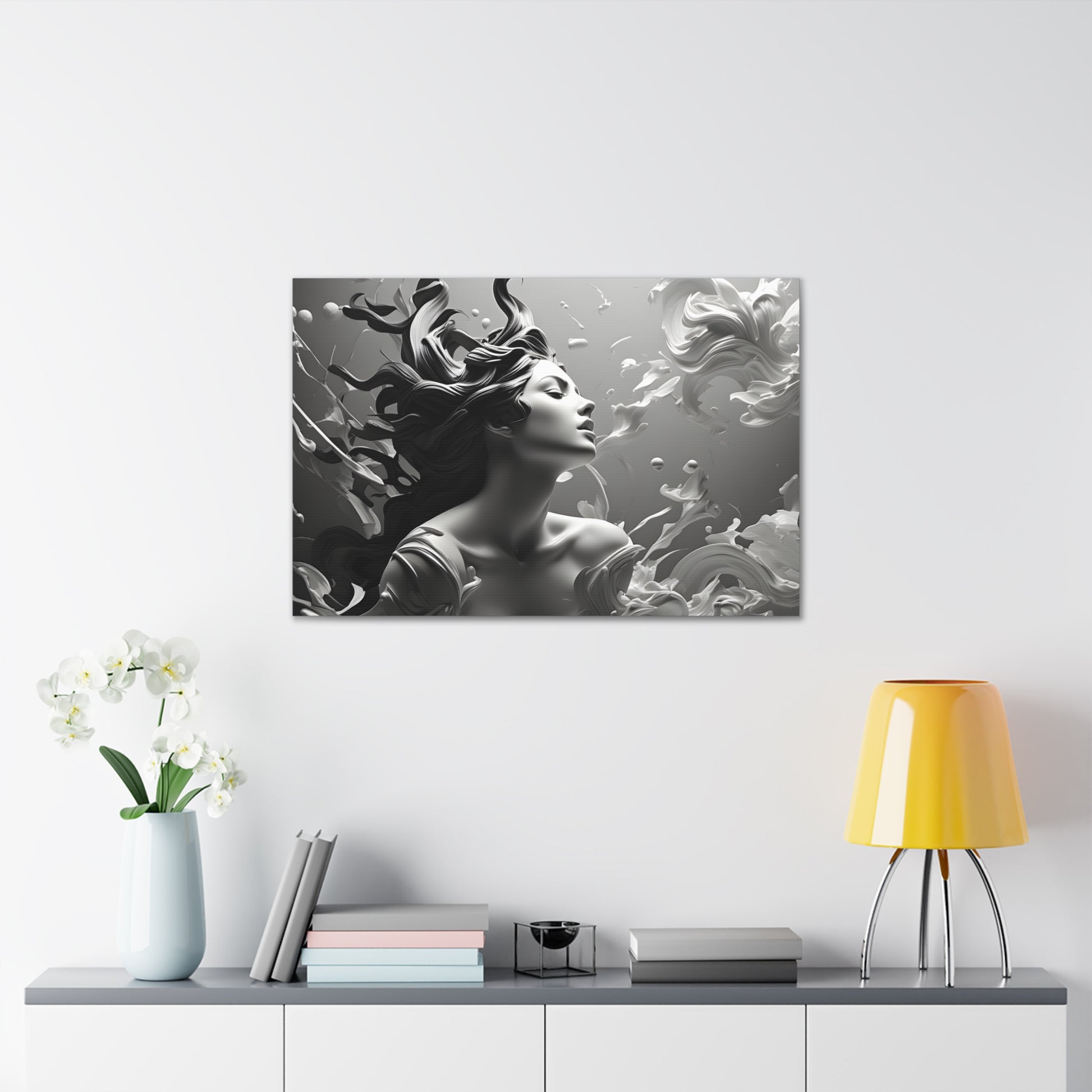 Immerse your space in ethereal beauty with "Flowing Grace," a mesmerizing black and white canvas artwork showcasing an elegant sculpture of a lady with gracefully flowing hair. This captivating piece captures the essence of poise and beauty, depicting the subtle movement and gracefulness of the sculpture.