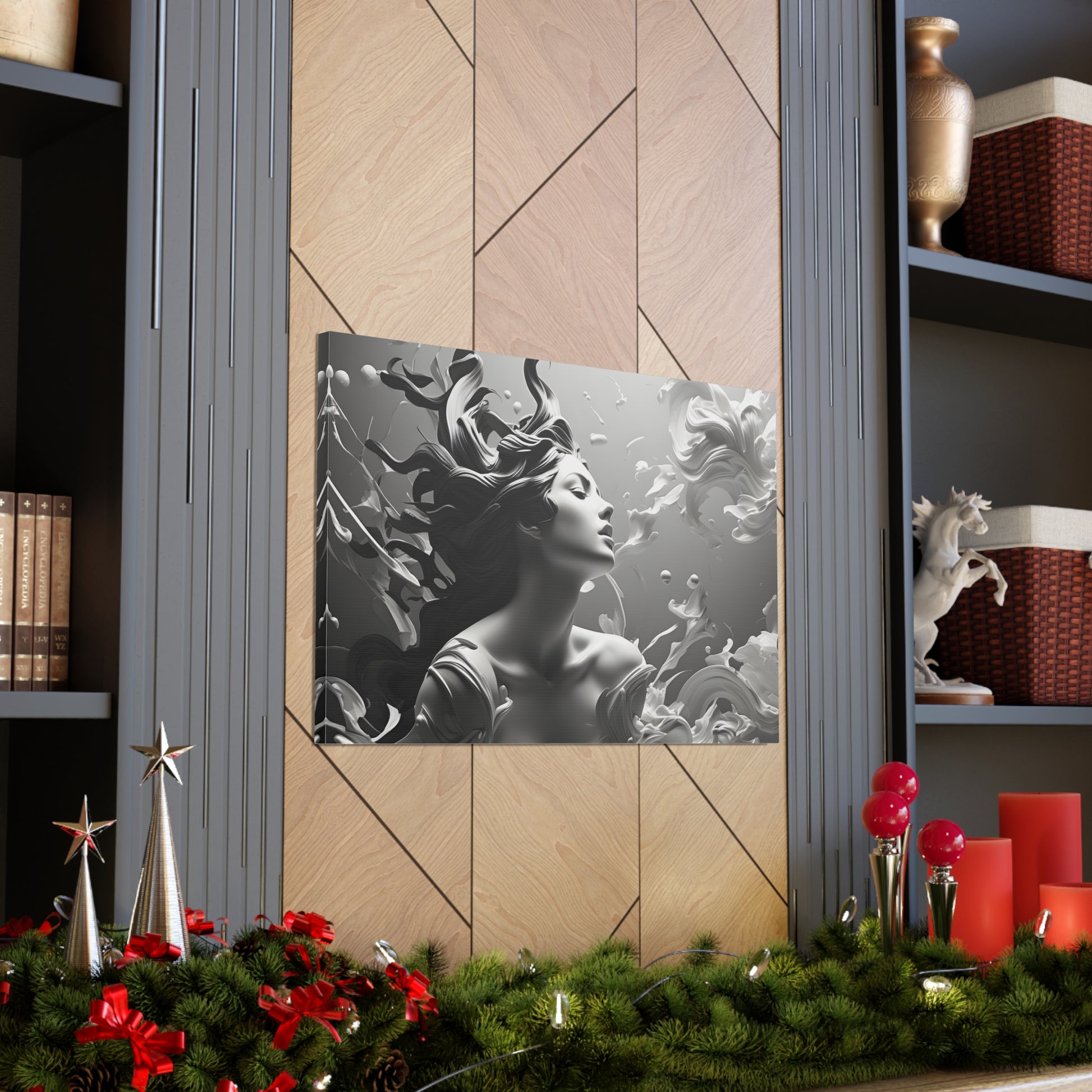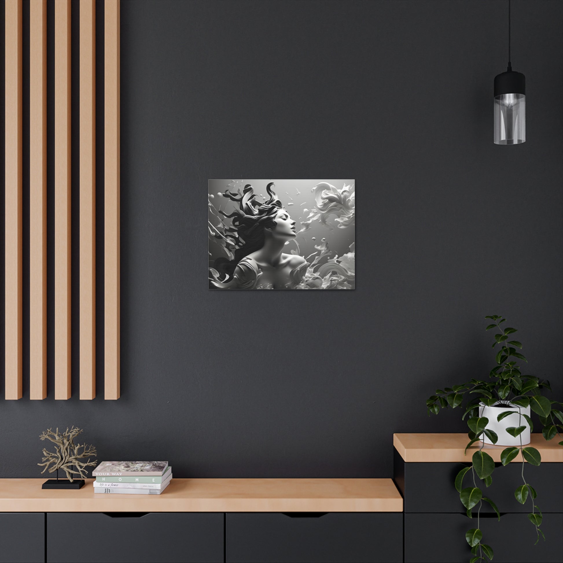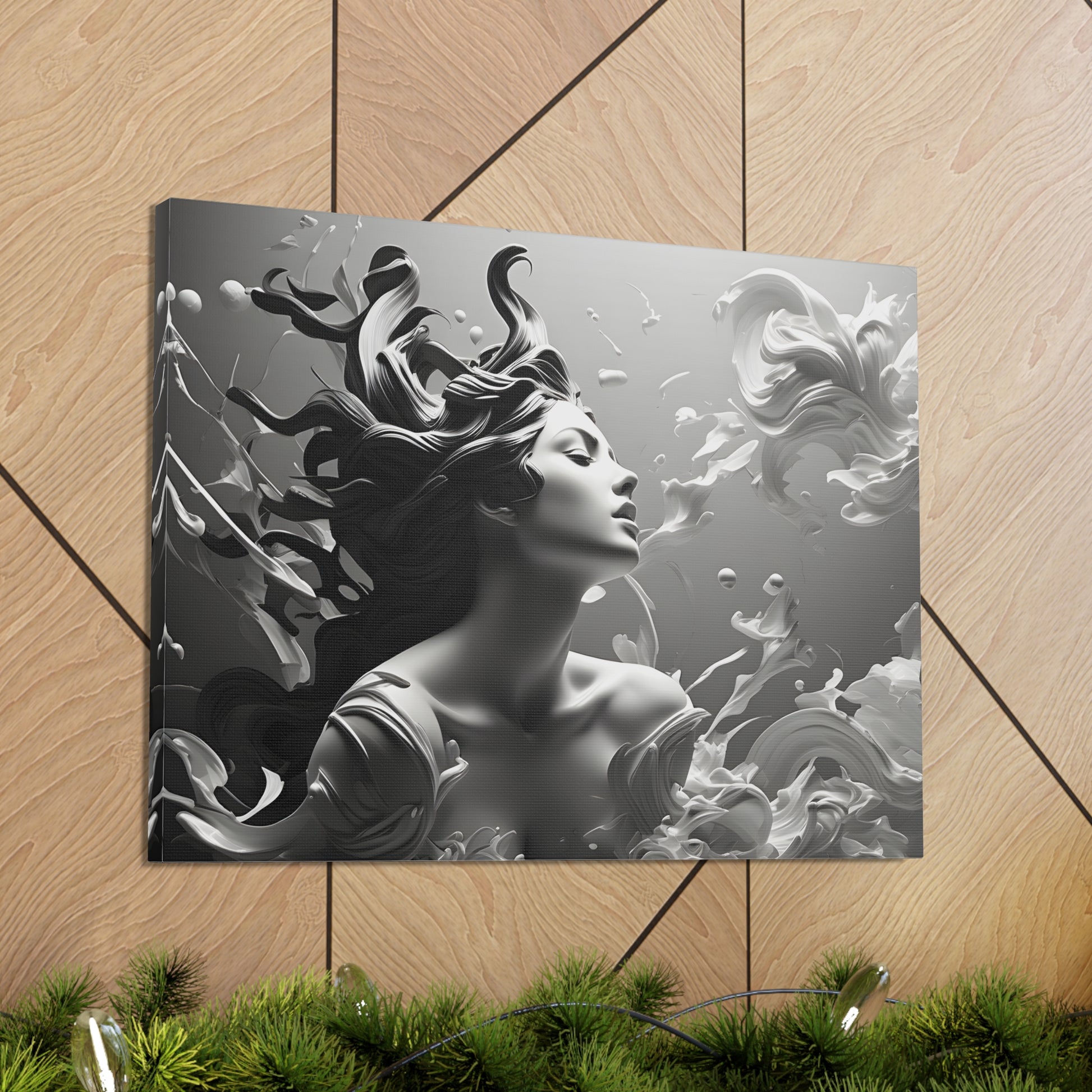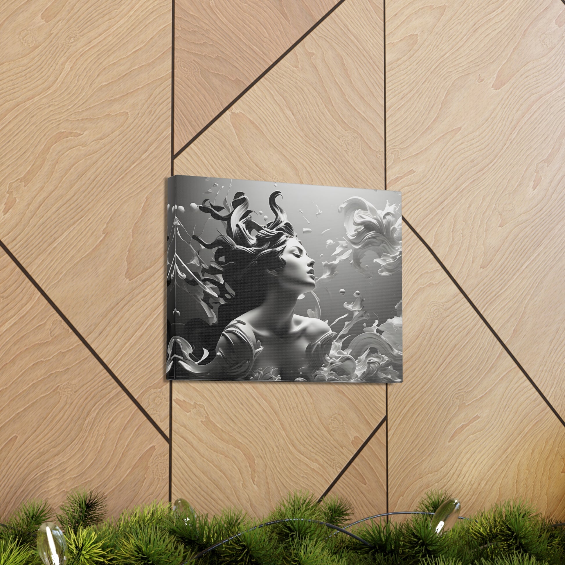 Immerse your space in ethereal beauty with "Flowing Grace," a mesmerizing black and white canvas artwork showcasing an elegant sculpture of a lady with gracefully flowing hair. This captivating piece captures the essence of poise and beauty, depicting the subtle movement and gracefulness of the sculpture.
