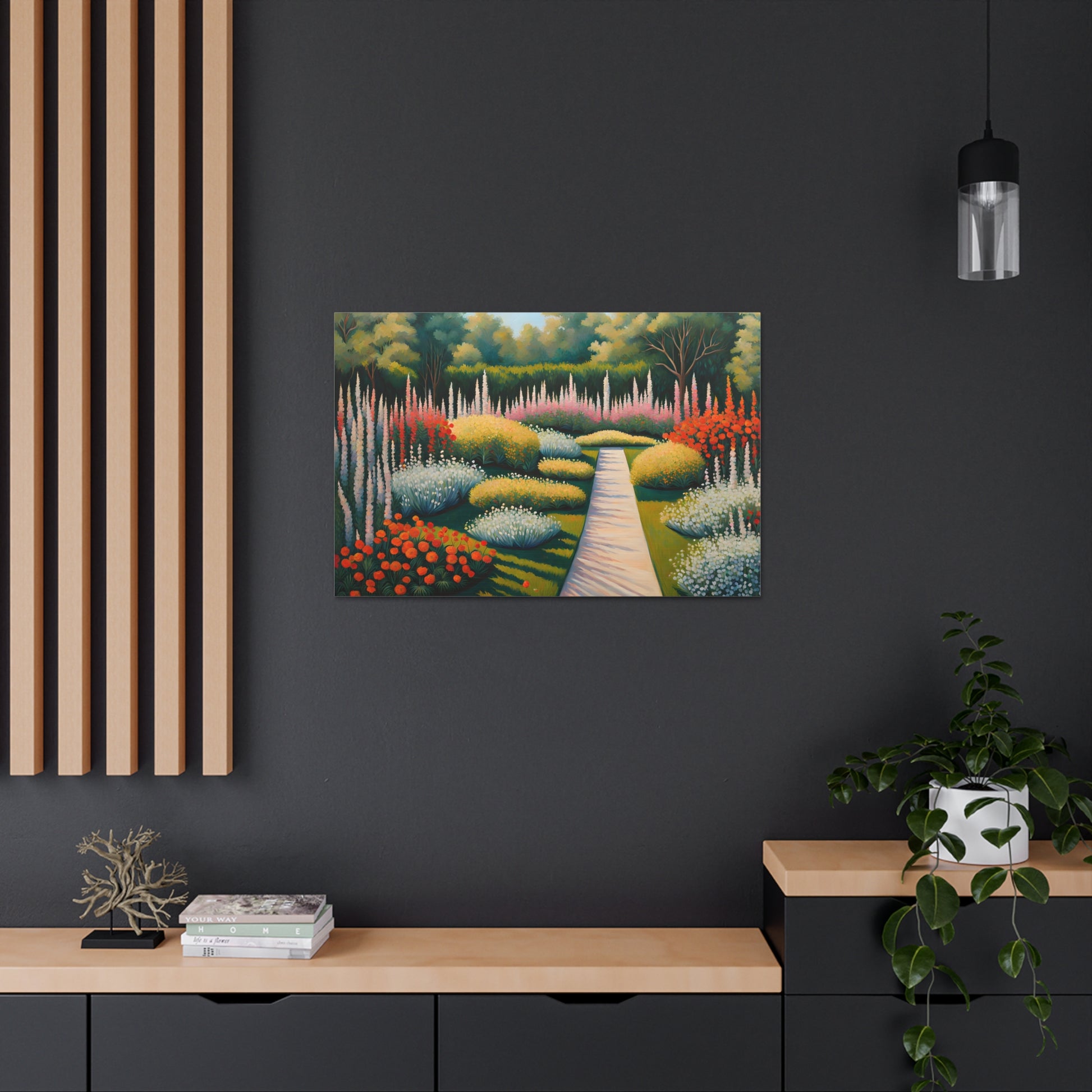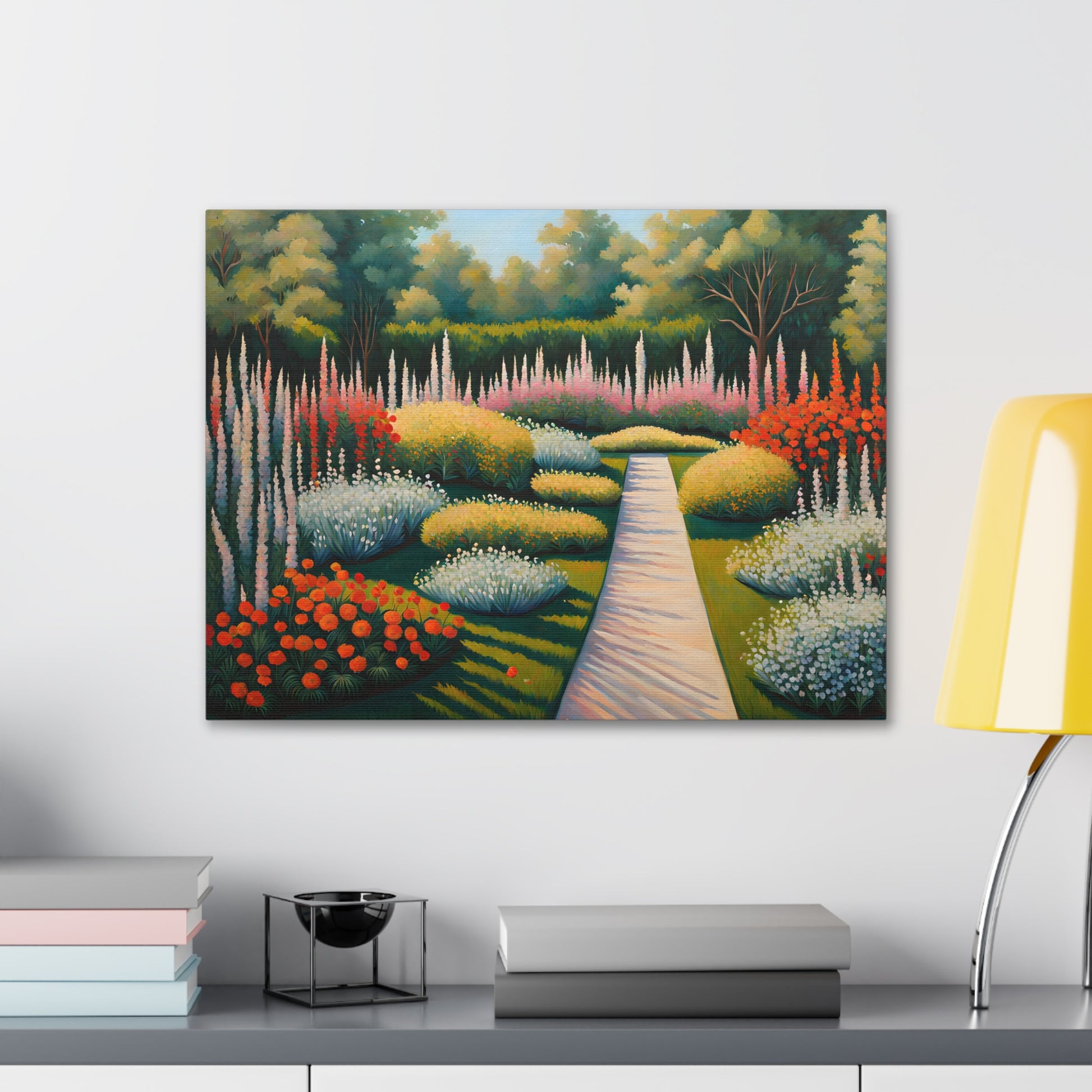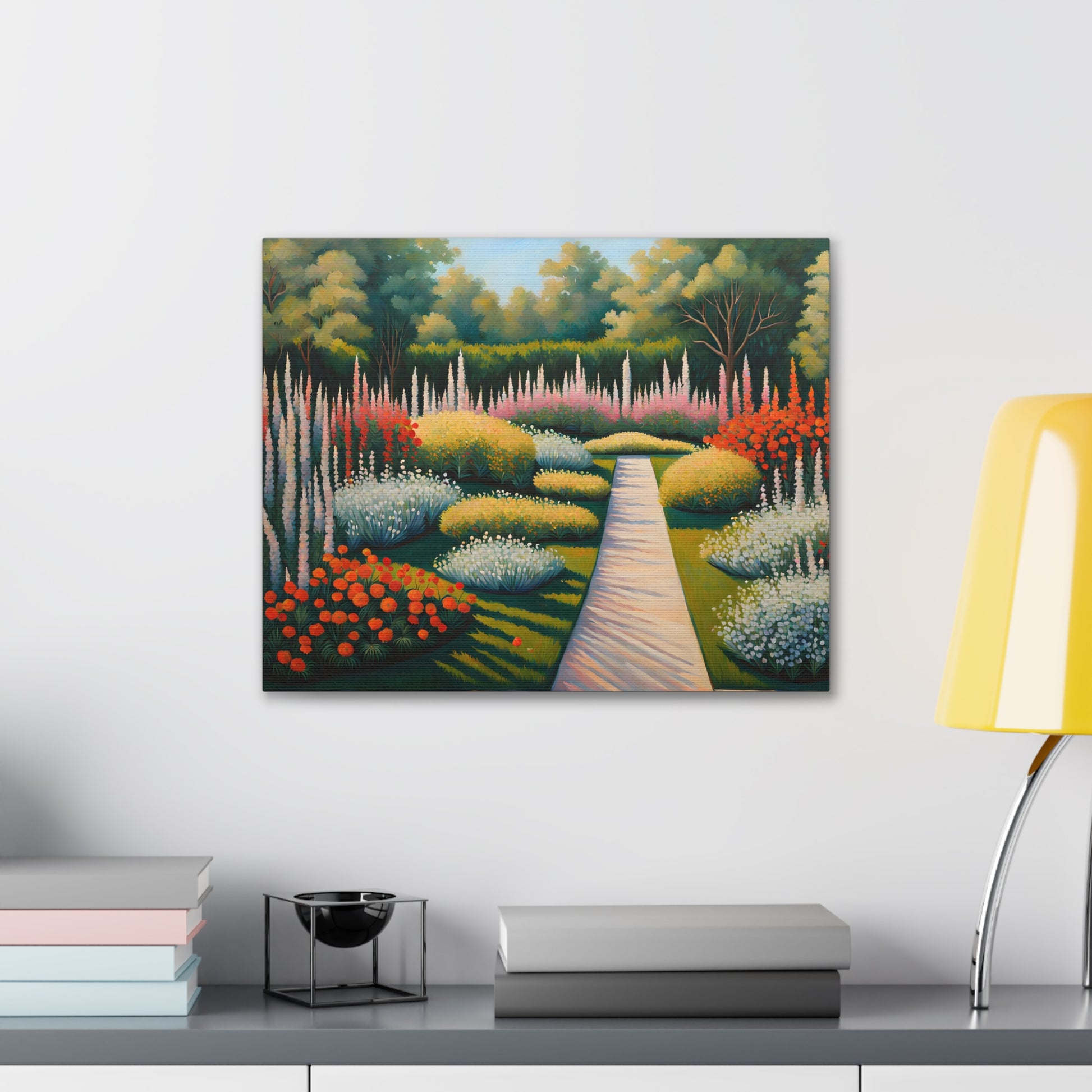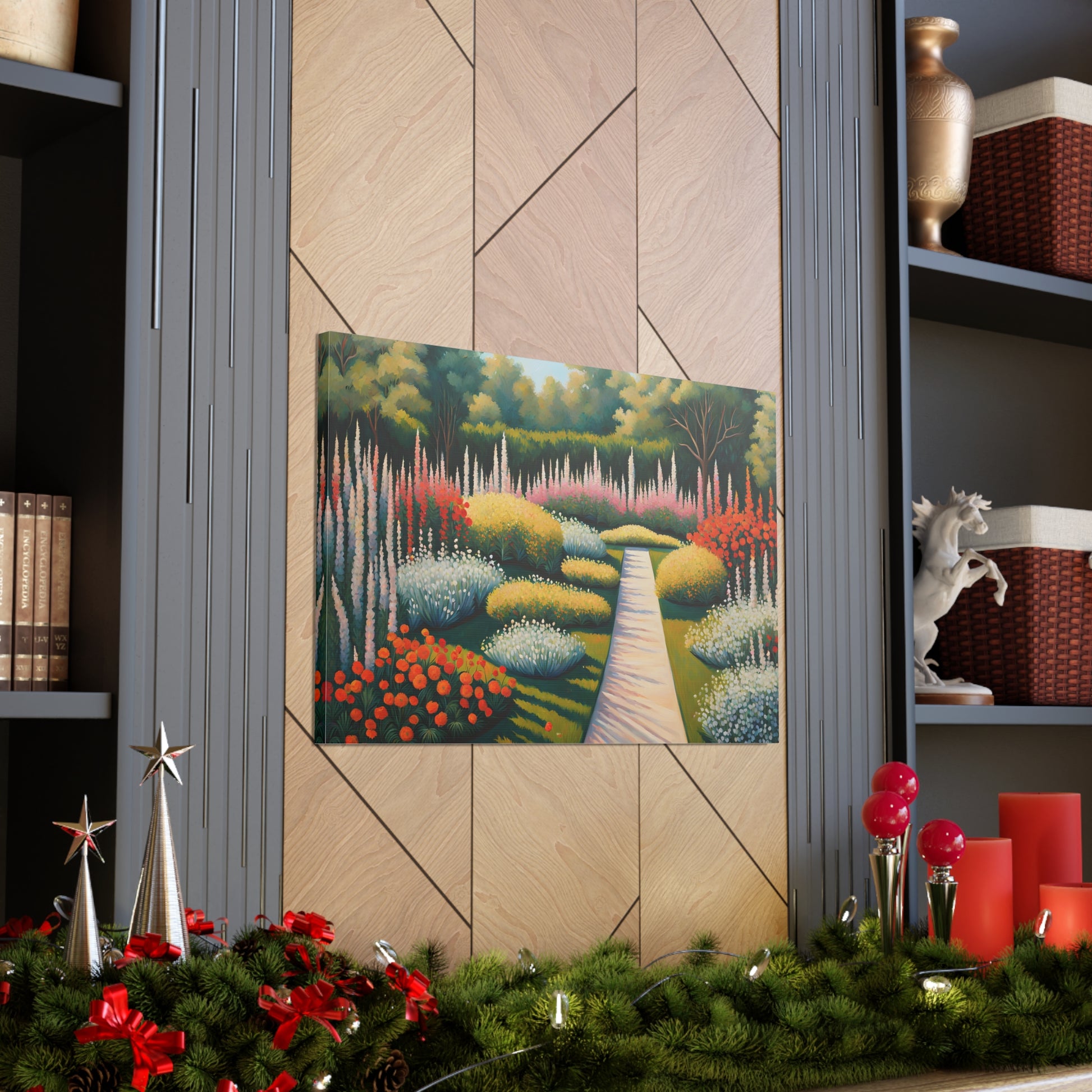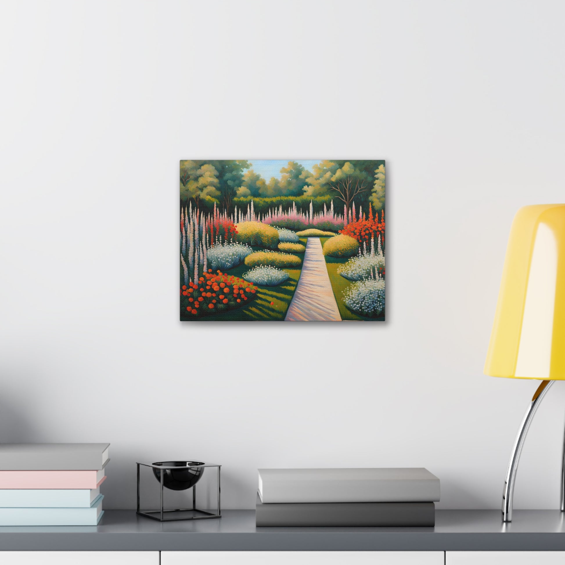 "Forest Pathway" leads you into a serene forest setting, with vibrant autumn colors bathing the trees and pathways in soft light. This piece adds an element of natural beauty and calm to any interior.