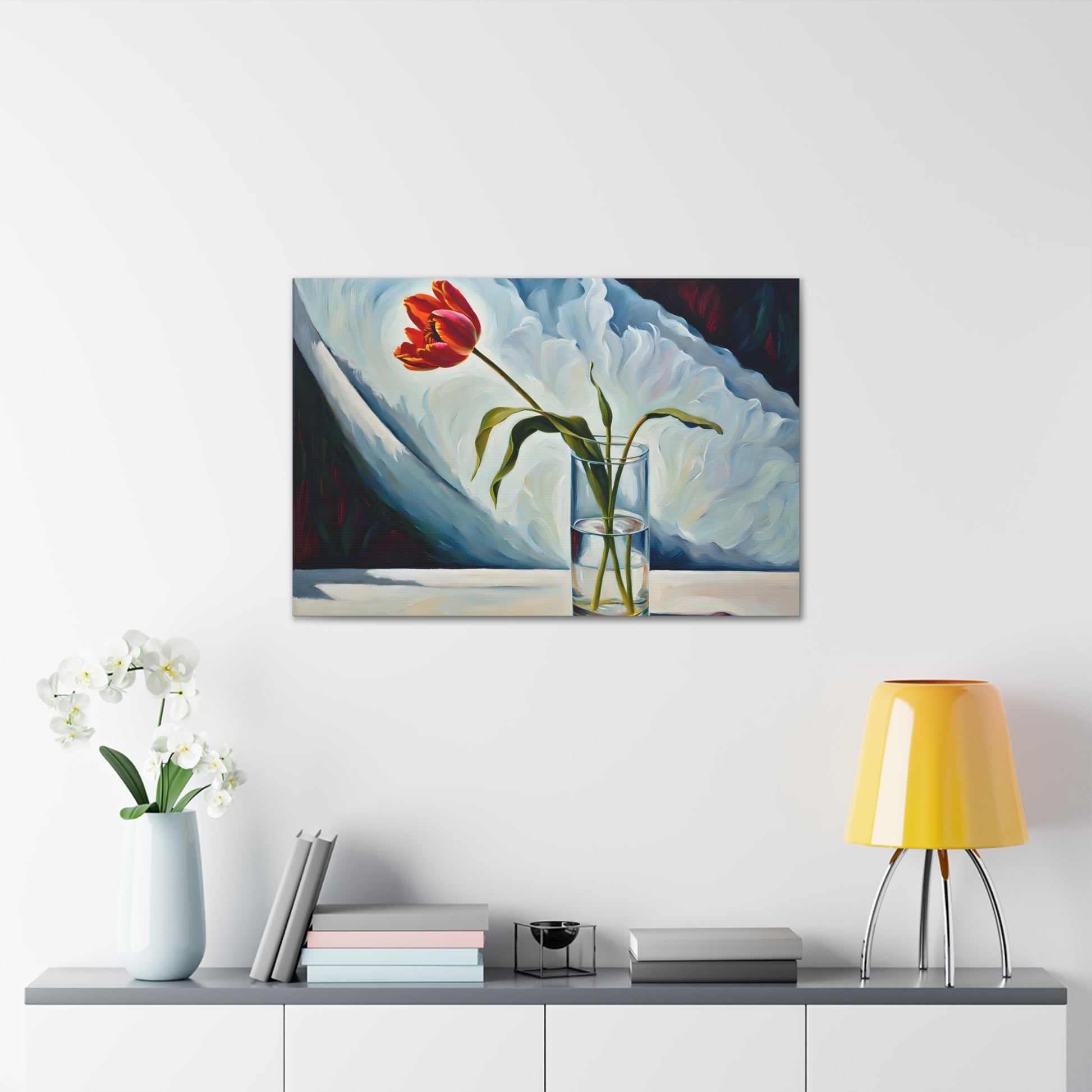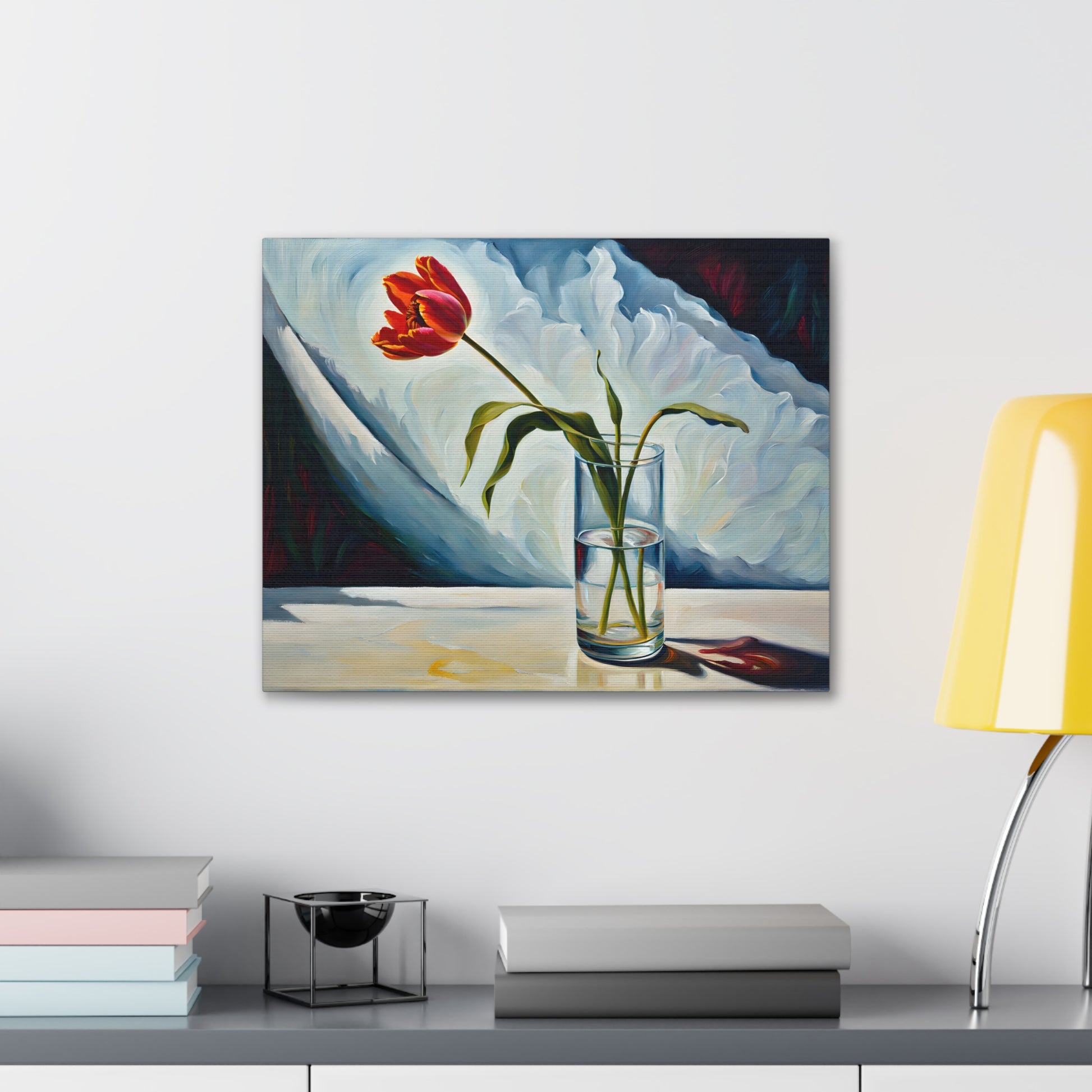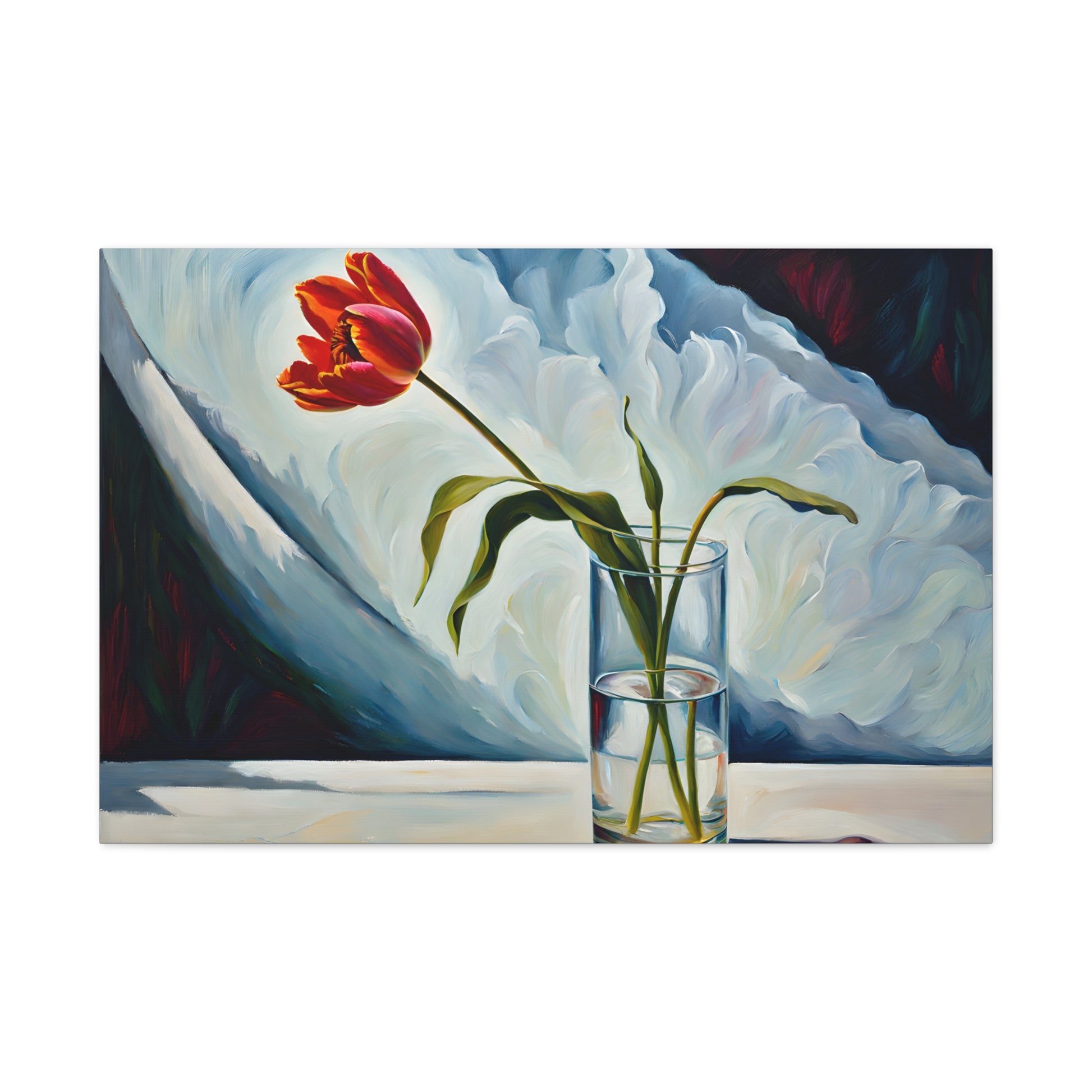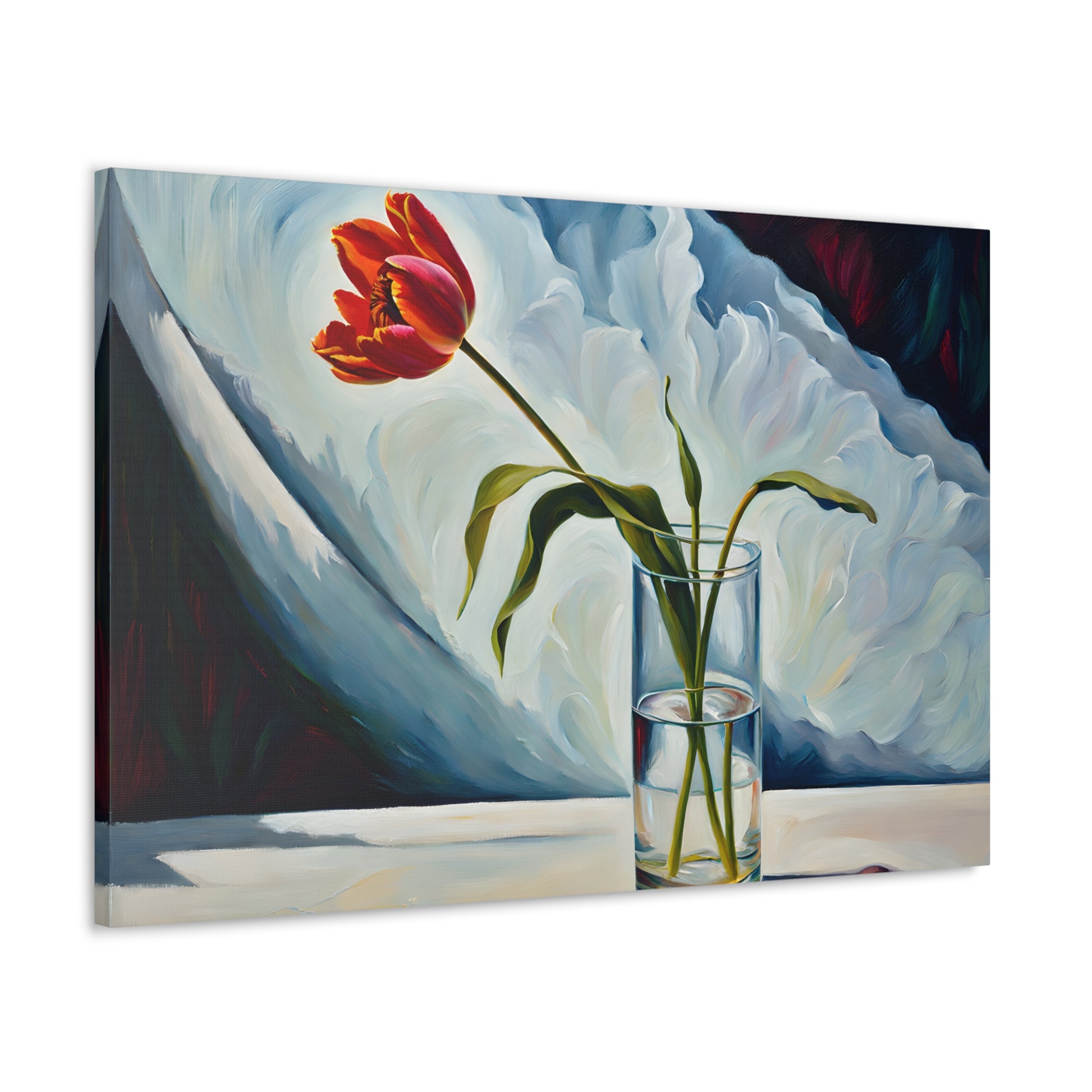 Elegantly simple, "Gauzy Flower" presents a delicate tulip in a glass, with soft, diffused light creating an ethereal effect. The painting’s minimalistic style adds sophistication and grace to any room.