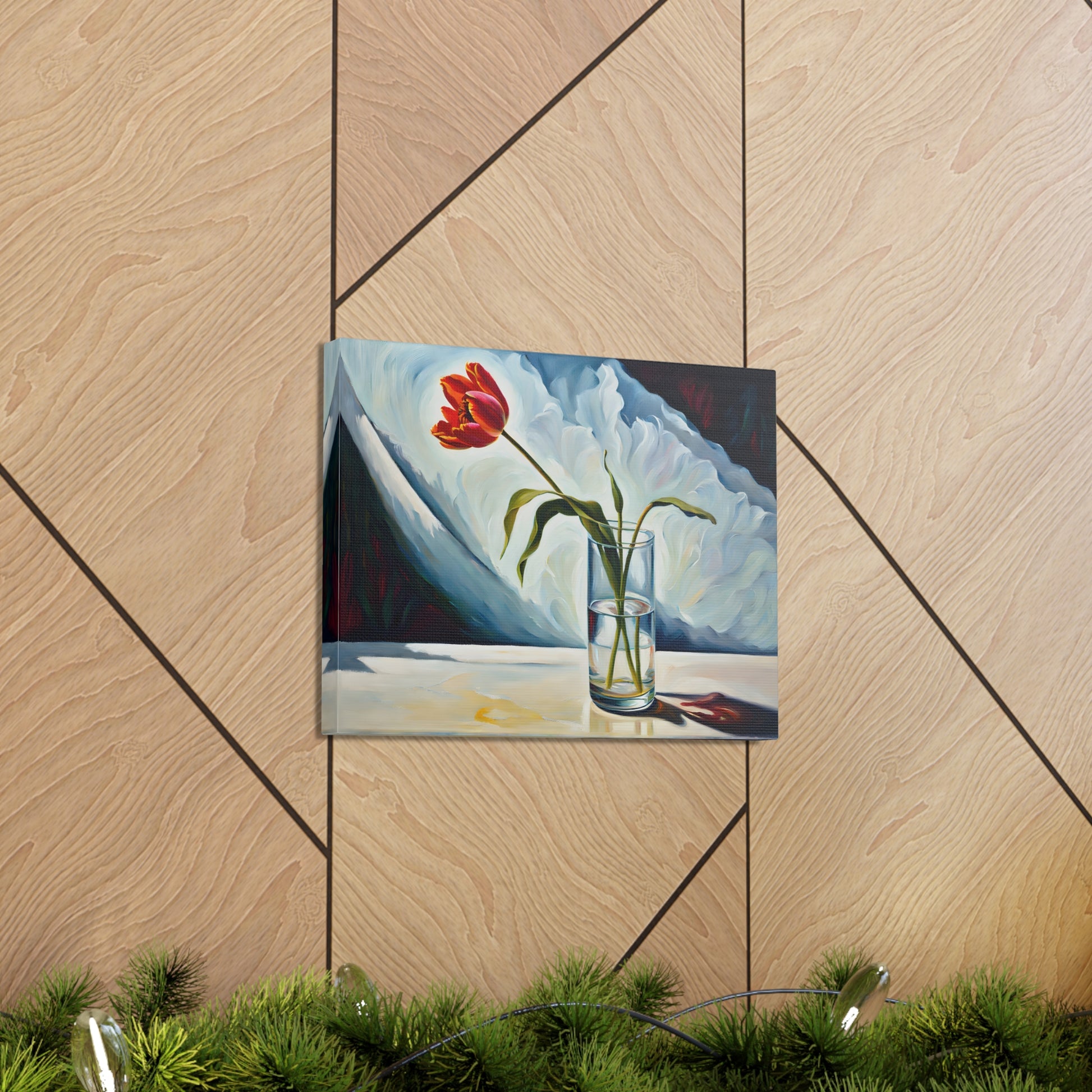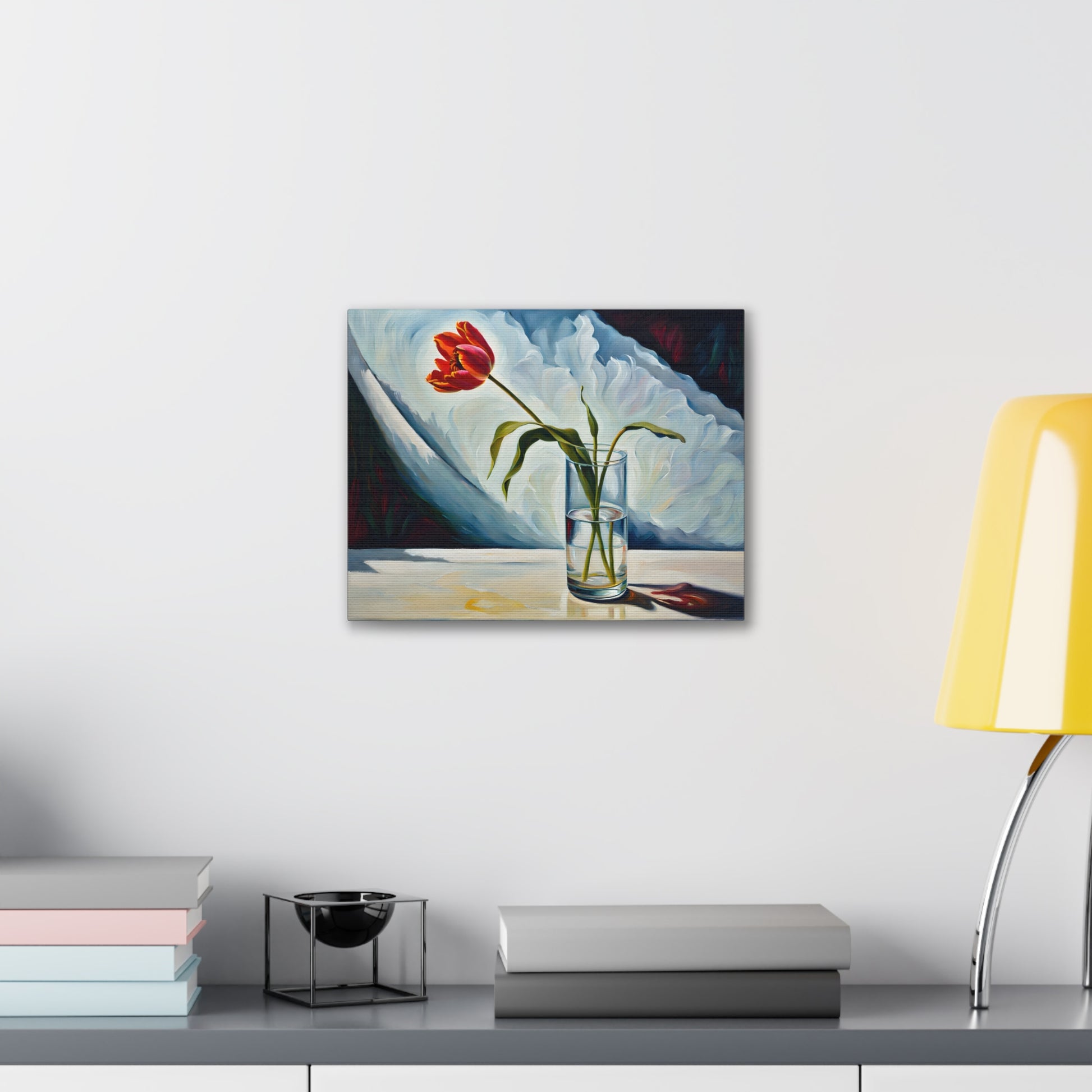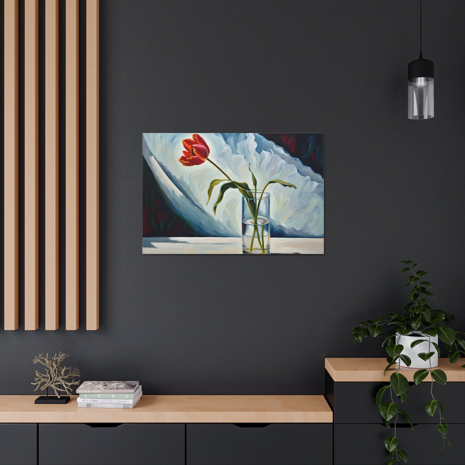 Elegantly simple, "Gauzy Flower" presents a delicate tulip in a glass, with soft, diffused light creating an ethereal effect. The painting’s minimalistic style adds sophistication and grace to any room.