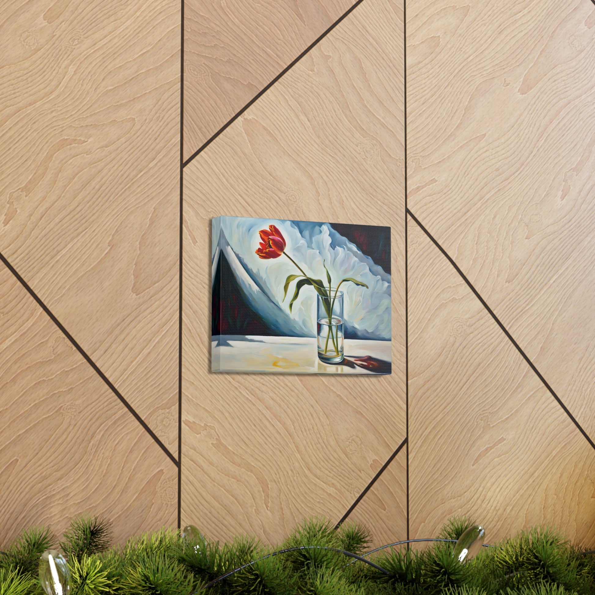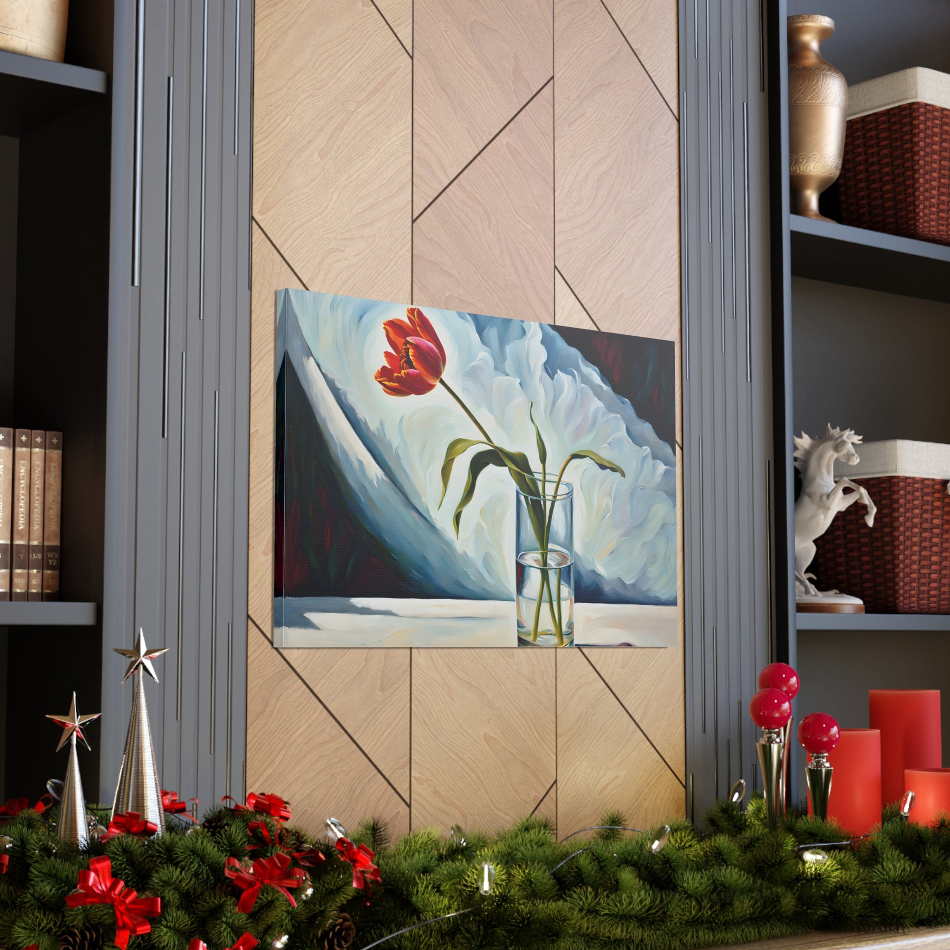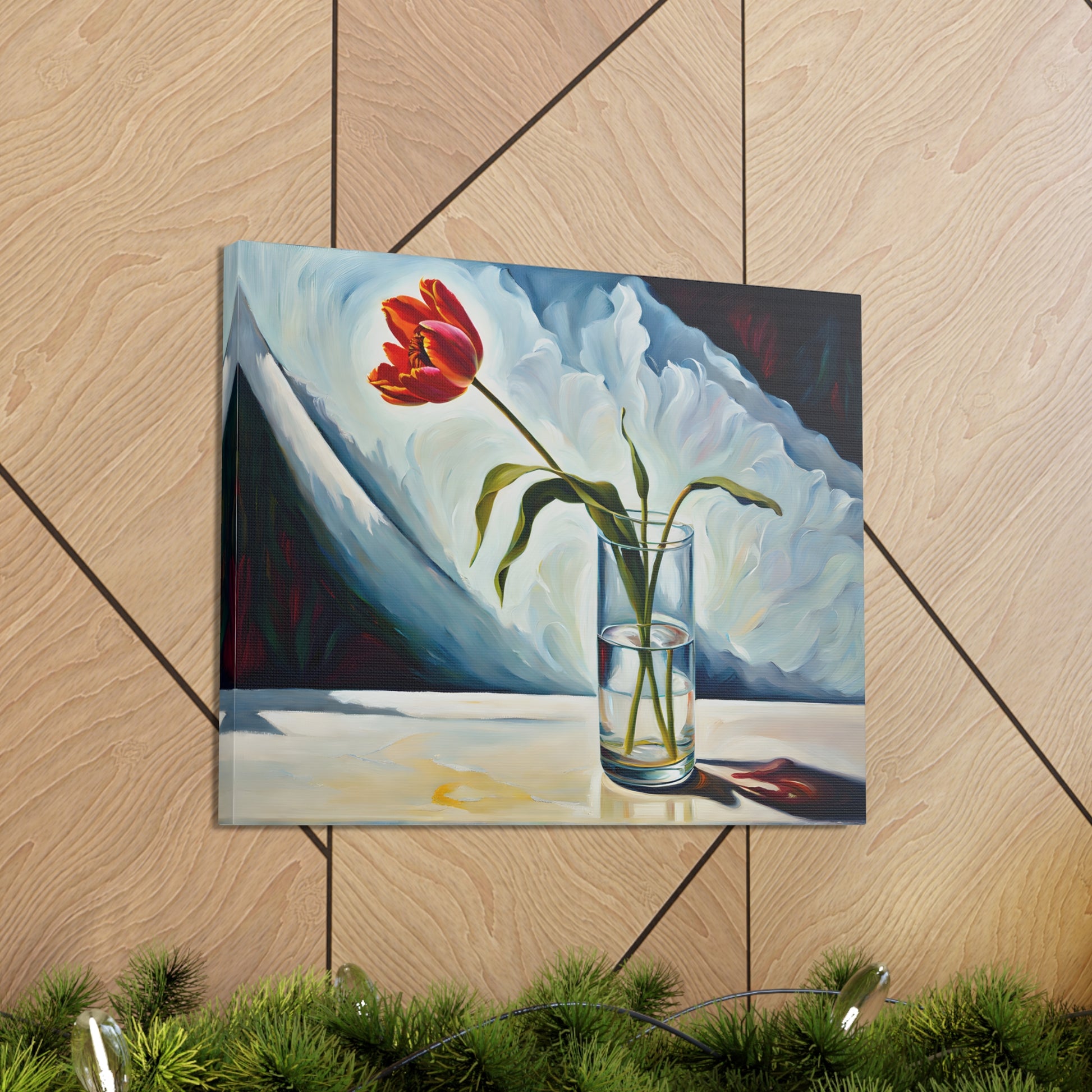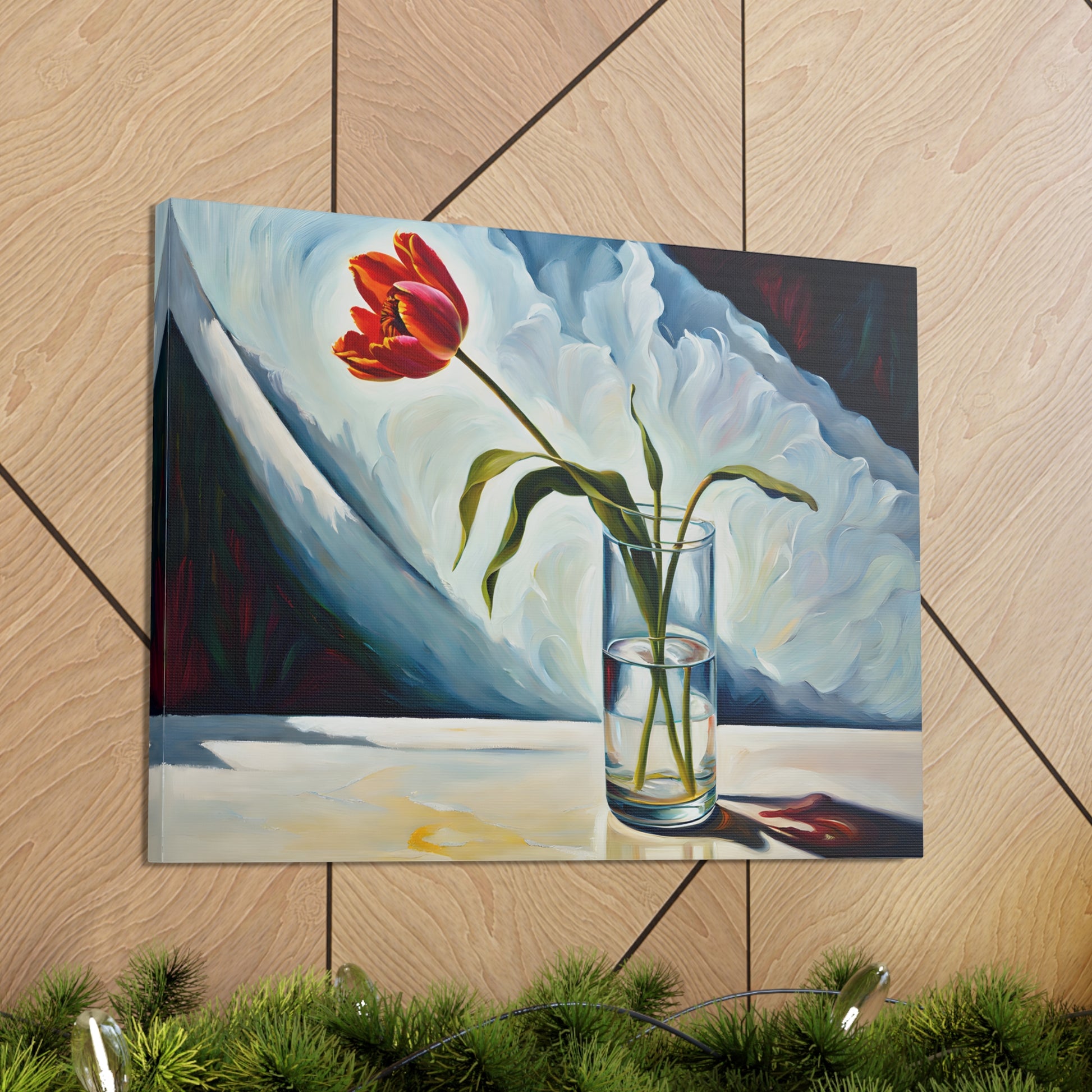 Elegantly simple, "Gauzy Flower" presents a delicate tulip in a glass, with soft, diffused light creating an ethereal effect. The painting’s minimalistic style adds sophistication and grace to any room.