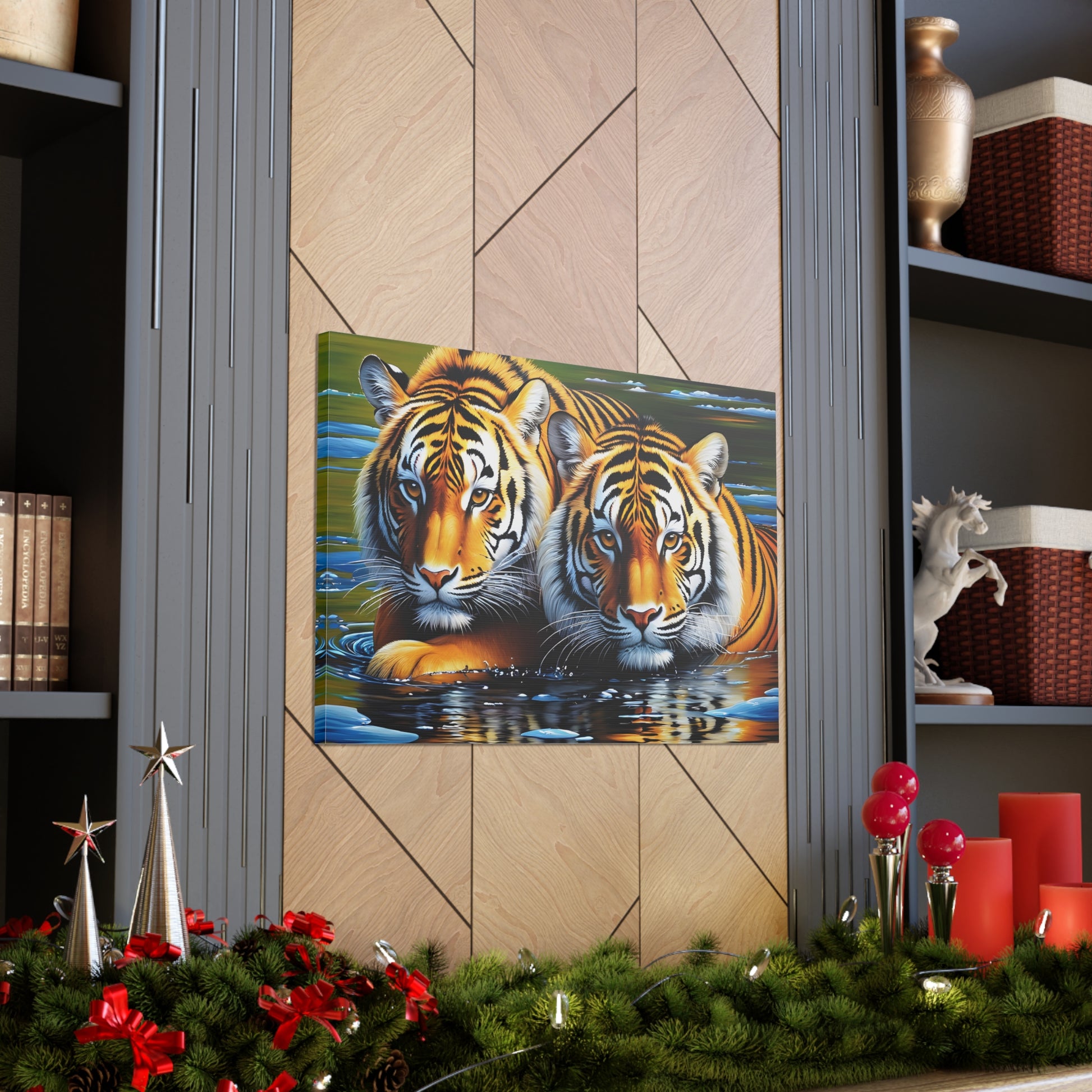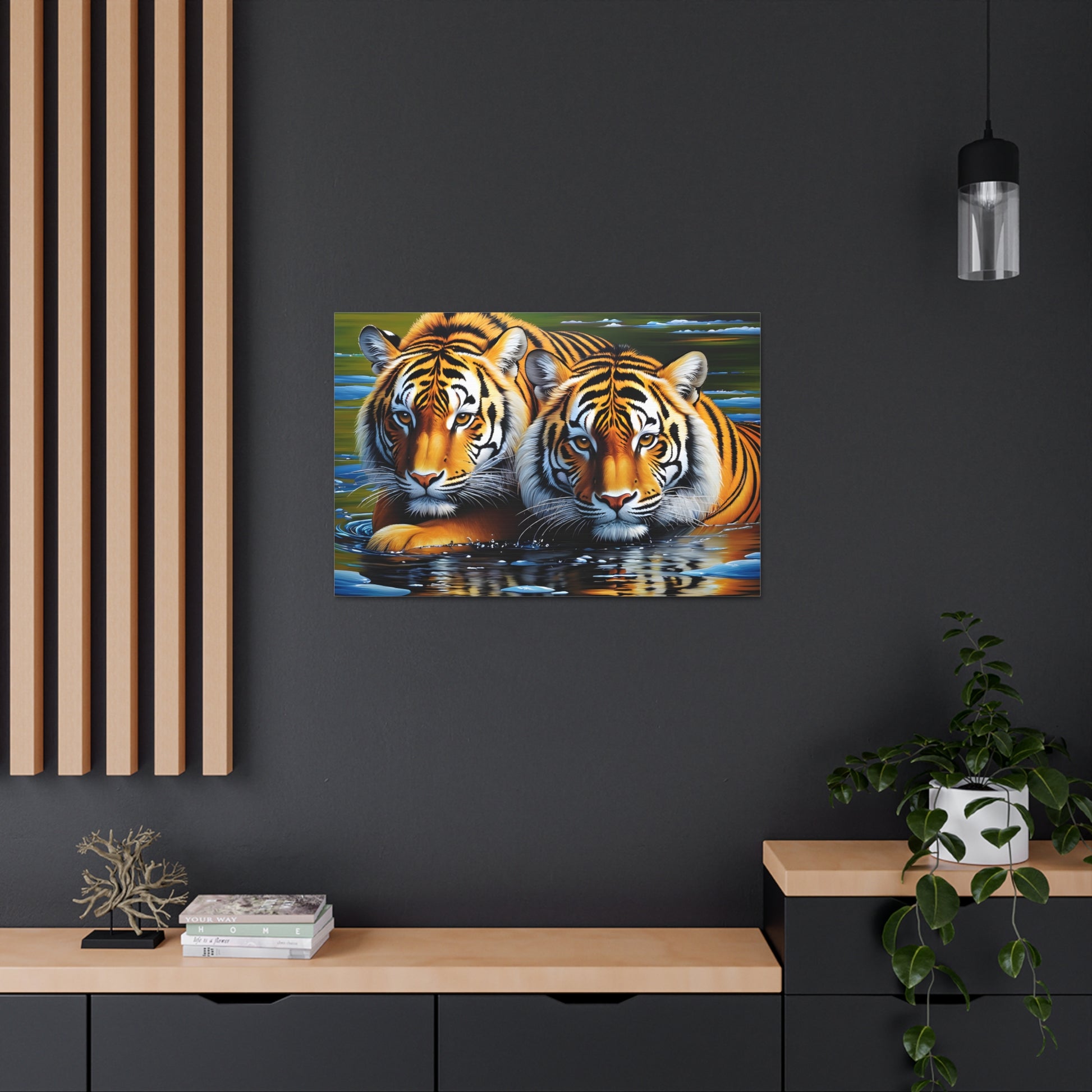 Embark on a wild journey with "Golden Stripes" This striking canvas art piece captures the majestic allure of the tiger, showcasing its golden stripes in a mesmerizing composition that brings the untamed beauty of nature into your space.