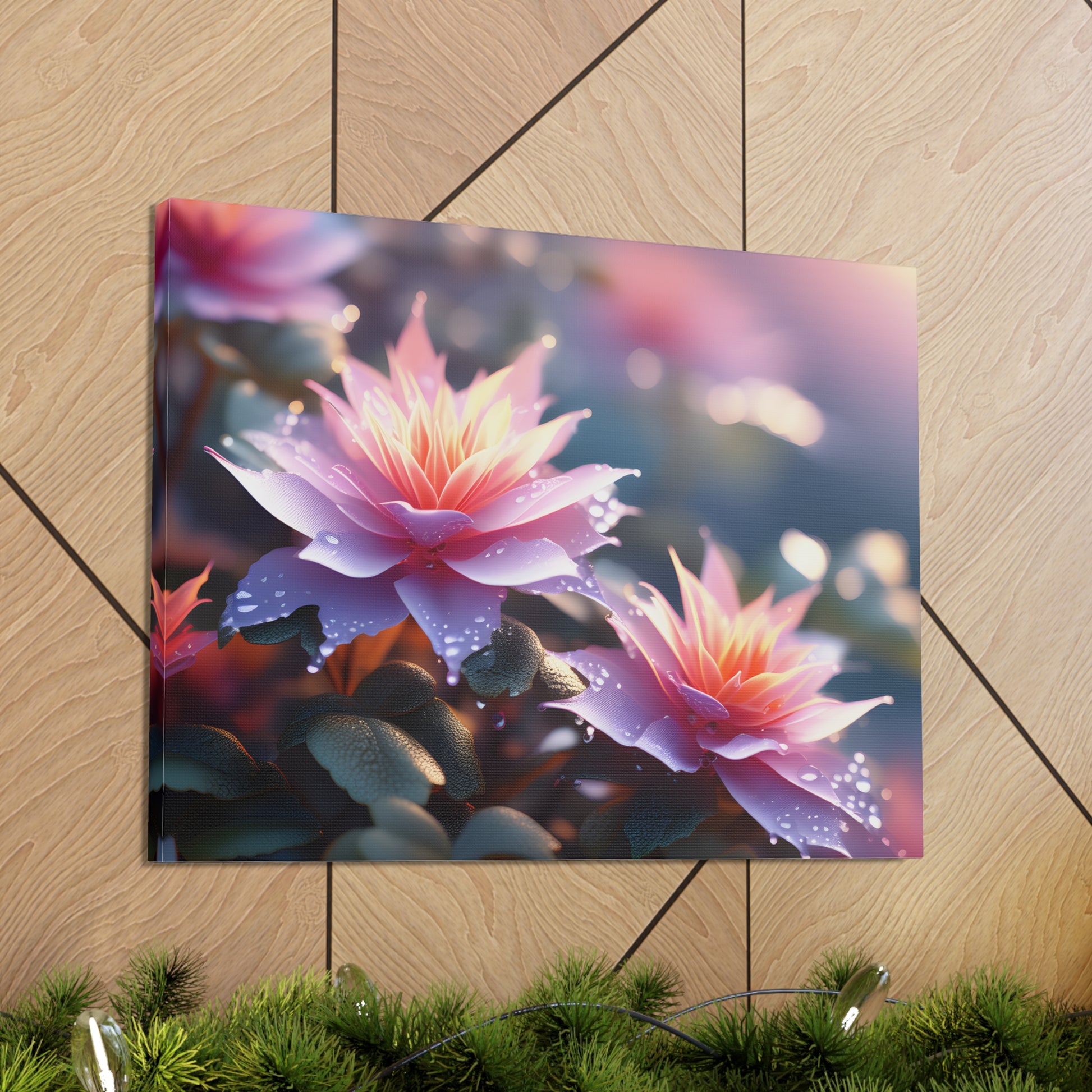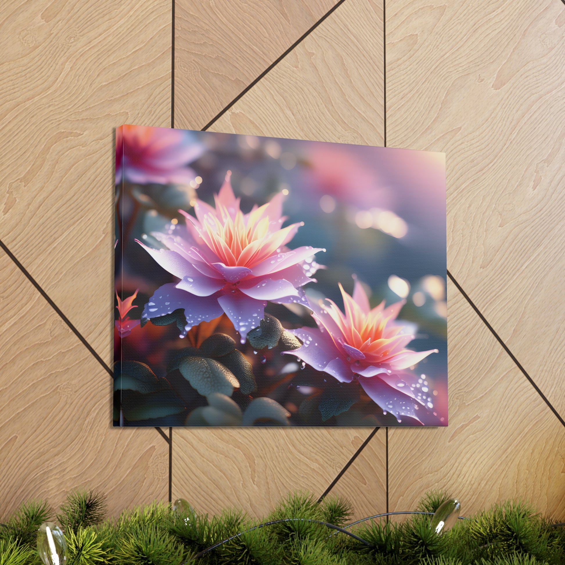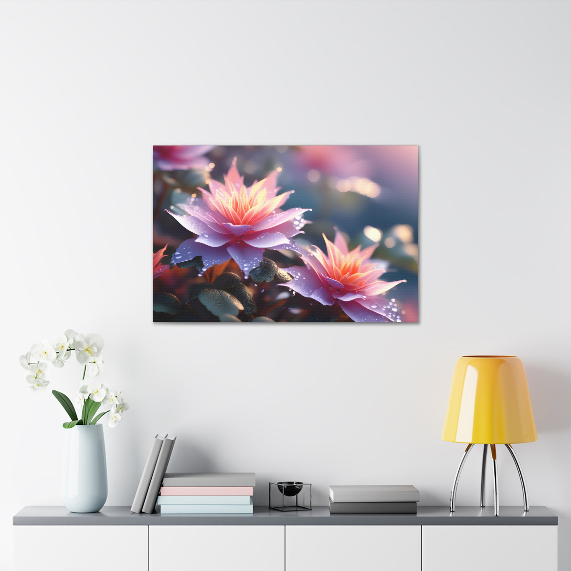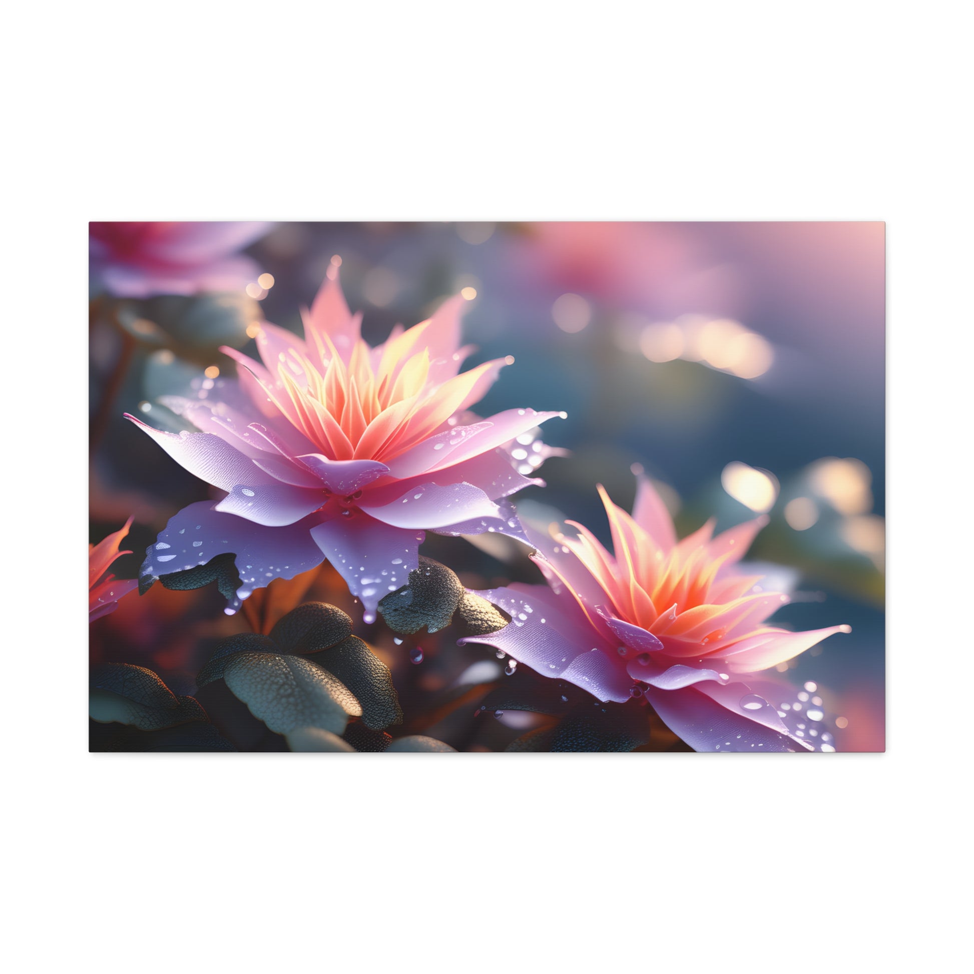 Illuminate your space with the mesmerizing charm of nature's beauty through "Lavender Glow," a captivating canvas artwork showcasing vibrant flowers boasting exquisite lavender petals with radiant orange centers, adorned by delicate rain droplets.