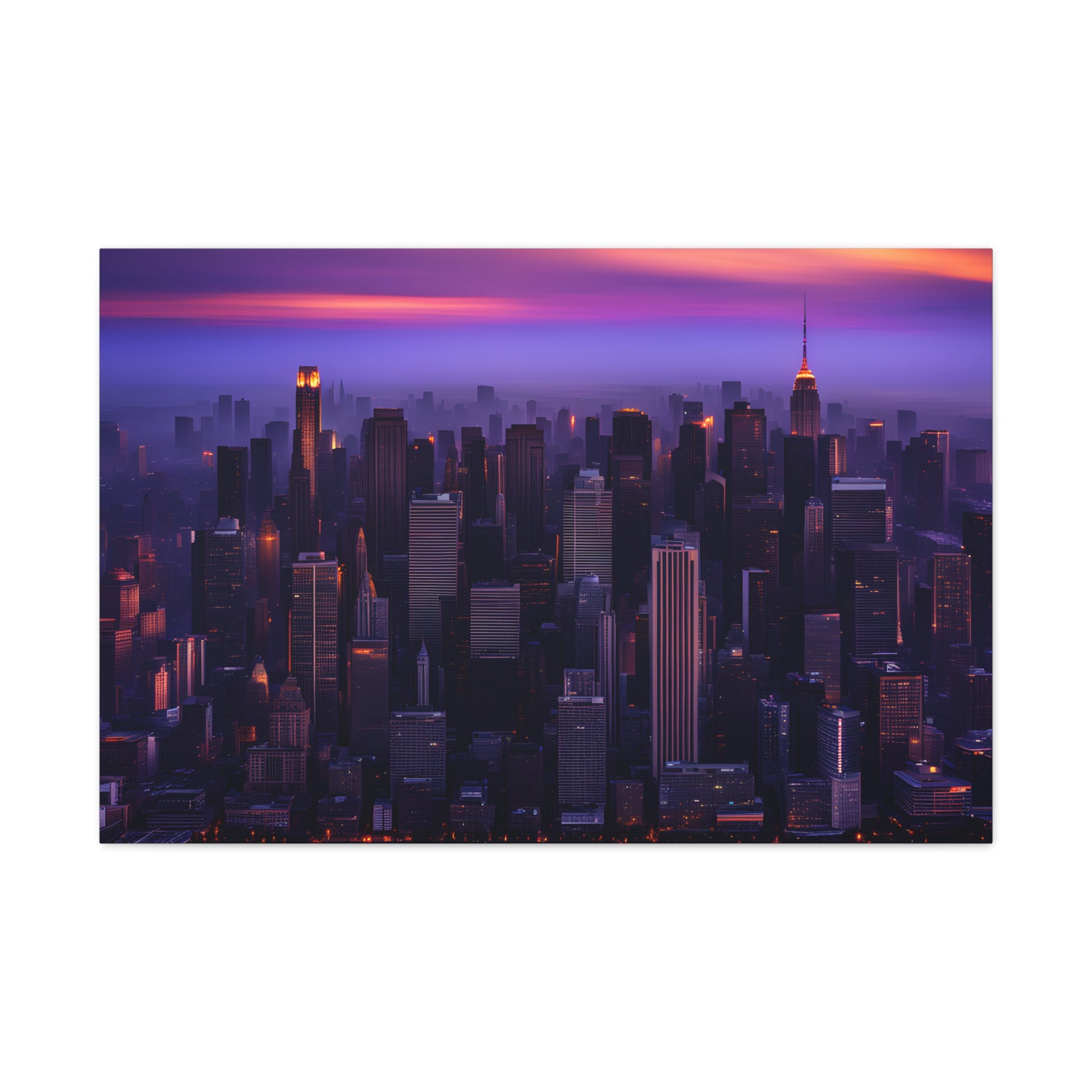 Indulge in the captivating allure of "Metropolis Twilight." This stunning canvas art piece encapsulates the essence of a city bathed in the enchanting hues of twilight. Watch as skyscrapers silhouette against the sky, with city lights beginning to shimmer and cast a mesmerizing glow.