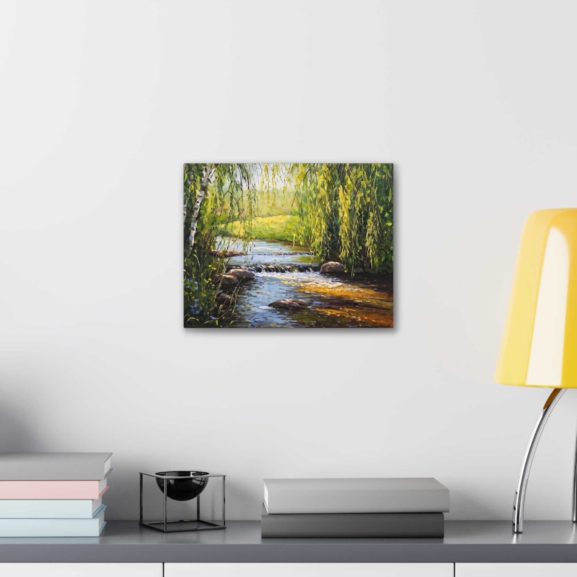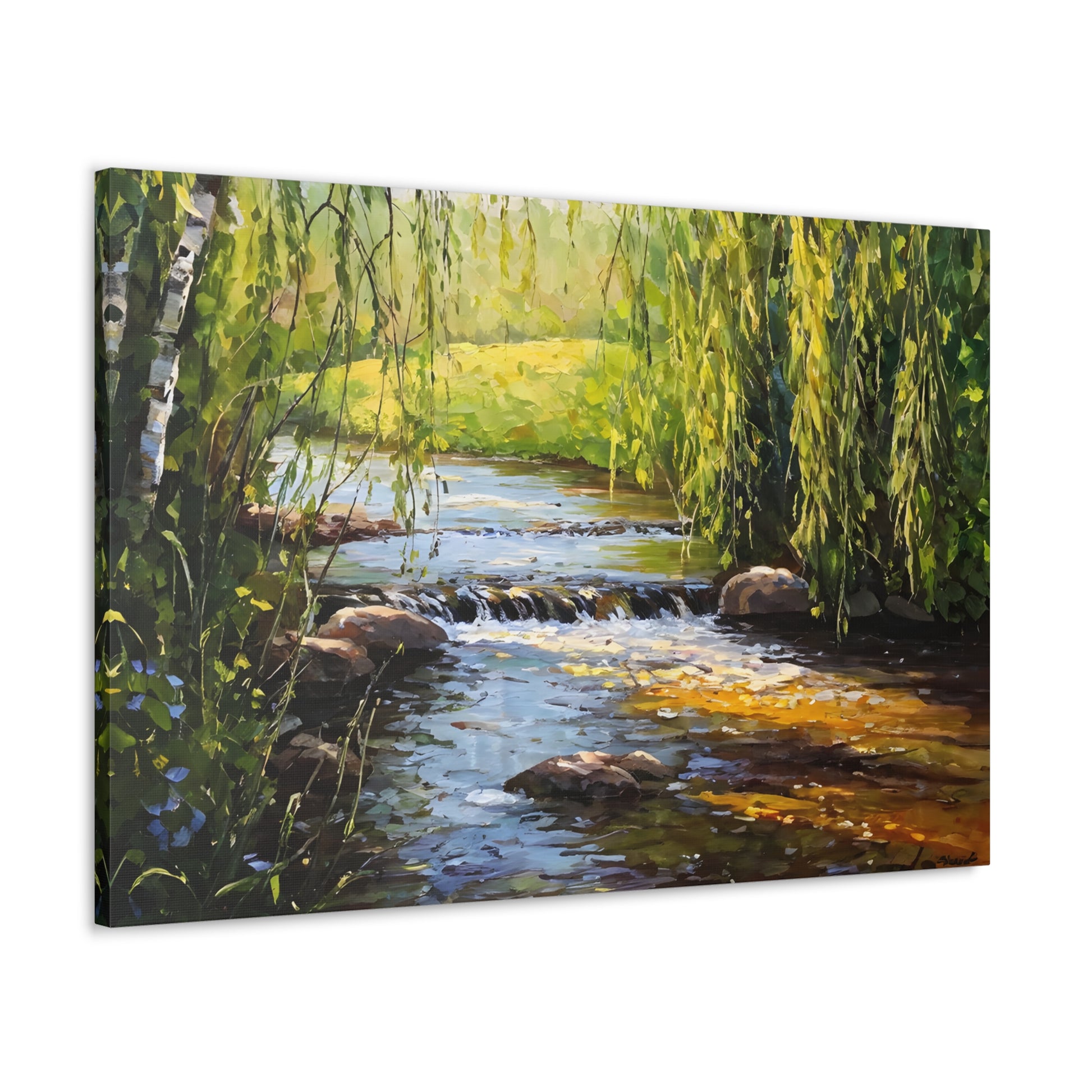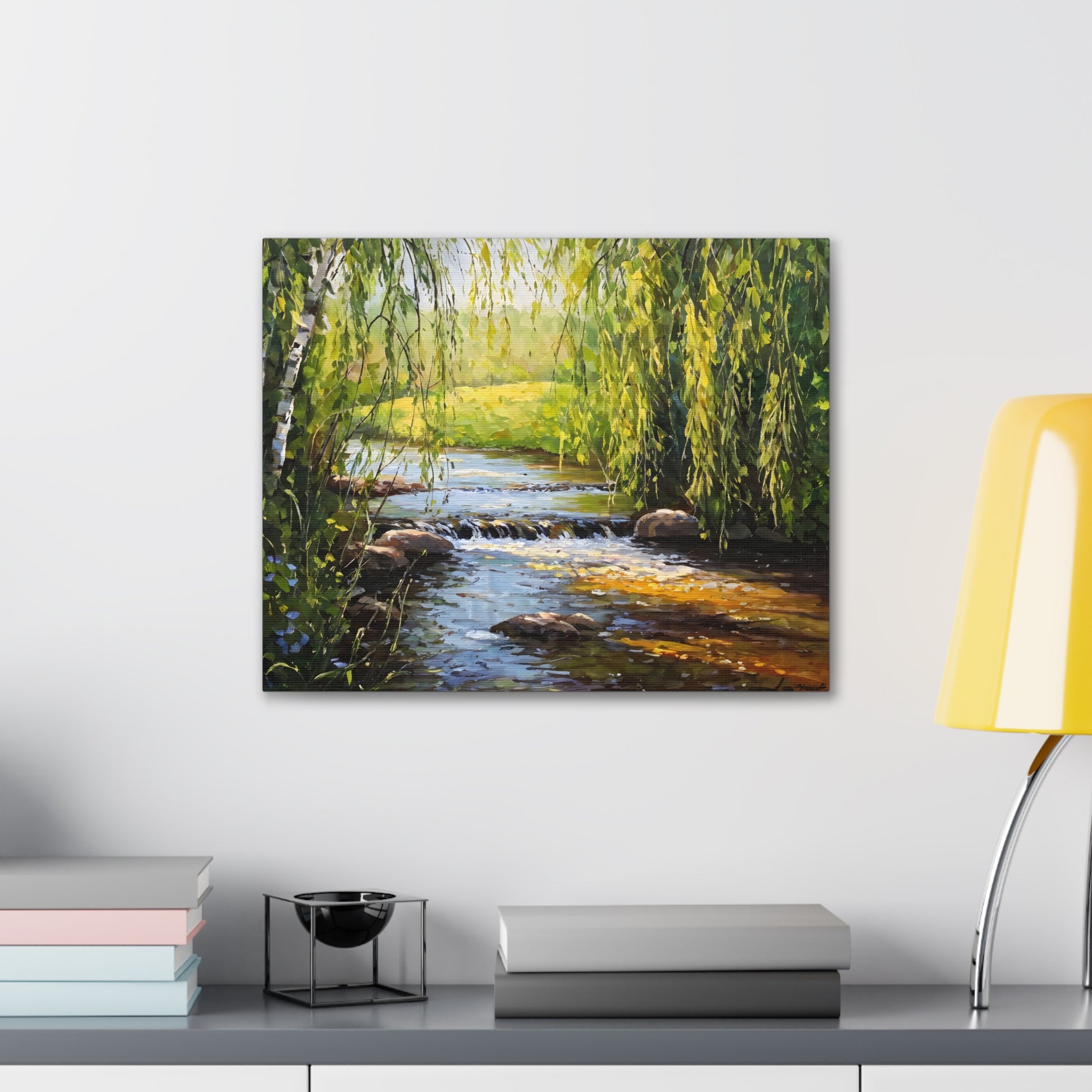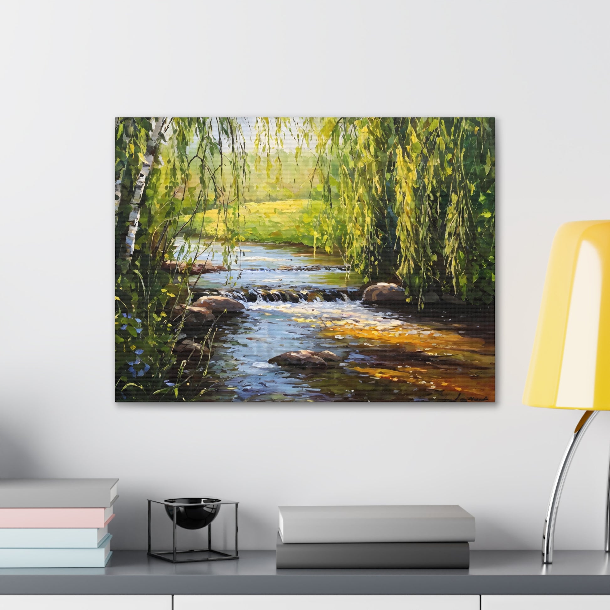 "Mossy Rocks" offers a glimpse into a peaceful forest stream, where moss-covered rocks sit quietly by flowing waters. This oil painting, created on cotton canvas, brings the serenity of nature to your home.