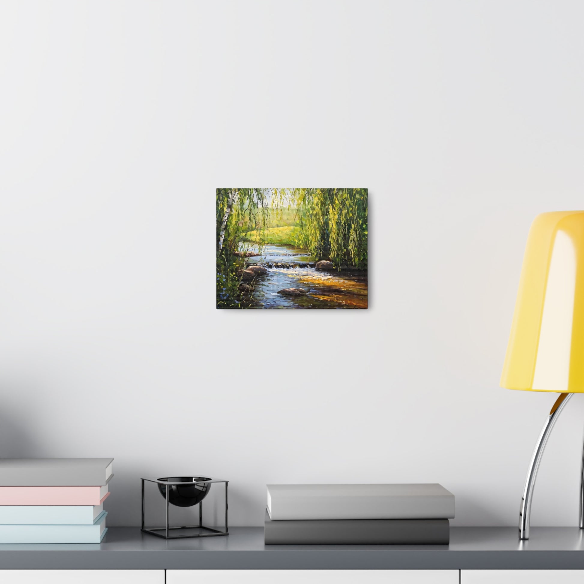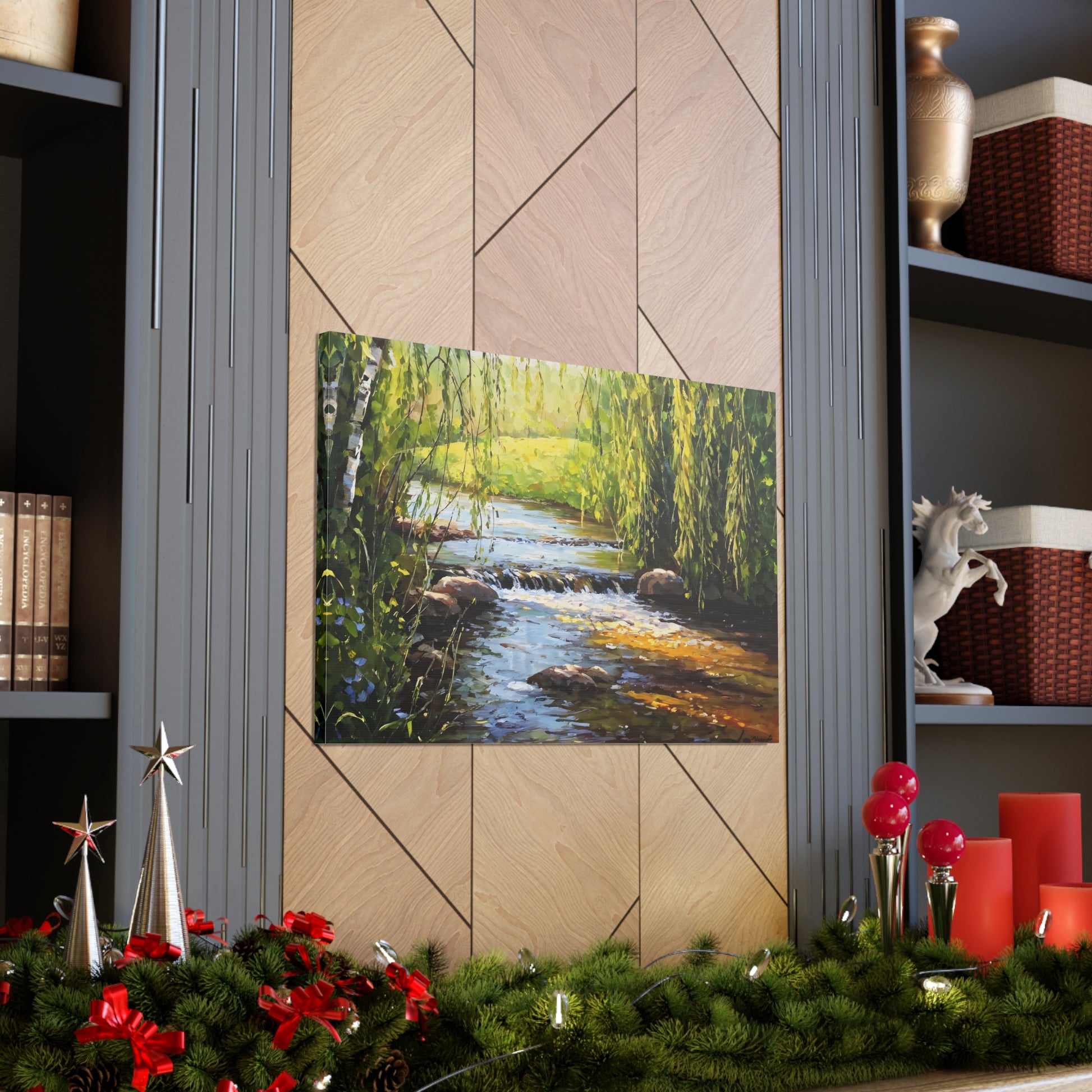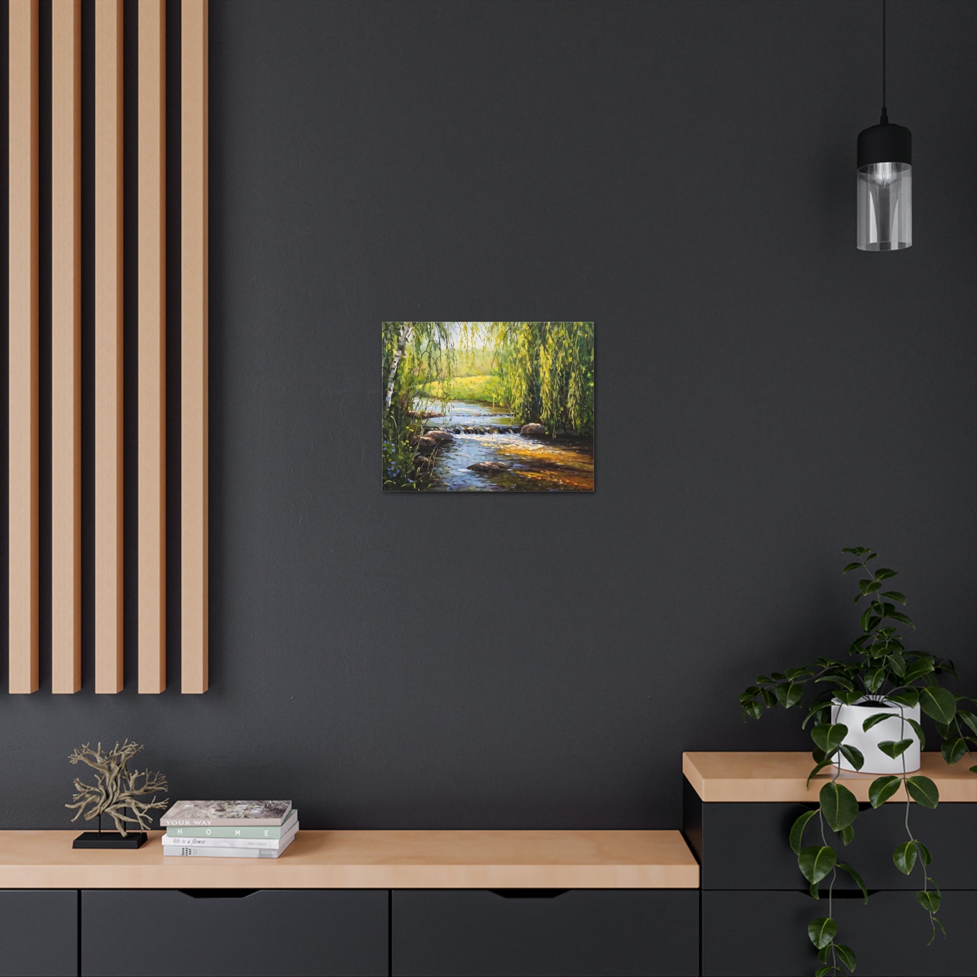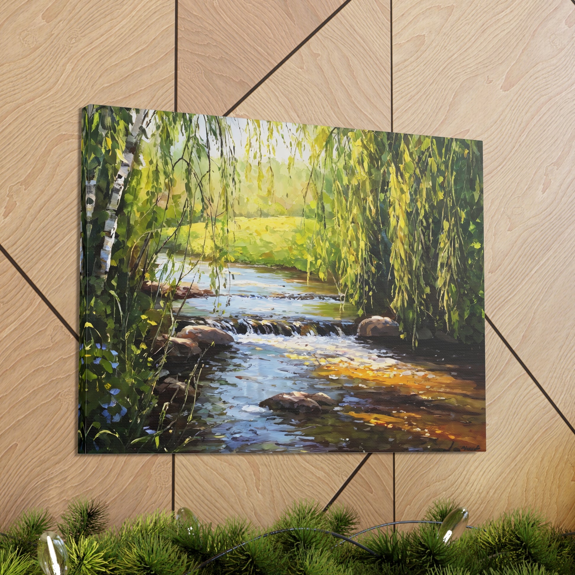 "Mossy Rocks" offers a glimpse into a peaceful forest stream, where moss-covered rocks sit quietly by flowing waters. This oil painting, created on cotton canvas, brings the serenity of nature to your home.