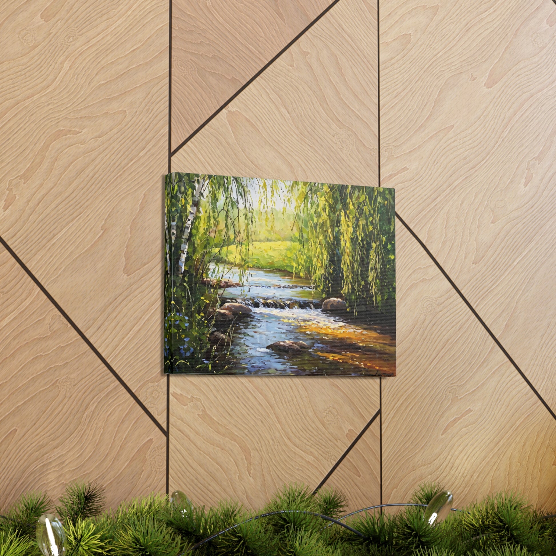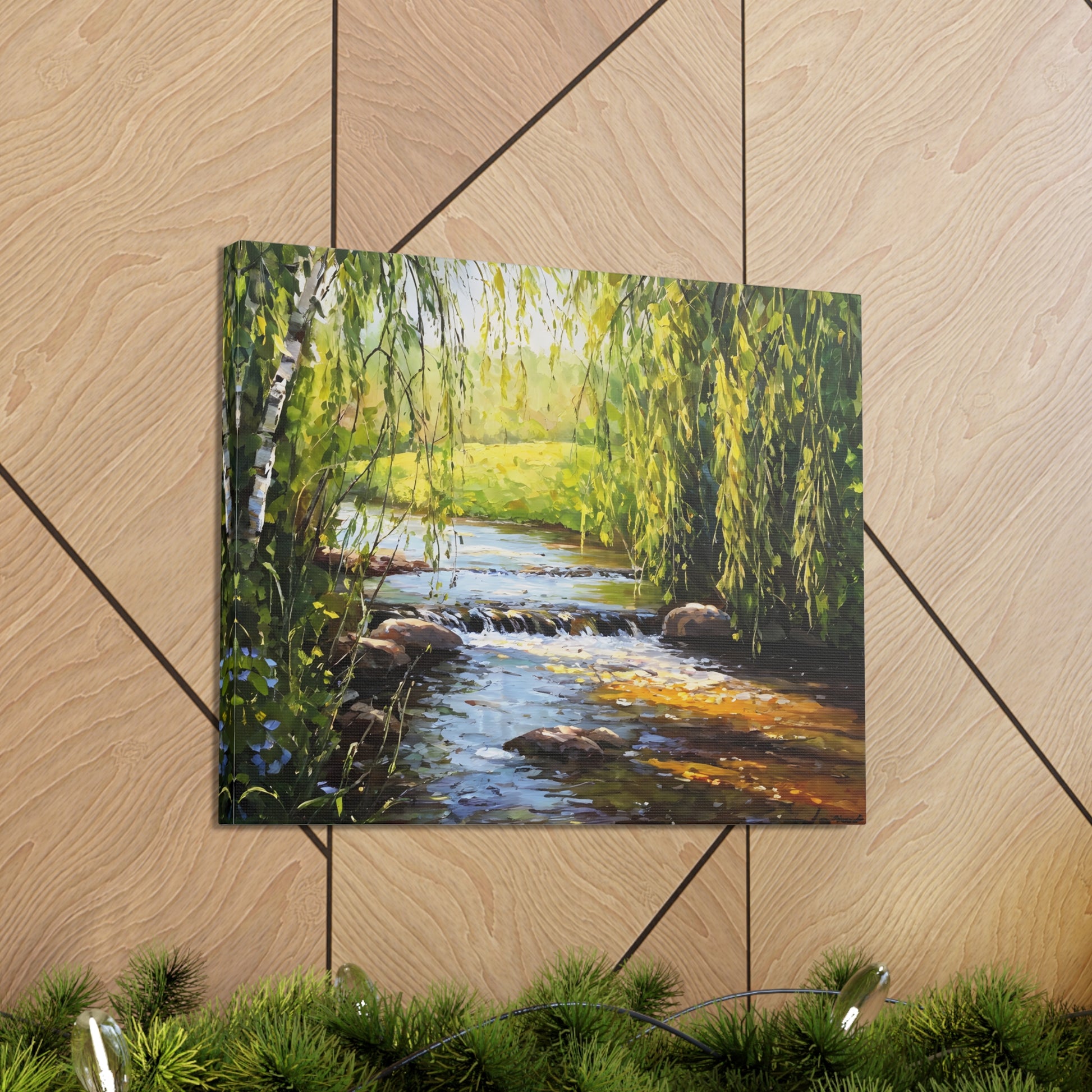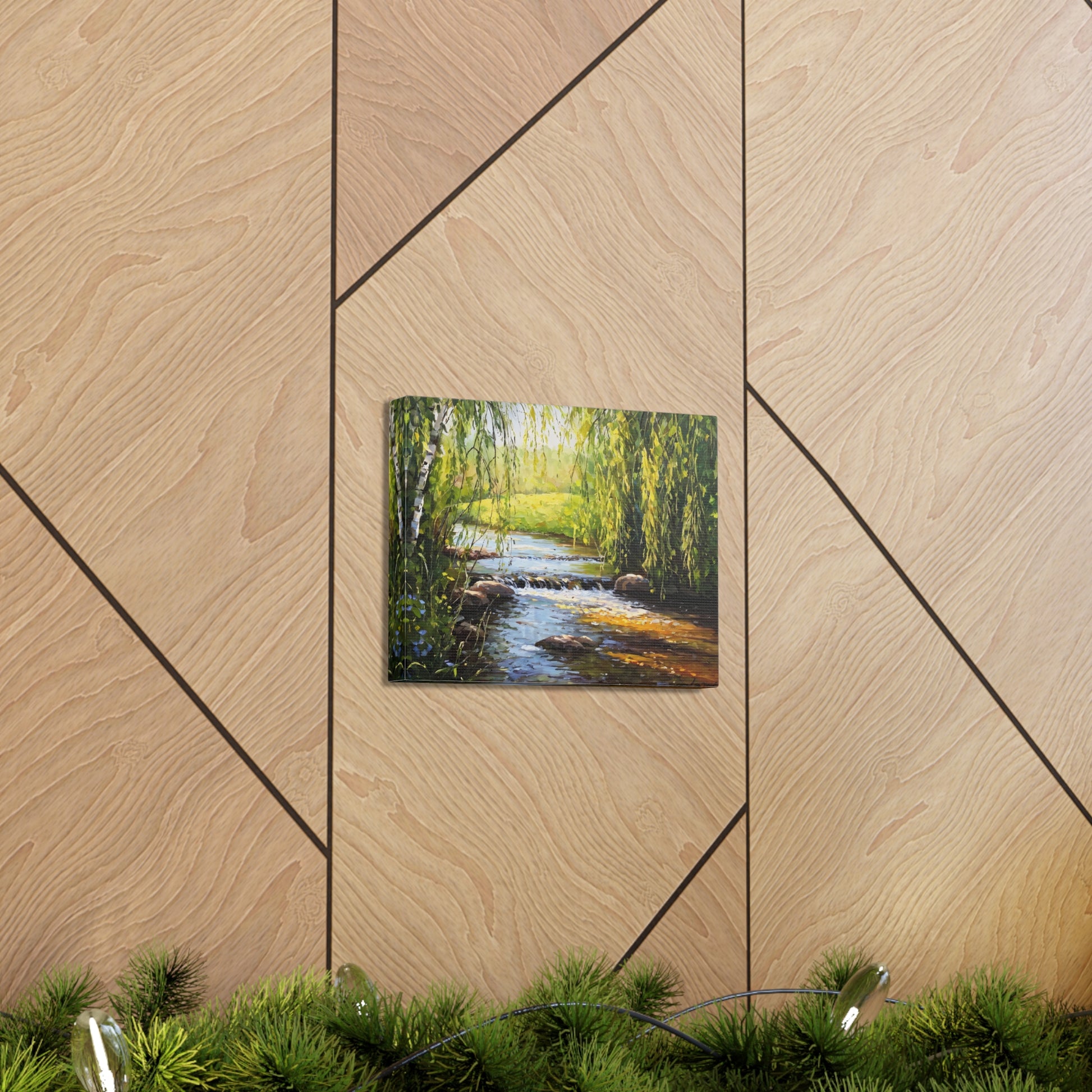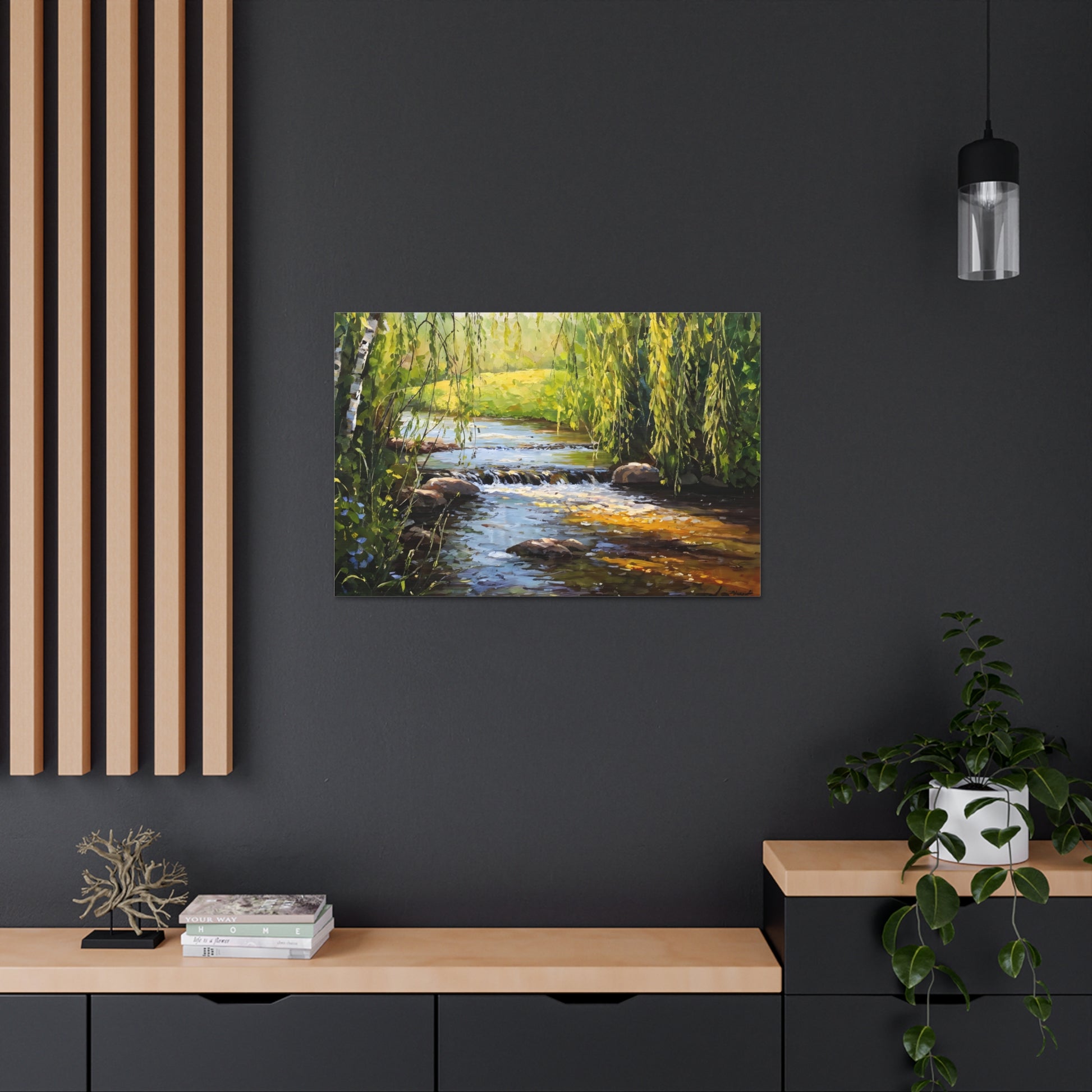 "Mossy Rocks" offers a glimpse into a peaceful forest stream, where moss-covered rocks sit quietly by flowing waters. This oil painting, created on cotton canvas, brings the serenity of nature to your home.