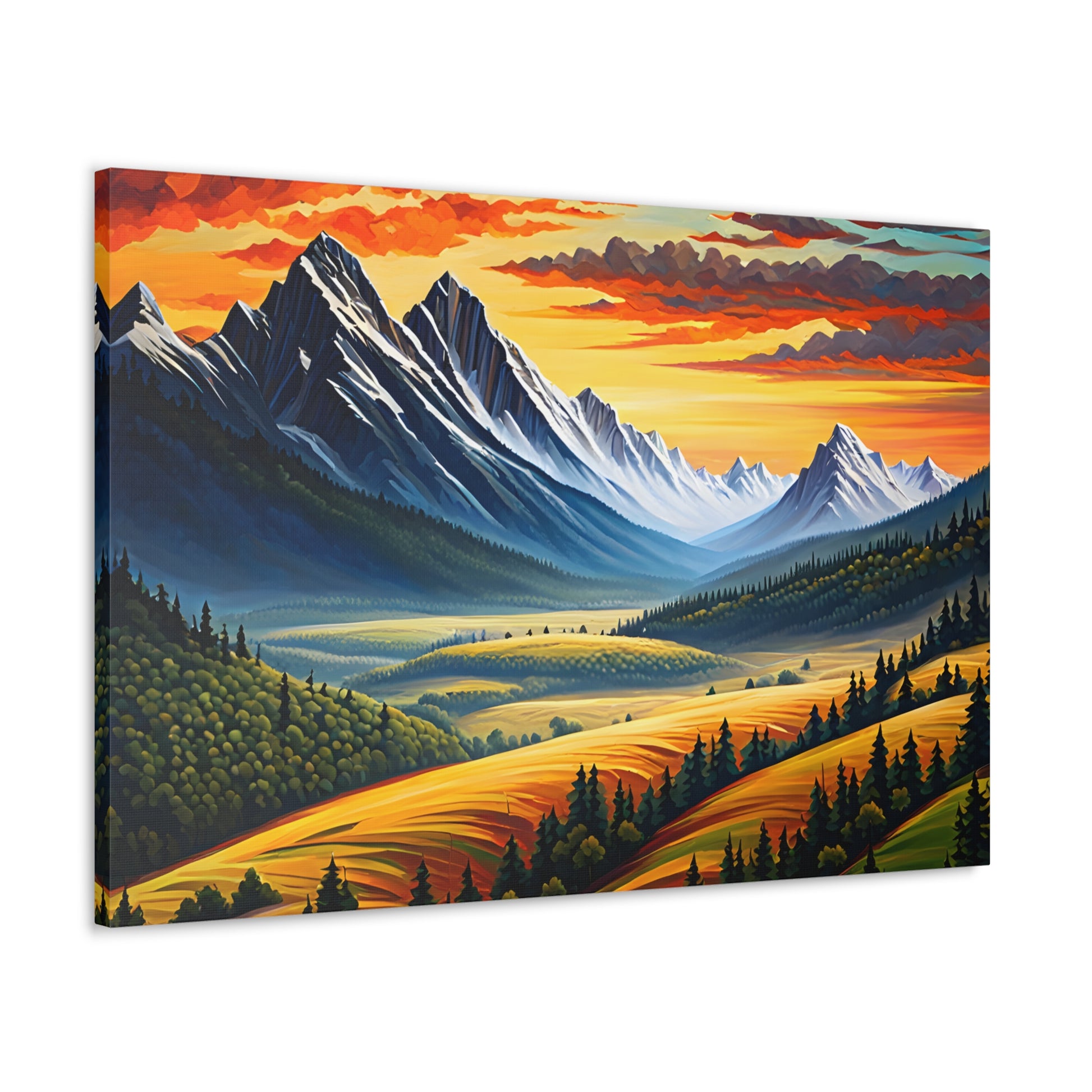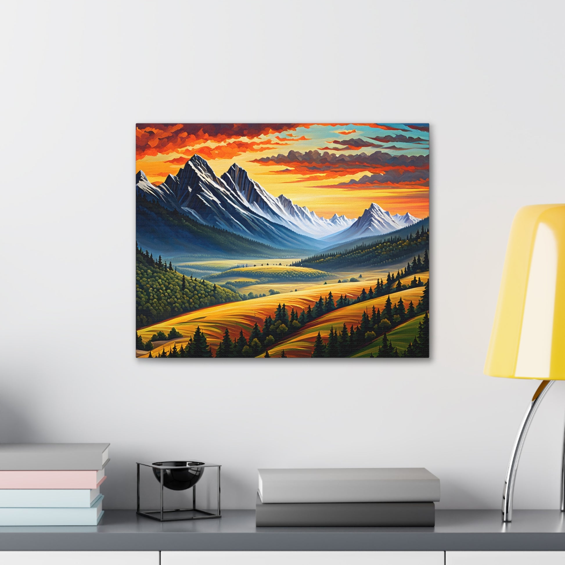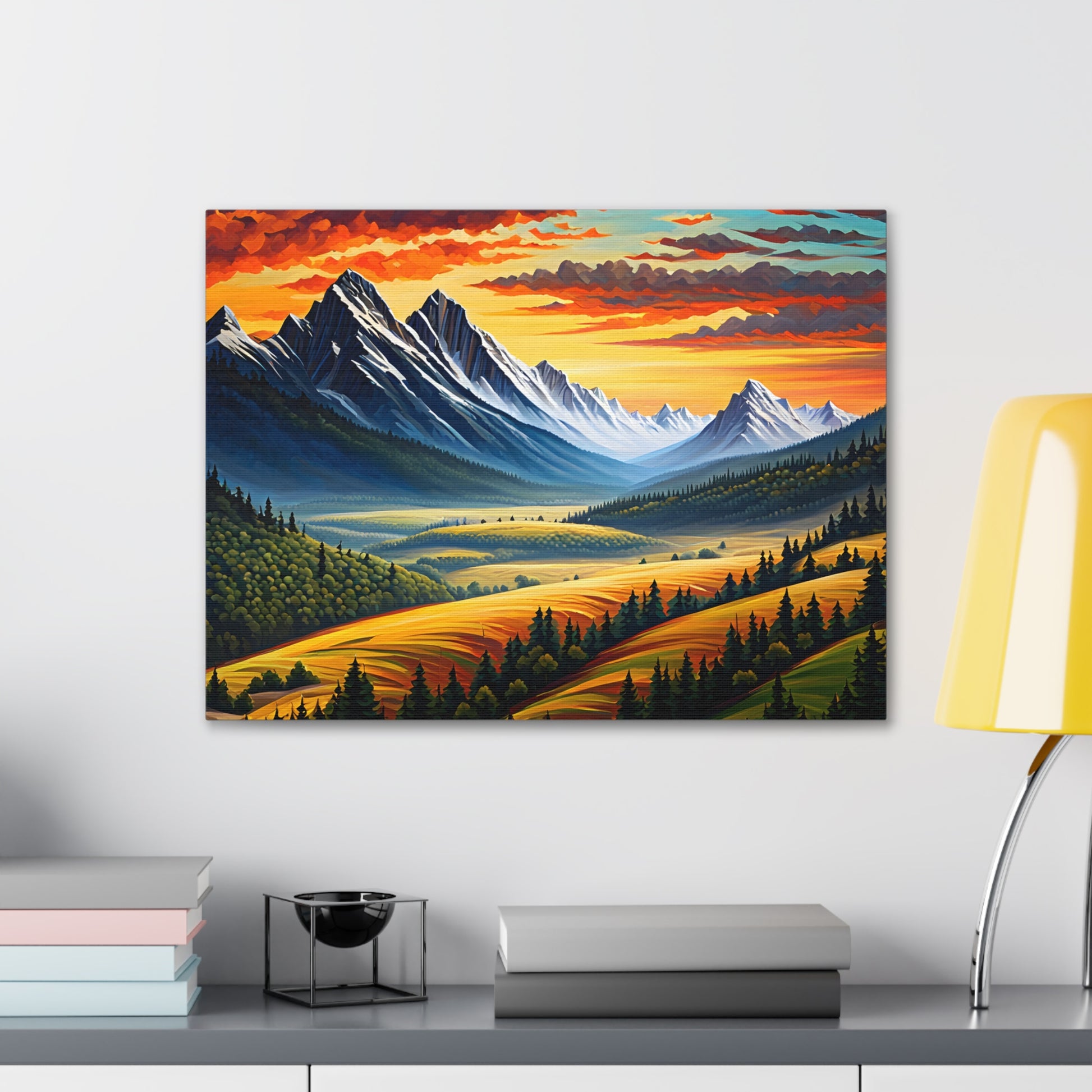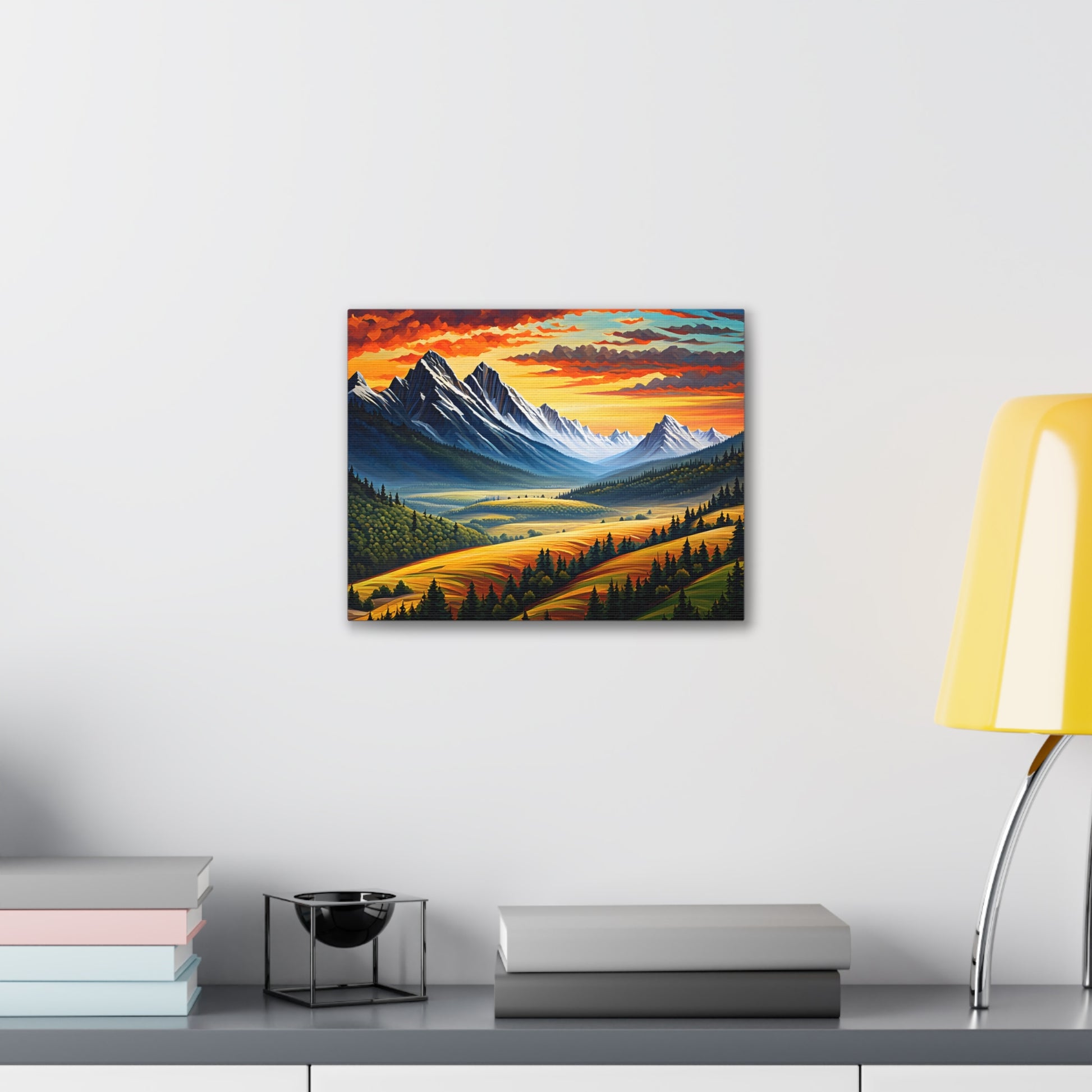 Feel the majestic presence of the mountains with "Mountain Echo," a powerful portrayal of towering peaks against a vibrant sunset sky. This artwork brings the grandeur of nature into your living space.