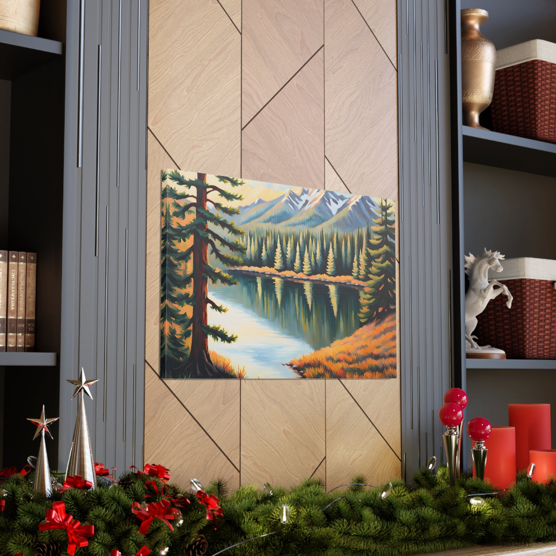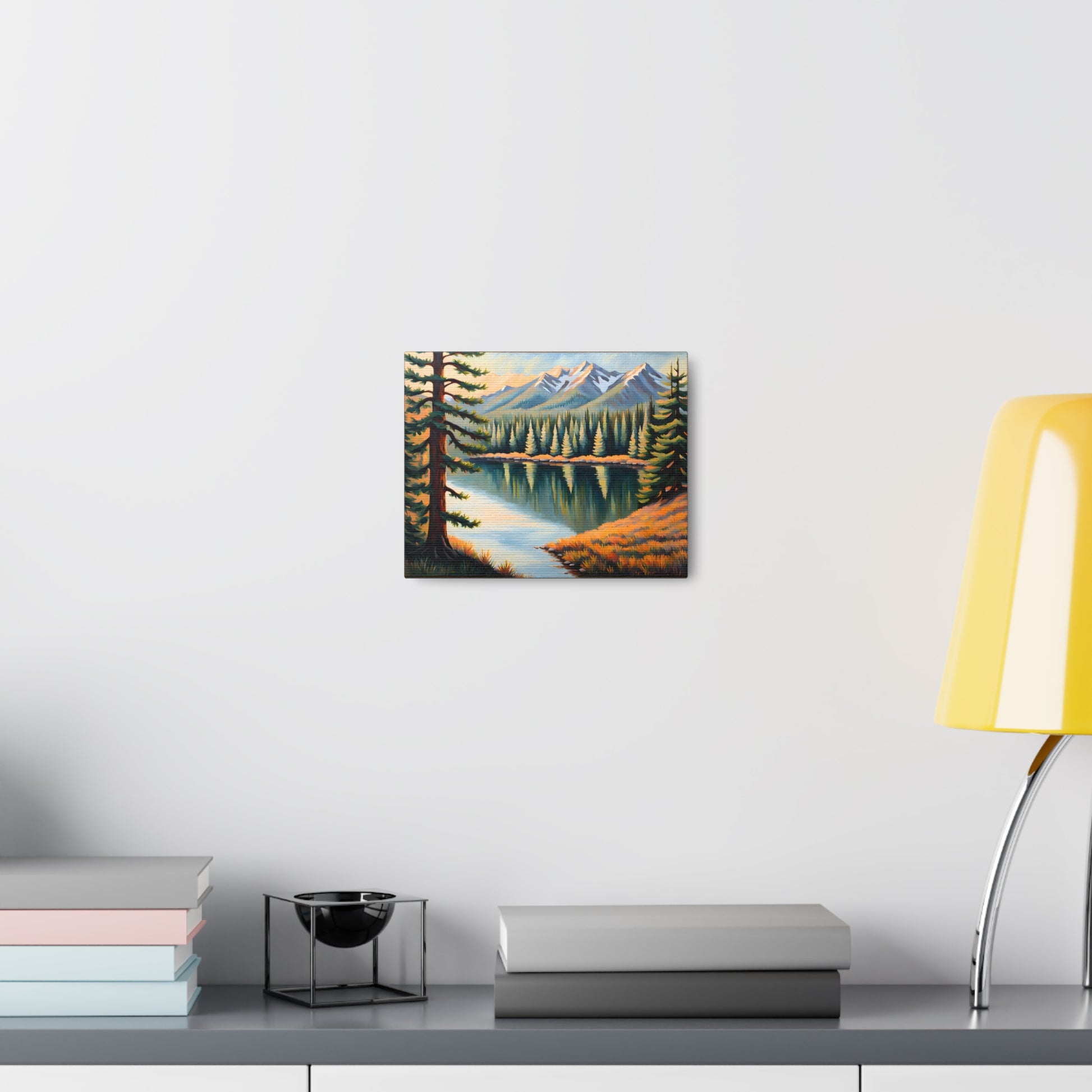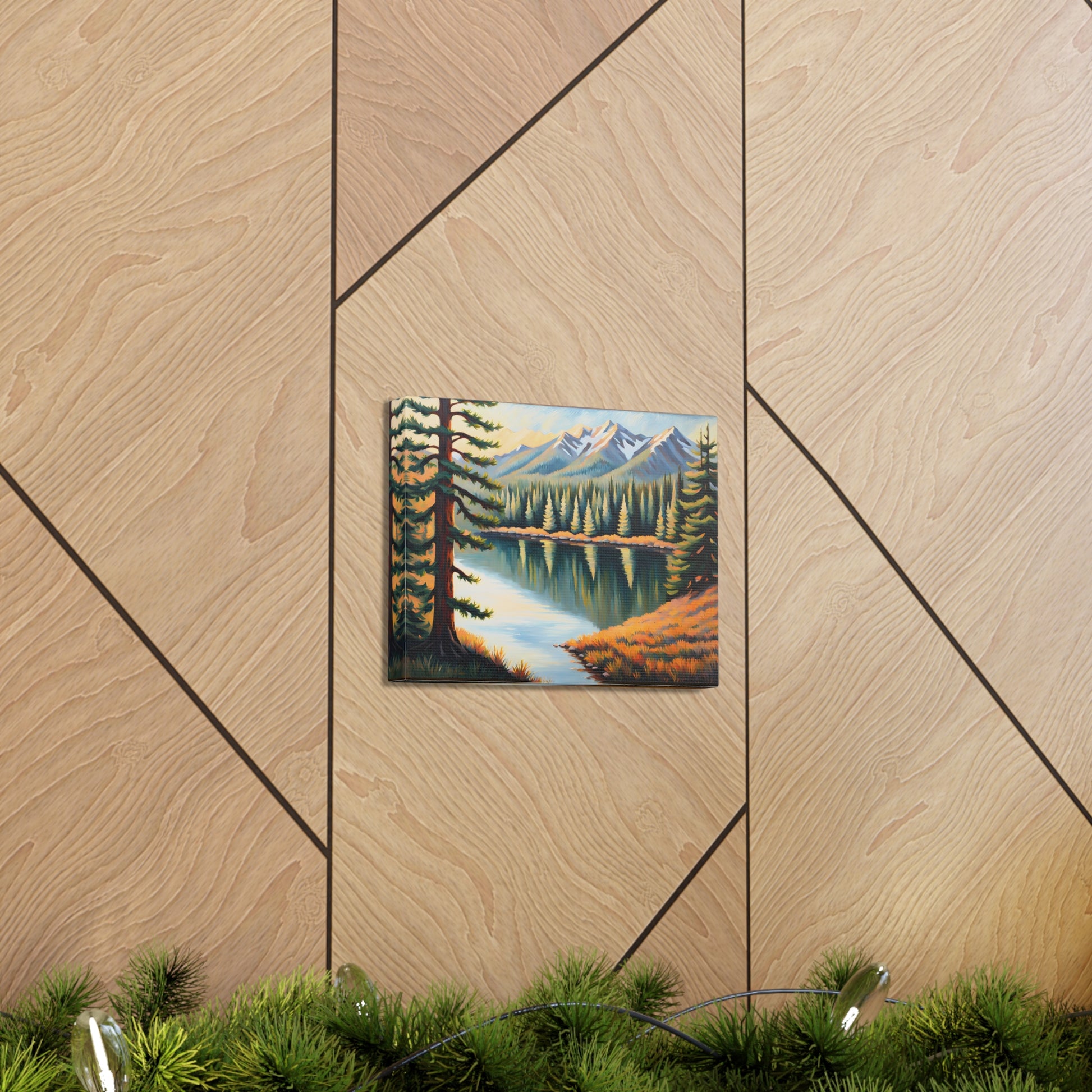"Mountain Reflections" beautifully mirrors the calm waters of a lake, reflecting towering mountains and lush evergreens. Hand-painted on cotton canvas, this piece evokes a sense of stillness and tranquility, ideal for your indoor retreat.