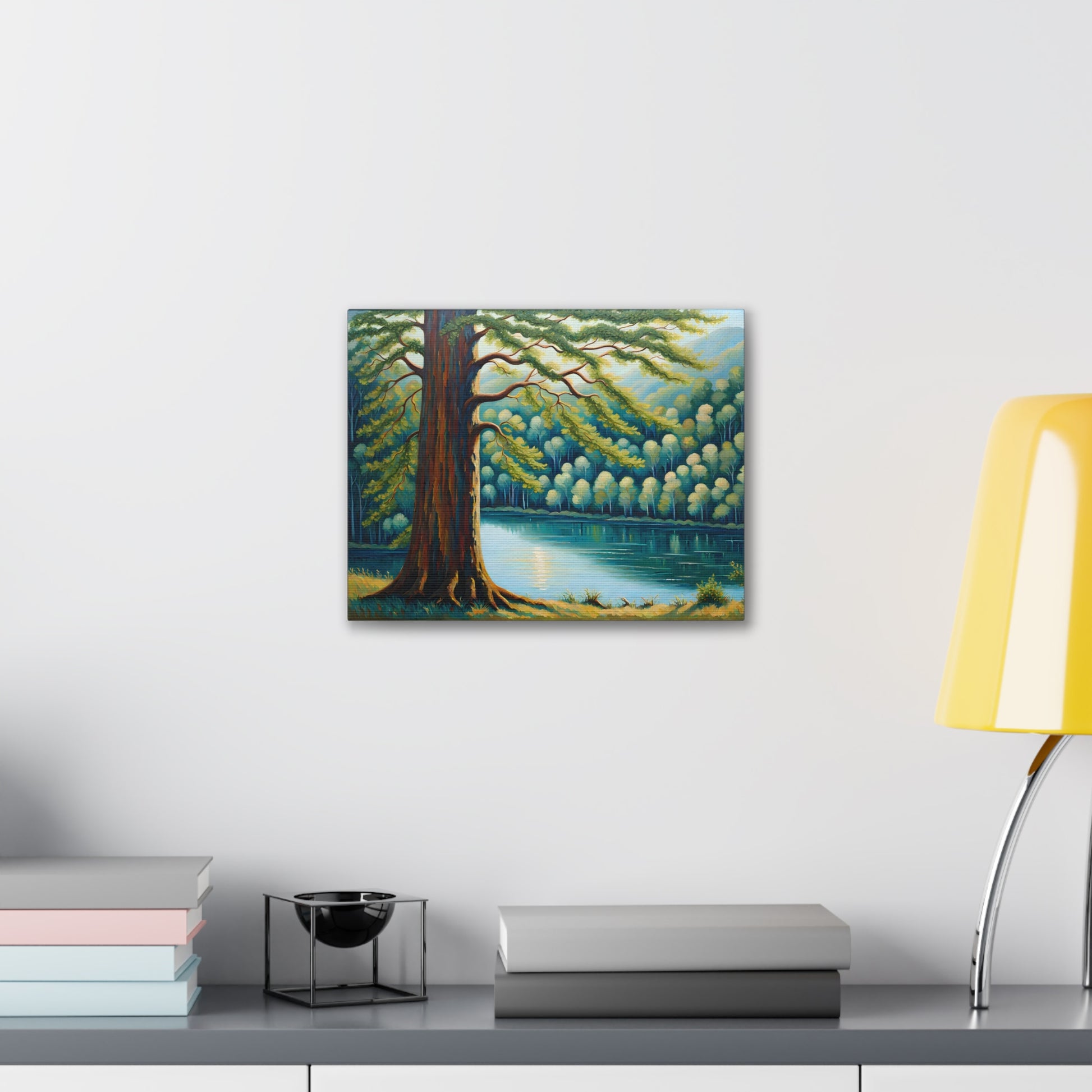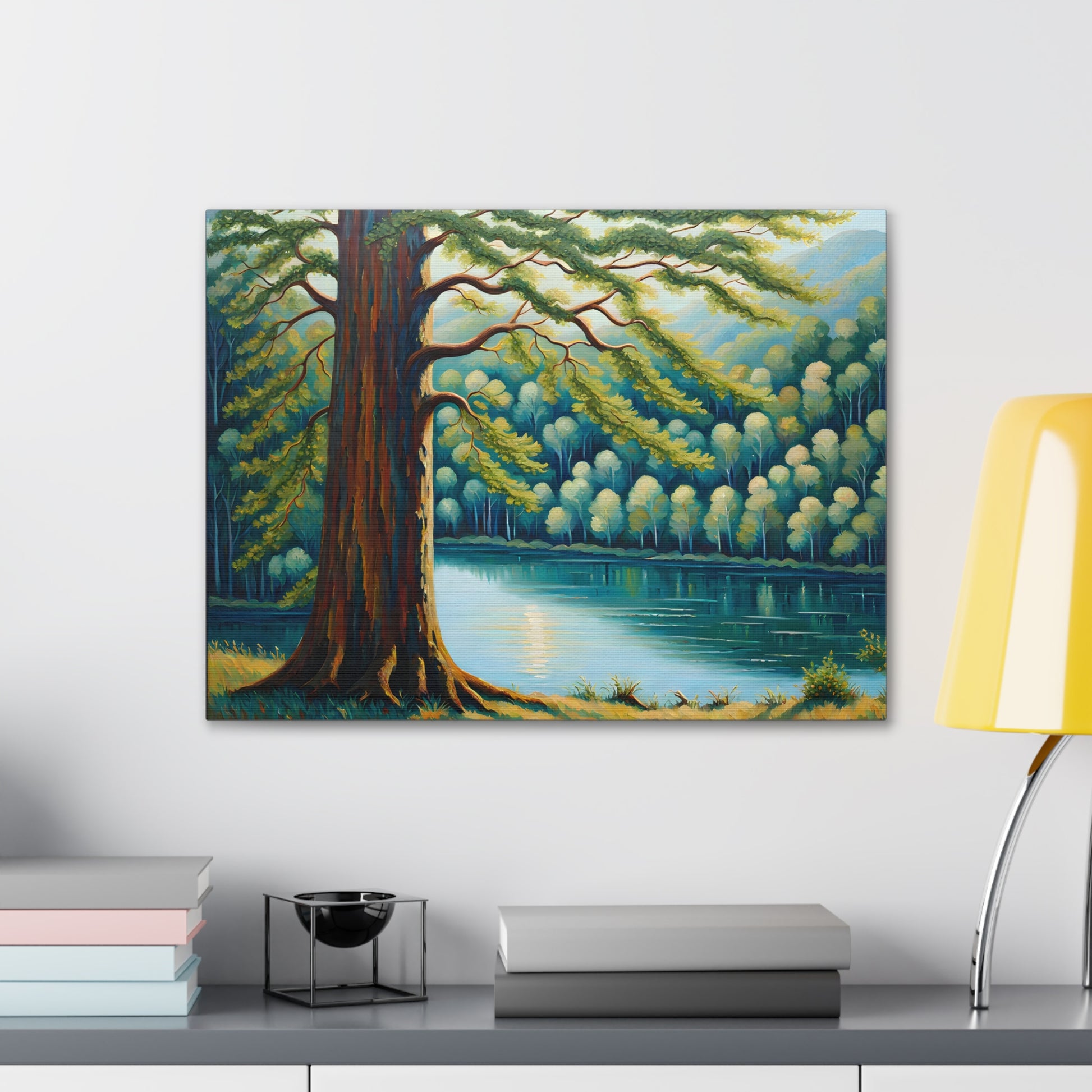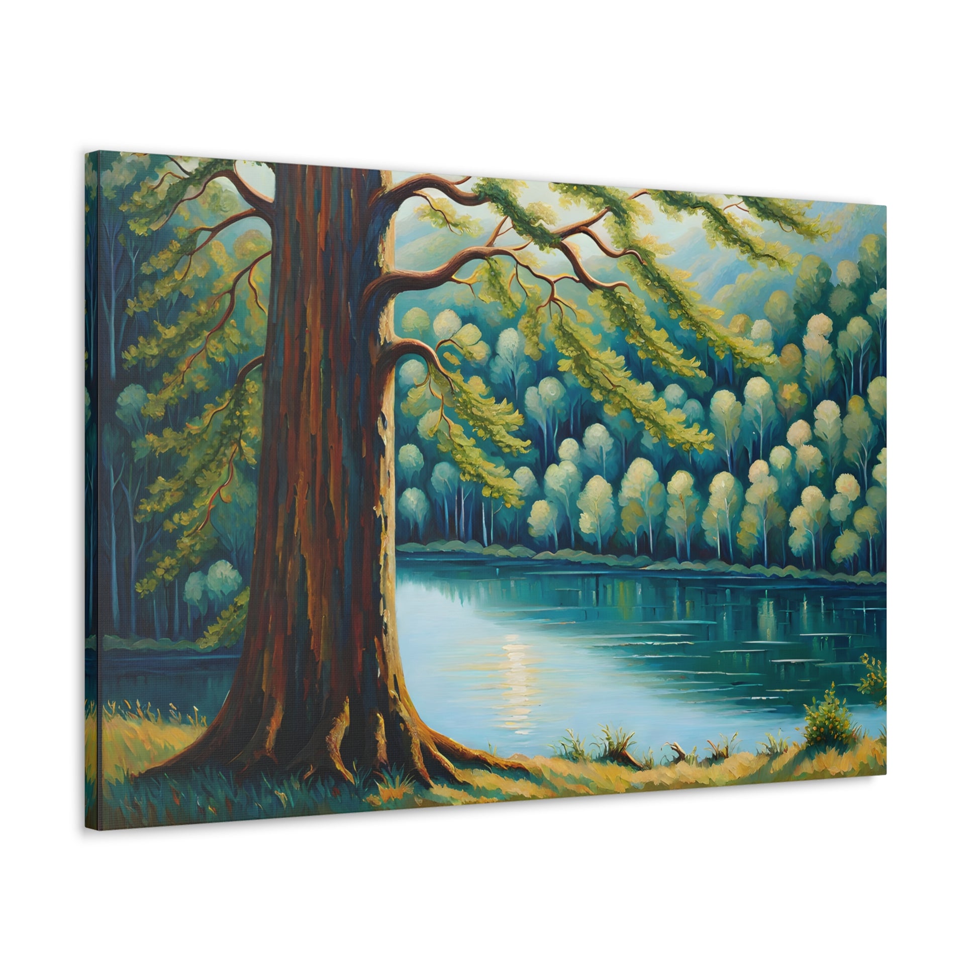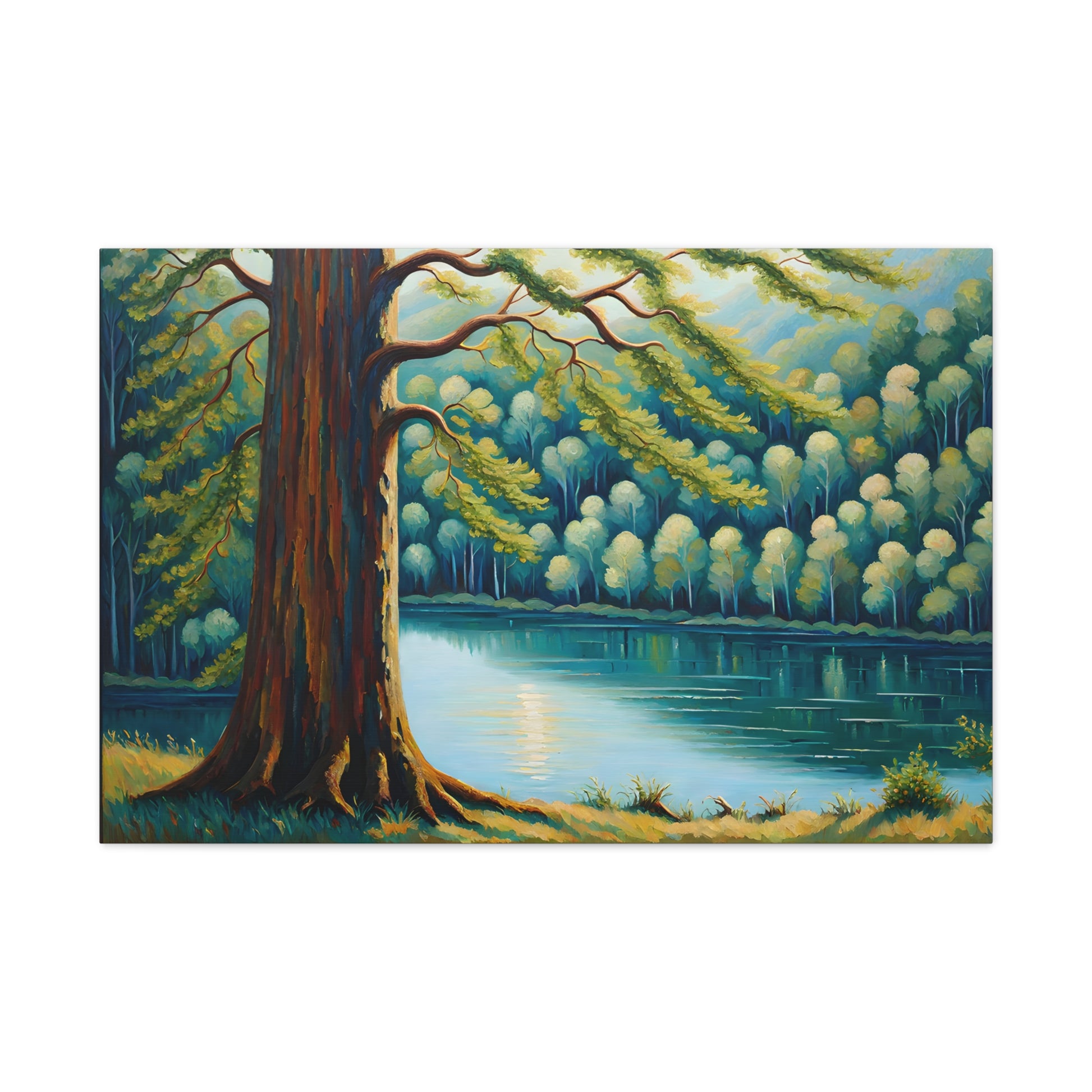 - Soft, Muted Colors: A soothing palette of blues and greens creates a calming riverside scene.