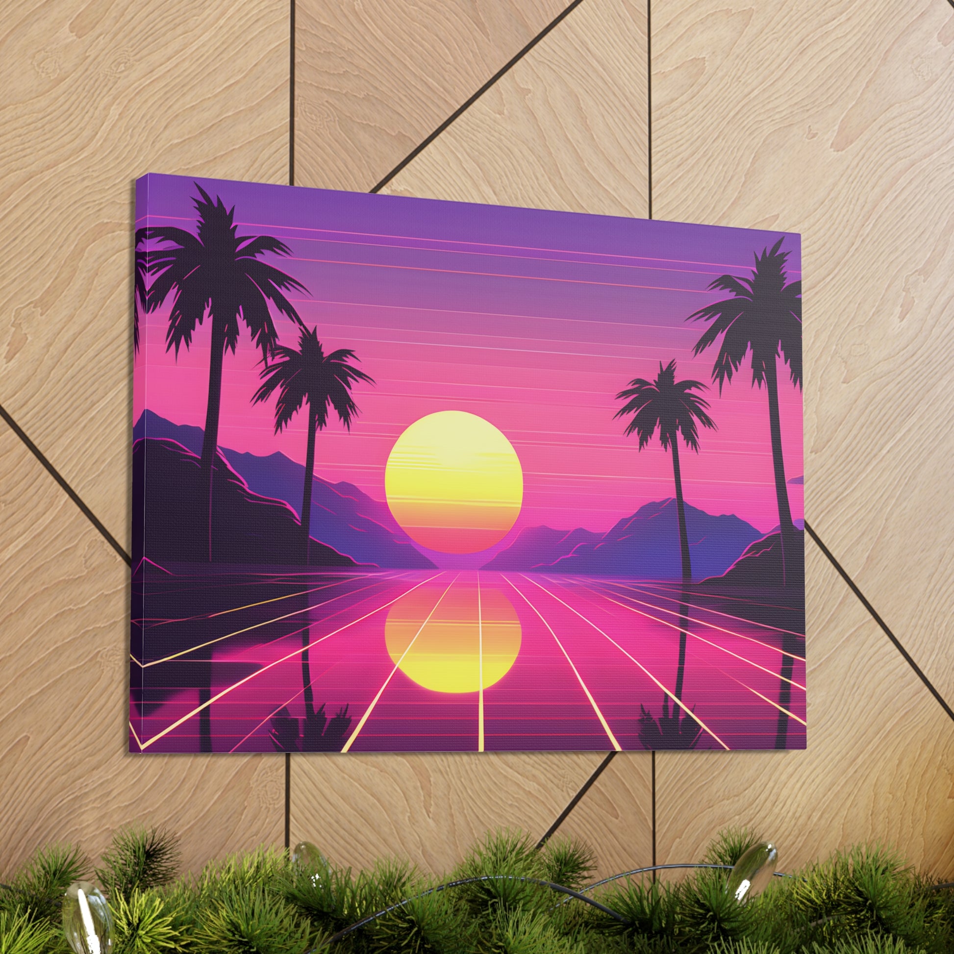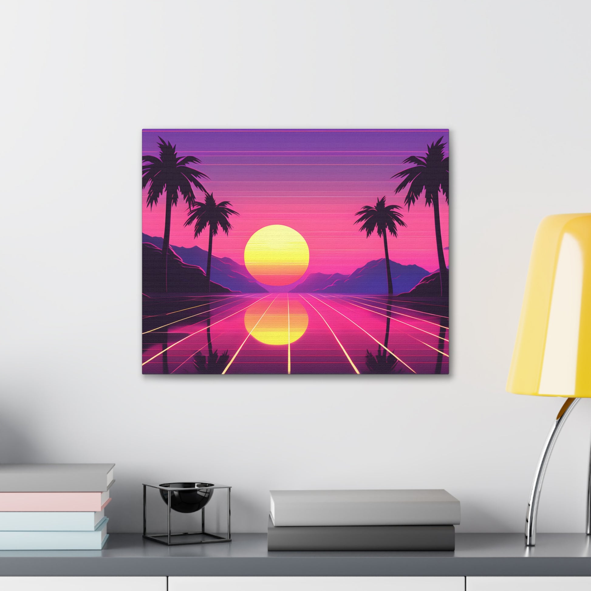 Embark on a vibrant journey with "Neon Palms: Outrun Wall Décor." This electrifying canvas artwork encapsulates the essence of the outrun aesthetic, featuring a mesmerizing sunset with palm trees, radiating an unmistakable 80s glow.