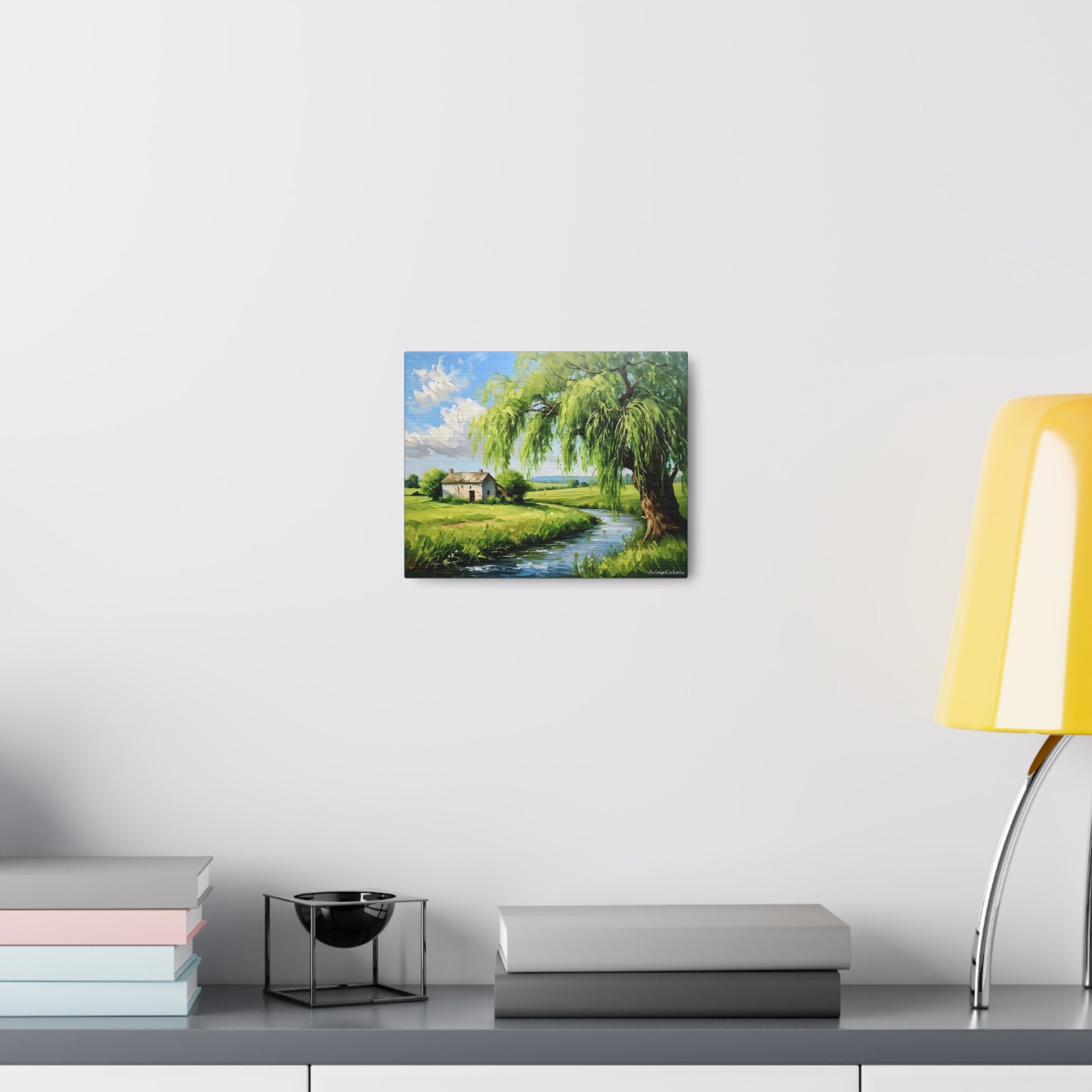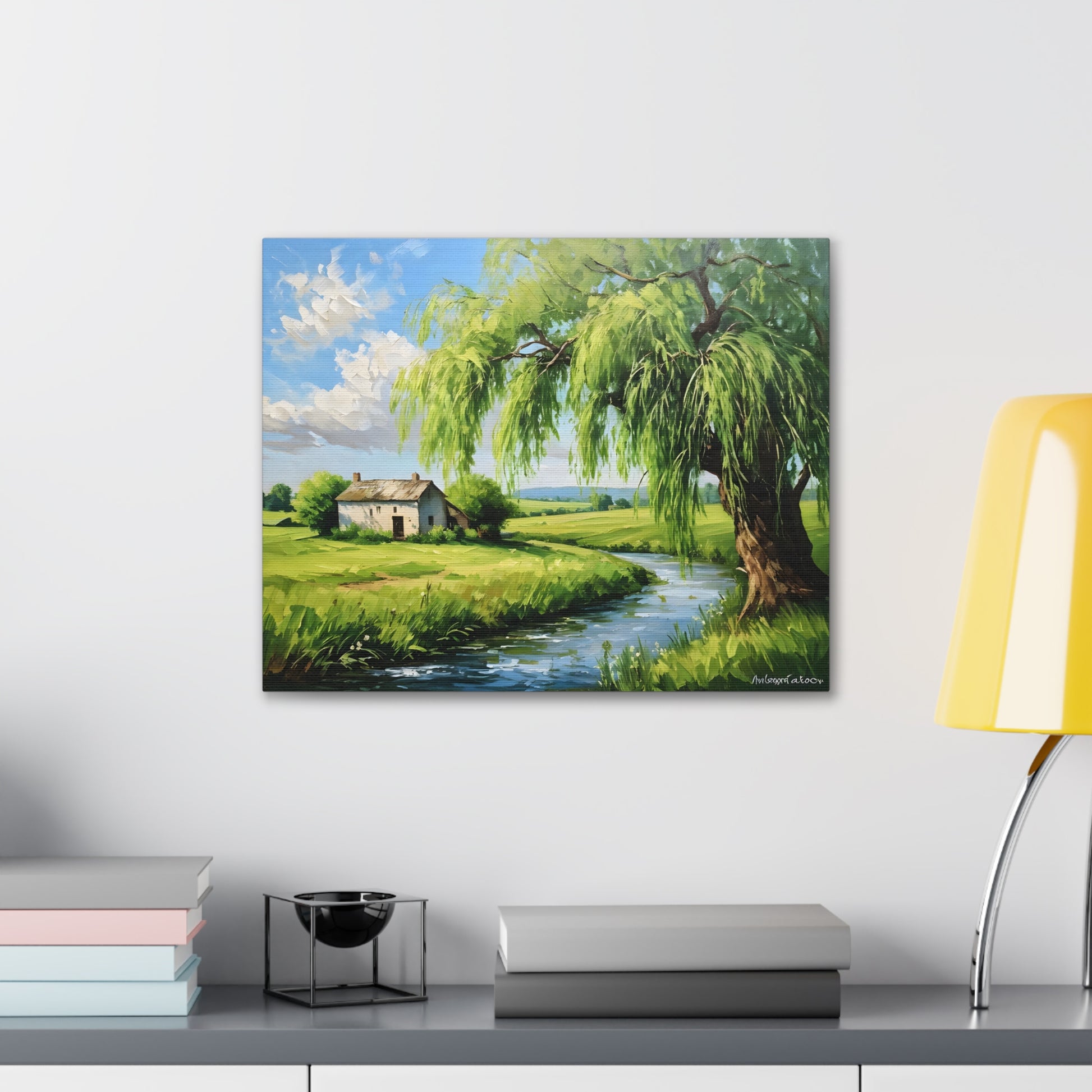 Escape to a serene countryside with "Peaceful Haven." This oil painting on cotton canvas depicts a charming riverside scene, perfect for adding a calming touch to any indoor space. NB! For indoor use only.